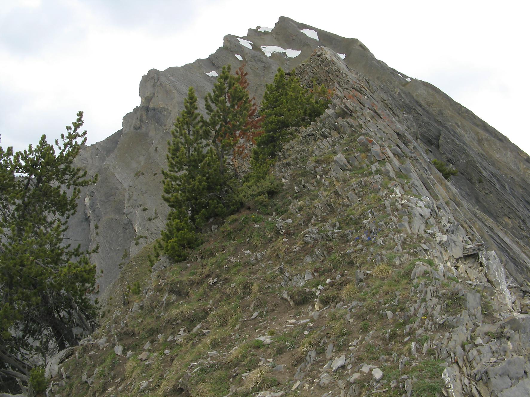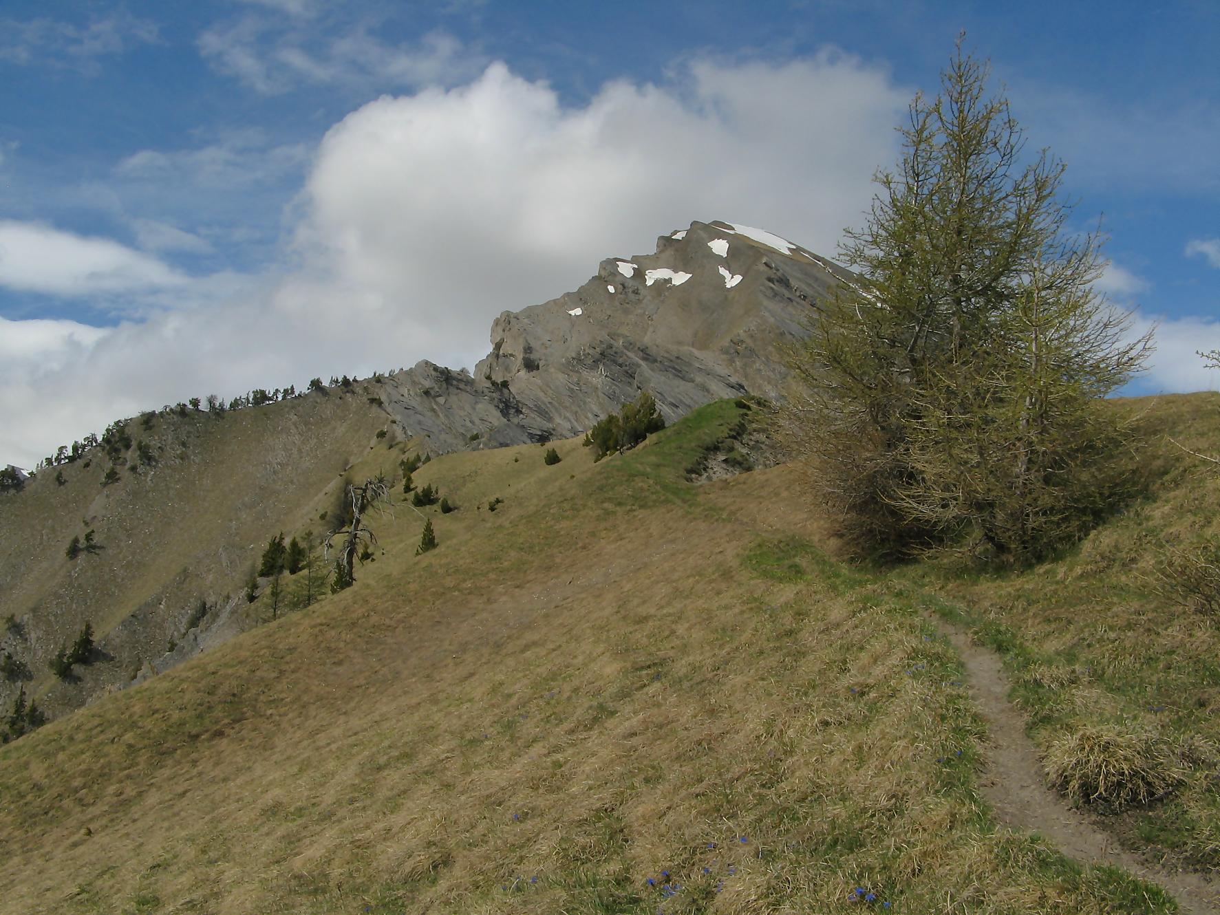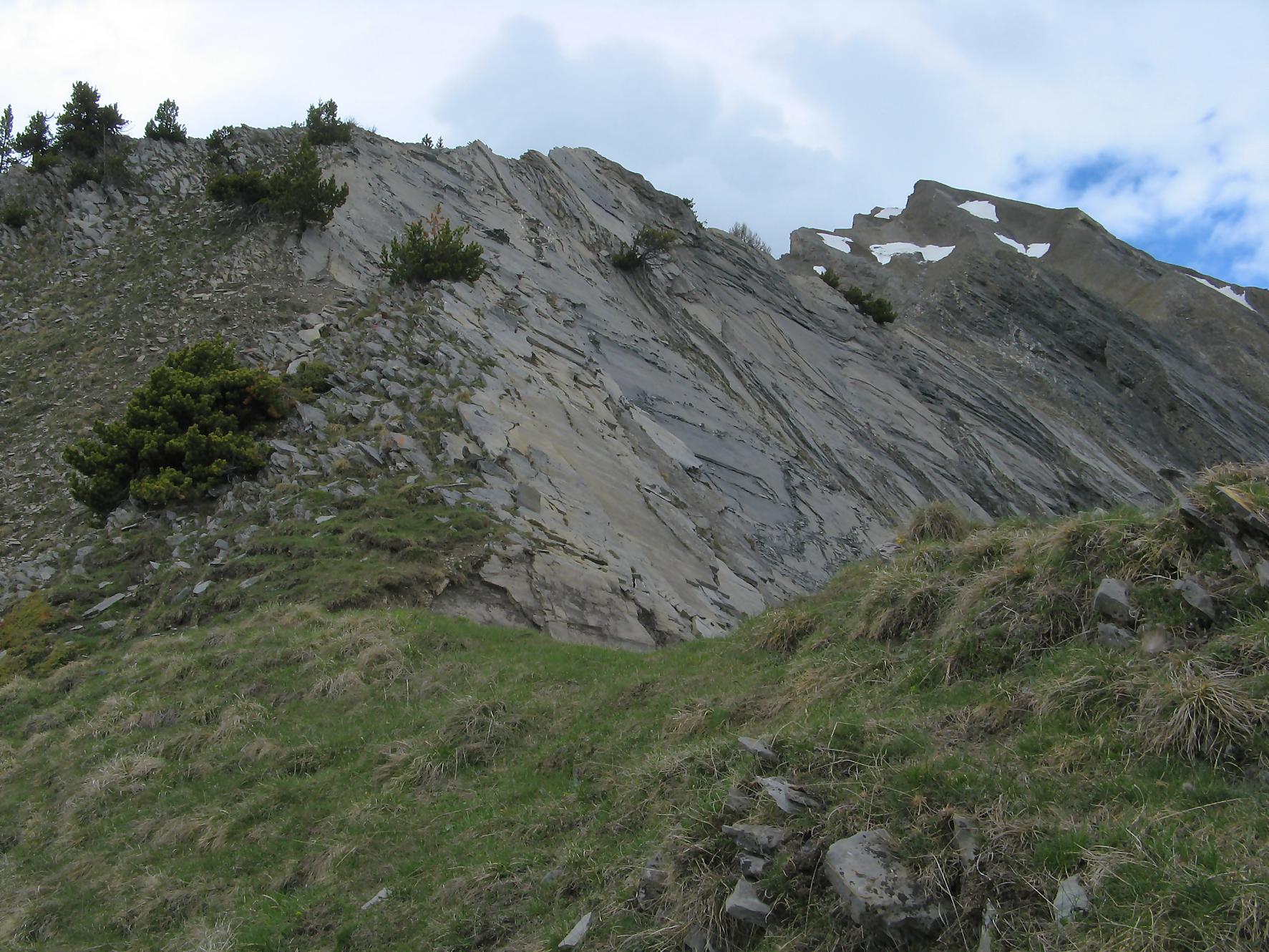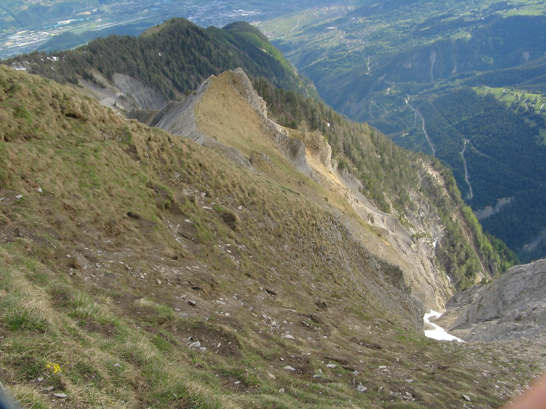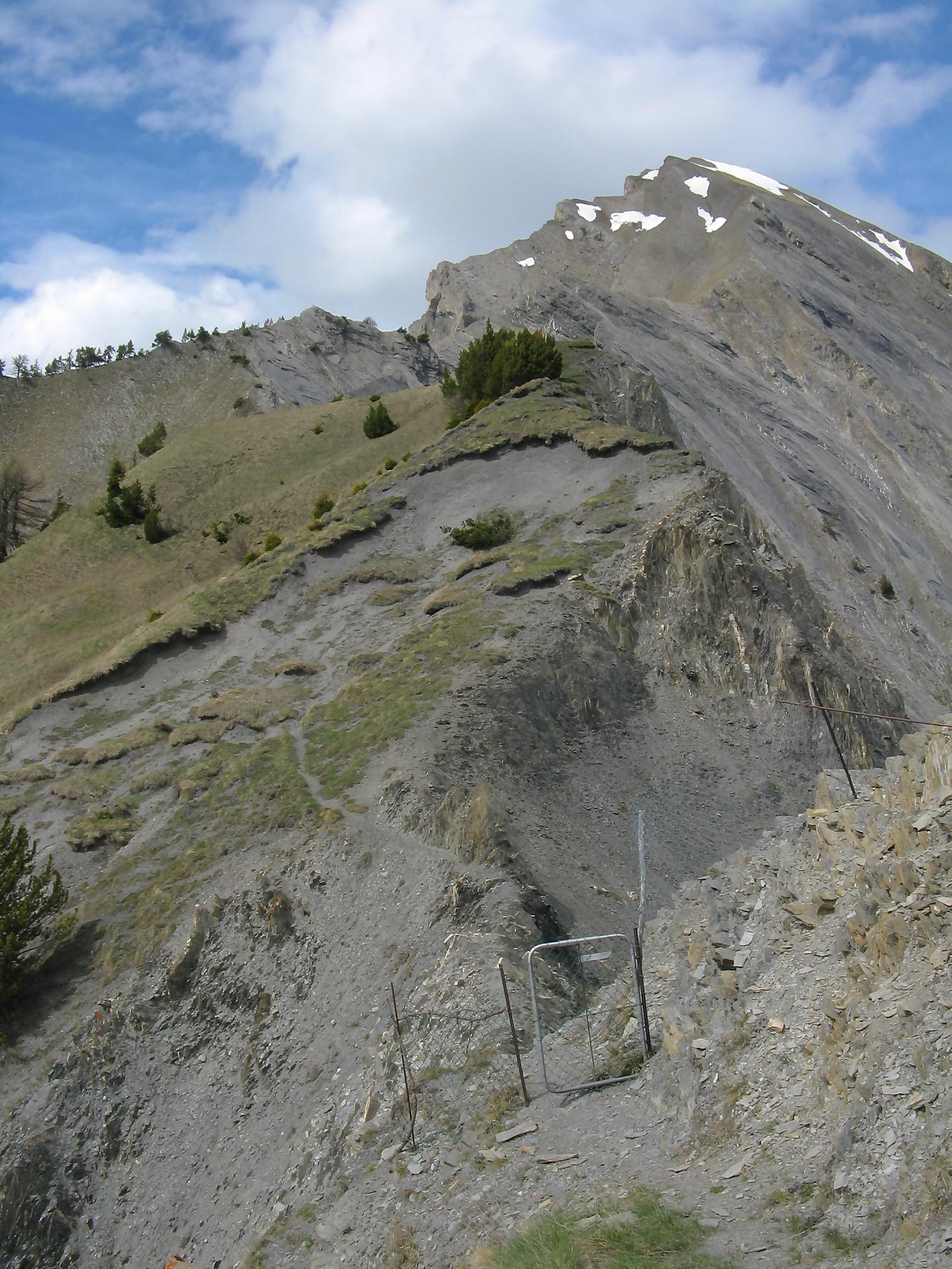 C’est la fin du printemps 2008 et je décide de revenir à Prabé et de rejoindre le sommet de Pra Roua. Vu le dénivelé, je pars plus haut que ma précédente course, donc depuis le virage du Pt1613. Ce départ se fait droit sur l’arête et donc les muscles sont mis à rudes épreuves dès le départ, il n’y a pas de tour de chauffe ! On monte le long de l’arête de La Loué à travers la forêt, avec à mi-parcours, une trouée sur la gauche qui permet d’admirer la face O abrupte et le Pont du Diable. Ensuite il y a des passages sécurisés par des chaines et avec en prime pour l’un, un pont. Au retour je prendrai un raccourci par la crête, peu visible à la montée. Il y a aussi une variante plus loin sur la droite un petit passage en crête aérien, en guise d’entrainement pour la suite.