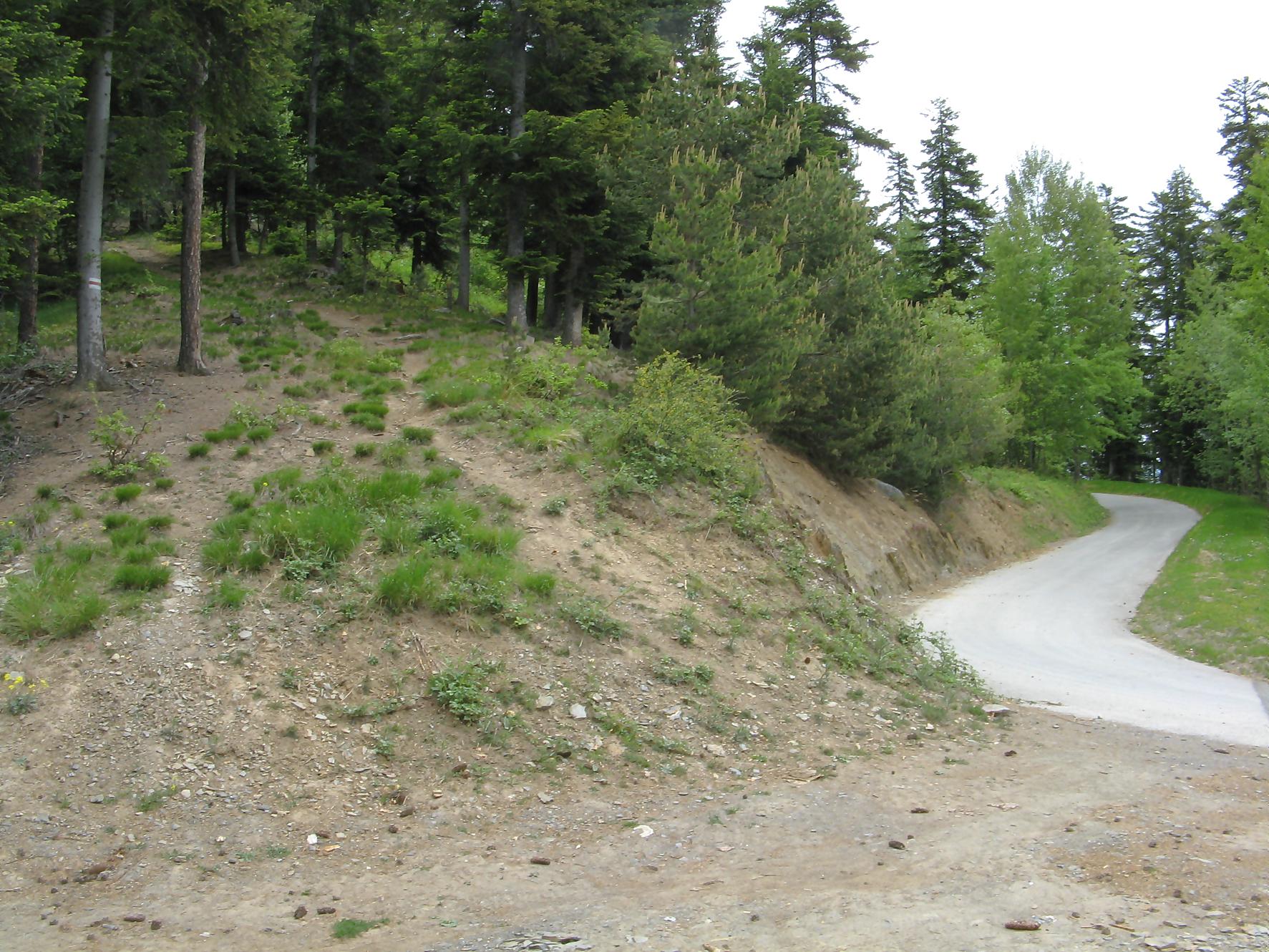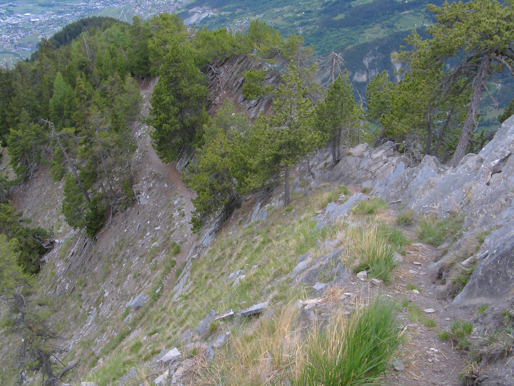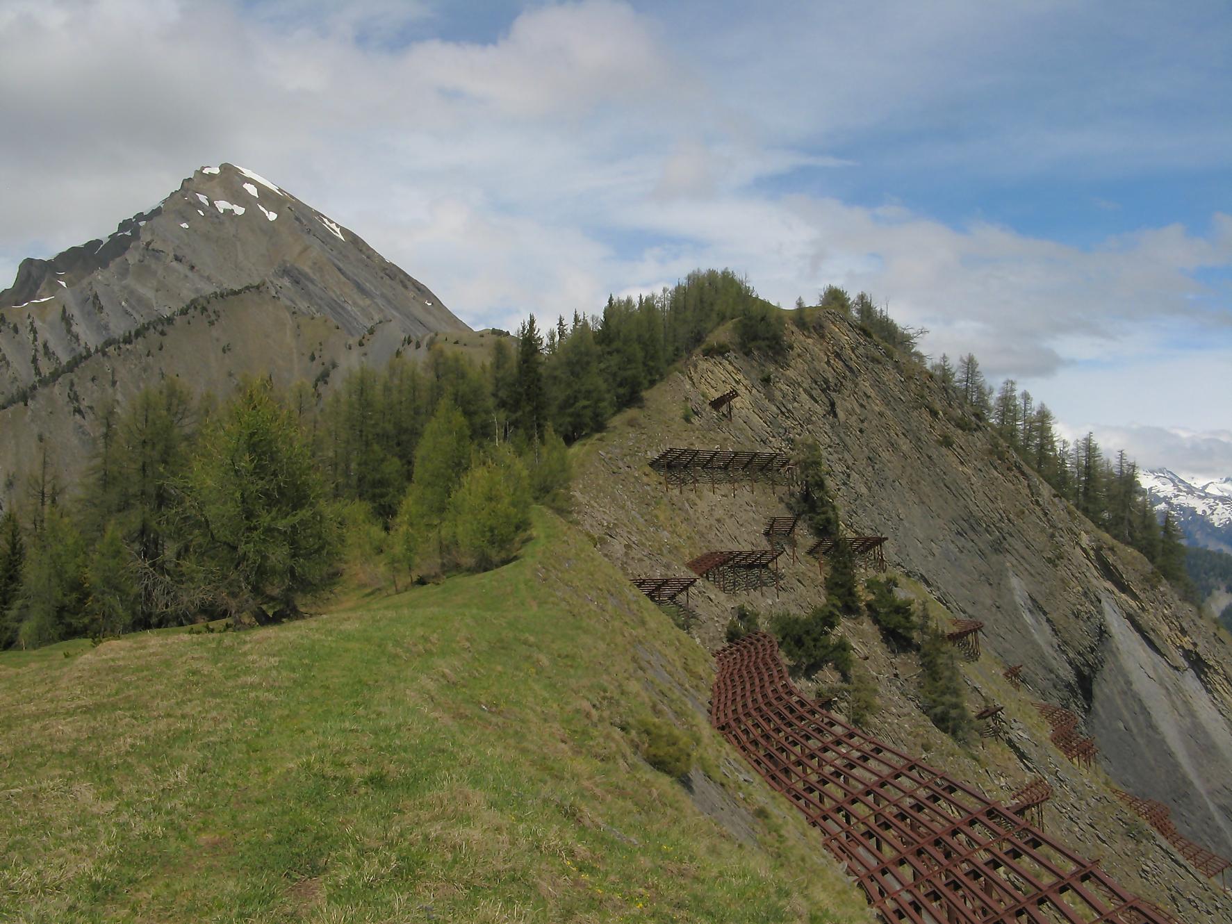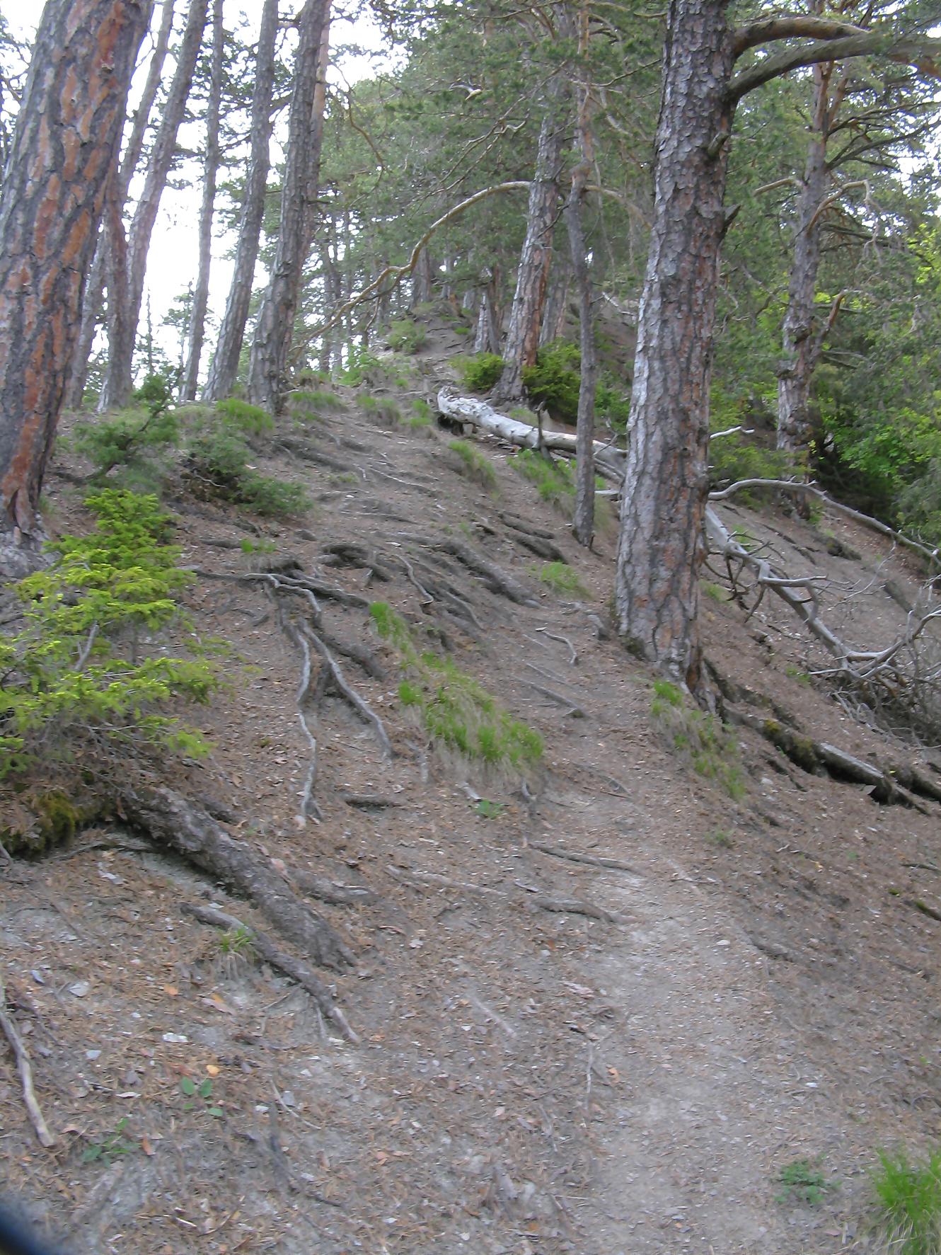 C’est la fin du printemps 2008 et je décide de revenir à Prabé et de rejoindre le sommet de Pra Roua. Vu le dénivelé, je pars plus haut que ma précédente course, donc depuis le virage du Pt1613. Ce départ se fait droit sur l’arête et donc les muscles sont mis à rudes épreuves dès le départ, il n’y a pas de tour de chauffe ! On monte le long de l’arête de La Loué à travers la forêt, avec à mi-parcours, une trouée sur la gauche qui permet d’admirer la face O abrupte et le Pont du Diable. Ensuite il y a des passages sécurisés par des chaines et avec en prime pour l’un, un pont. Au retour je prendrai un raccourci par la crête, peu visible à la montée. Il y a aussi une variante plus loin sur la droite un petit passage en crête aérien, en guise d’entrainement pour la suite.
