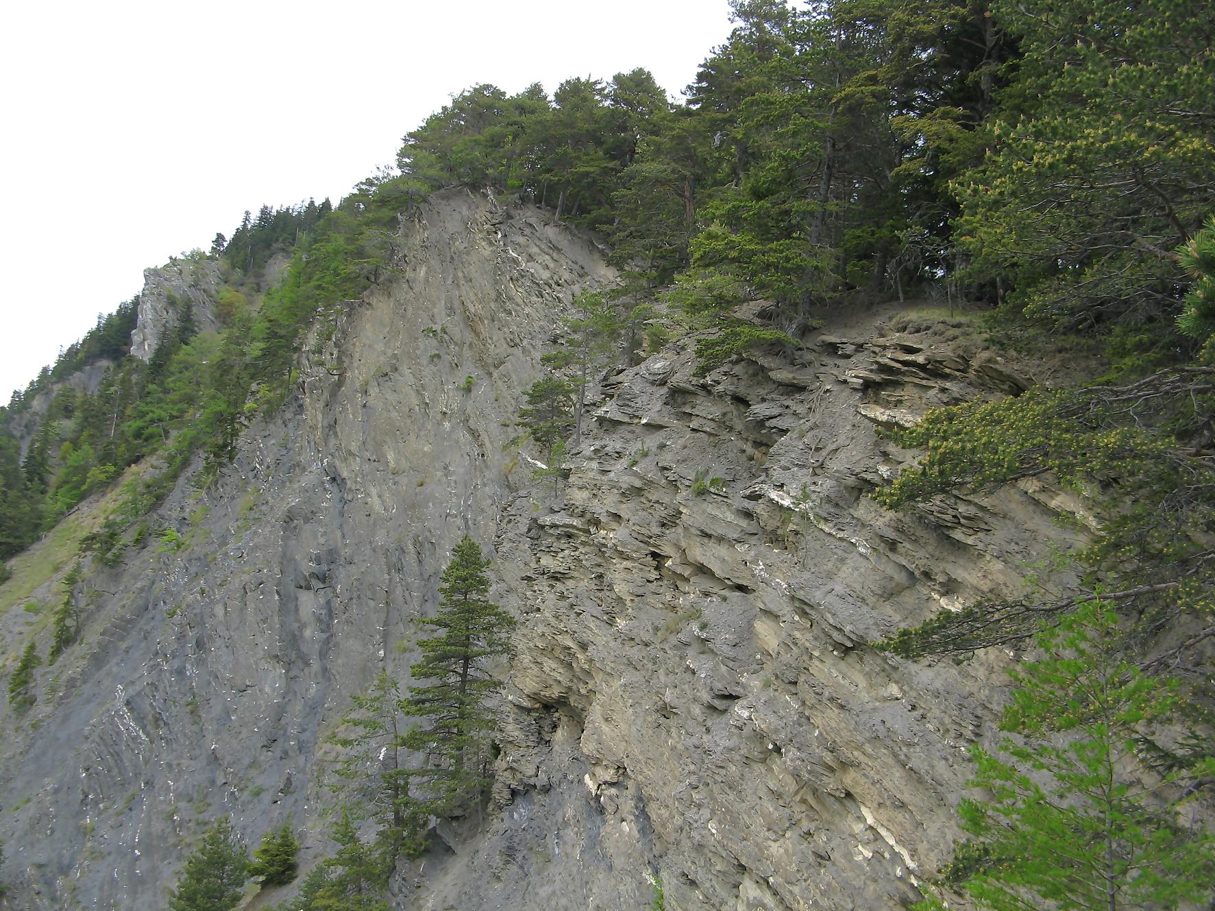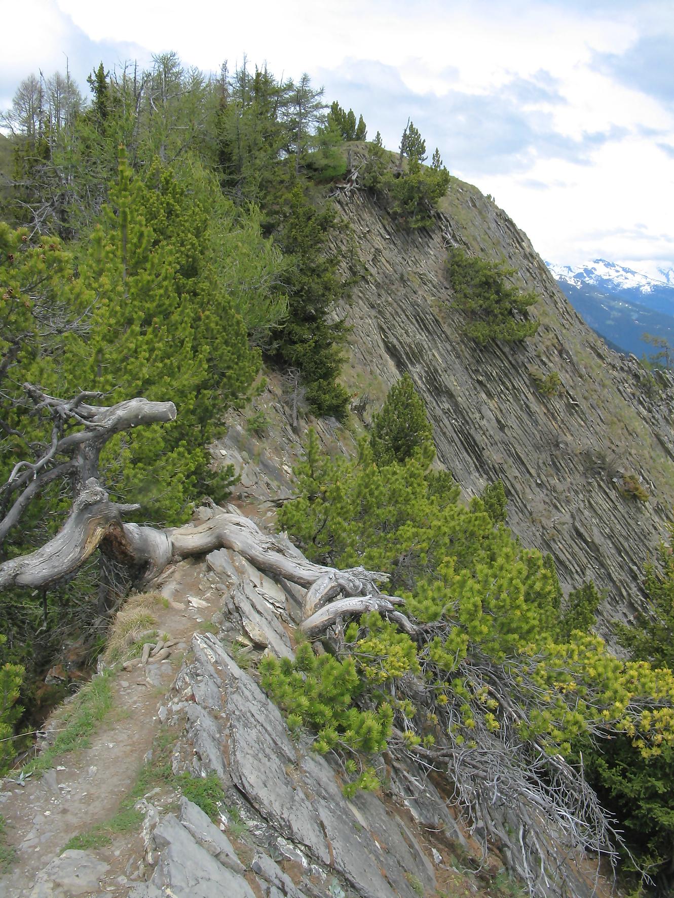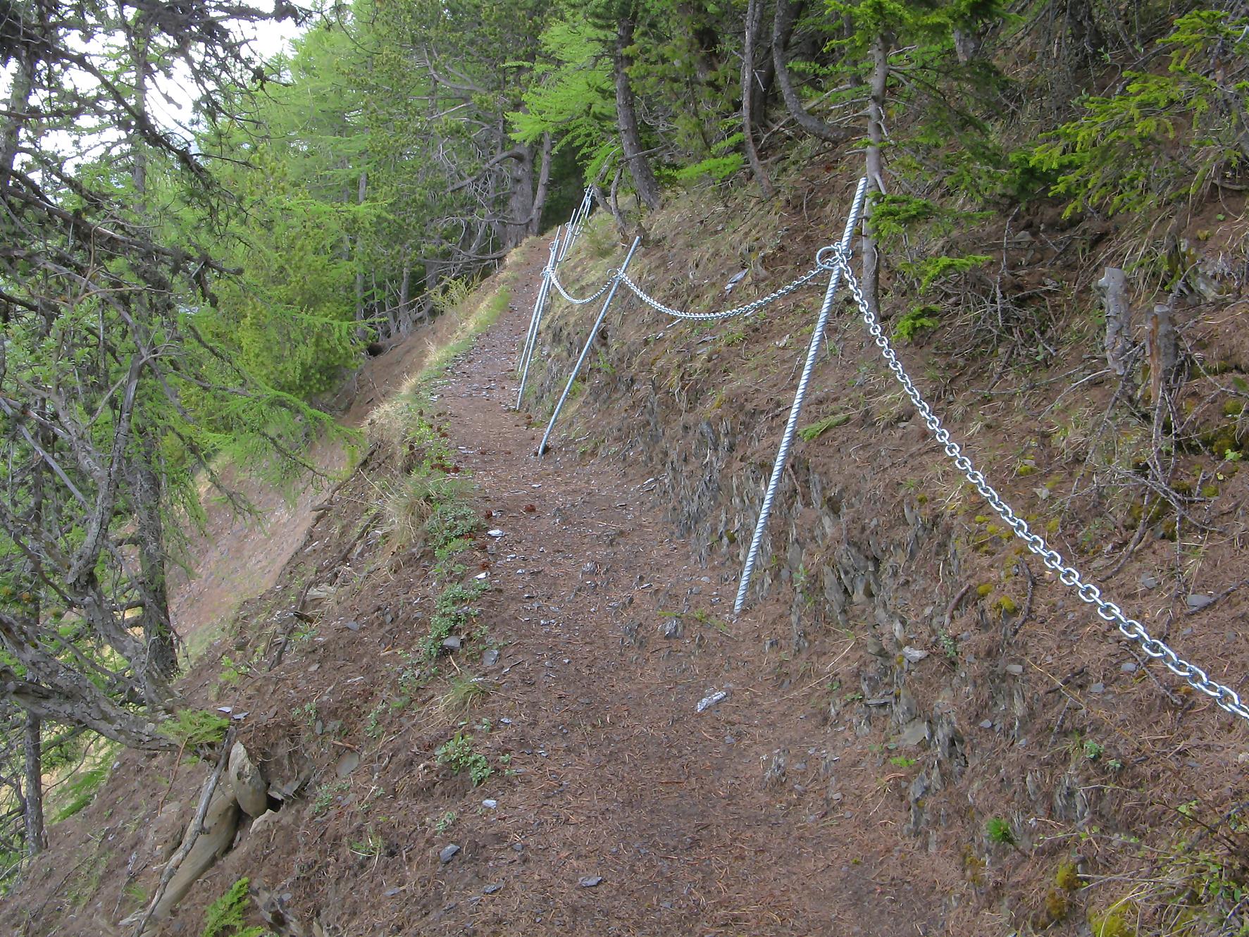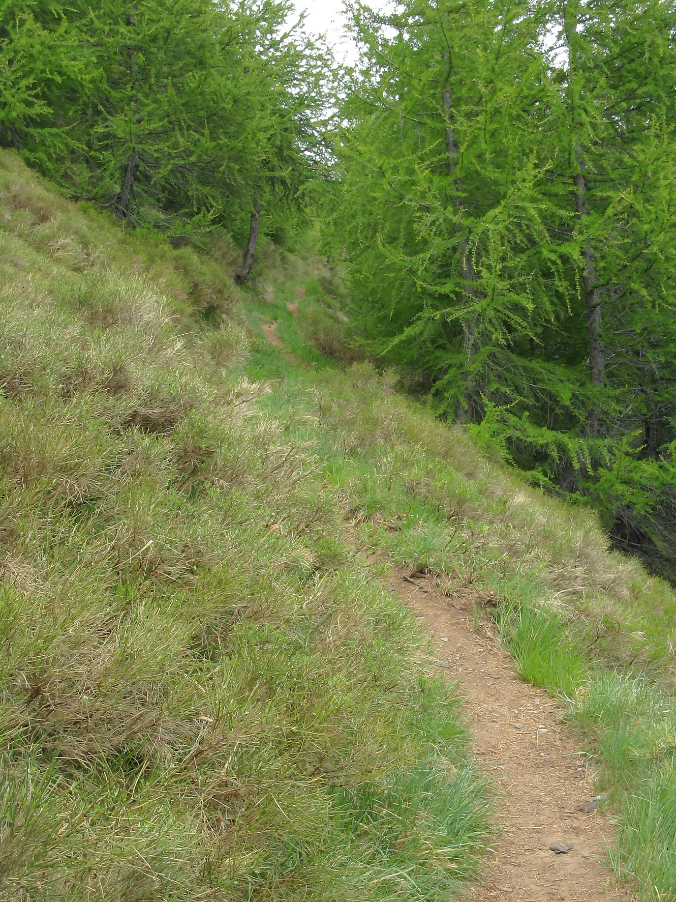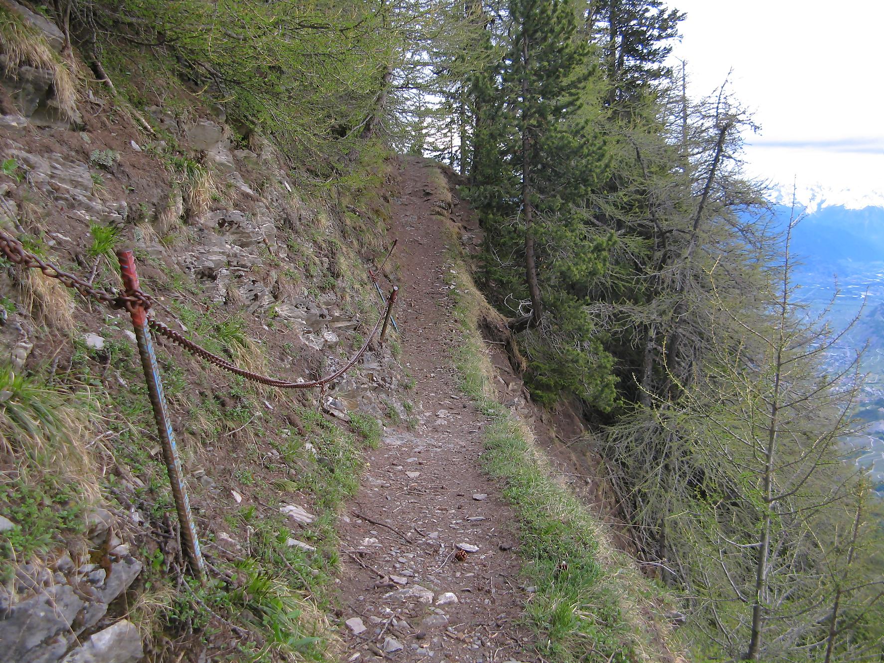 C’est la fin du printemps 2008 et je décide de revenir à Prabé et de rejoindre le sommet de Pra Roua. Vu le dénivelé, je pars plus haut que ma précédente course, donc depuis le virage du Pt1613. Ce départ se fait droit sur l’arête et donc les muscles sont mis à rudes épreuves dès le départ, il n’y a pas de tour de chauffe ! On monte le long de l’arête de La Loué à travers la forêt, avec à mi-parcours, une trouée sur la gauche qui permet d’admirer la face O abrupte et le Pont du Diable. Ensuite il y a des passages sécurisés par des chaines et avec en prime pour l’un, un pont. Au retour je prendrai un raccourci par la crête, peu visible à la montée. Il y a aussi une variante plus loin sur la droite un petit passage en crête aérien, en guise d’entrainement pour la suite.