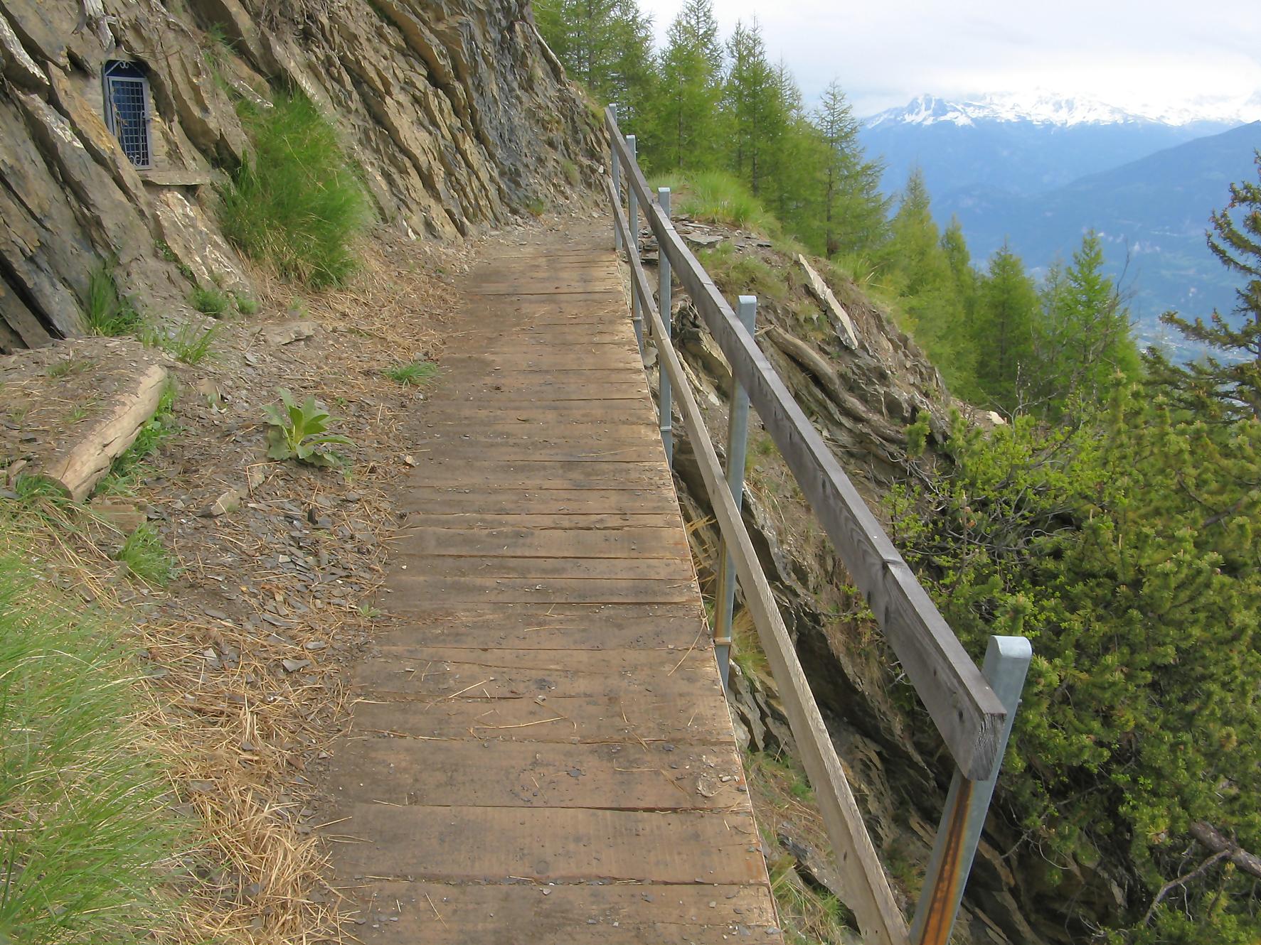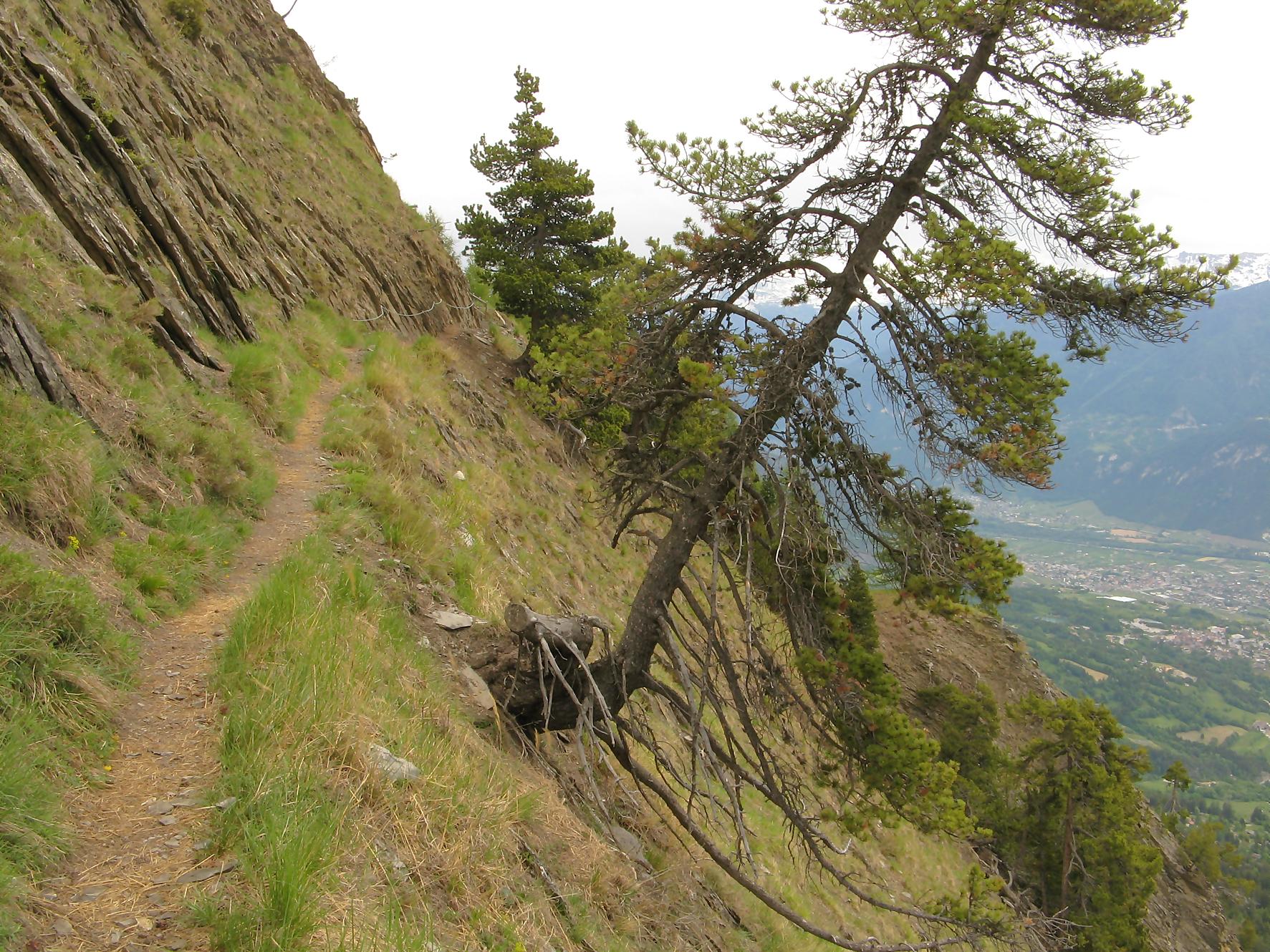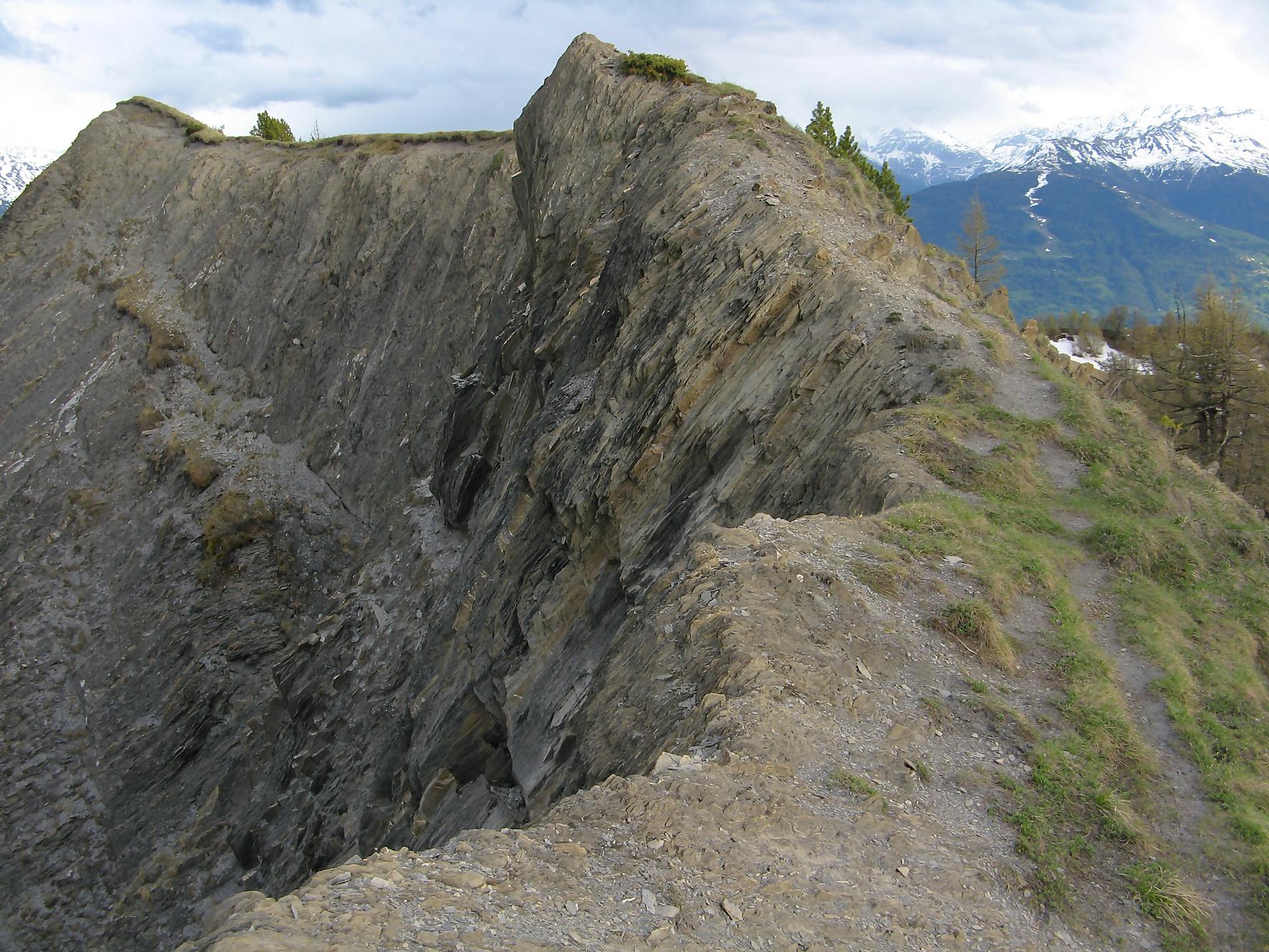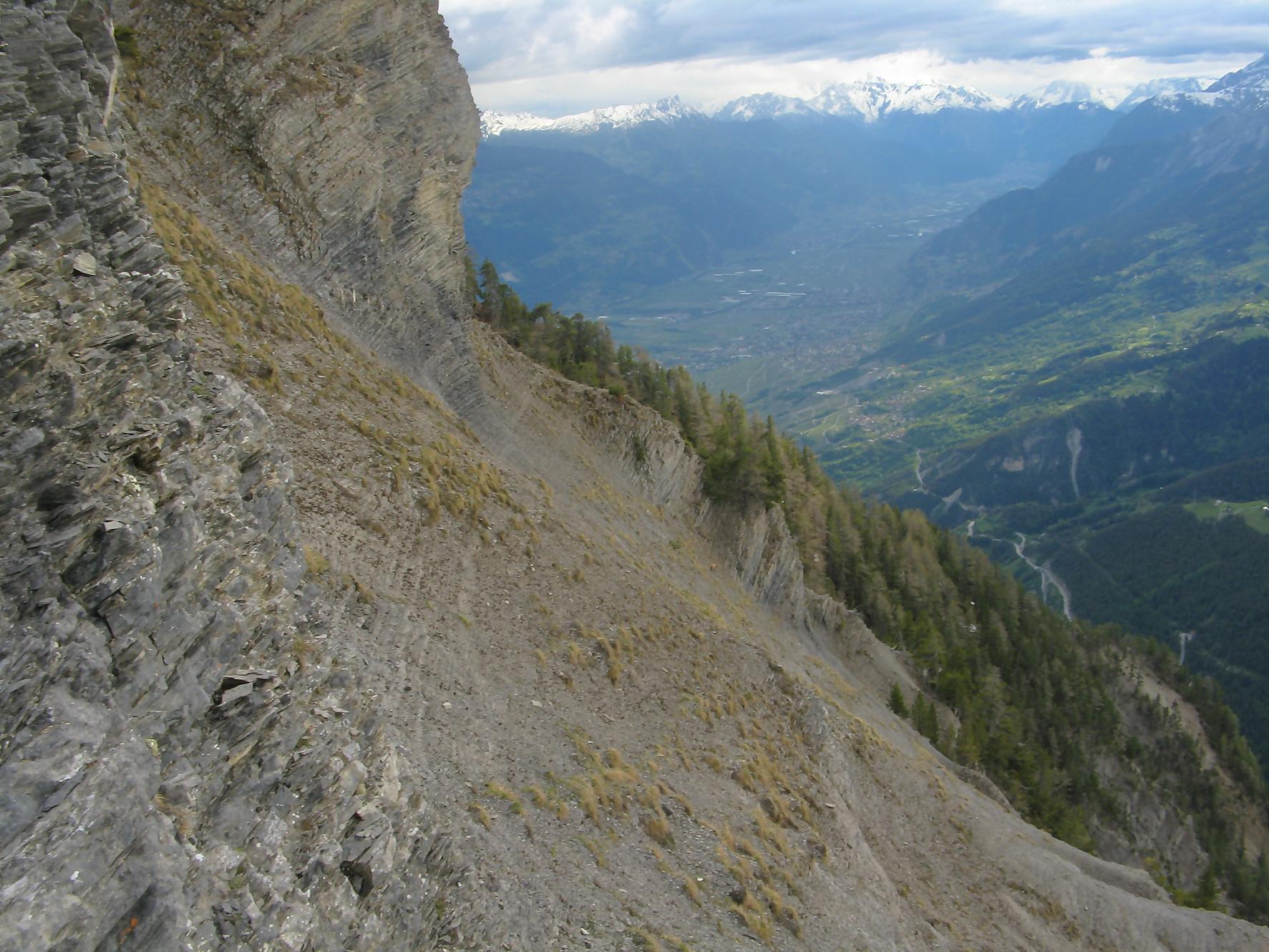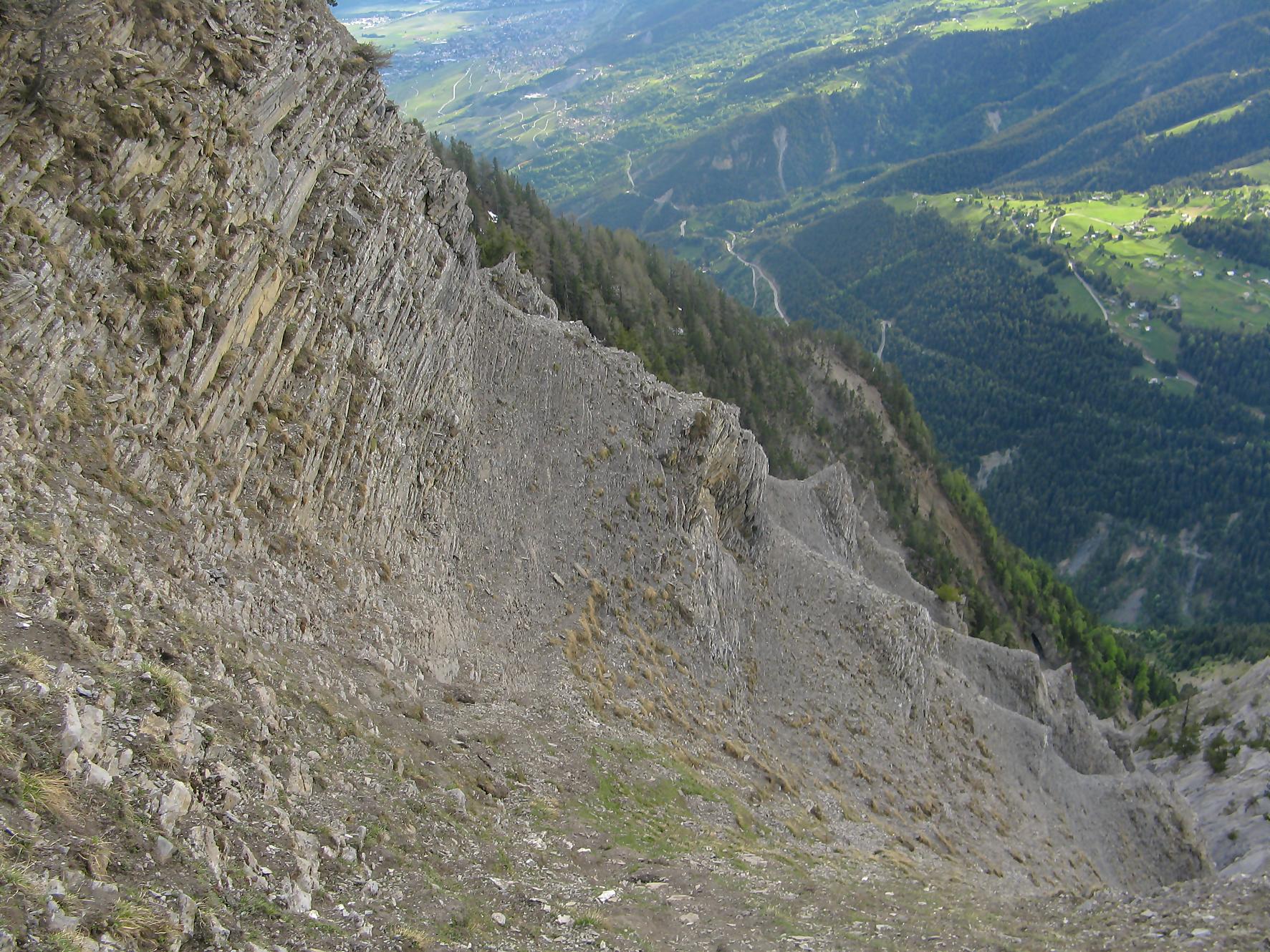 C’est la fin du printemps 2008 et je décide de revenir à Prabé et de rejoindre le sommet de Pra Roua. Vu le dénivelé, je pars plus haut que ma précédente course, donc depuis le virage du Pt1613. Ce départ se fait droit sur l’arête et donc les muscles sont mis à rudes épreuves dès le départ, il n’y a pas de tour de chauffe ! On monte le long de l’arête de La Loué à travers la forêt, avec à mi-parcours, une trouée sur la gauche qui permet d’admirer la face O abrupte et le Pont du Diable. Ensuite il y a des passages sécurisés par des chaines et avec en prime pour l’un, un pont. Au retour je prendrai un raccourci par la crête, peu visible à la montée. Il y a aussi une variante plus loin sur la droite un petit passage en crête aérien, en guise d’entrainement pour la suite.