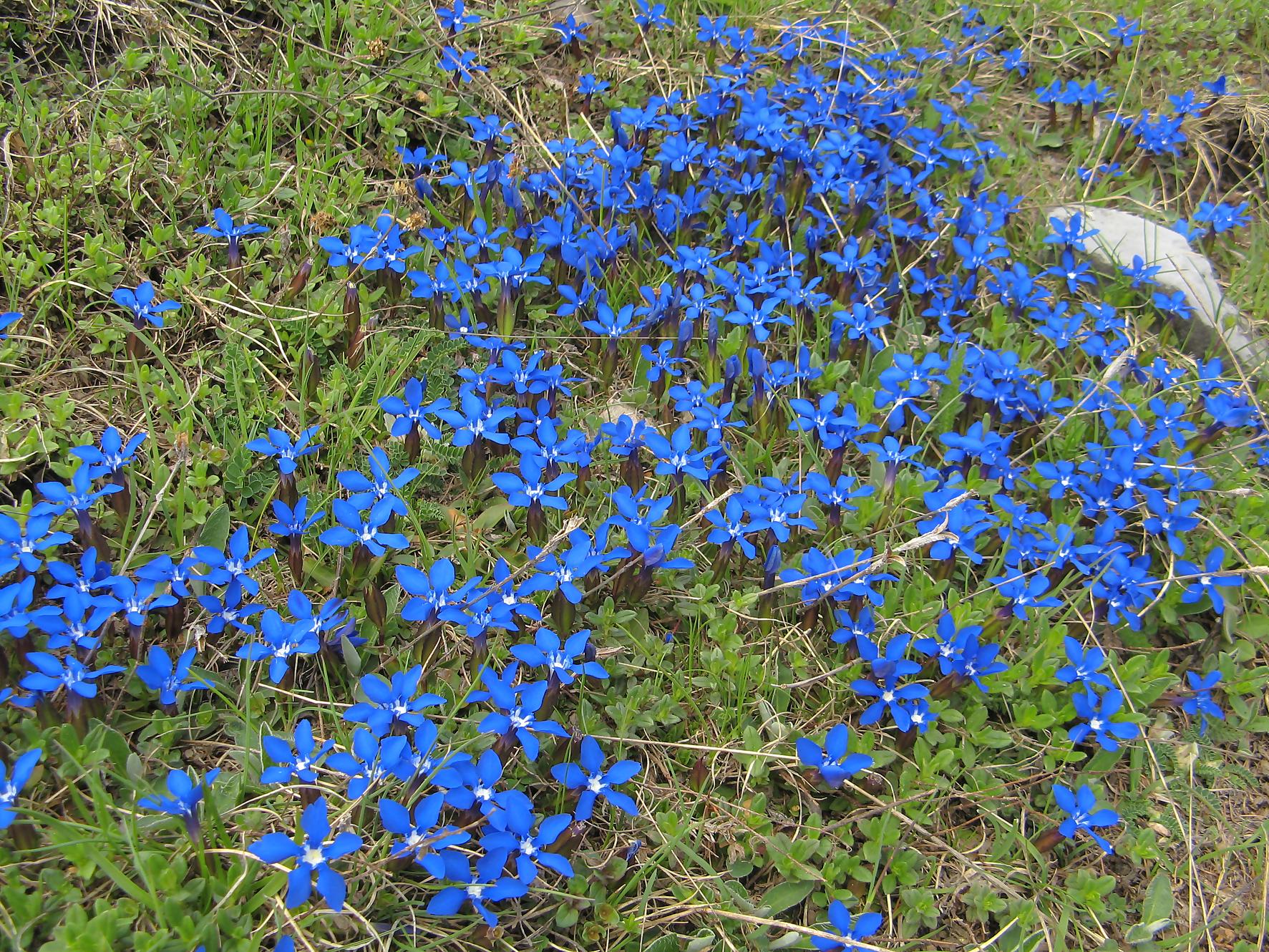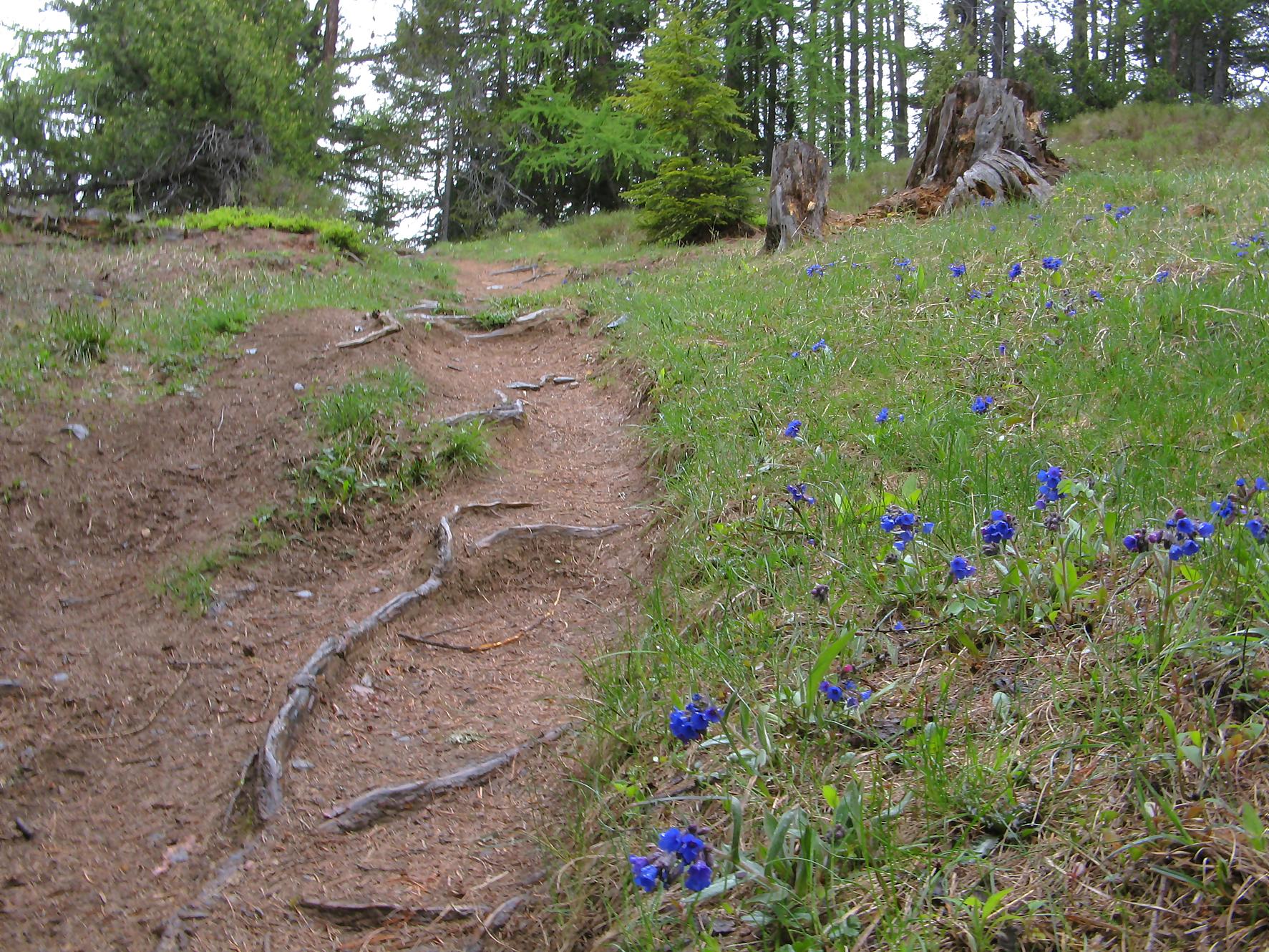 Puis nous arrivons dans une clairière avec en vue les paravalanches, le terrain devient doux et permet de rejoindre facilement le refuge de Prabé. Je fais une halte et je visite ce refuge bien mignon. Comme c’est le printemps, j’ai le droit à une multitude de couleurs des fleurs, un régal pour les yeux ! Même le chemin pour les toilettes extérieures est rempli de gentianes, quel luxe gratuit !