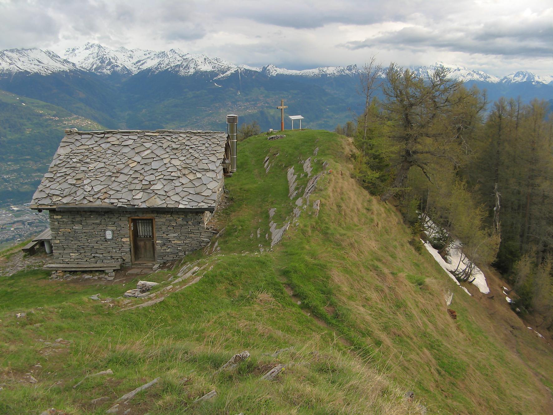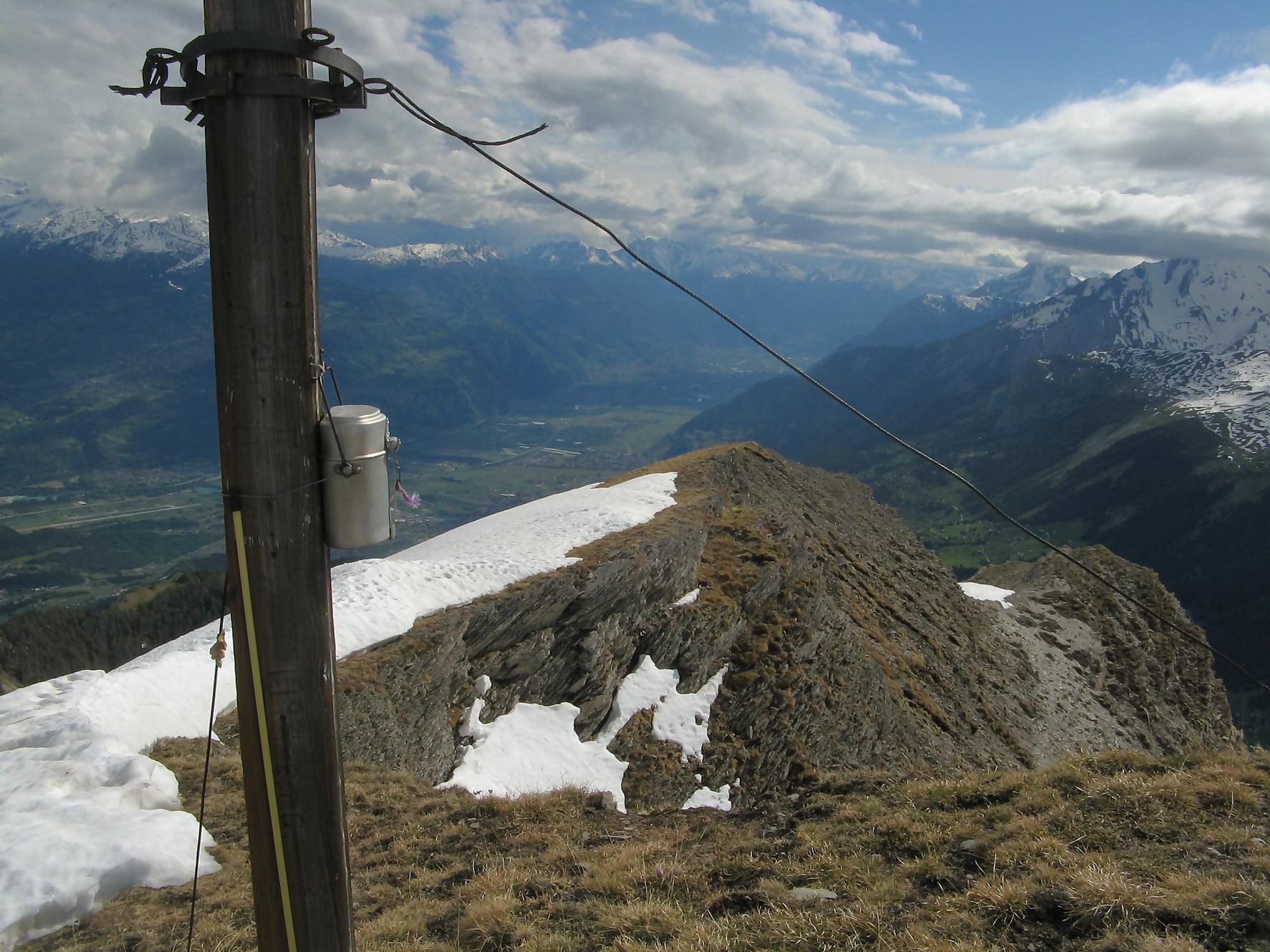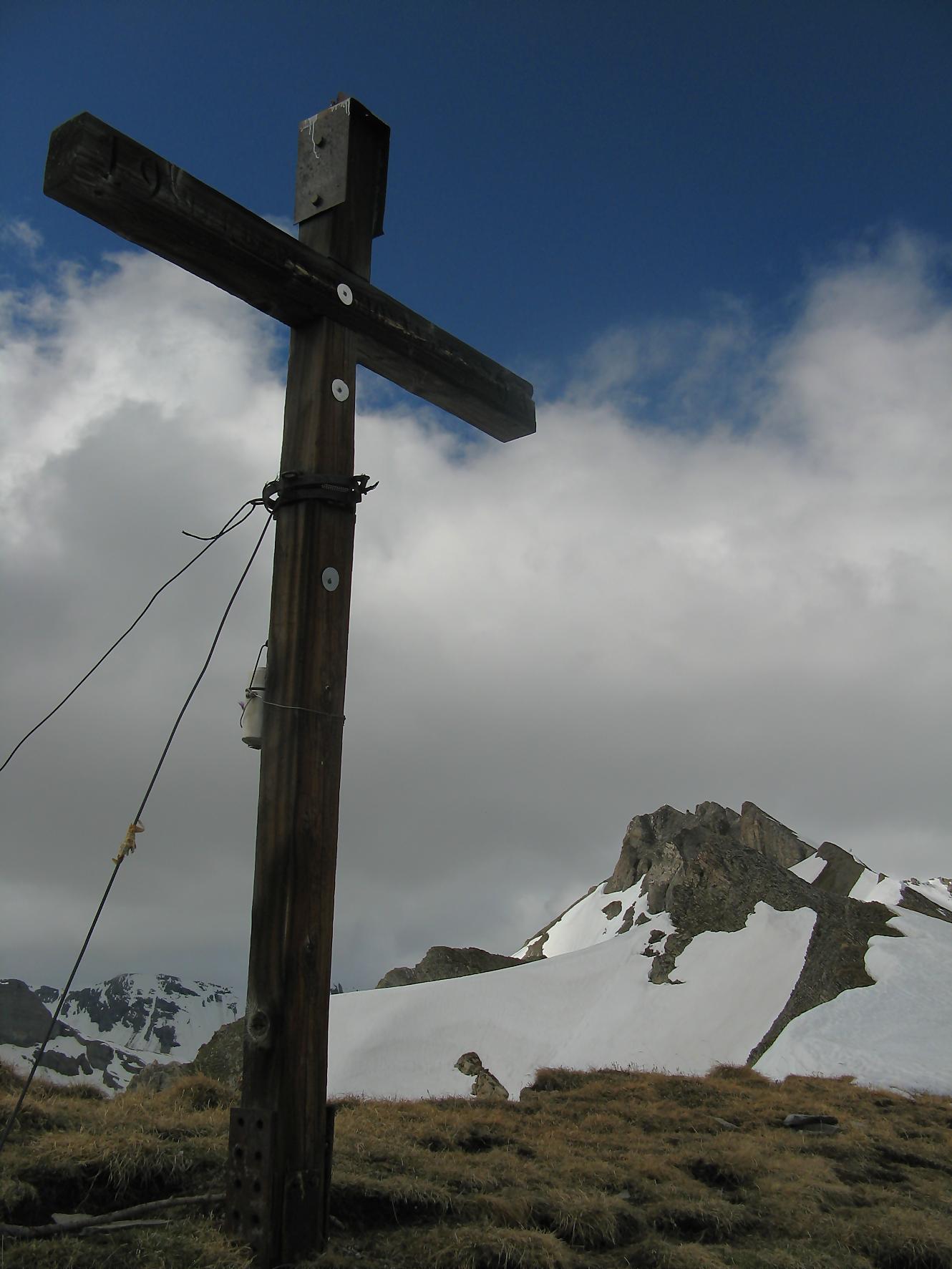 Après cette pause, je pars en direction de Pra Roua, et je m’engage donc en terre inconnue. Je passe une barrière à moutons et je longe une crête plus ou moins à flanc de coteau. Le chemin est bien tracé, puis j’arrive à un endroit où je ne peux plus continuer sur la crête, je ne vois plus de trace. Je regarde sur ma gauche, c’est bien pentu mais je n’ai pas le choix, je descends au mieux et vois quelques traces de pas, soulagement ! Puis je revois une sente à flanc de coteau, avec des traces de peintures rouges défraichies. Le devers est pentu et la combe profonde, bref c’est un peu exposé ! J’hésite plusieurs minutes et finalement je me lance. Il n’y a la place que pour poser un pied à la fois et on avance doucement, qui va piano va sano, ce dicton doit être inscrit dans nos gènes ! C’est le passage le plus délicat de la course. Ce passage, toujours long quand on est en plein milieu, passé on trouve un terrain moins stressant. A la fin on monte dans une combe, la pente se raidit mais ne pose pas de problème puis on bascule sur le versant O où un névé m’accueille. Je le remonte pour ensuite longer une crête depuis le Pt2487 et arriver au sommet de Pra Roua (2518). Une simple croix, avec une gamelle de soldat contenant un livre d’or, et je comprends que je suis l’un des rares à monter par cette voie.