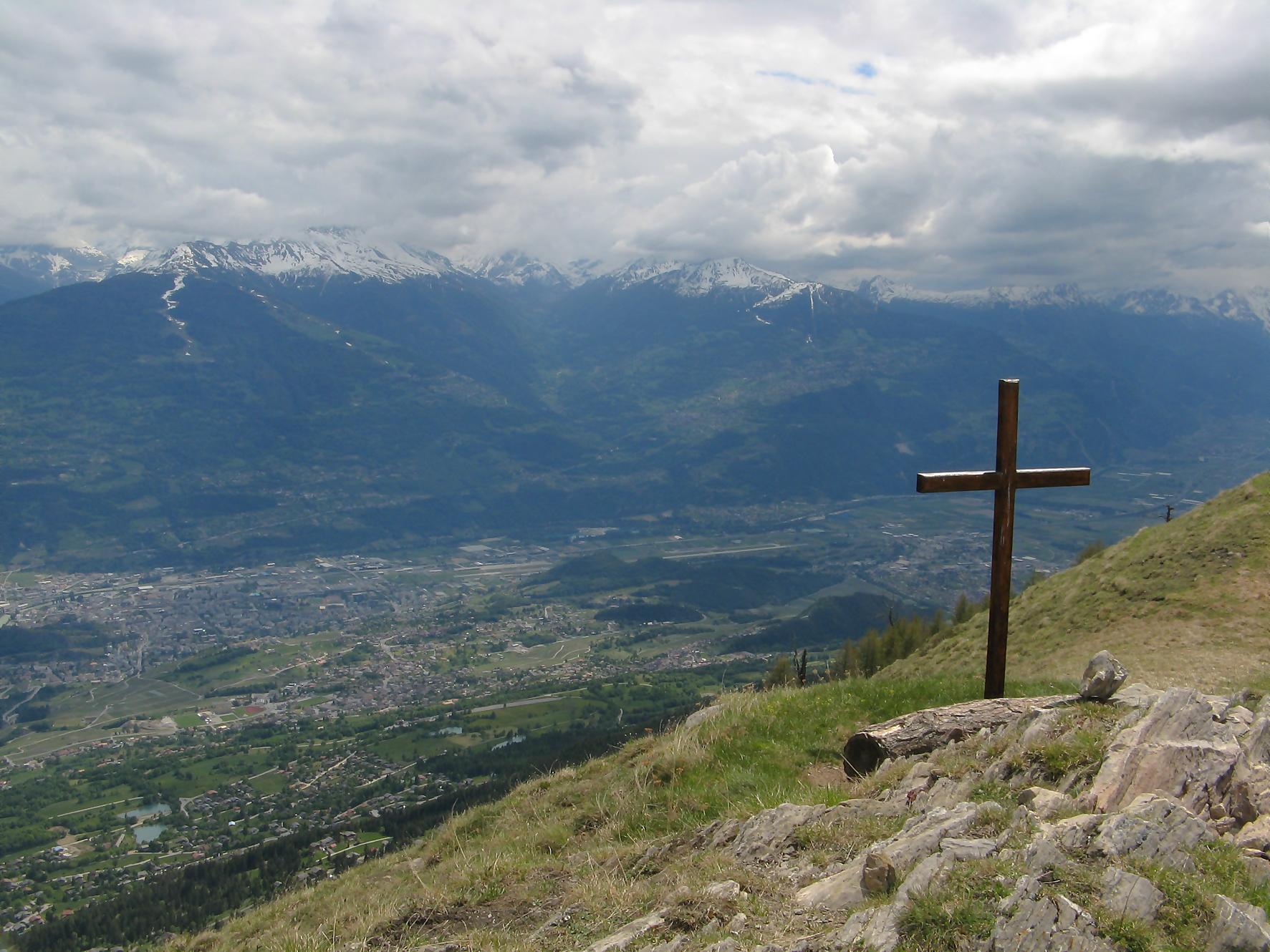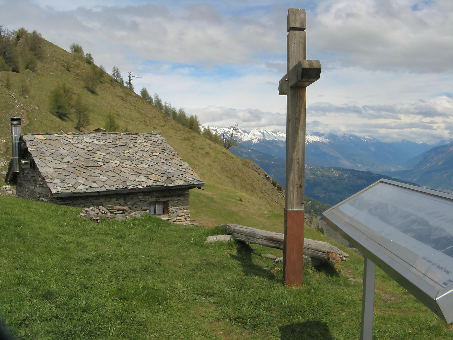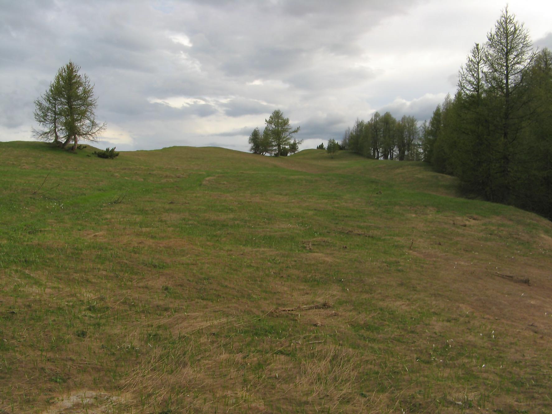 Après cette pause, je pars en direction de Pra Roua, et je m’engage donc en terre inconnue. Je passe une barrière à moutons et je longe une crête plus ou moins à flanc de coteau. Le chemin est bien tracé, puis j’arrive à un endroit où je ne peux plus continuer sur la crête, je ne vois plus de trace. Je regarde sur ma gauche, c’est bien pentu mais je n’ai pas le choix, je descends au mieux et vois quelques traces de pas, soulagement ! Puis je revois une sente à flanc de coteau, avec des traces de peintures rouges défraichies. Le devers est pentu et la combe profonde, bref c’est un peu exposé ! J’hésite plusieurs minutes et finalement je me lance. Il n’y a la place que pour poser un pied à la fois et on avance doucement, qui va piano va sano, ce dicton doit être inscrit dans nos gènes ! C’est le passage le plus délicat de la course. Ce passage, toujours long quand on est en plein milieu, passé on trouve un terrain moins stressant. A la fin on monte dans une combe, la pente se raidit mais ne pose pas de problème puis on bascule sur le versant O où un névé m’accueille. Je le remonte pour ensuite longer une crête depuis le Pt2487 et arriver au sommet de Pra Roua (2518). Une simple croix, avec une gamelle de soldat contenant un livre d’or, et je comprends que je suis l’un des rares à monter par cette voie.