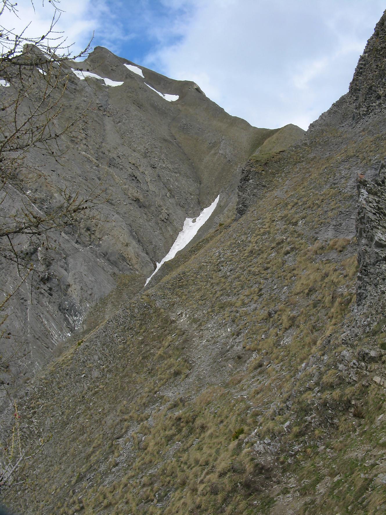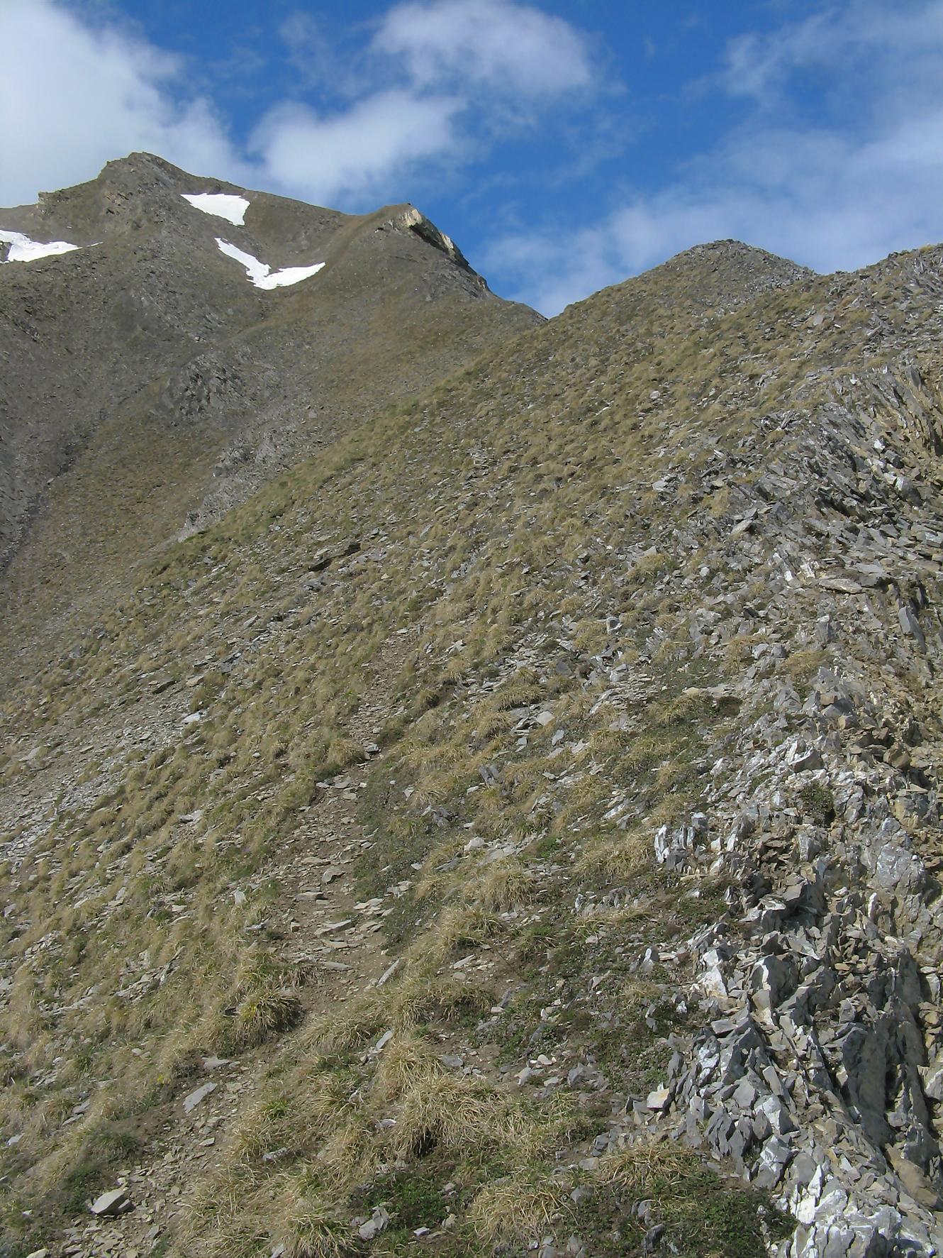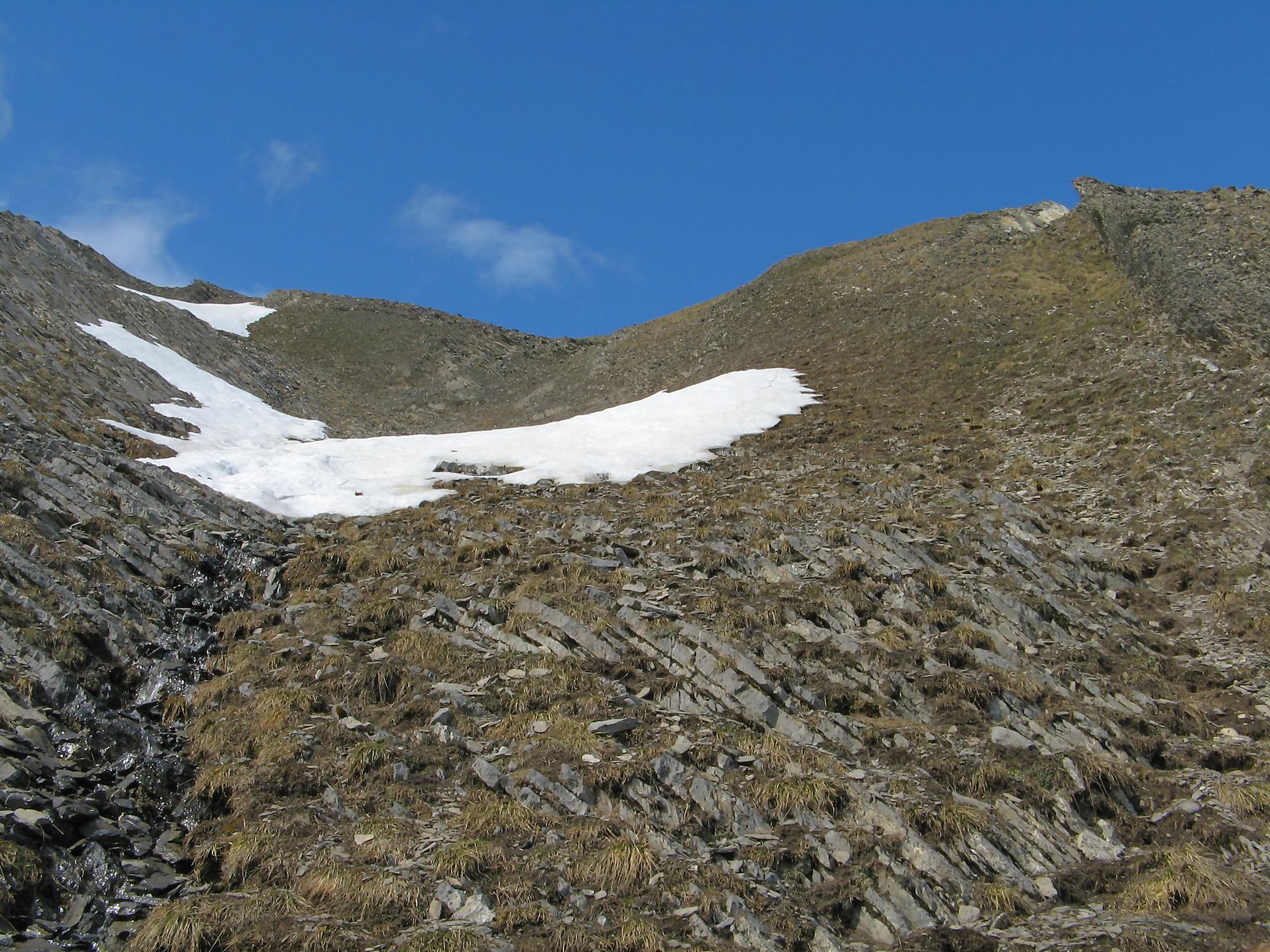 Après une bonne pause, je rebrousse chemin, je profite du névé, pour une glissade dans la partie pentue et je retrouve le chemin de la montée. Je fais une erreur de trajectoire, je suis descendu dans une combe trop bas et je m’aperçois de mon erreur. Plutôt que de rebrousser chemin, je coupe au mieux pour remonter plus loin, le secteur est stressant mais si en plus je joue les prolongations … Je finis par retrouver le passage escarpé marqué de points rouges et ensuite la crête qui me ramène à Prabé.
