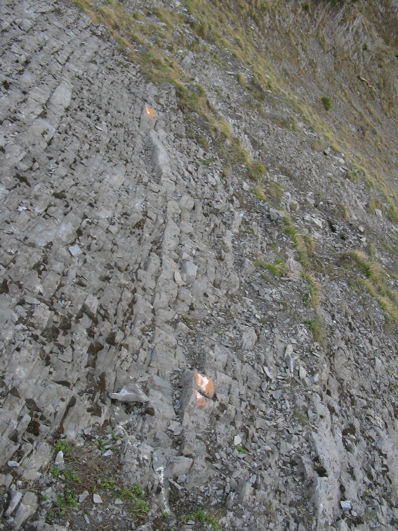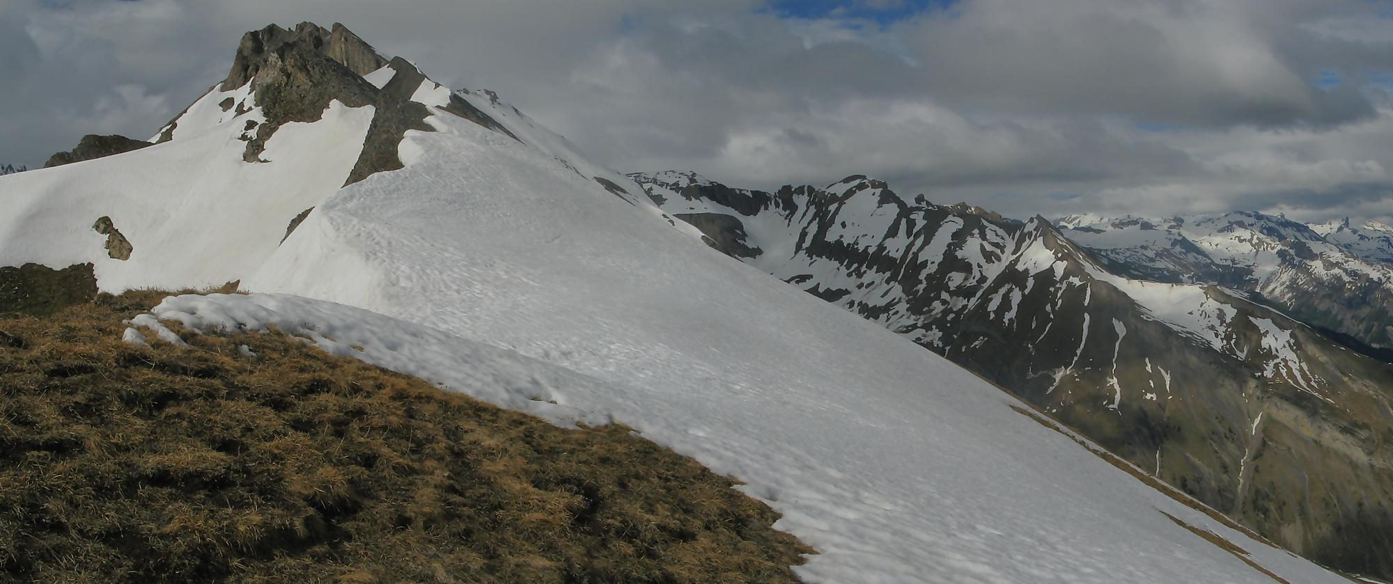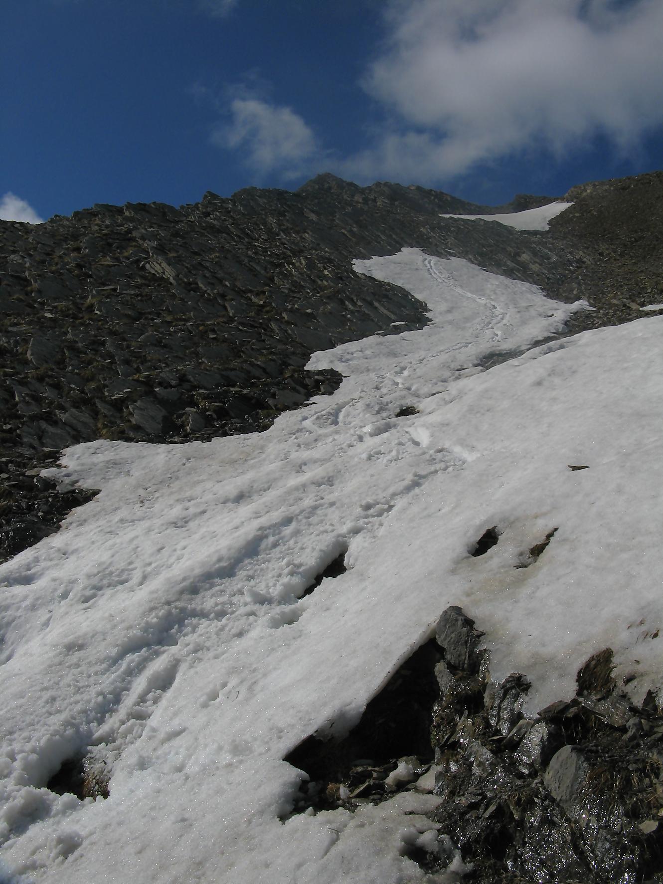 Après une bonne pause, je rebrousse chemin, je profite du névé, pour une glissade dans la partie pentue et je retrouve le chemin de la montée. Je fais une erreur de trajectoire, je suis descendu dans une combe trop bas et je m’aperçois de mon erreur. Plutôt que de rebrousser chemin, je coupe au mieux pour remonter plus loin, le secteur est stressant mais si en plus je joue les prolongations … Je finis par retrouver le passage escarpé marqué de points rouges et ensuite la crête qui me ramène à Prabé.
