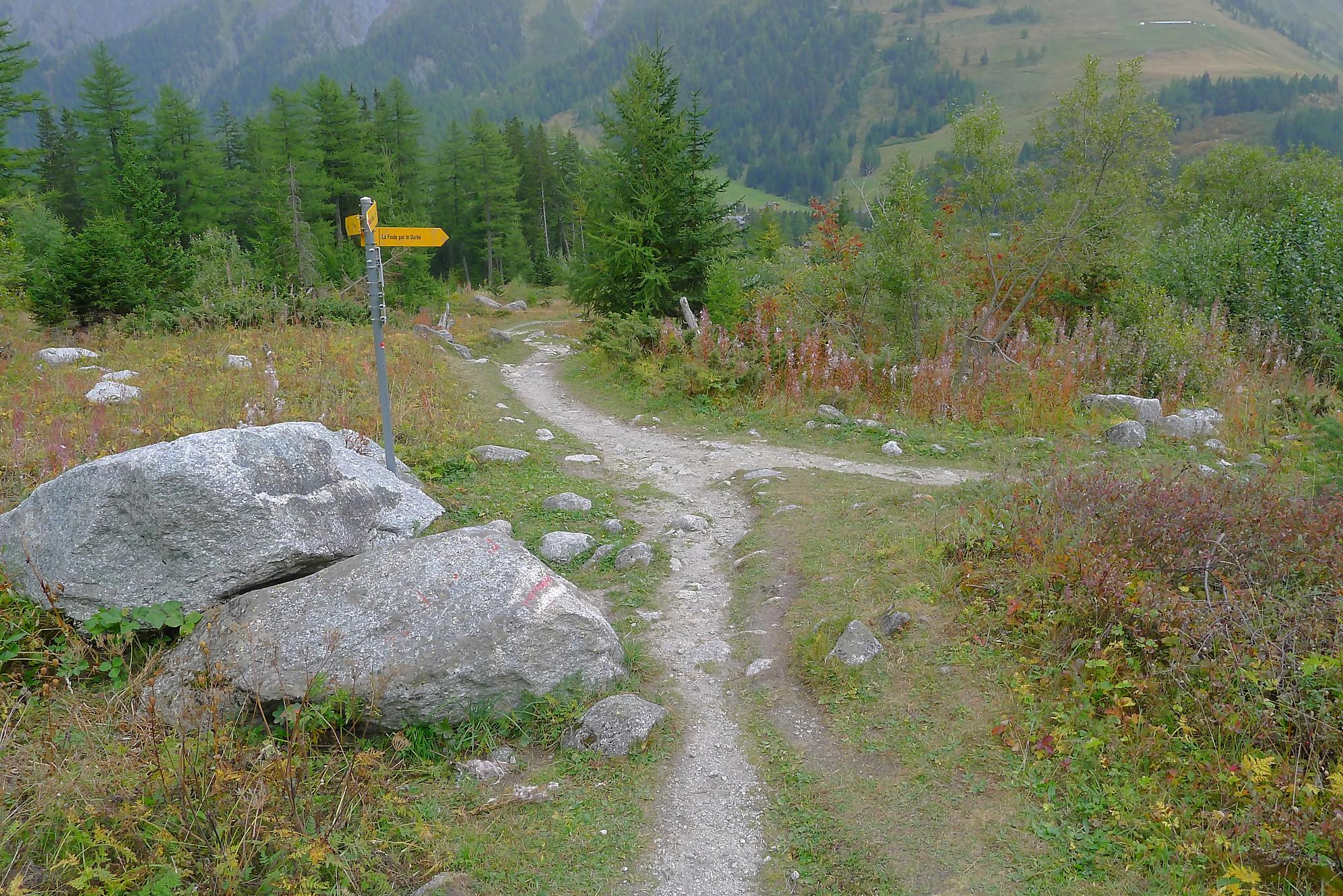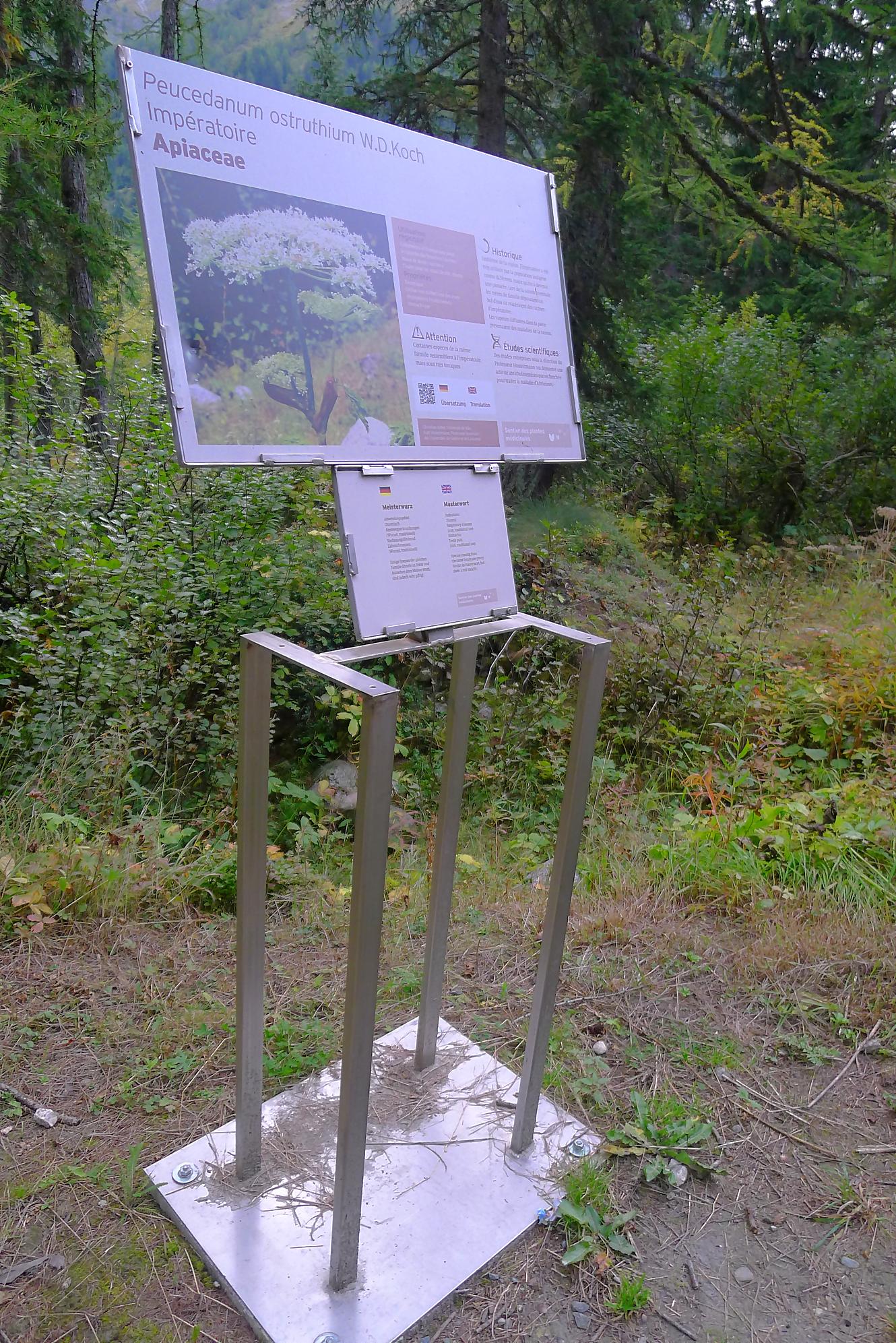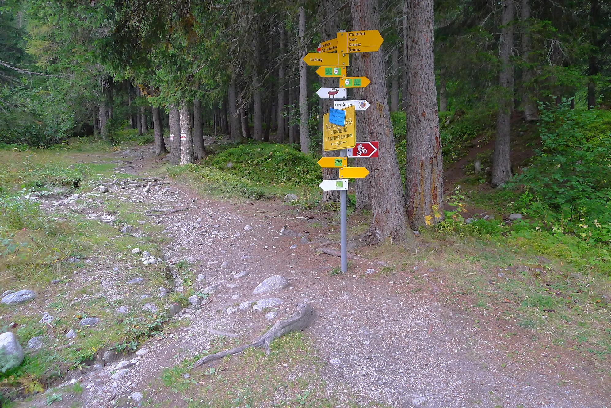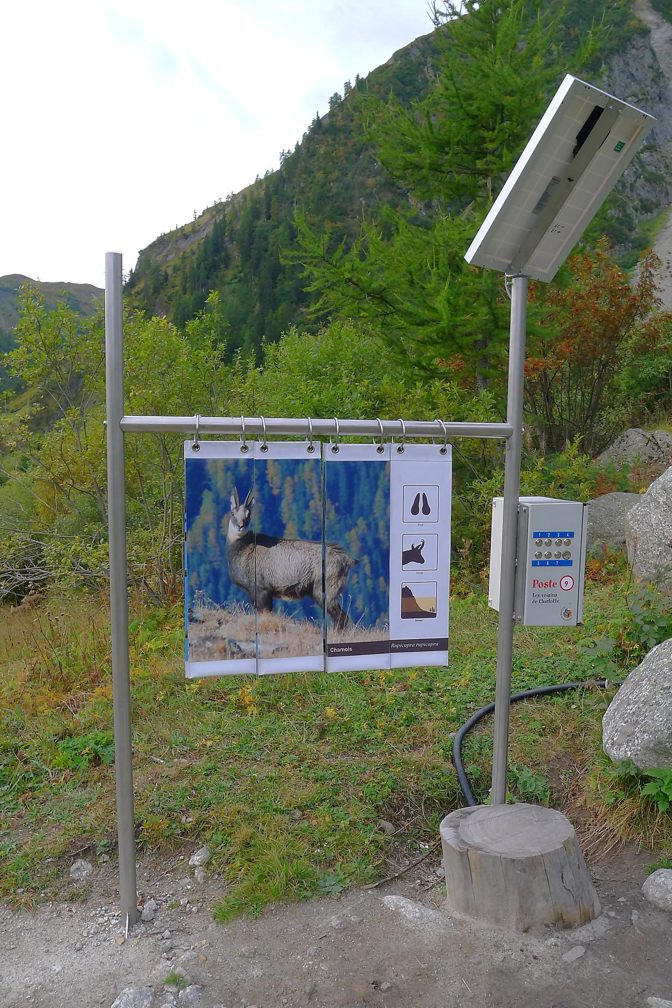 Nous partons depuis le camping de La Fouly, pour traverser une petite forêt. Il y a quelques panneaux touristiques sur des plantes en guise de mise en bouche culturelle. Nous sortons de la forêt pour traverser le lieu-dit Désert. Une animation (cris d’oiseaux) nous fait marquer une pause. C’est juste dommage que les touches d’un cri ne soient pas libellées, ie on appuie sur une touche, sans savoir qu’elle animal nous allons entendre. En gros si tu ne connais rien t’es cuit, et si tu connais tu passes ton chemin !