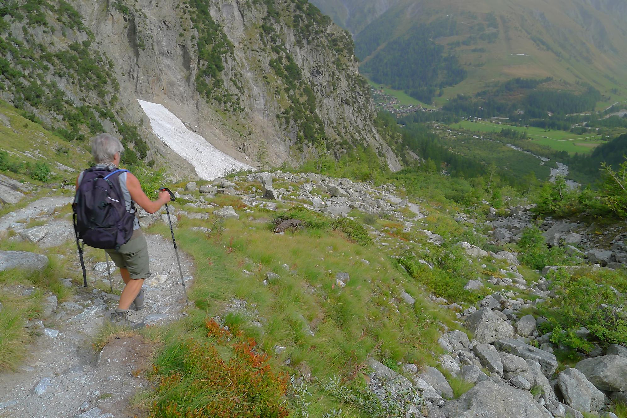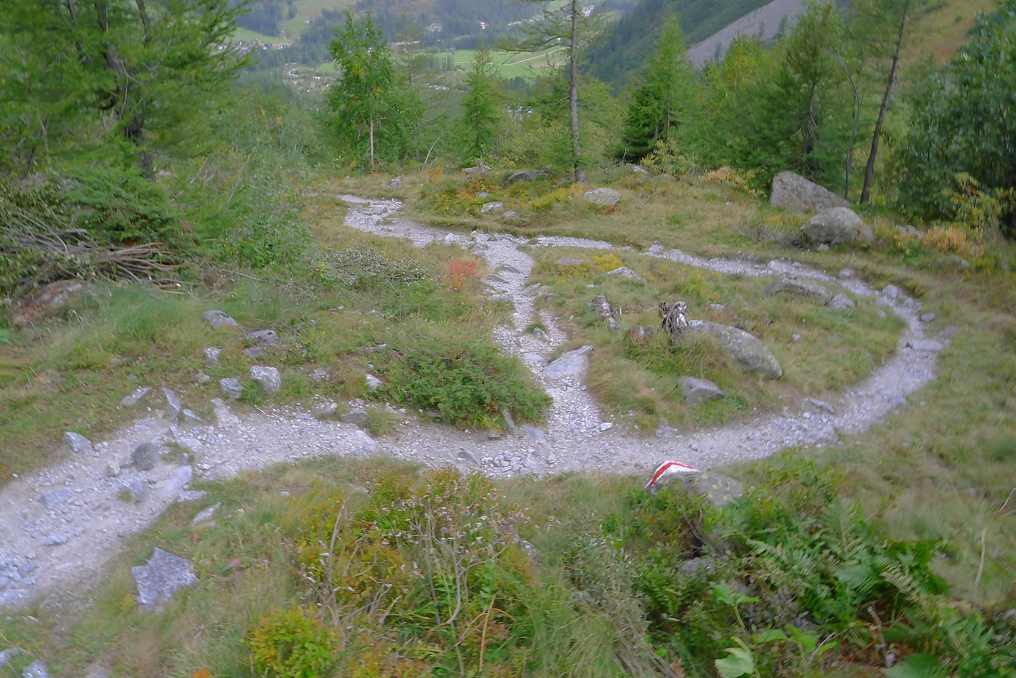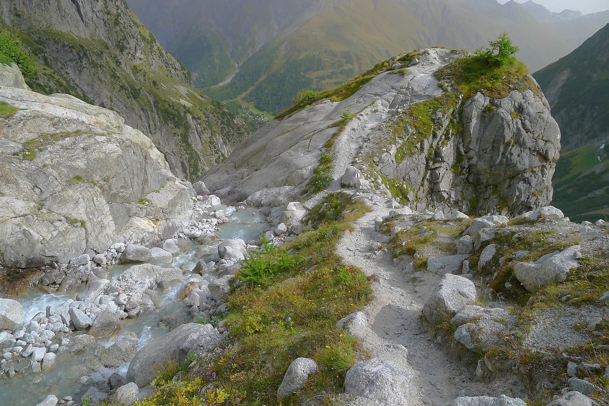 Nous partons depuis le camping de La Fouly, pour traverser une petite forêt. Il y a quelques panneaux touristiques sur des plantes en guise de mise en bouche culturelle. Nous sortons de la forêt pour traverser le lieu-dit Désert. Une animation (cris d’oiseaux) nous fait marquer une pause. C’est juste dommage que les touches d’un cri ne soient pas libellées, ie on appuie sur une touche, sans savoir qu’elle animal nous allons entendre. En gros si tu ne connais rien t’es cuit, et si tu connais tu passes ton chemin !
