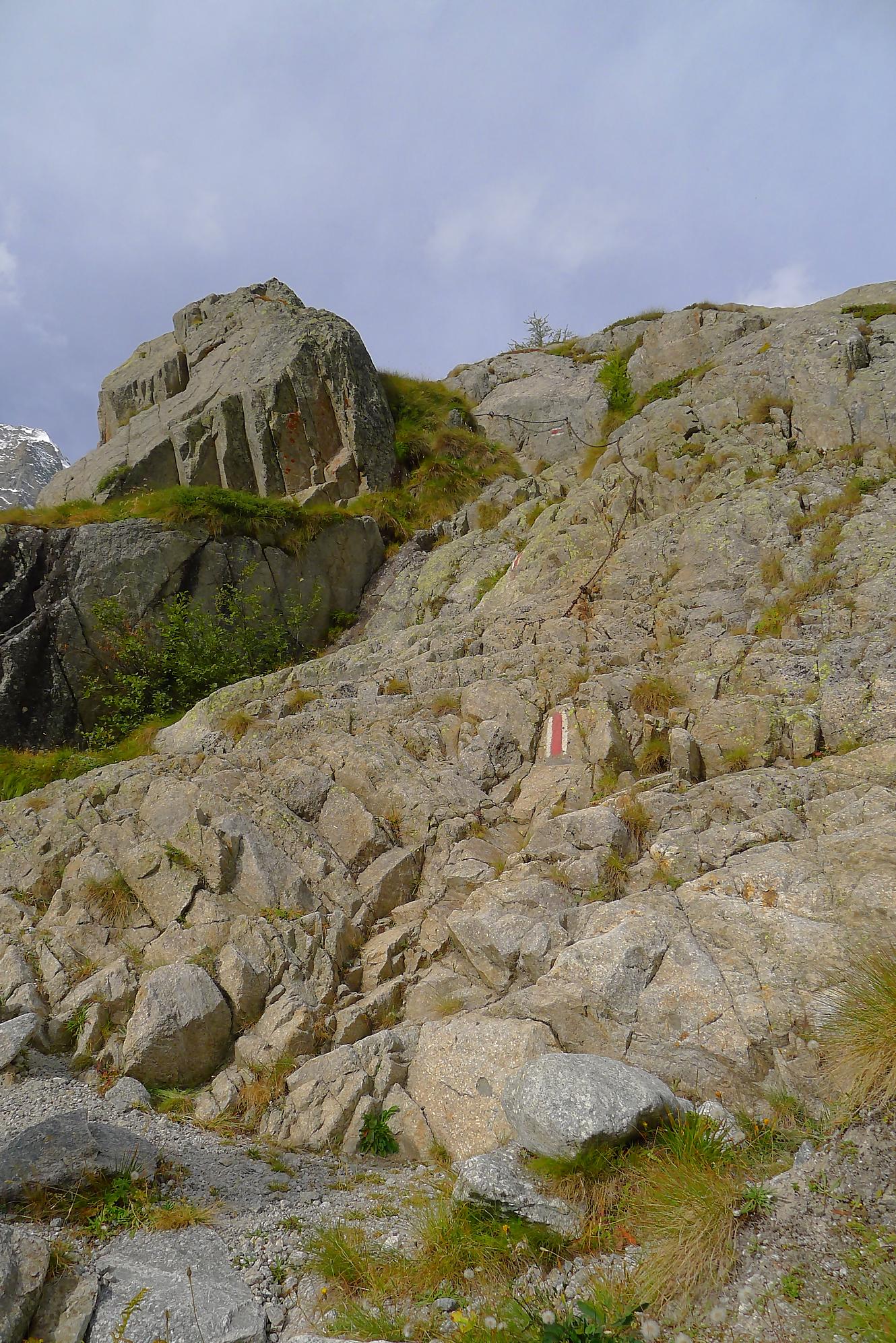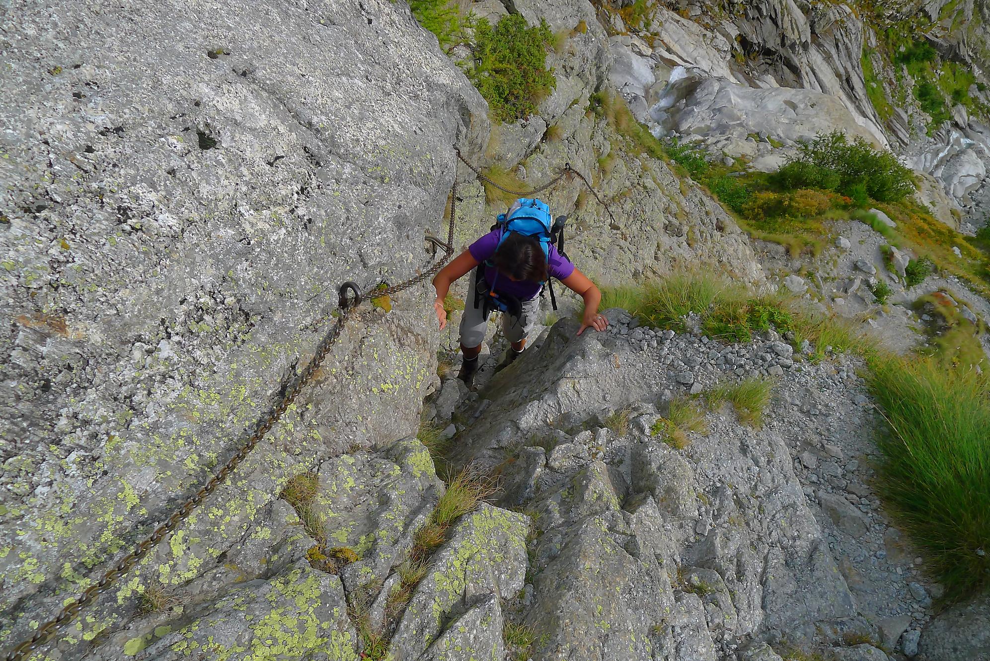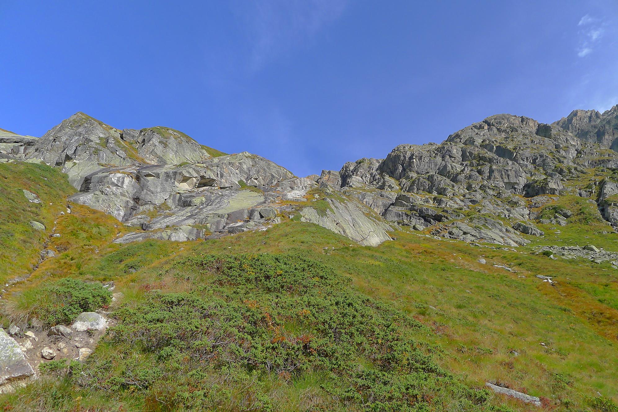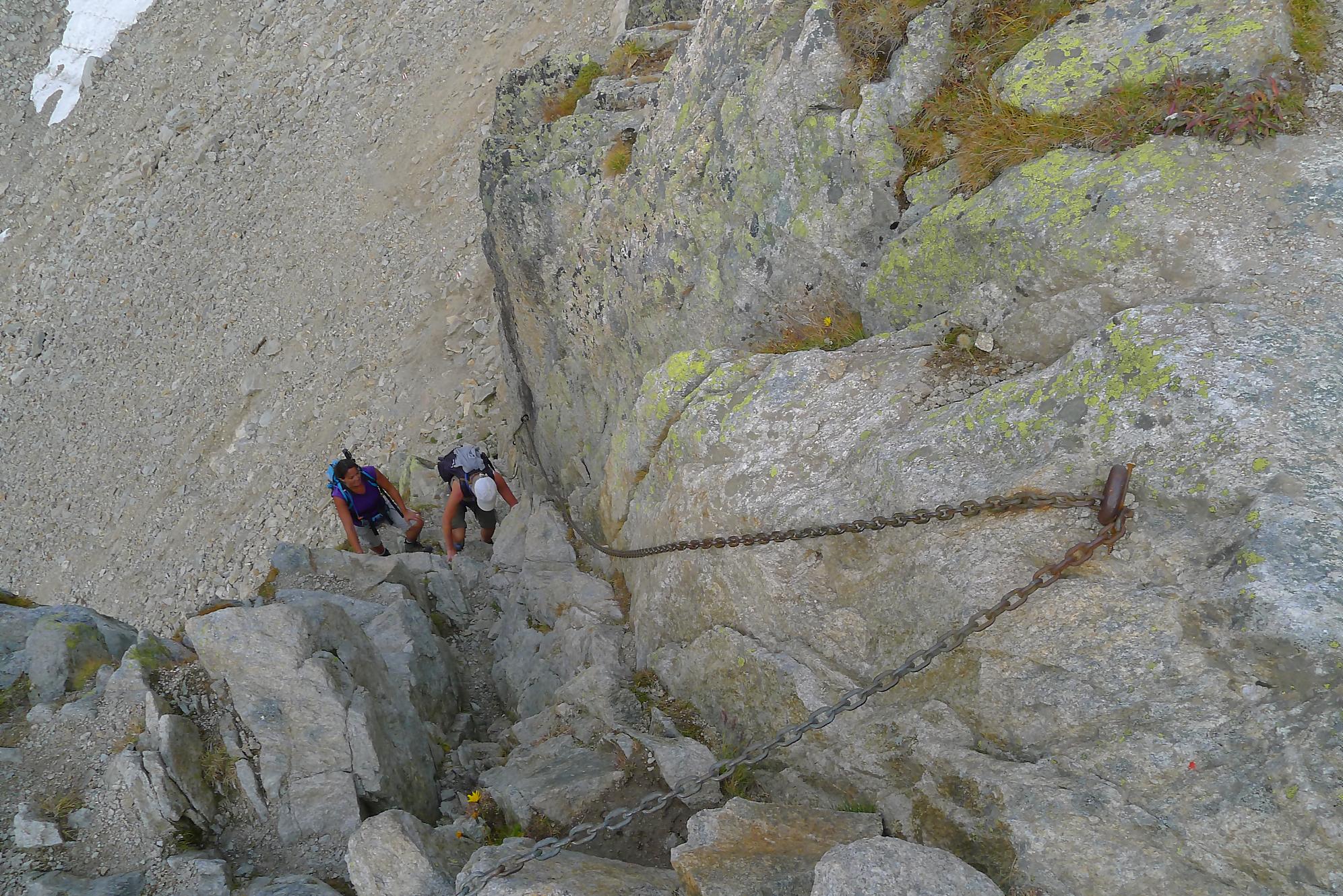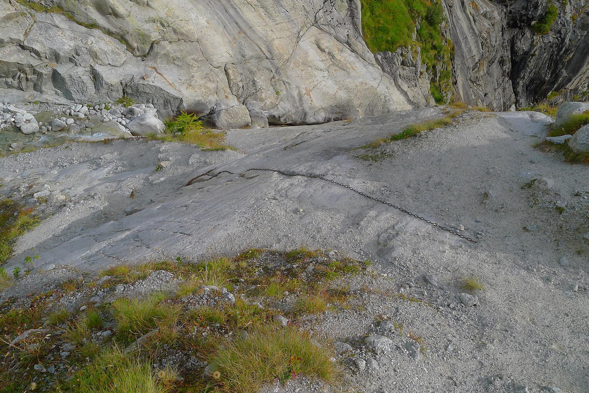 Le chemin continue en pente douce à travers des arbrissaux, puis il se décide enfin à monter le long d’une moraine. La vue se dégage sur les montagnes environnantes. Vers 2050m, il y a une bifurcation, soit par la moraine soit le long d’une faille et ses chaines. Par temps humide, cette option devrait être évitée. A l’aller nous avons pris l’option des chaines (même sous la cabane) et au retour l’option sans chaine. Cela fait un brin de variété.