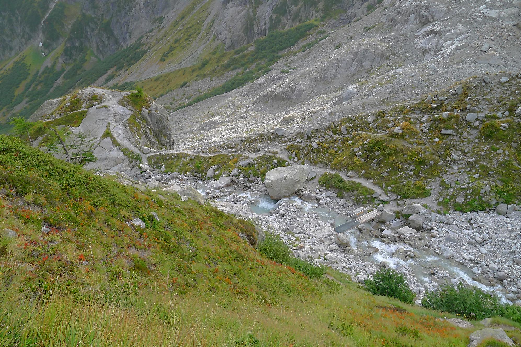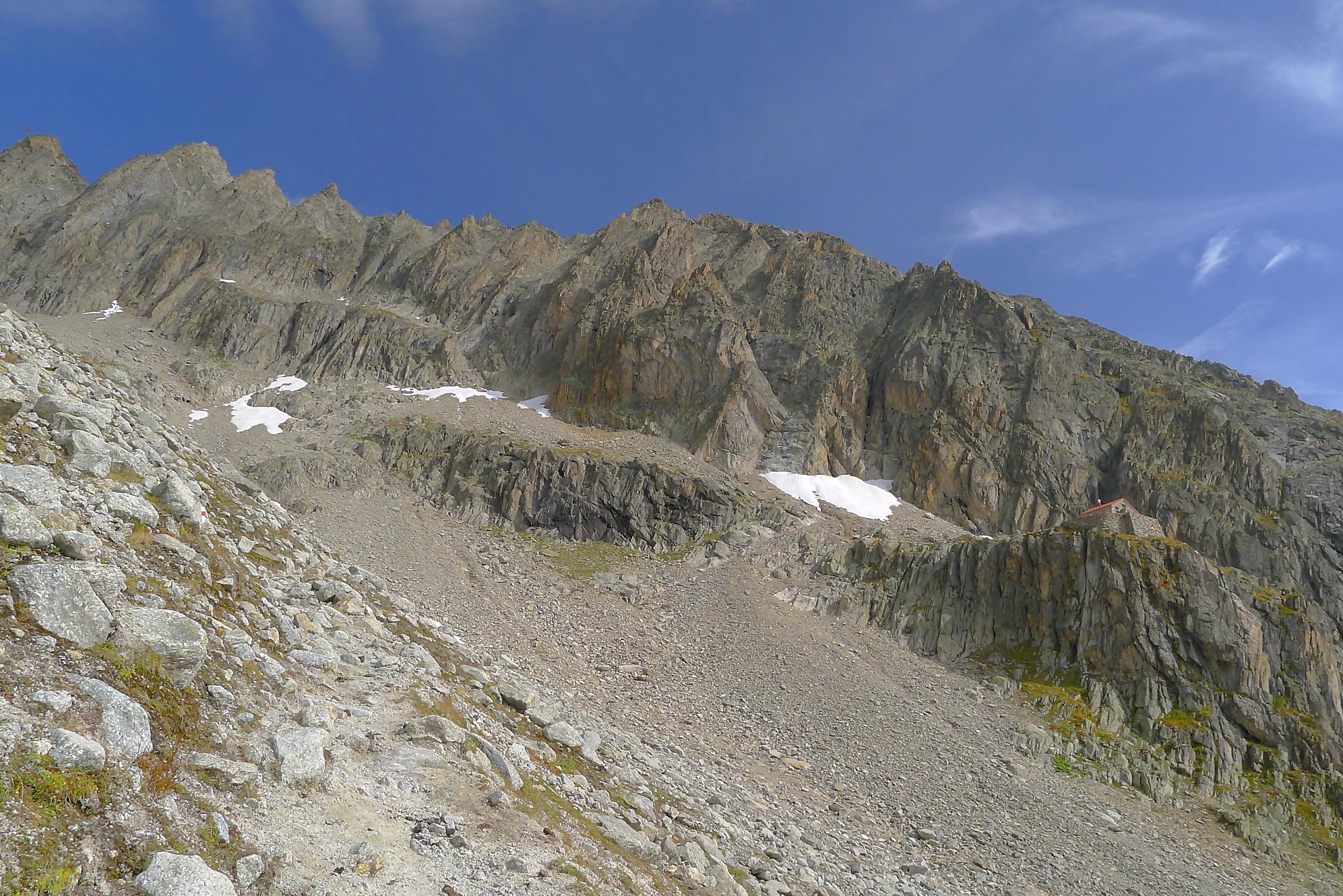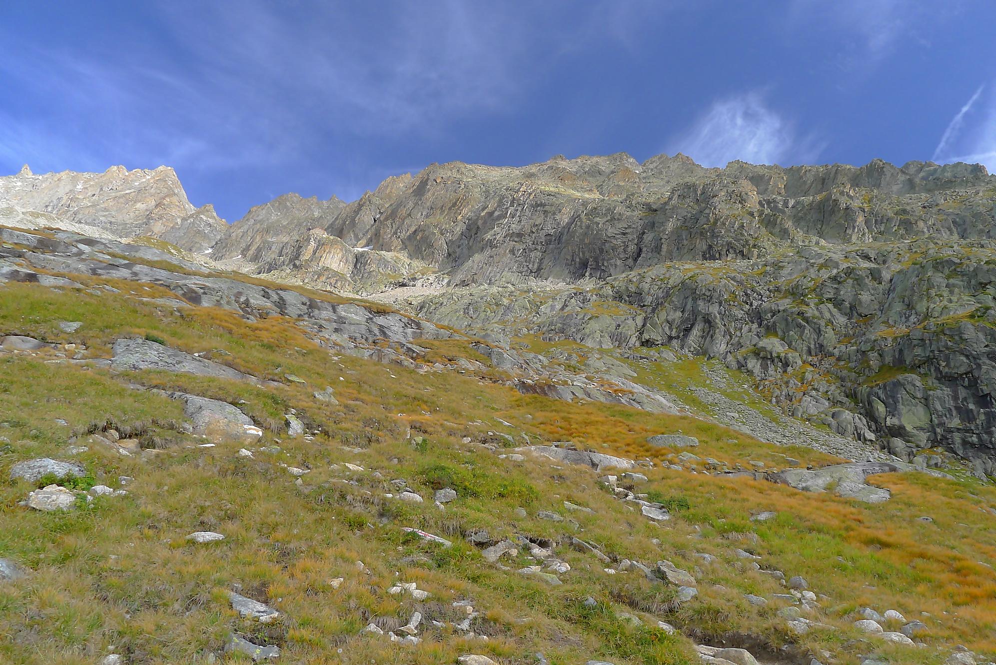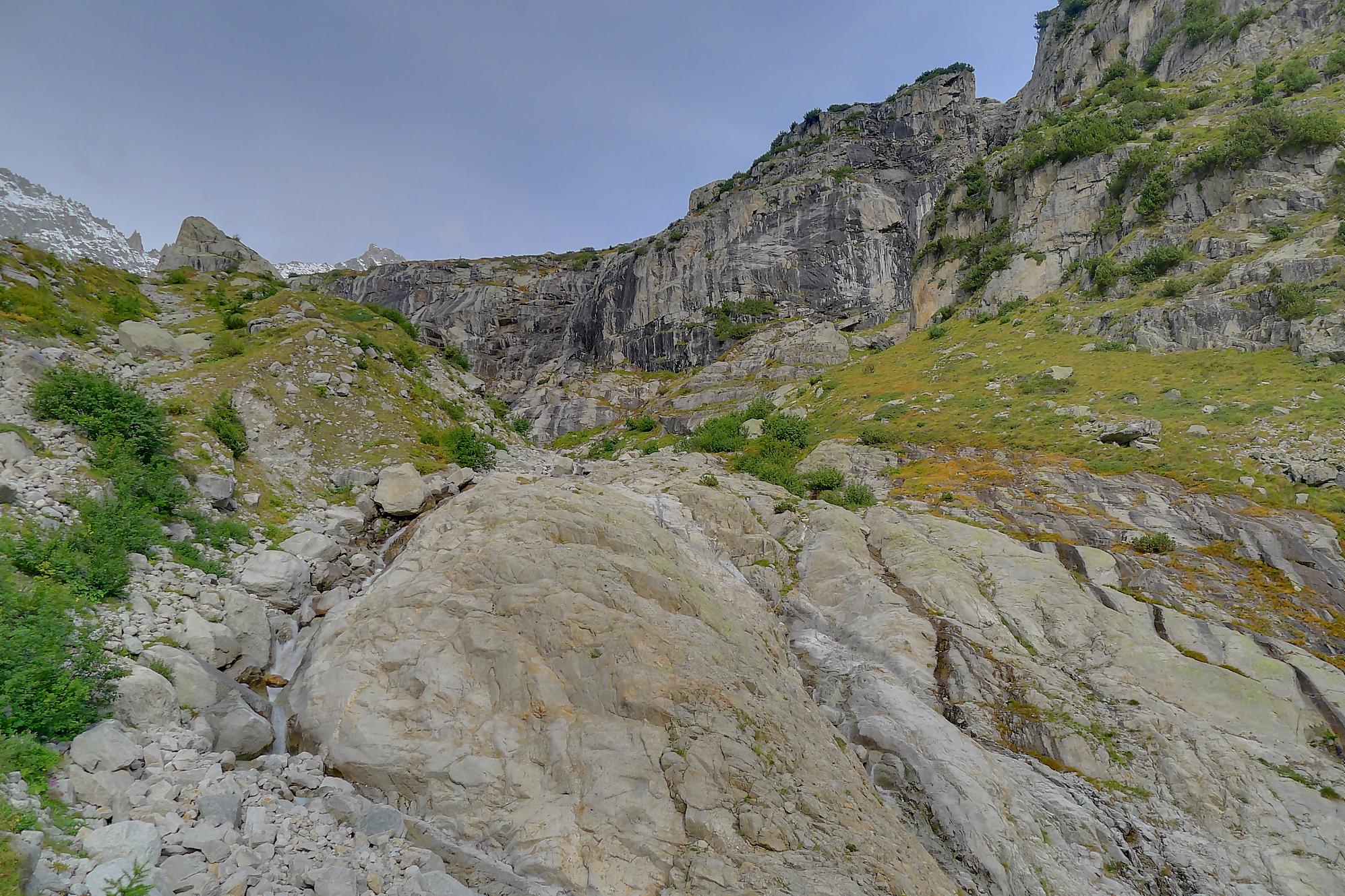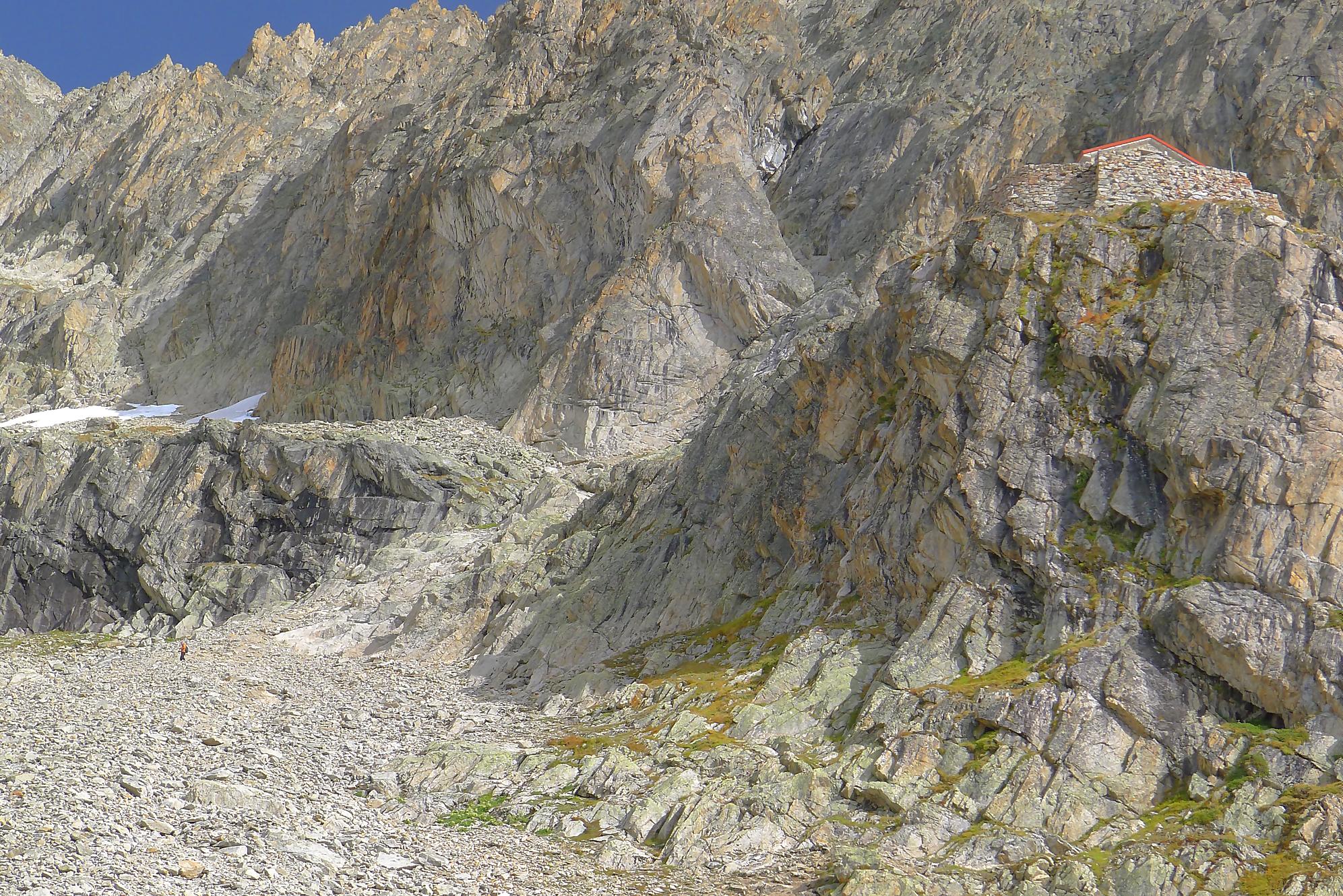 Le chemin continue en pente douce à travers des arbrissaux, puis il se décide enfin à monter le long d’une moraine. La vue se dégage sur les montagnes environnantes. Vers 2050m, il y a une bifurcation, soit par la moraine soit le long d’une faille et ses chaines. Par temps humide, cette option devrait être évitée. A l’aller nous avons pris l’option des chaines (même sous la cabane) et au retour l’option sans chaine. Cela fait un brin de variété.