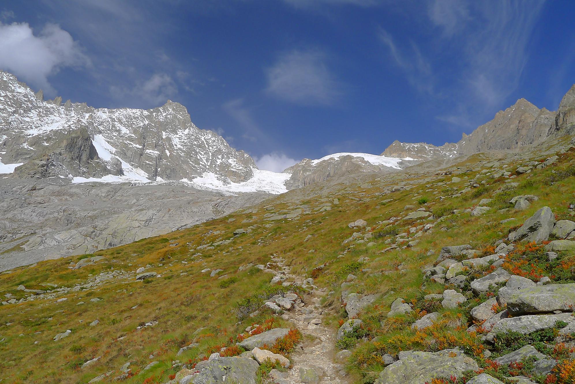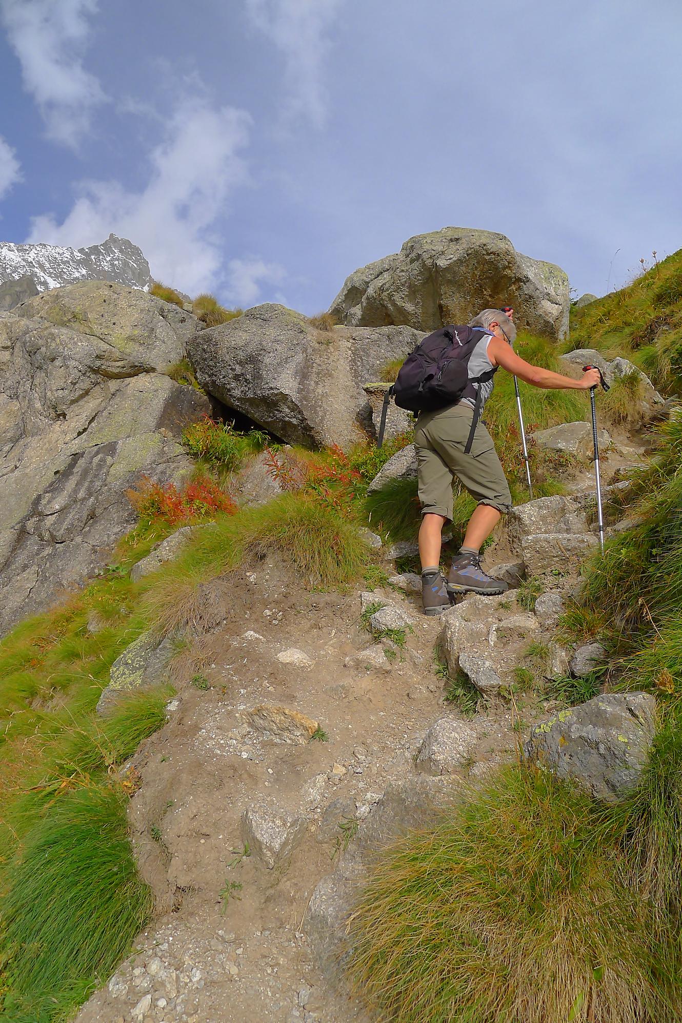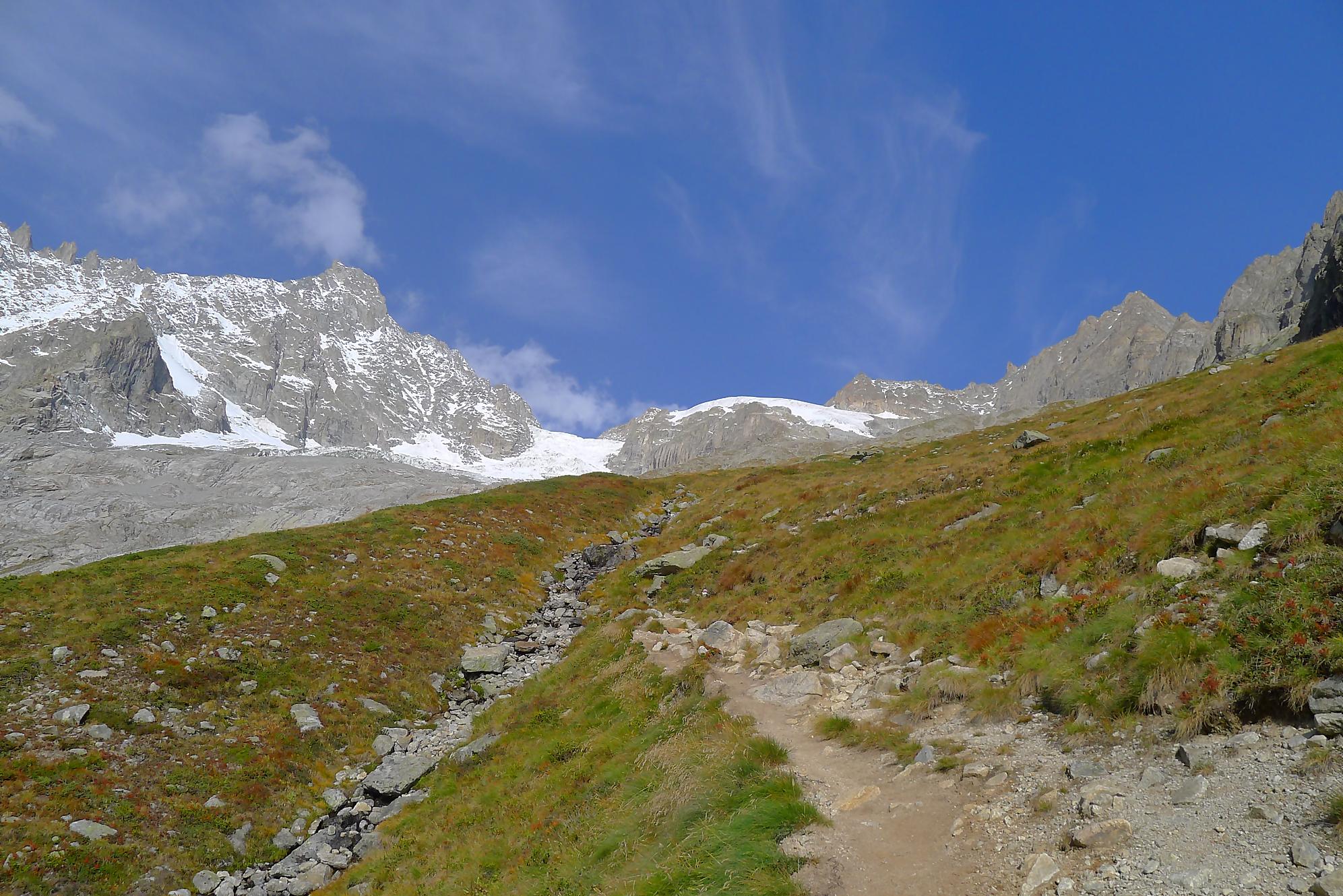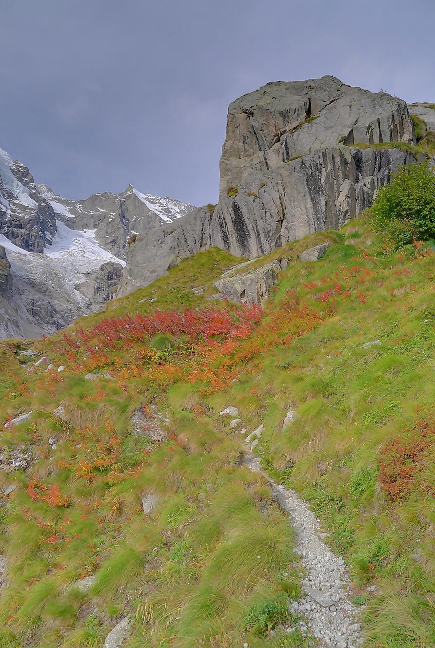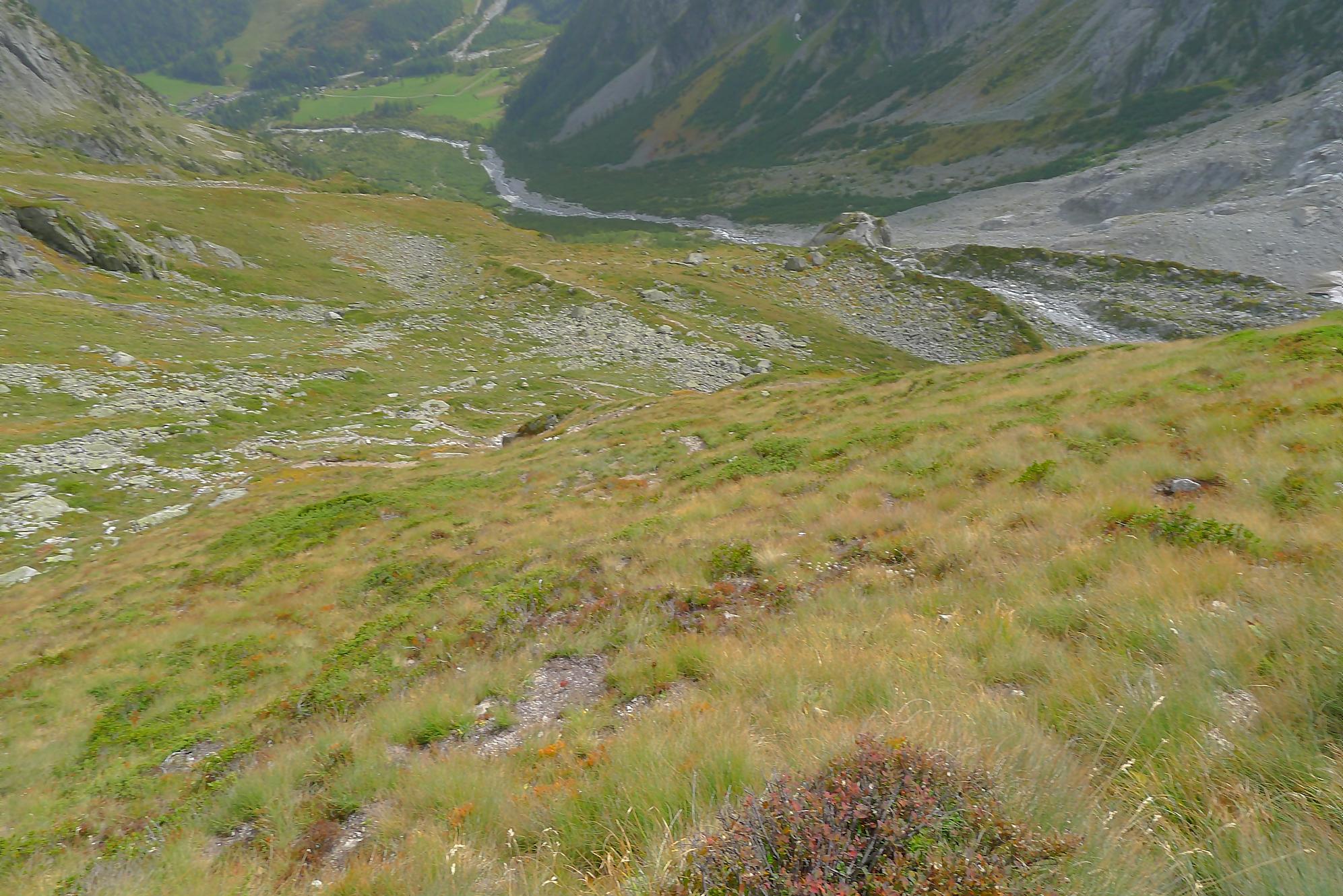 Le chemin continue en pente douce à travers des arbrissaux, puis il se décide enfin à monter le long d’une moraine. La vue se dégage sur les montagnes environnantes. Vers 2050m, il y a une bifurcation, soit par la moraine soit le long d’une faille et ses chaines. Par temps humide, cette option devrait être évitée. A l’aller nous avons pris l’option des chaines (même sous la cabane) et au retour l’option sans chaine. Cela fait un brin de variété.