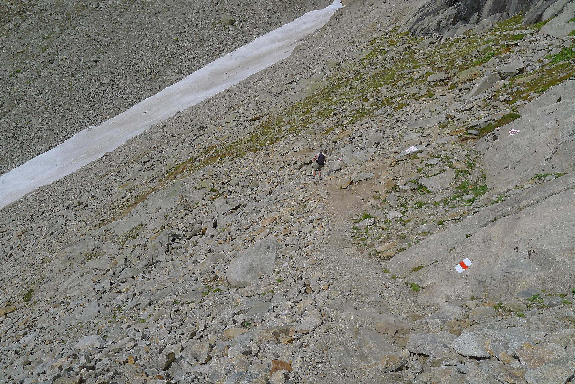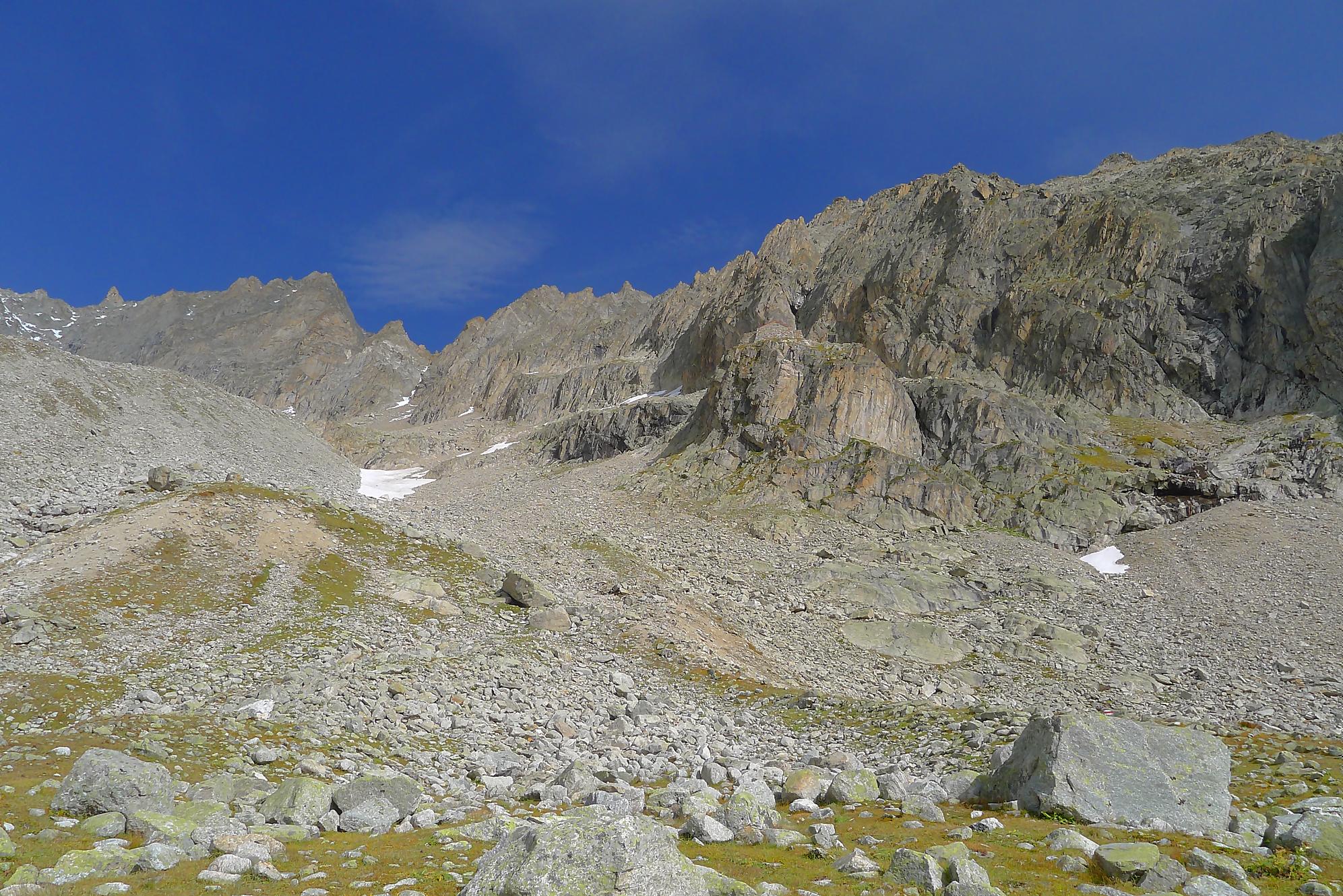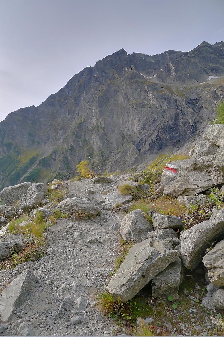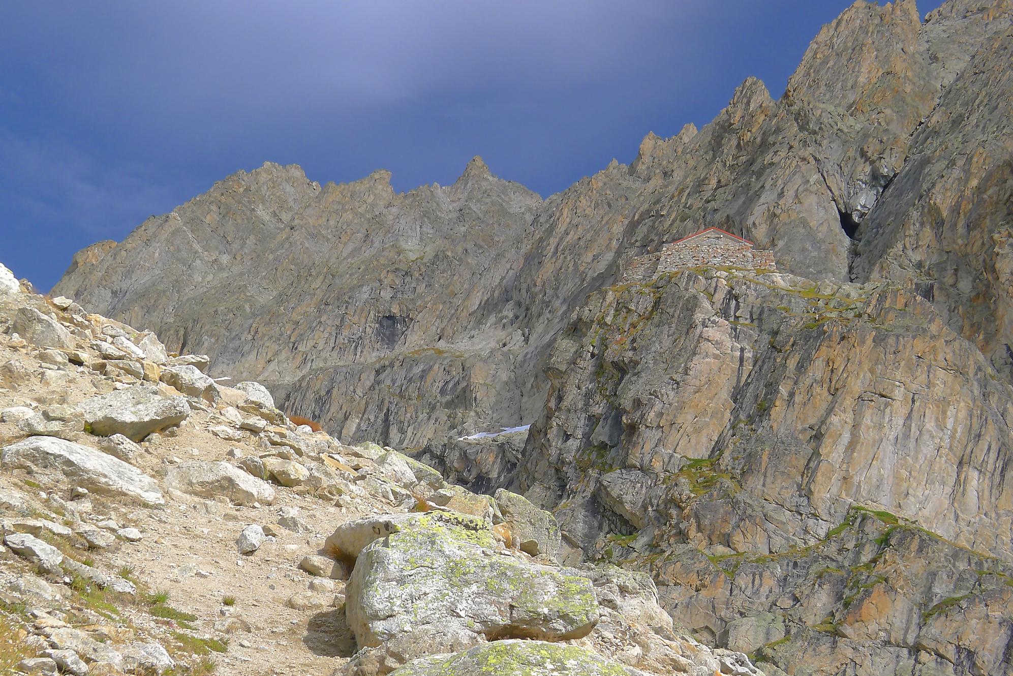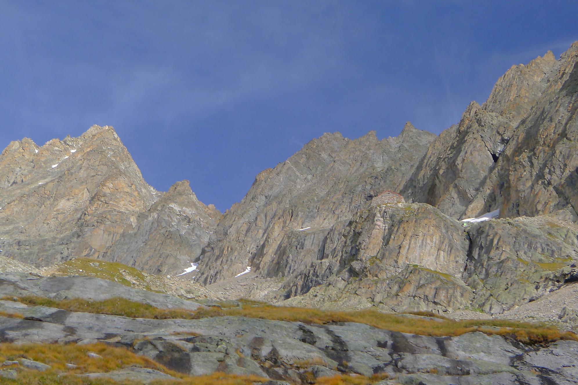 Le chemin continue en pente douce à travers des arbrissaux, puis il se décide enfin à monter le long d’une moraine. La vue se dégage sur les montagnes environnantes. Vers 2050m, il y a une bifurcation, soit par la moraine soit le long d’une faille et ses chaines. Par temps humide, cette option devrait être évitée. A l’aller nous avons pris l’option des chaines (même sous la cabane) et au retour l’option sans chaine. Cela fait un brin de variété.