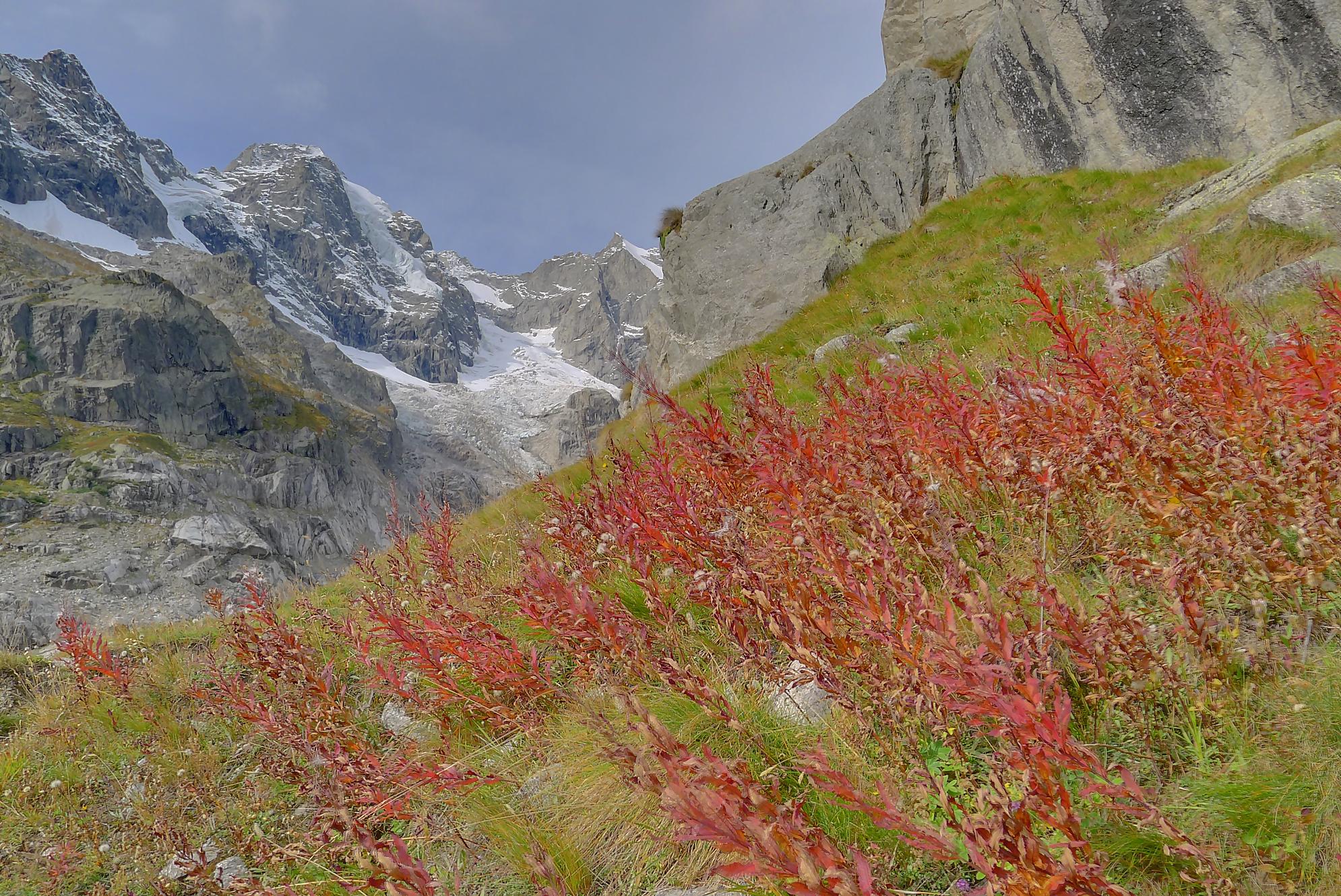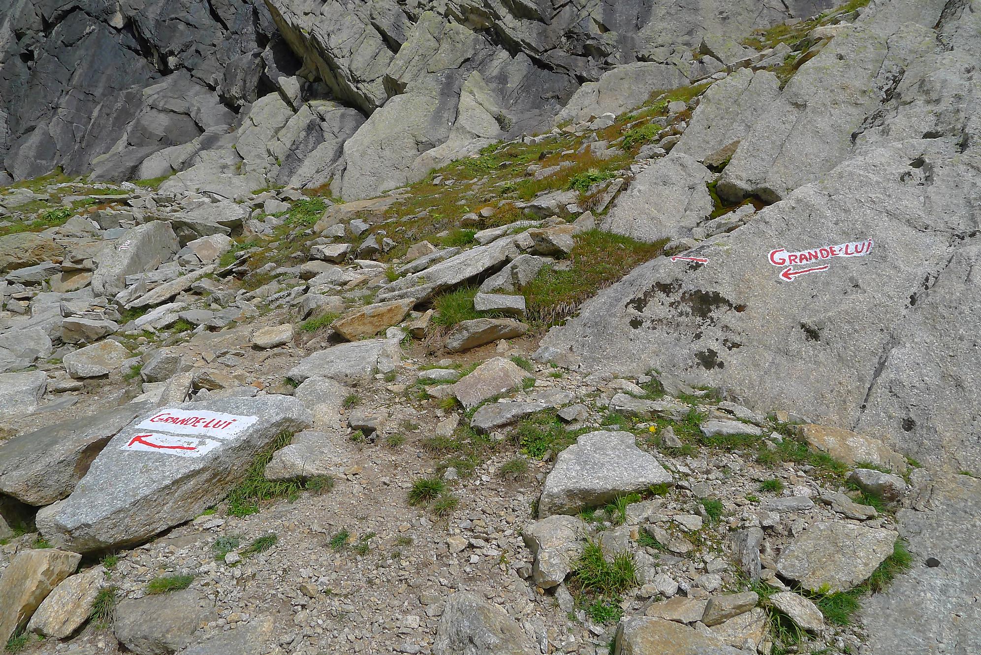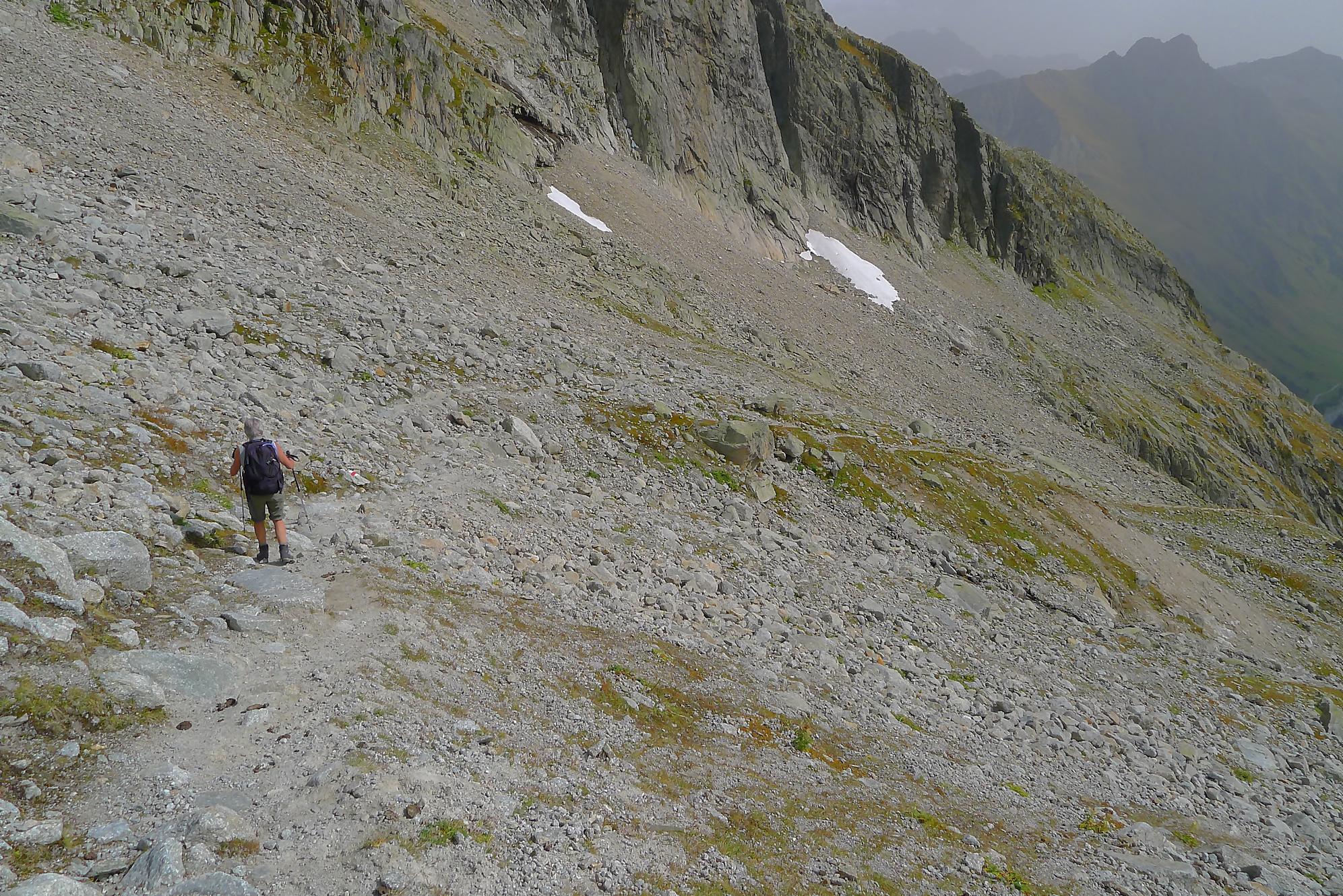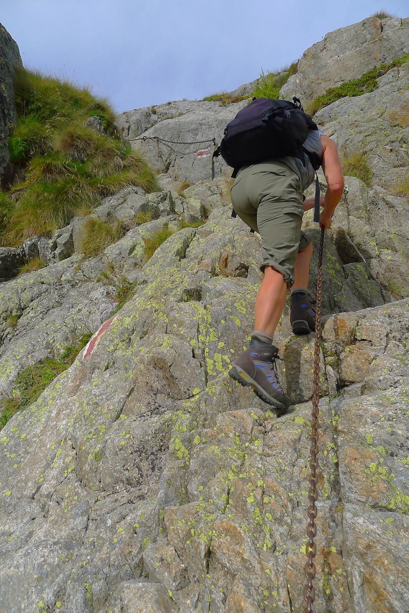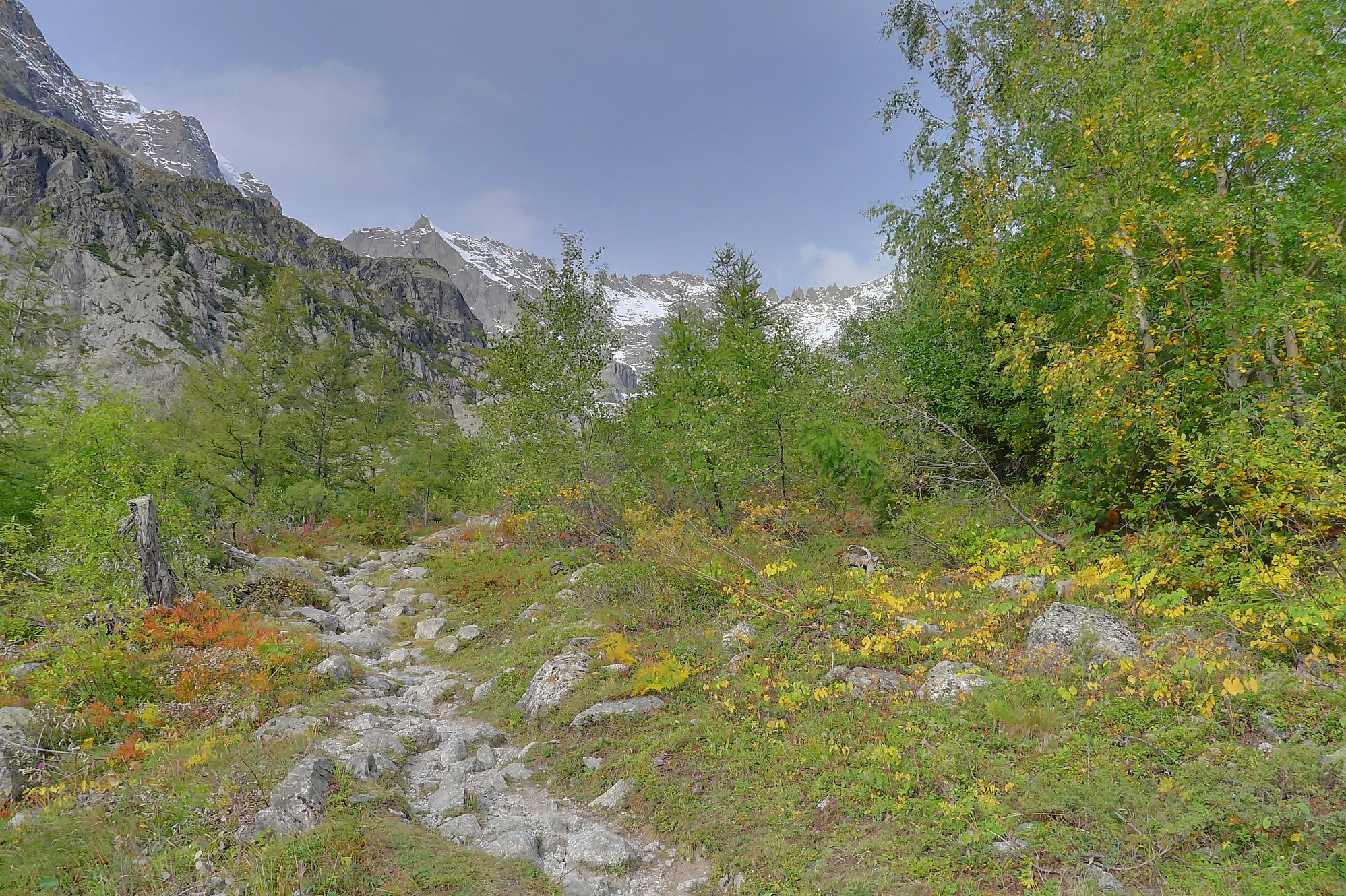 Le chemin continue en pente douce à travers des arbrissaux, puis il se décide enfin à monter le long d’une moraine. La vue se dégage sur les montagnes environnantes. Vers 2050m, il y a une bifurcation, soit par la moraine soit le long d’une faille et ses chaines. Par temps humide, cette option devrait être évitée. A l’aller nous avons pris l’option des chaines (même sous la cabane) et au retour l’option sans chaine. Cela fait un brin de variété.