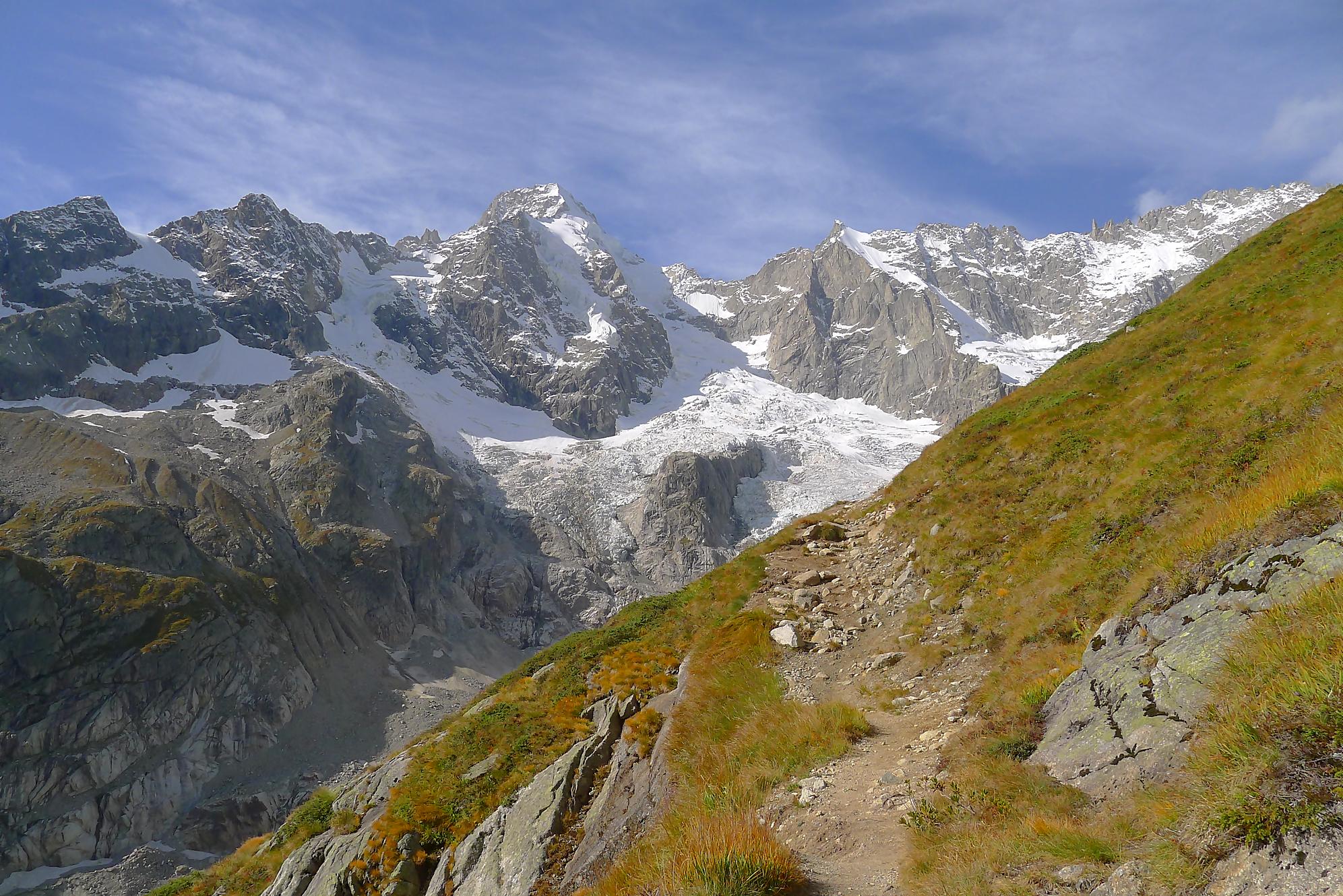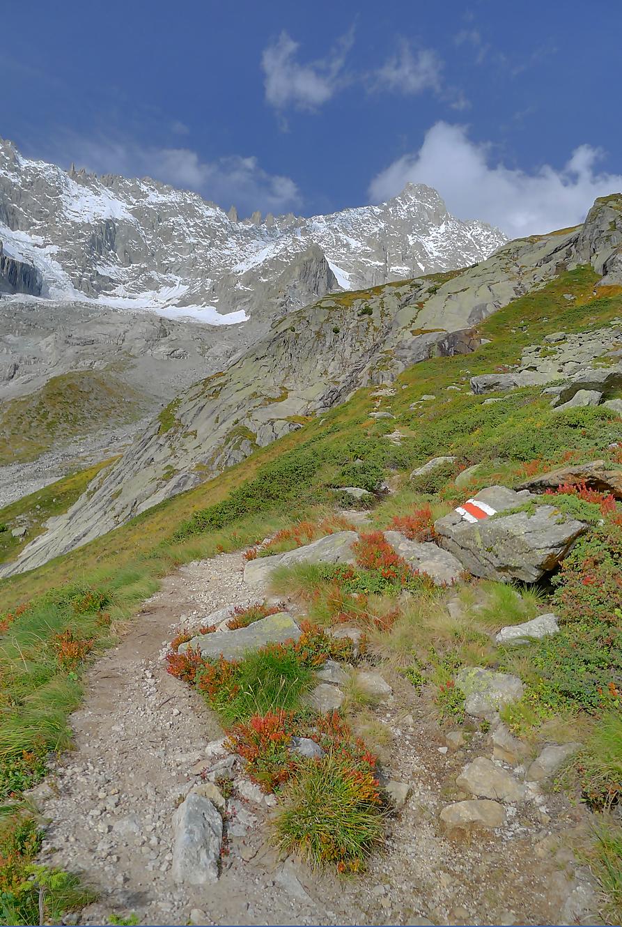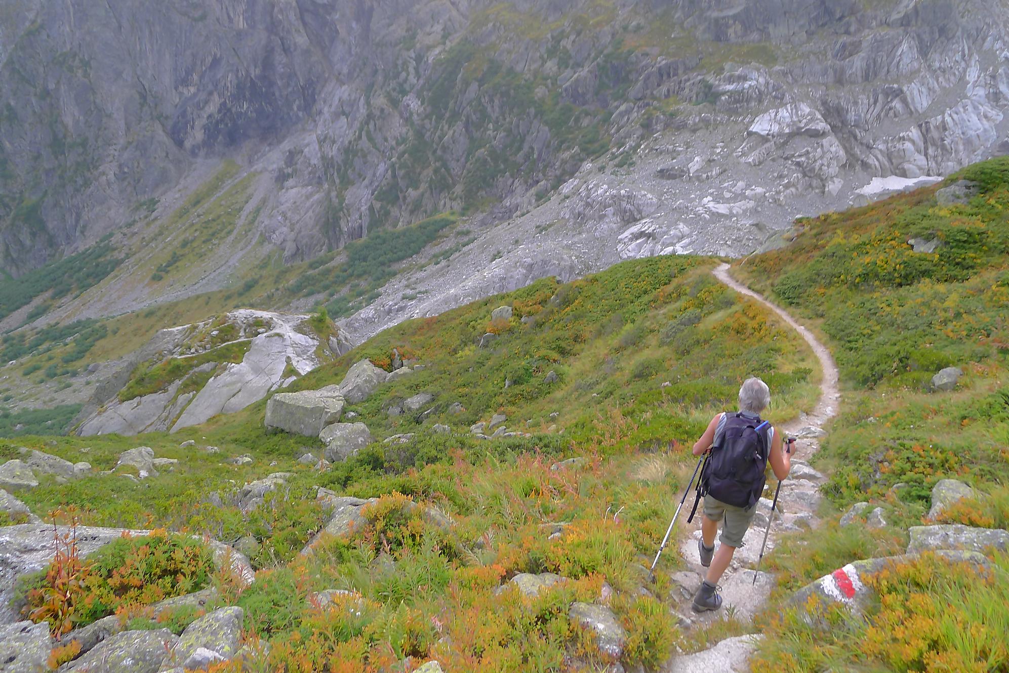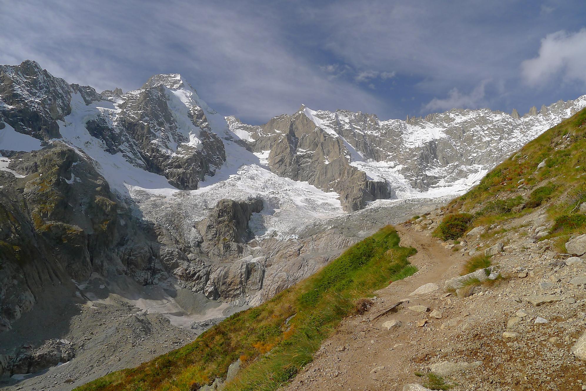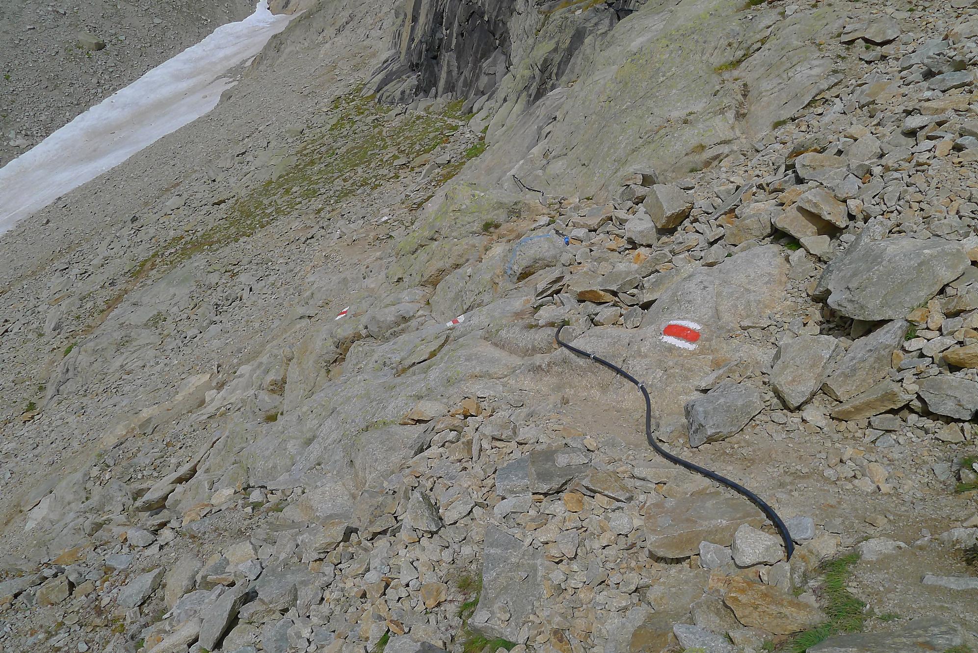 Le chemin continue en pente douce à travers des arbrissaux, puis il se décide enfin à monter le long d’une moraine. La vue se dégage sur les montagnes environnantes. Vers 2050m, il y a une bifurcation, soit par la moraine soit le long d’une faille et ses chaines. Par temps humide, cette option devrait être évitée. A l’aller nous avons pris l’option des chaines (même sous la cabane) et au retour l’option sans chaine. Cela fait un brin de variété.