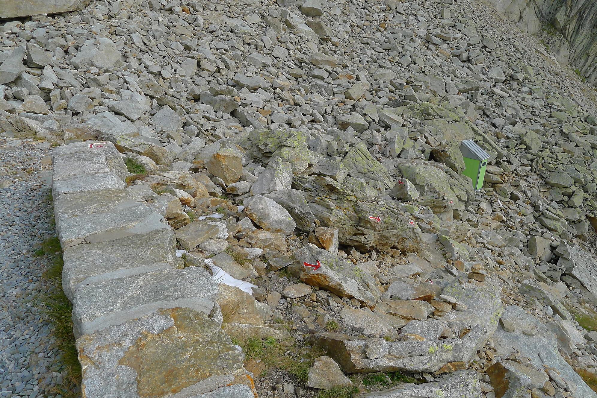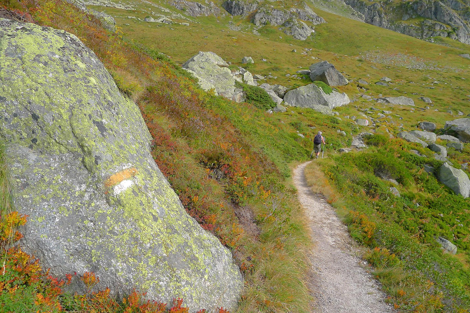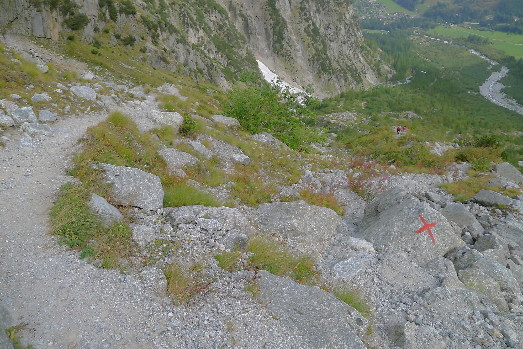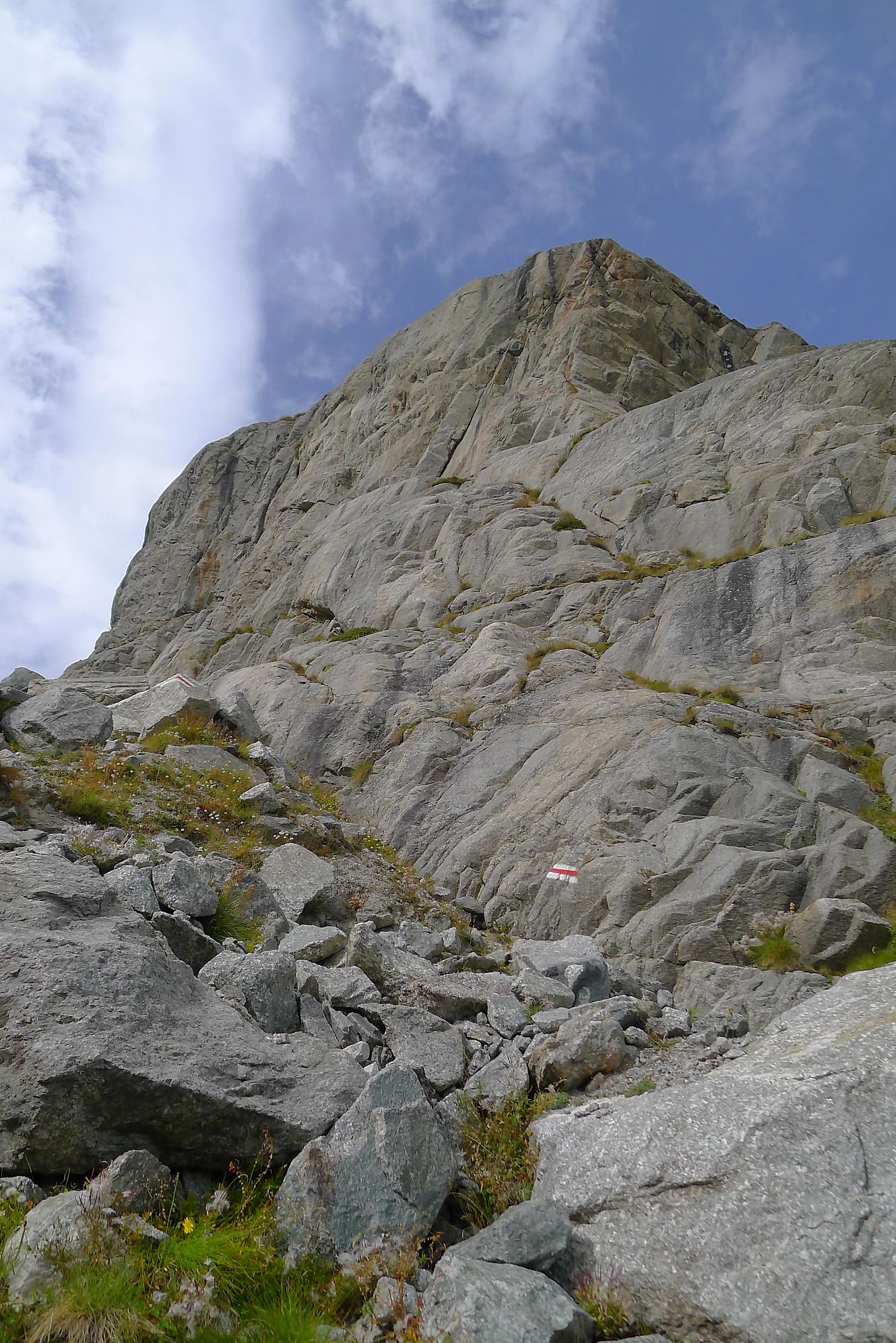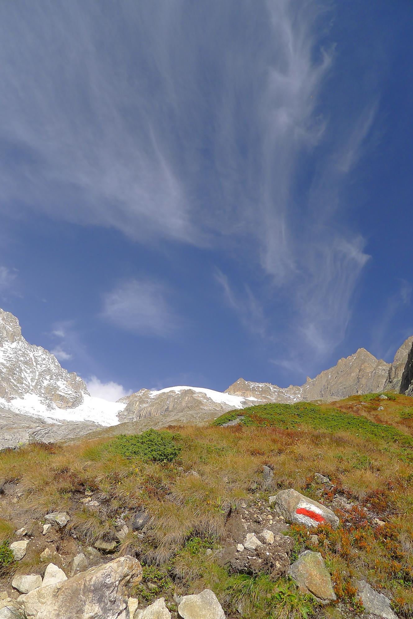 Le chemin continue en pente douce à travers des arbrissaux, puis il se décide enfin à monter le long d’une moraine. La vue se dégage sur les montagnes environnantes. Vers 2050m, il y a une bifurcation, soit par la moraine soit le long d’une faille et ses chaines. Par temps humide, cette option devrait être évitée. A l’aller nous avons pris l’option des chaines (même sous la cabane) et au retour l’option sans chaine. Cela fait un brin de variété.
