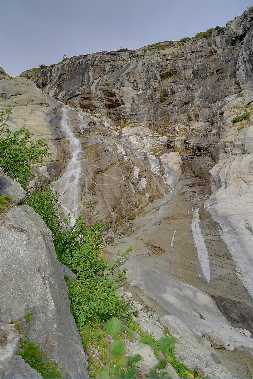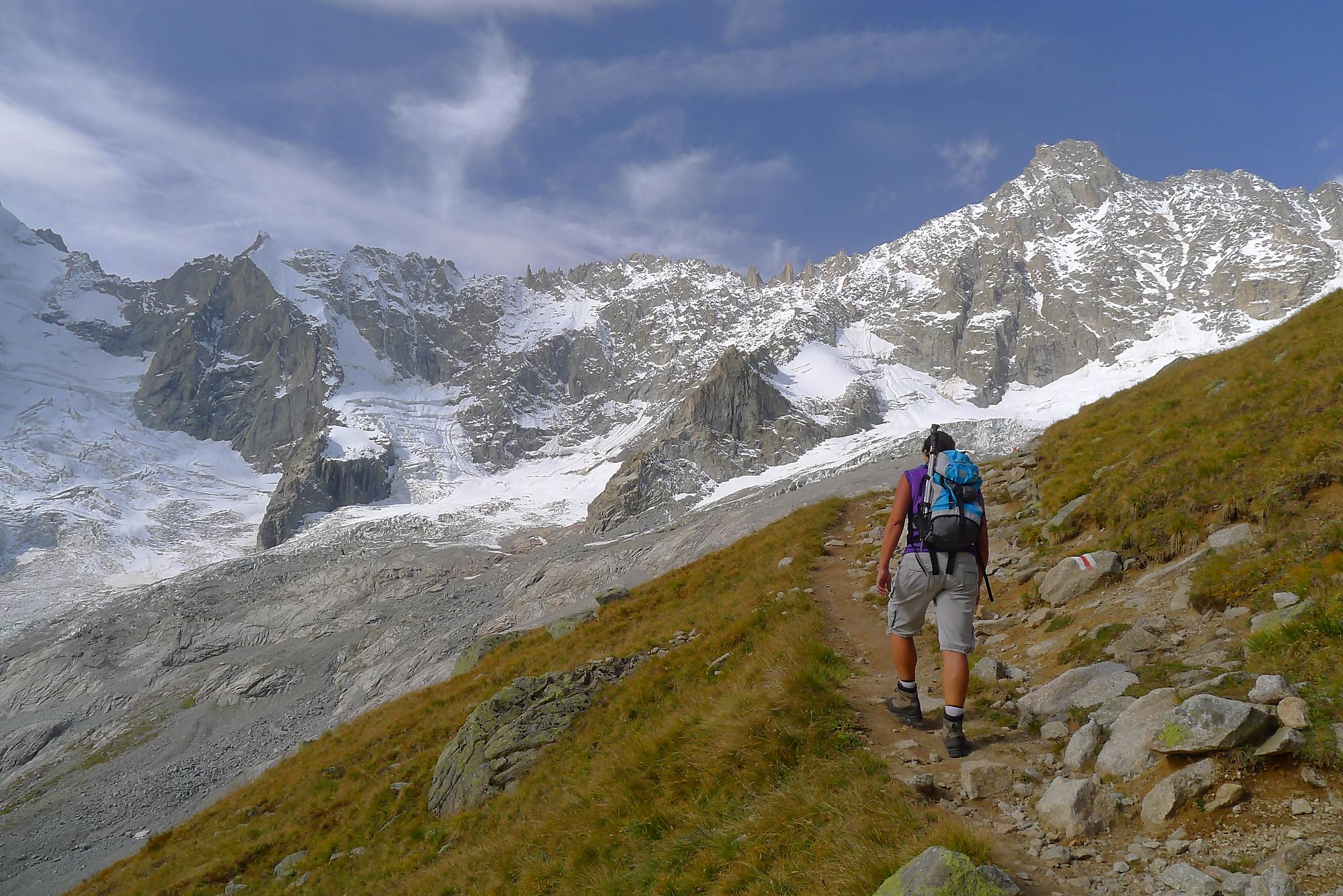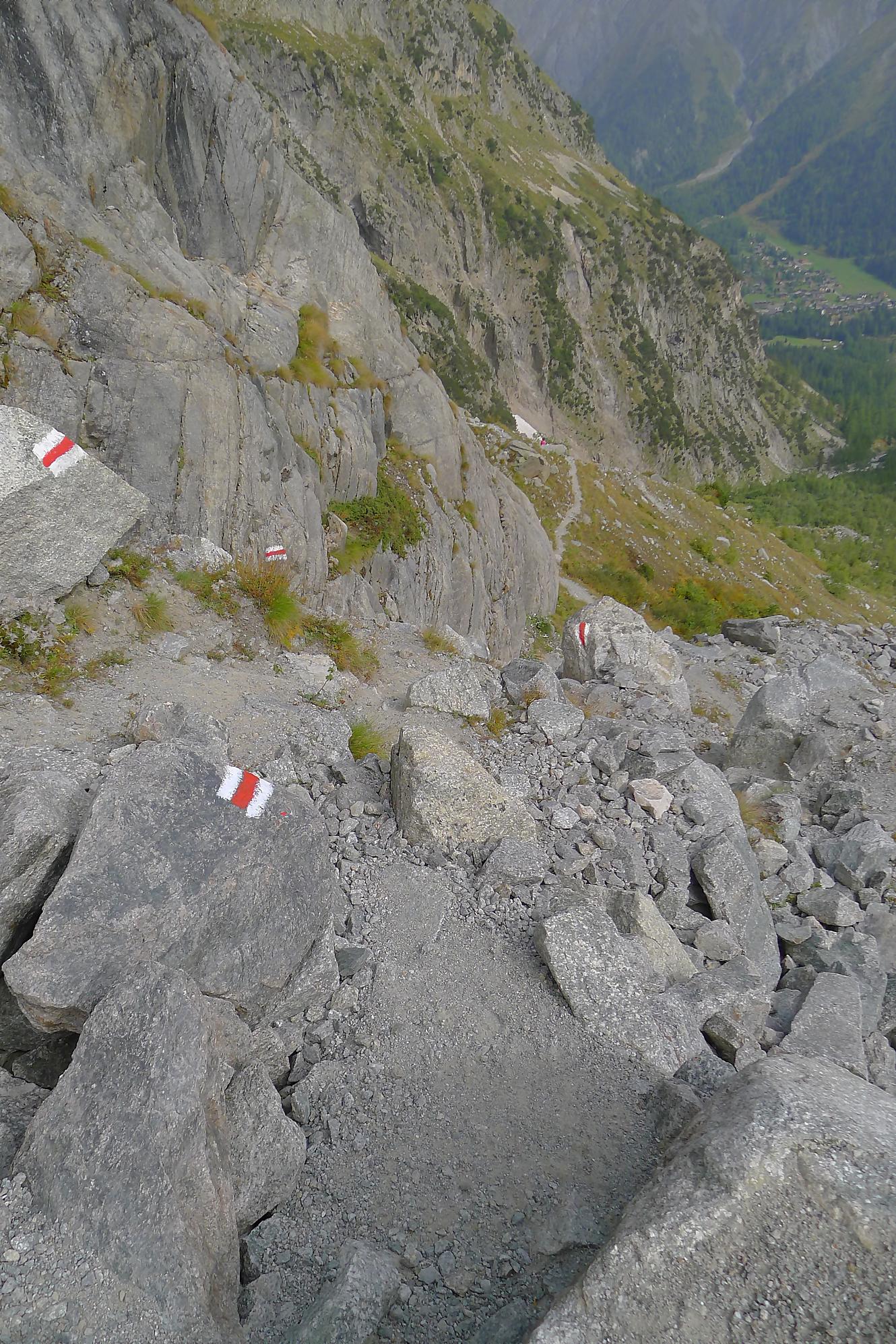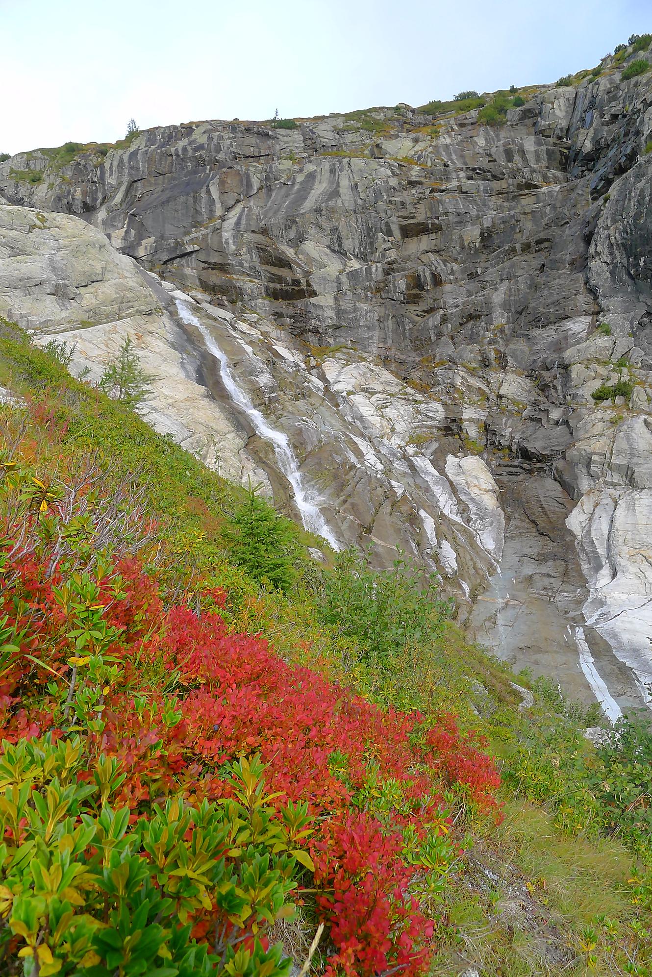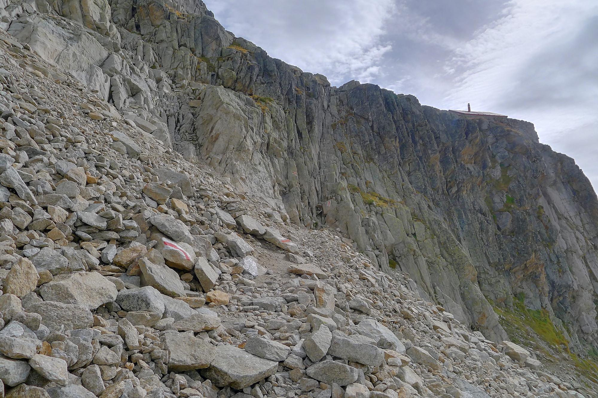 Le chemin continue en pente douce à travers des arbrissaux, puis il se décide enfin à monter le long d’une moraine. La vue se dégage sur les montagnes environnantes. Vers 2050m, il y a une bifurcation, soit par la moraine soit le long d’une faille et ses chaines. Par temps humide, cette option devrait être évitée. A l’aller nous avons pris l’option des chaines (même sous la cabane) et au retour l’option sans chaine. Cela fait un brin de variété.