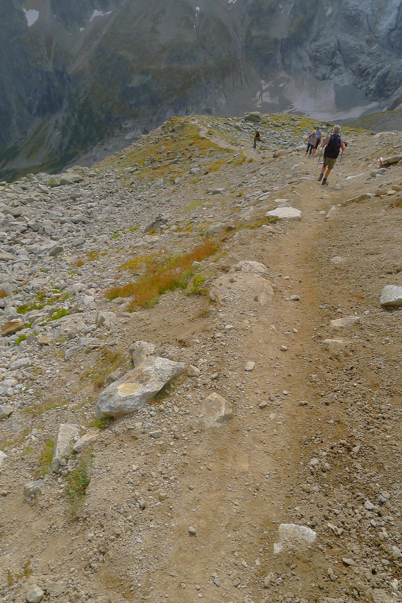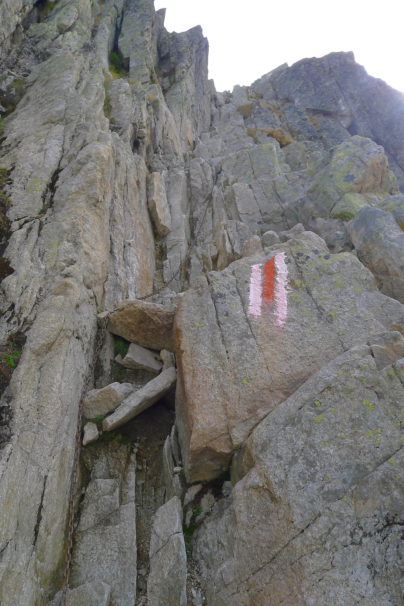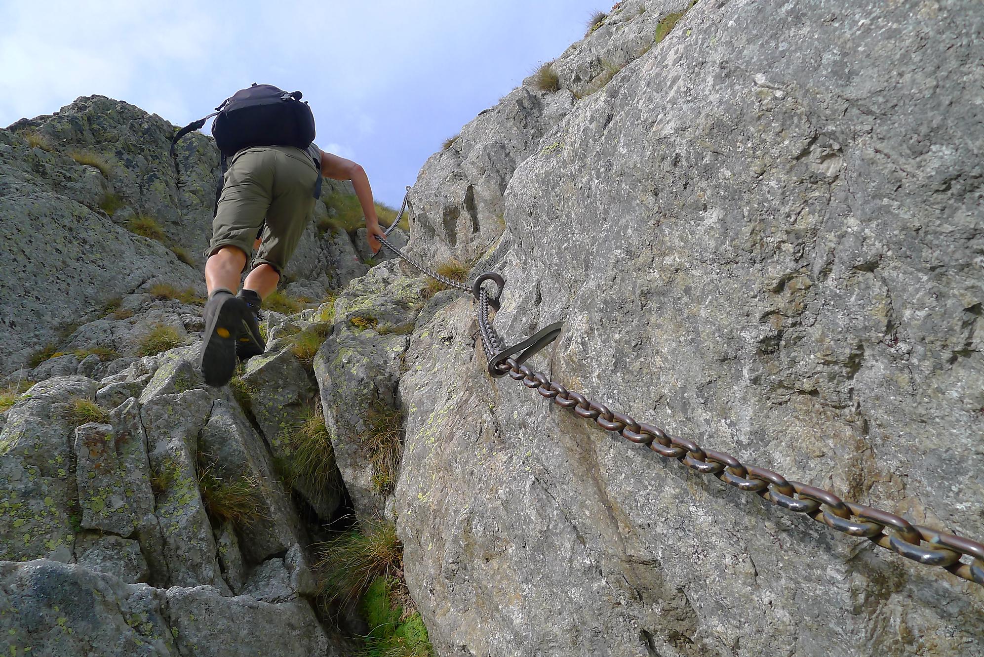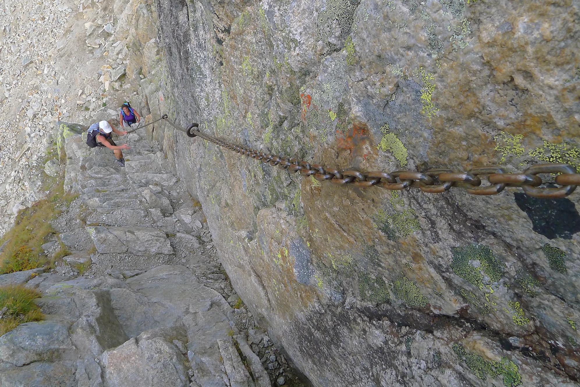 Nous repartons, le soleil revient un peu et empruntons le chemin supérieur, pour varier du passage avec chaine. Dans ce chemin, il y a un ou deux pas que j’ai trouvé bien délicat (en plus un peu exposé), pour contourner un bloc rocheux, une chaine serait la bienvenue. Puis un chemin standard nous ramène sur le chemin de la montée qu’il suffit de suivre.