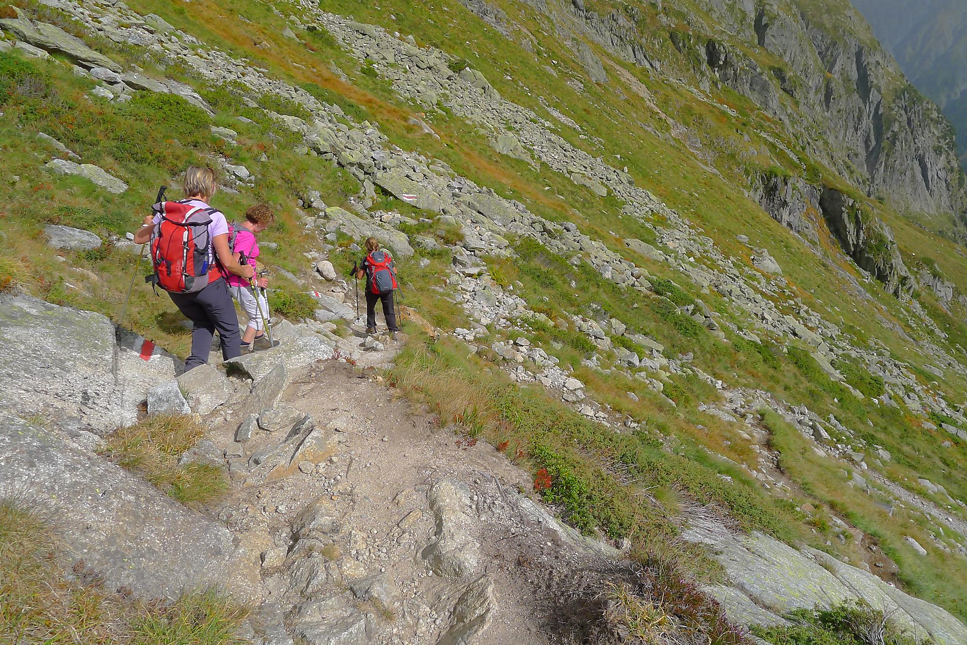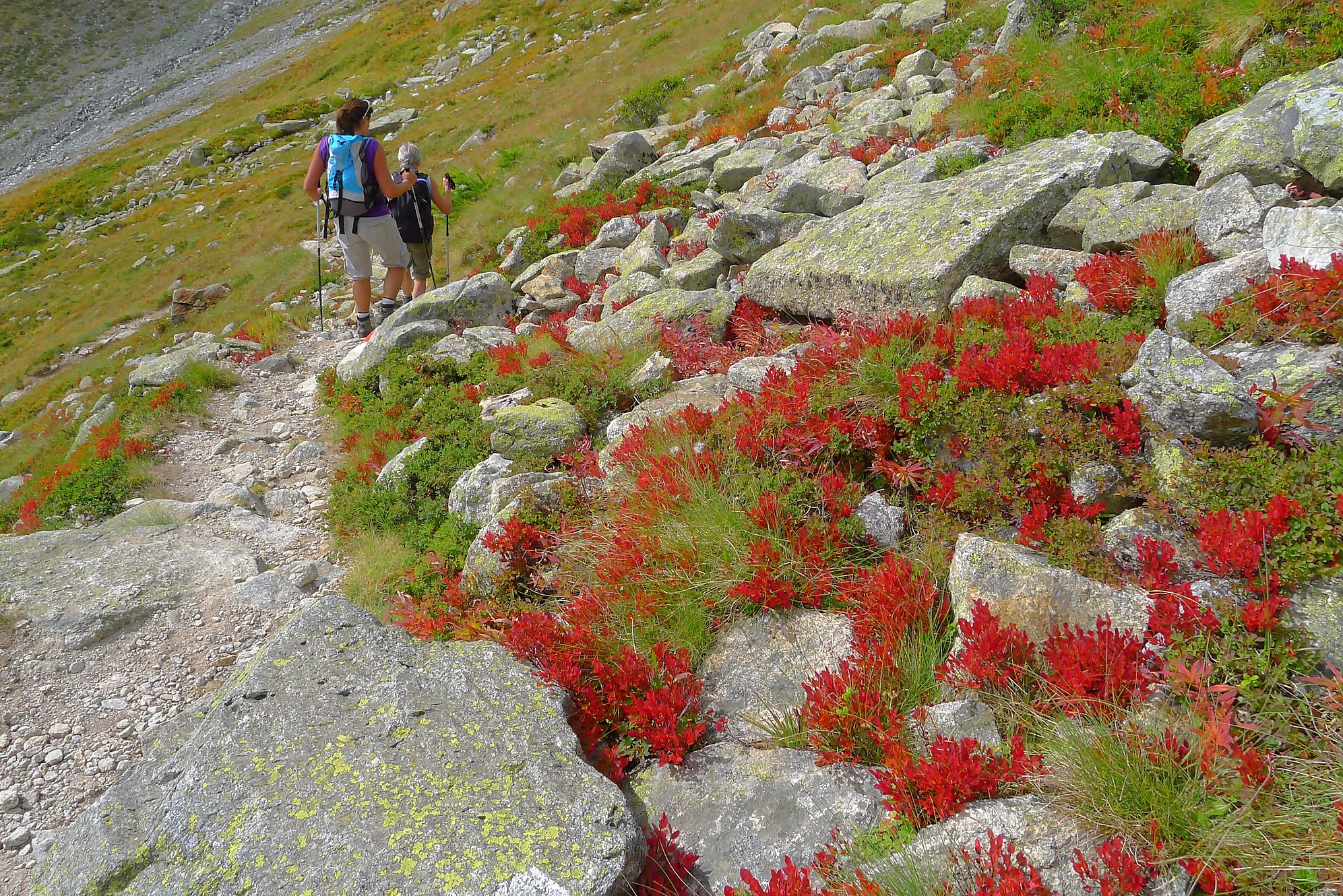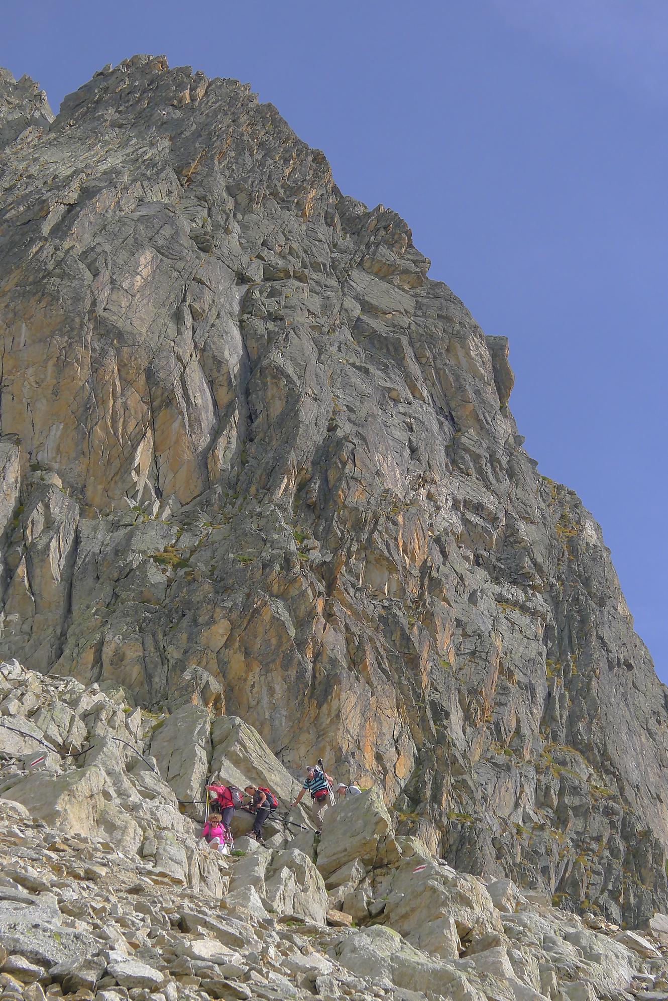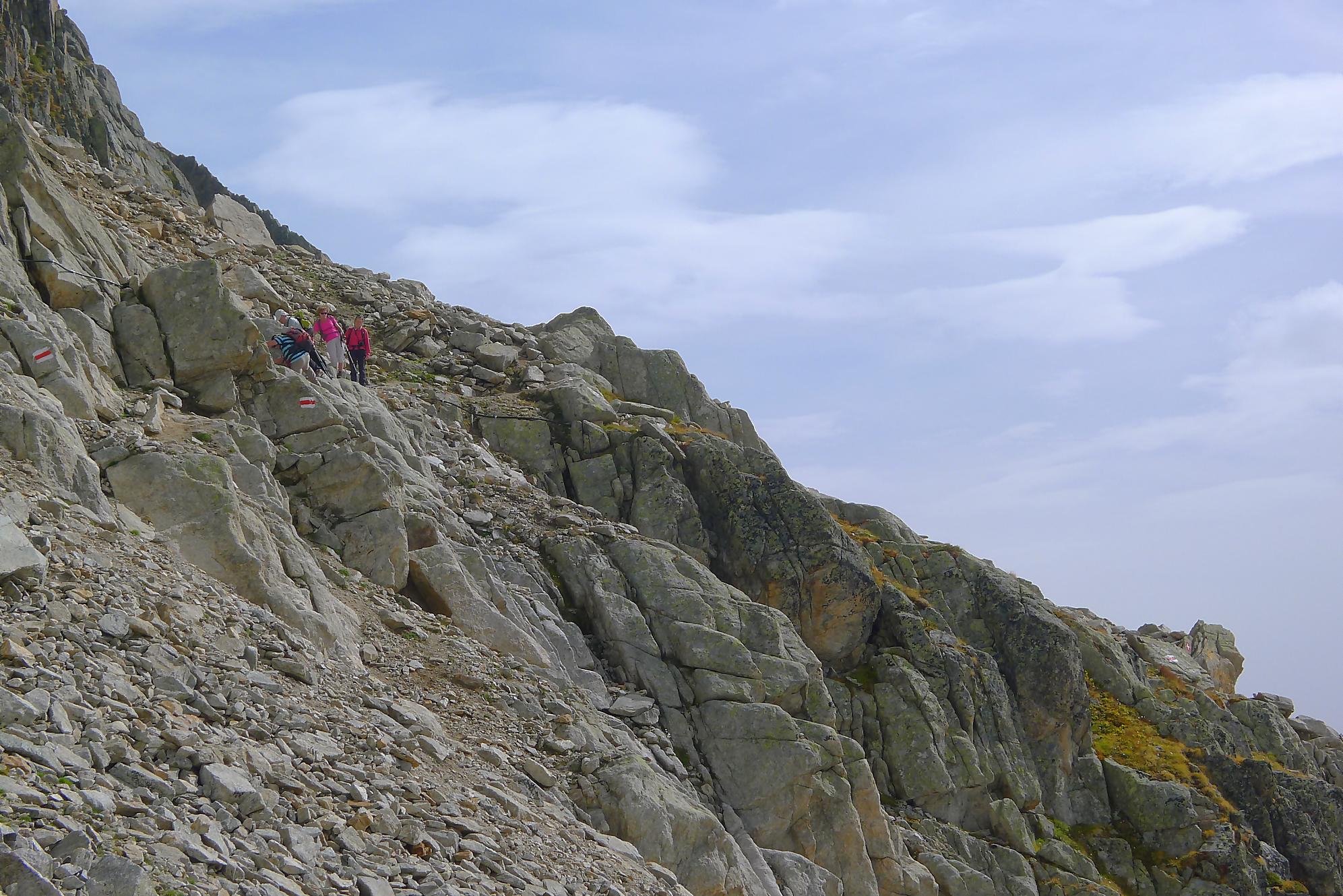 Nous repartons, le soleil revient un peu et empruntons le chemin supérieur, pour varier du passage avec chaine. Dans ce chemin, il y a un ou deux pas que j’ai trouvé bien délicat (en plus un peu exposé), pour contourner un bloc rocheux, une chaine serait la bienvenue. Puis un chemin standard nous ramène sur le chemin de la montée qu’il suffit de suivre.