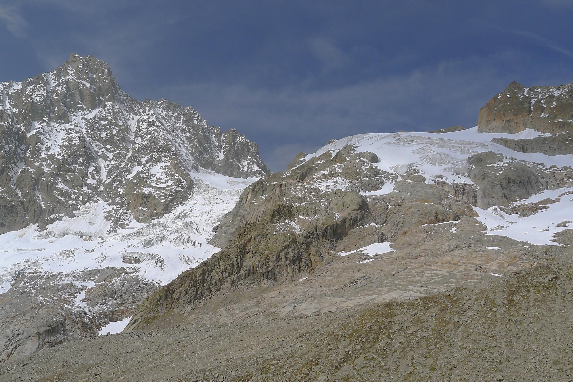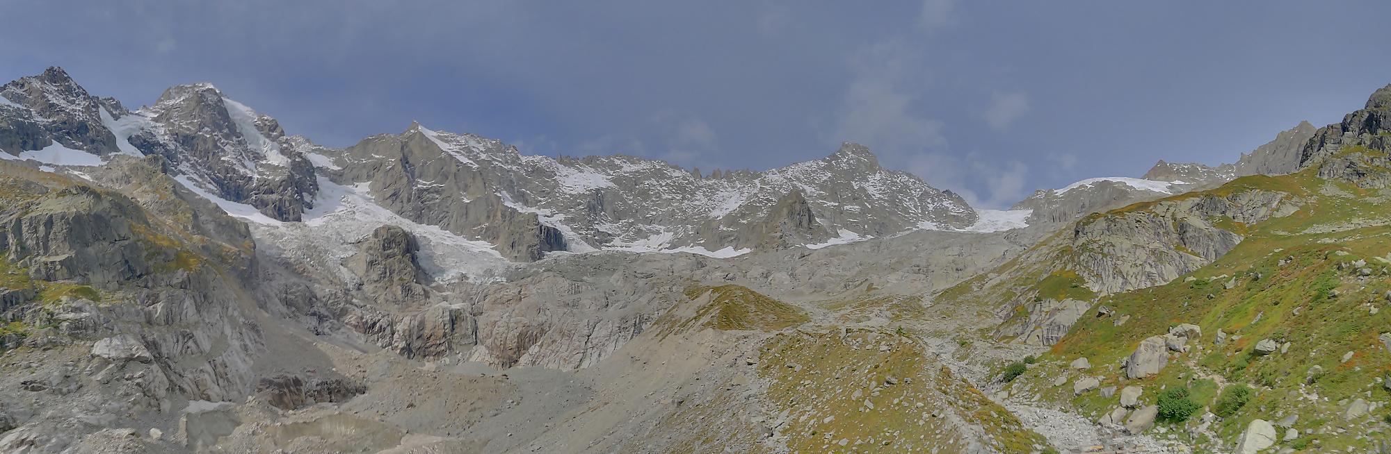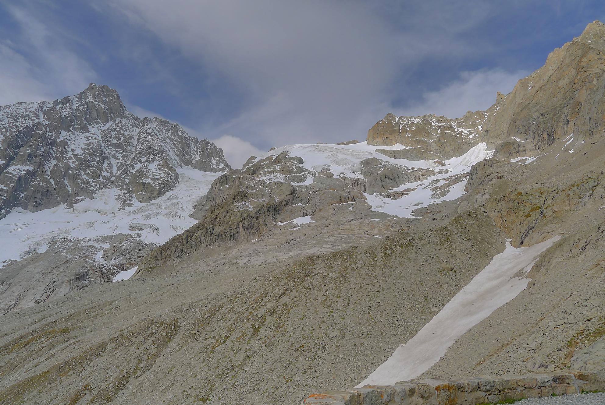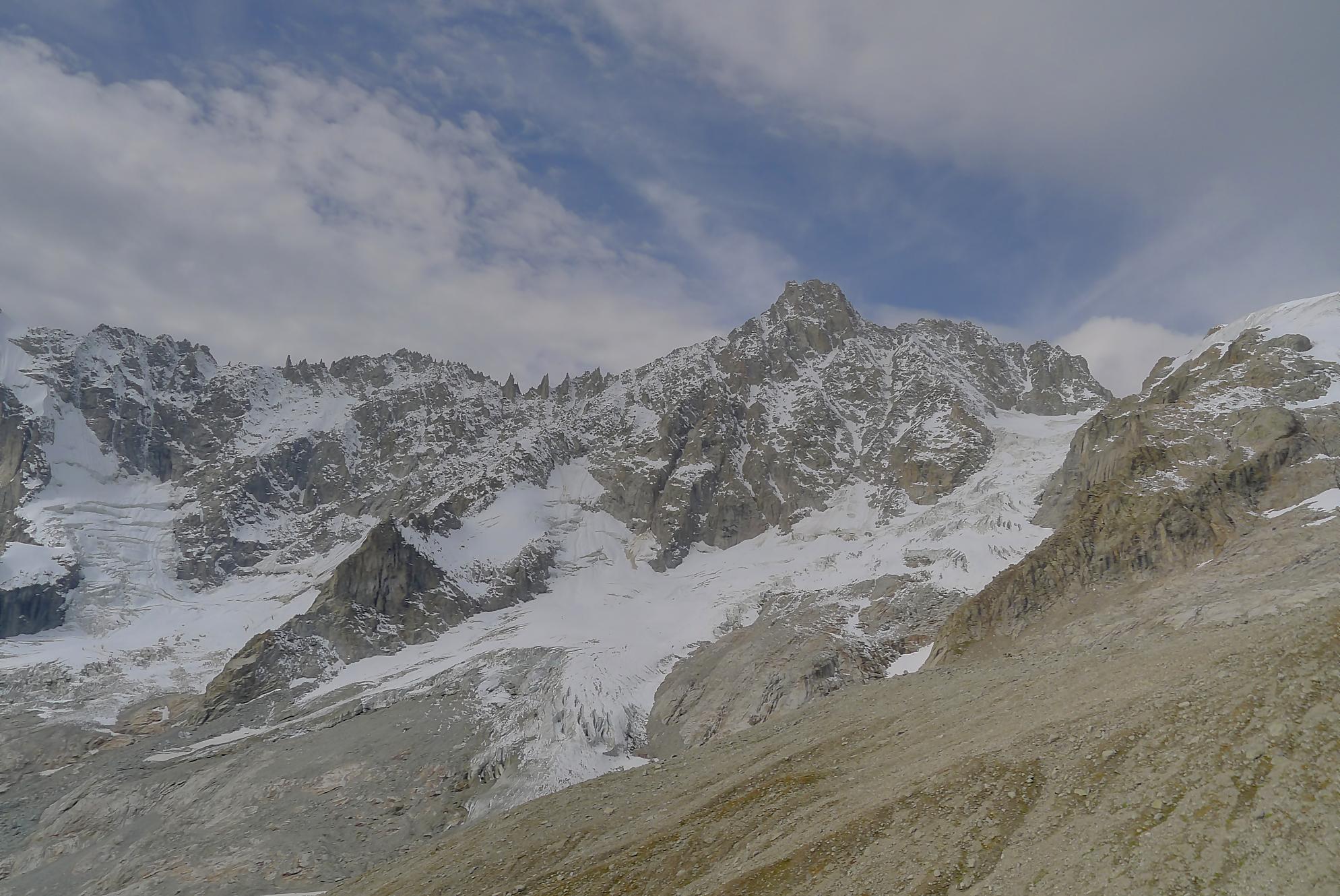 Nous marquons une longue pause casse-croute, les nuages commençant à recouvrir le ciel. La vue sur Le Dolent est prenante ainsi que sur le Glacier de l’A Neuve. Nous sommes en bout d’un cirque, donc la vue ne va pas très loin. Mais c’est beau quand même.