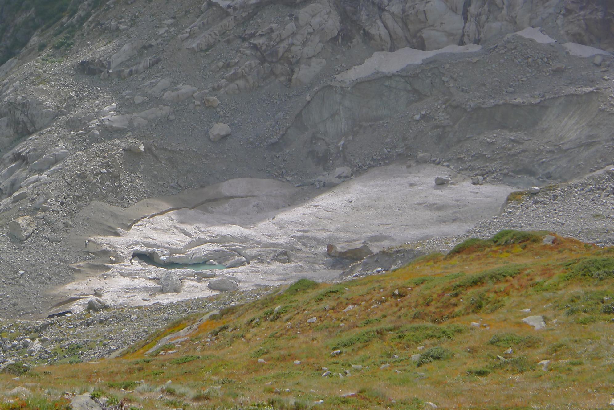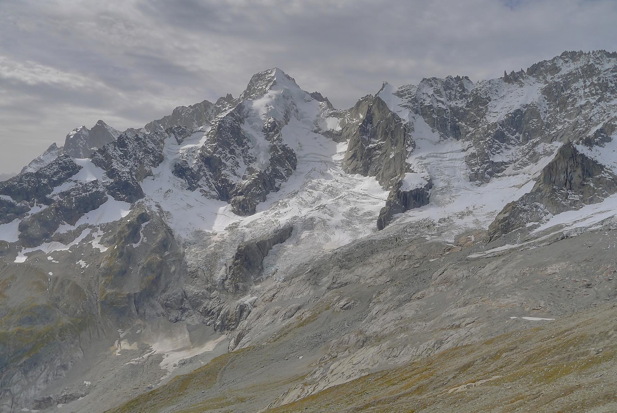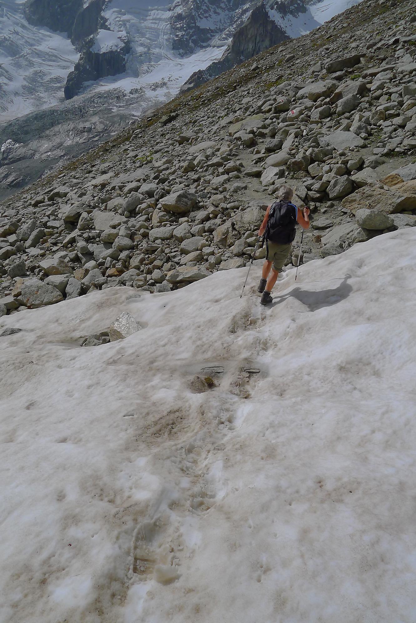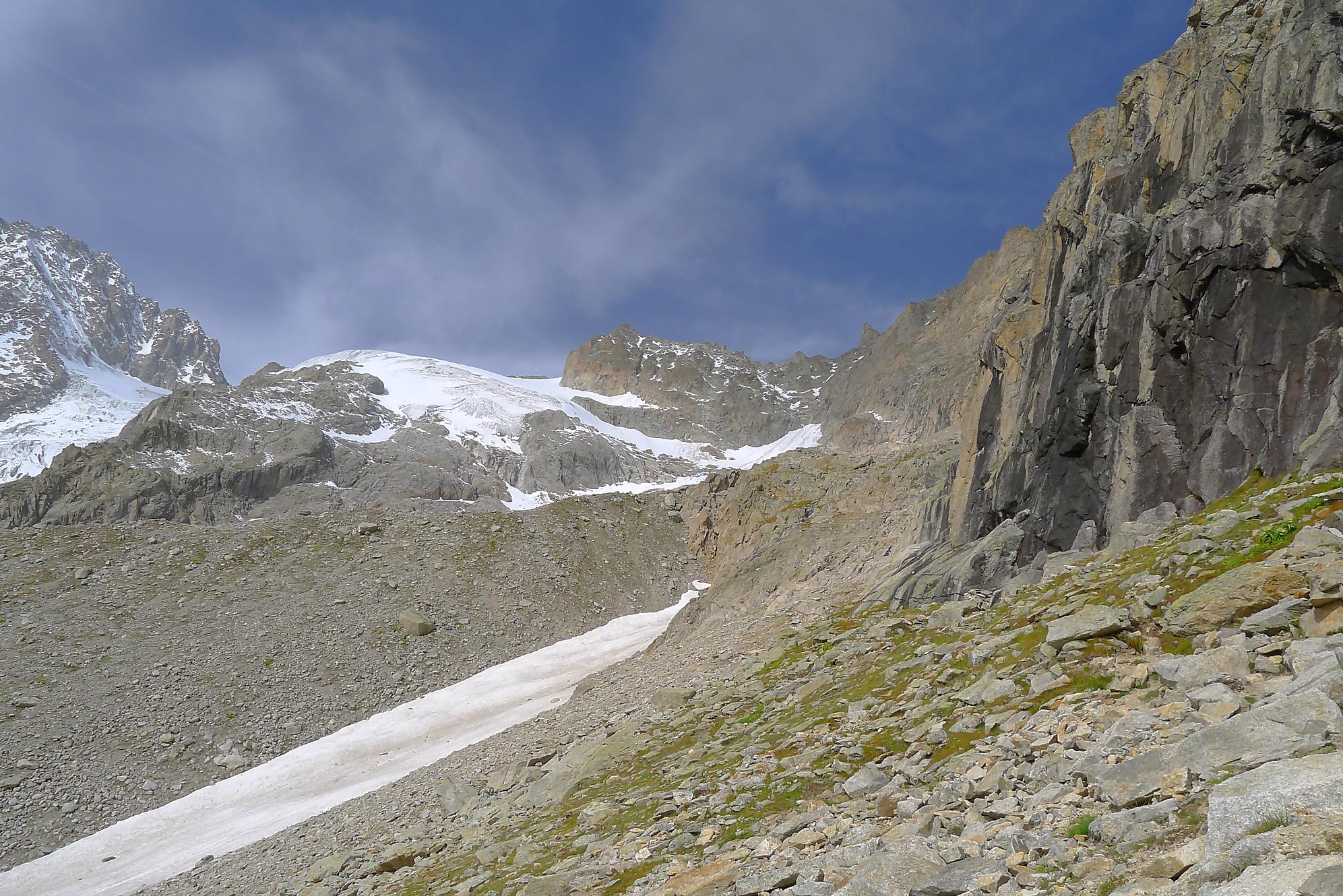 Nous marquons une longue pause casse-croute, les nuages commençant à recouvrir le ciel. La vue sur Le Dolent est prenante ainsi que sur le Glacier de l’A Neuve. Nous sommes en bout d’un cirque, donc la vue ne va pas très loin. Mais c’est beau quand même.