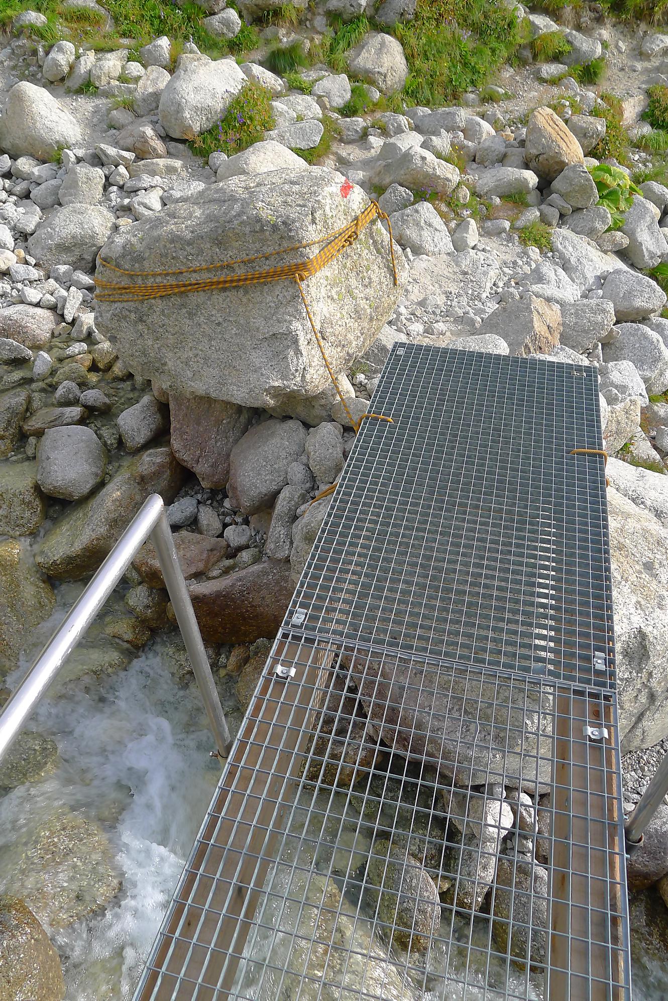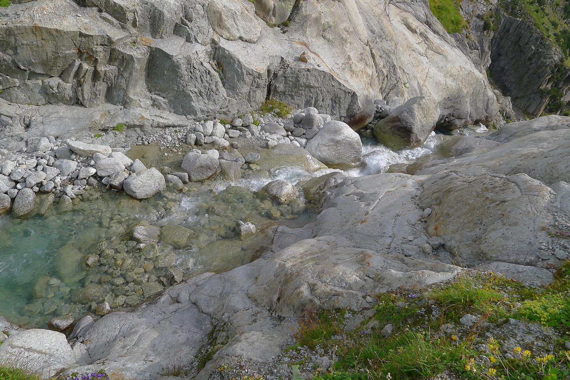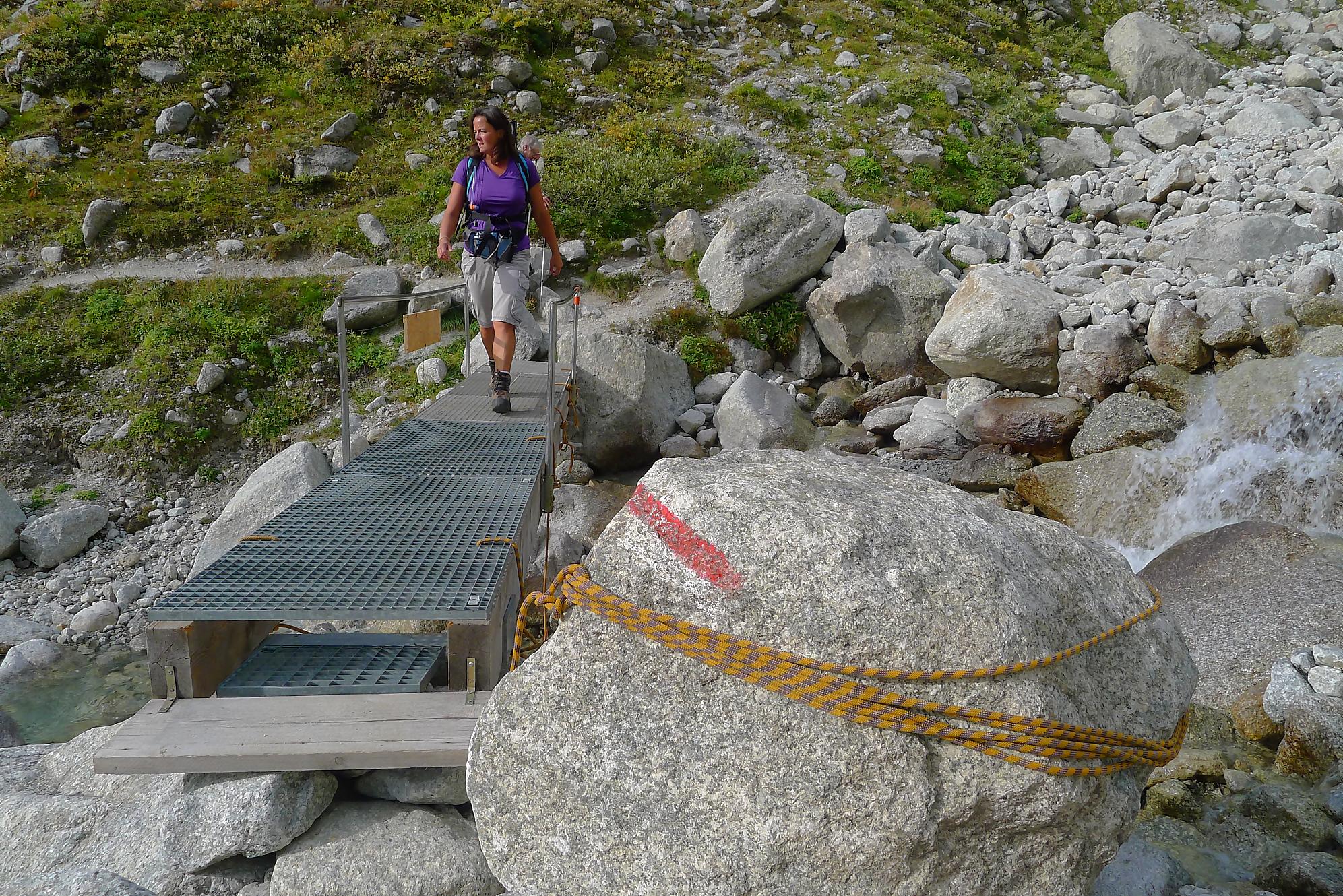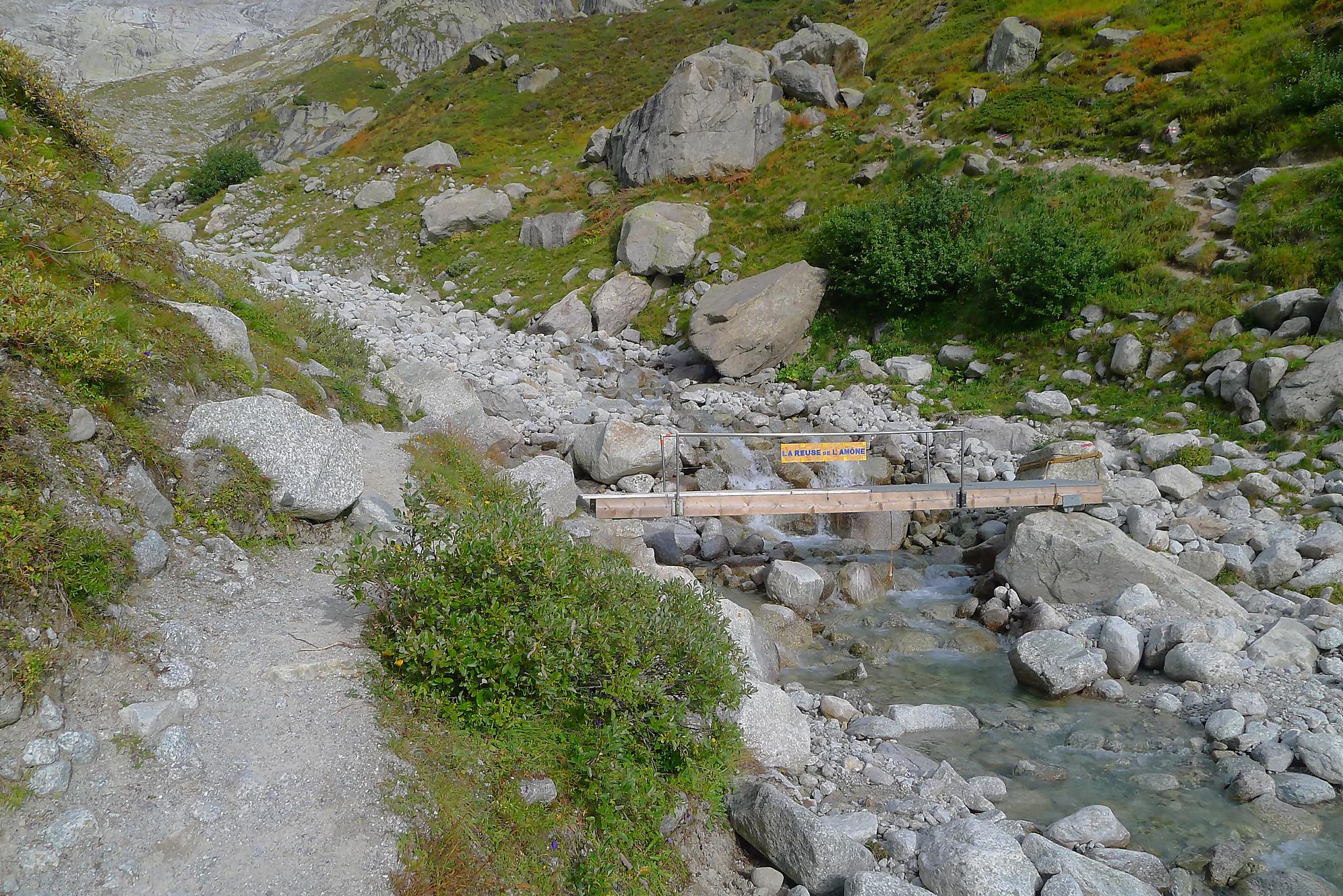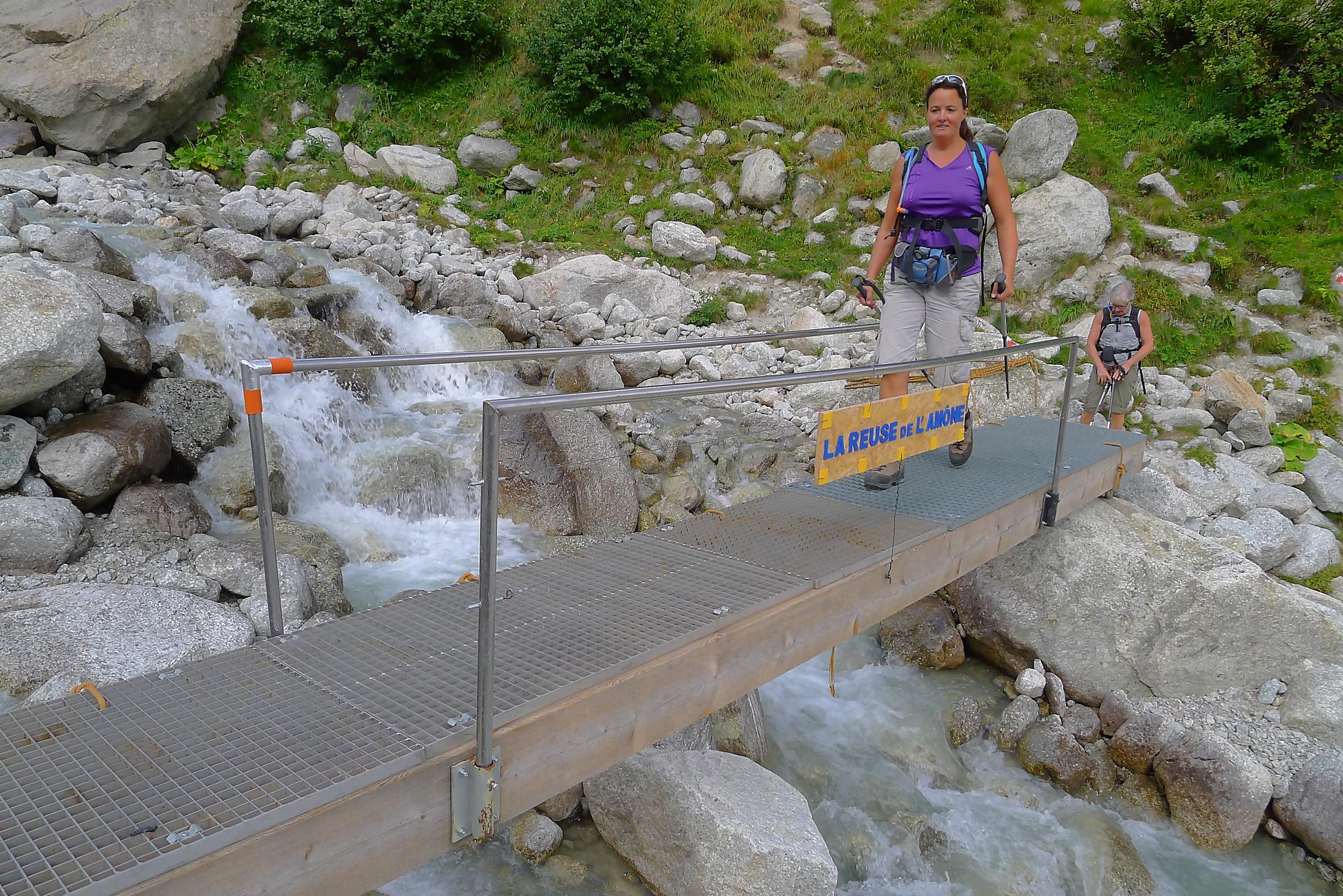 La montée par les chaines et de l’escalade en II, la chaine sécurisant le parcours. Les prises sont confortables et la chaine rassurante pour certains. Nous arrivons sur un promontoire flanqué d’un petit arbre. La vue s’ouvre sur le Glacier de l’A Neuve et les montagnes, ça devient grandiose. Il faut descendre une dalle, équipe d’une chaine bien utile car il y a un peu de sable. On rejoint un pont et traversons le cours d’eau de la Reuse de l’A Amône. A partir de là, il faudra compter sur vos muscles, les répits sont rares.