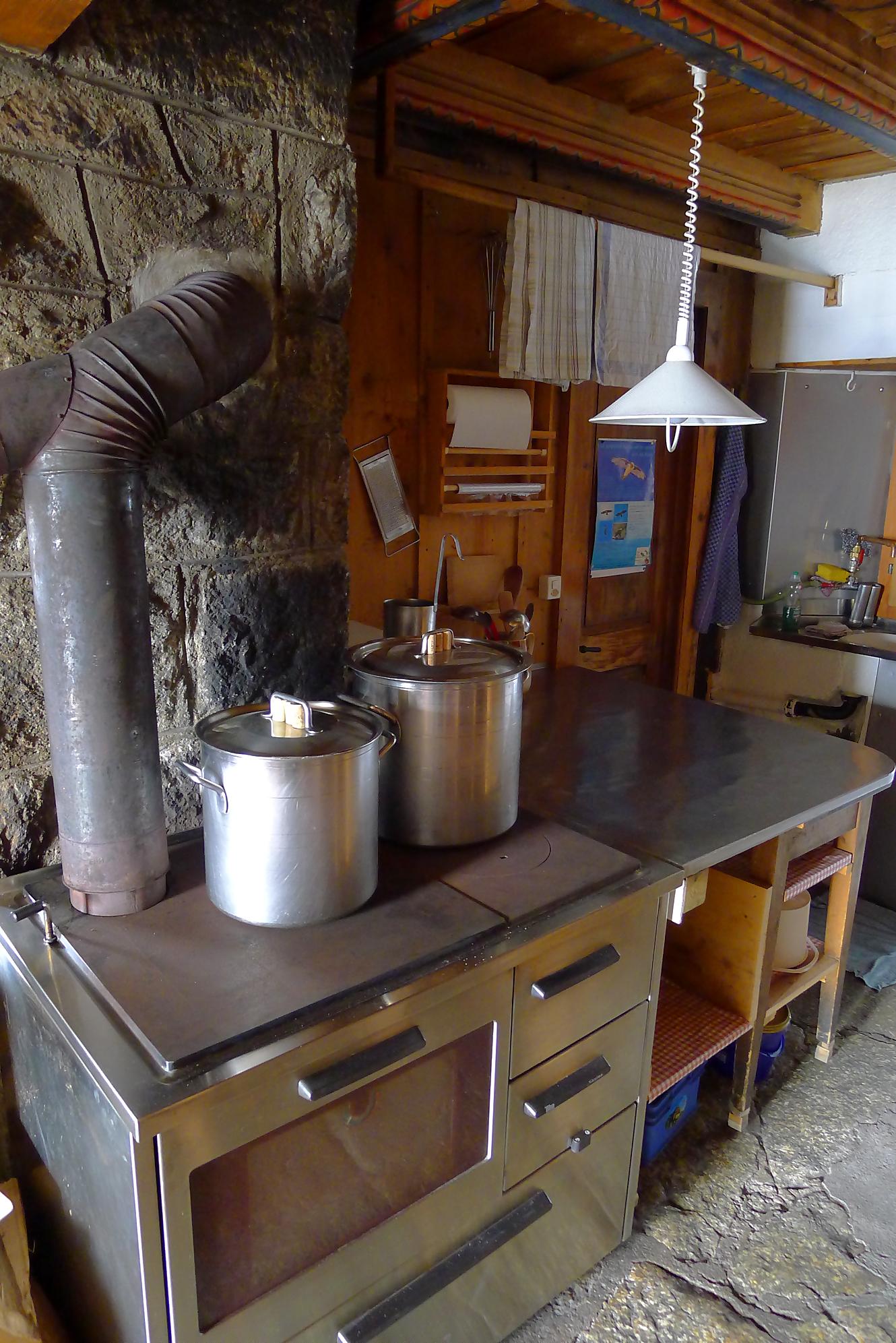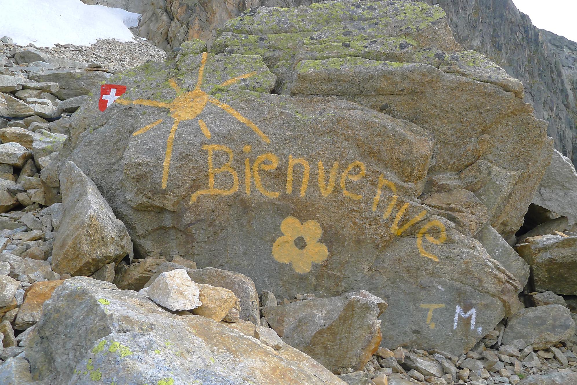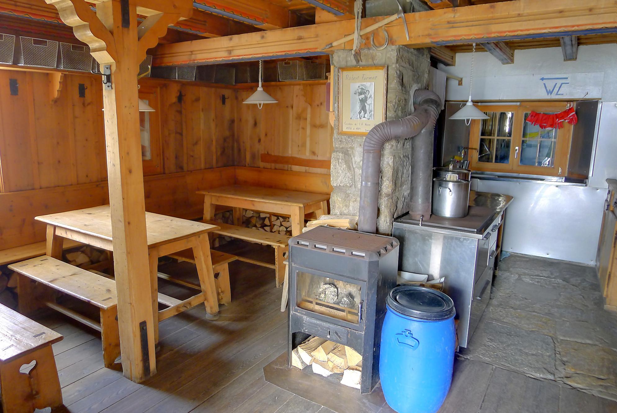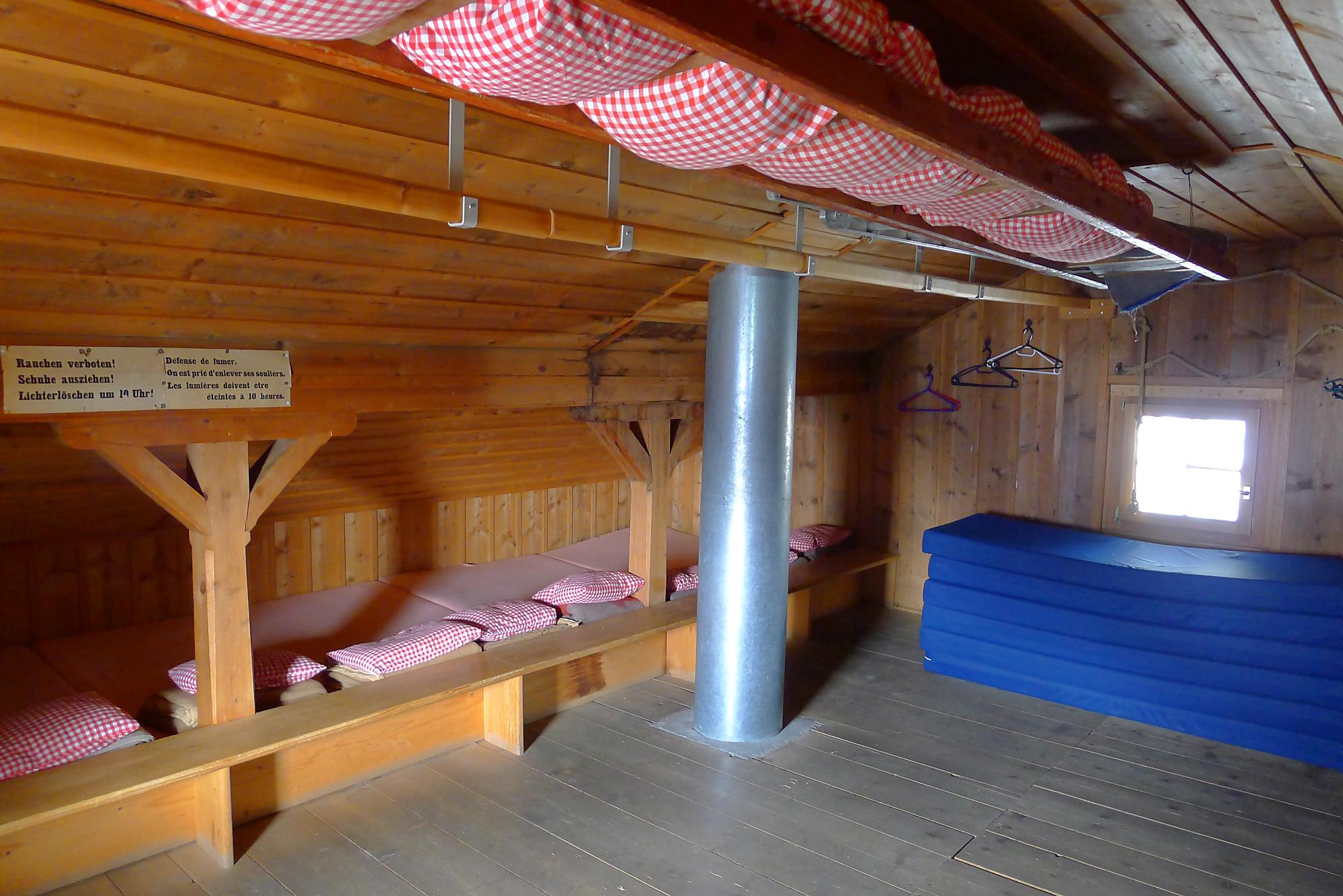 Les myrtilles vers 2100m sont nombreuses et succulentes, les meilleurs de cette année. Bref cela vous ralentit votre rythme, mais qu’est-ce que c’est bon ! En plus on garde un souvenir coloré sur les doigts, que du bonheur. La cabane de l’A Neuve ne se laisse découvrir que tardivement, environ dans le dernier tiers de la randonnée. Elle est perchée sur un promontoire rocheux, genre nid d’aigle. Une dernière traversée, sur un pierrier où en début de saison un névé complique la tâche (ce névé était encore présent). Pour le final, il y a deux possibilités, par la voie directe et ses chaines ou par un chemin pédestre que nous prendrons au retour. On rejoint après 3h, la cabane de l’A Neuve, 2735m. C’est une cabane à l’ancienne, pierre et bois et elle est petite. Le dortoir est lui aussi à l’ancienne, une pièce unique et ses lits avec les couvertures militaires. Celui qui oublie son sac à viande gardera un souvenir impérissable !
