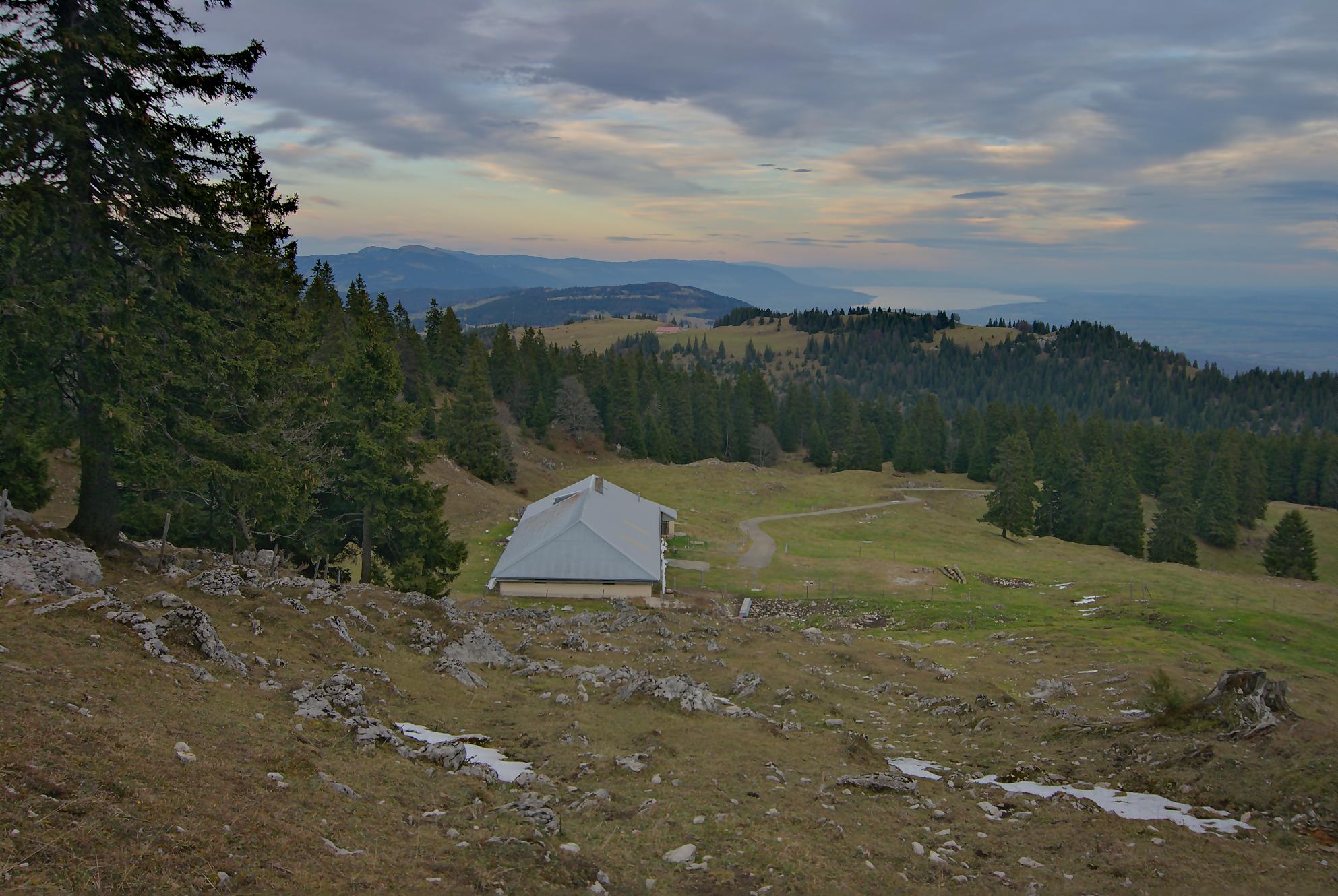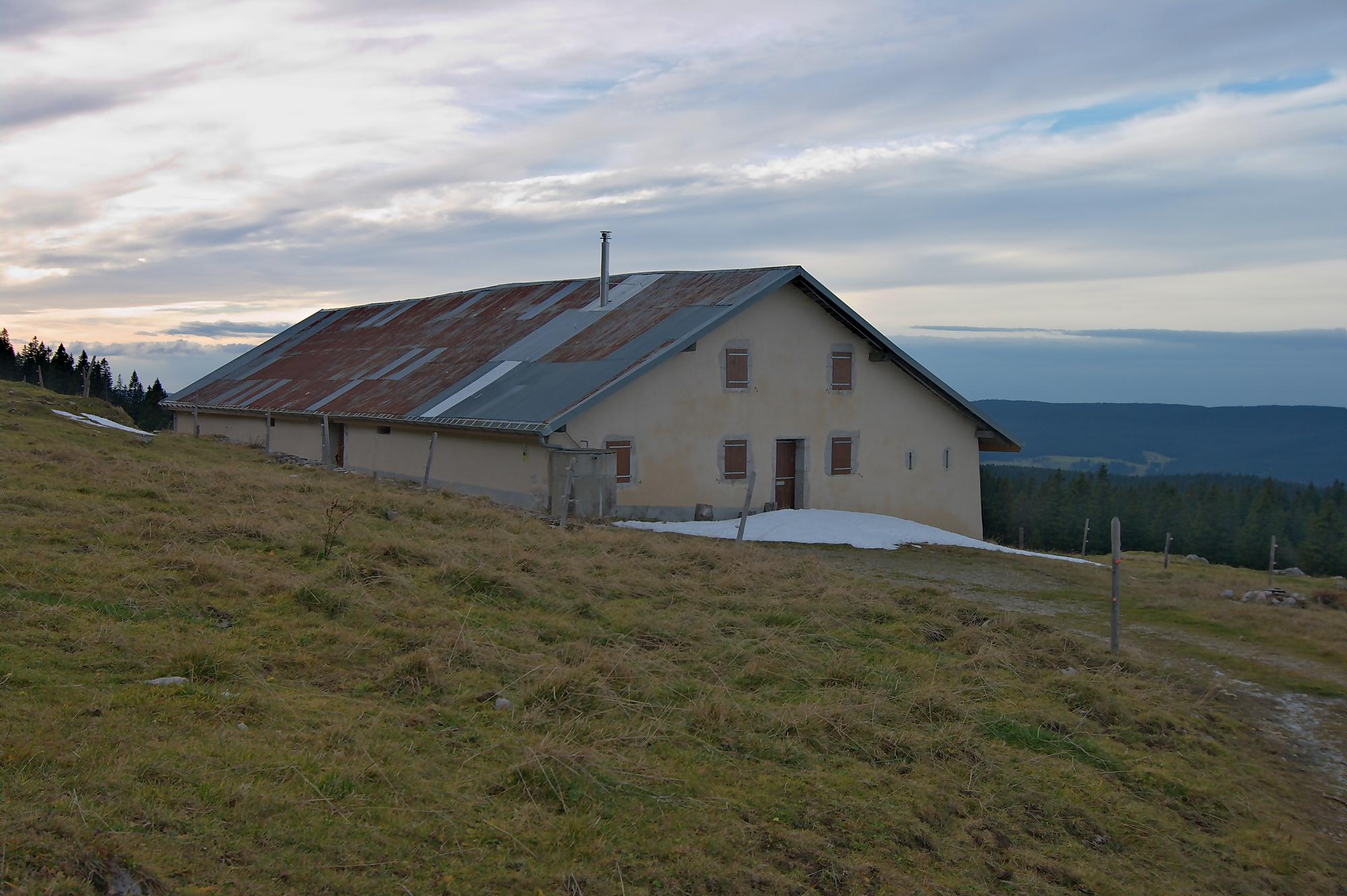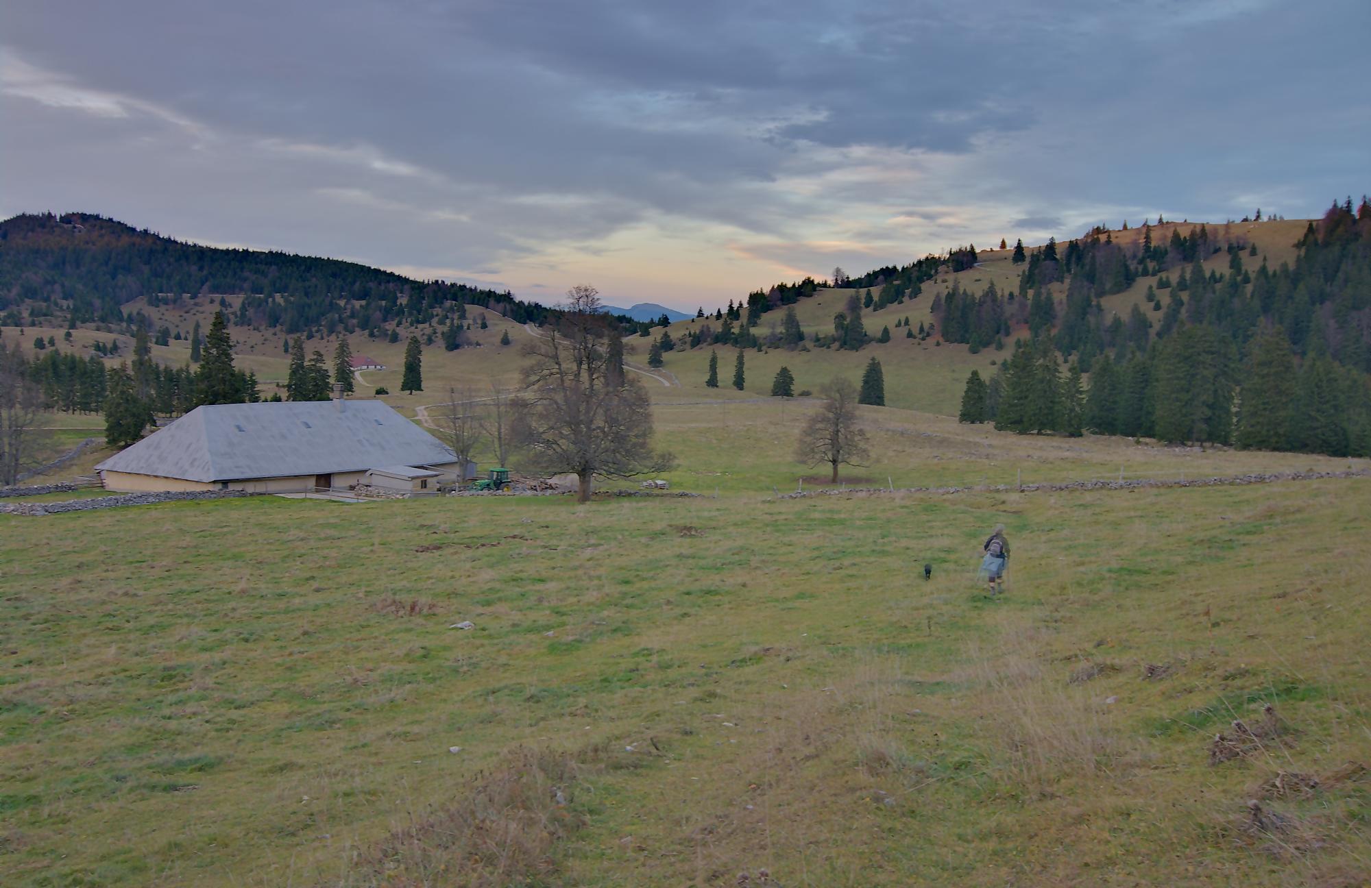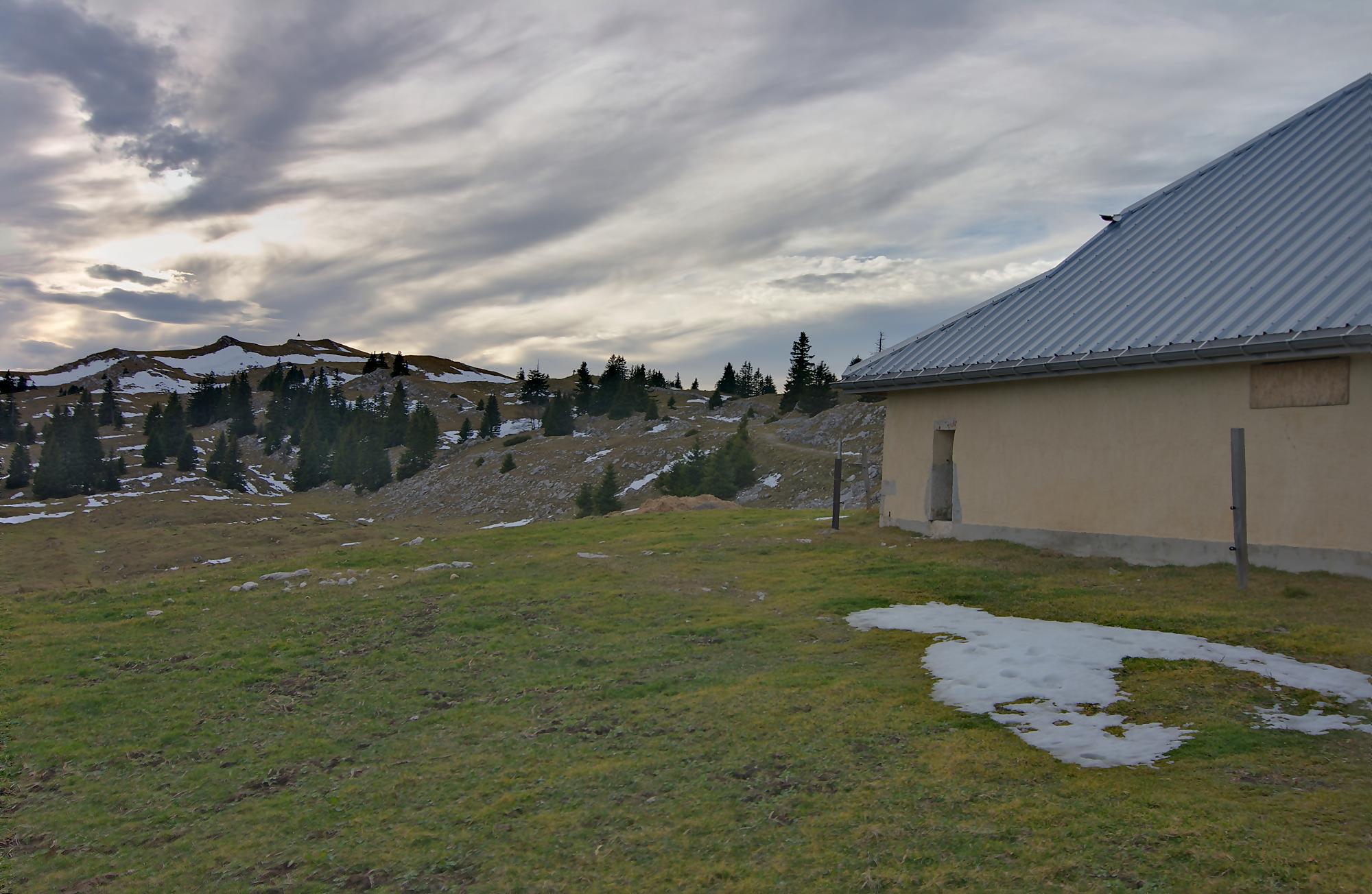 Le secteur de la combe avant le Chalet à Pierre, est bien boueux, le soleil rasant n’arrivant pas à sécher le sol. Au Chalet de Pierre (1551m), nous partons sur la gauche, par une route de 4×4 pour rejoindre le Chalet du Mont-Tendre (buvette en été). Le vent est fort et je suis quand même surpris de voir un peu de monde. Je prends des photos HDR (3 photos en rafale) derrière la ferme, mais je suis presque déstabilisé, les trois photos n’ont pas le même cadrage (le logiciel rattrape cela, mais cela fait perdre en taille). Pour nous, ce sera le terminus, le Mont-Tendre ne sera pas atteint ce jour !