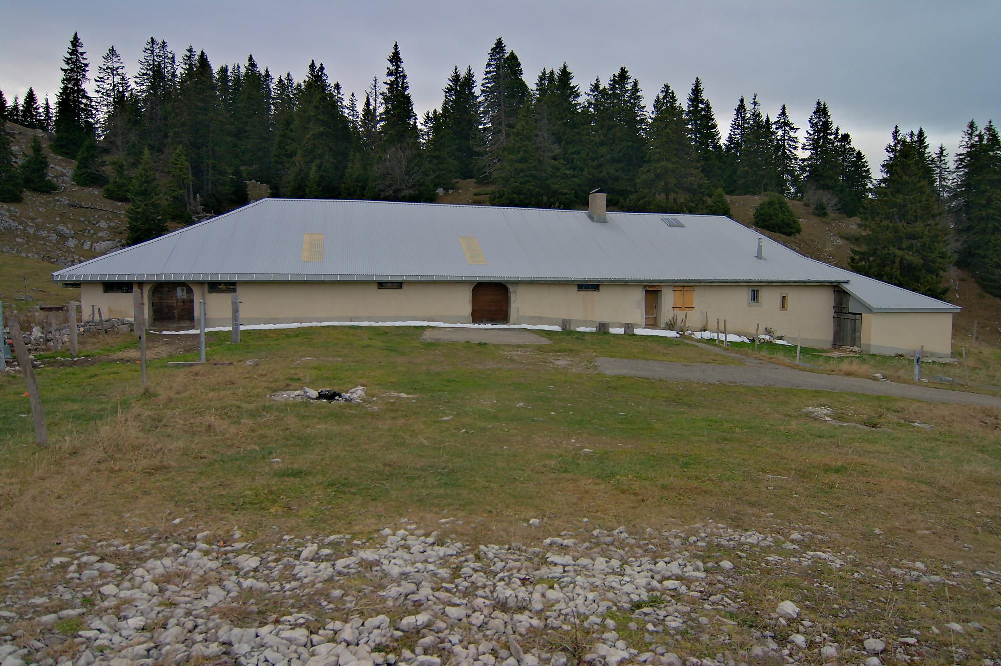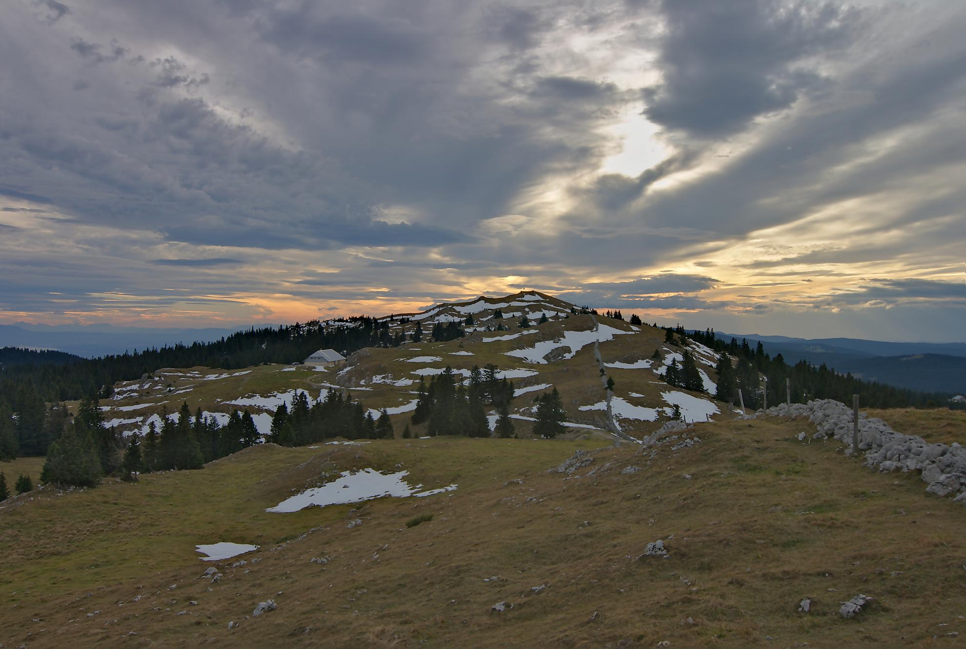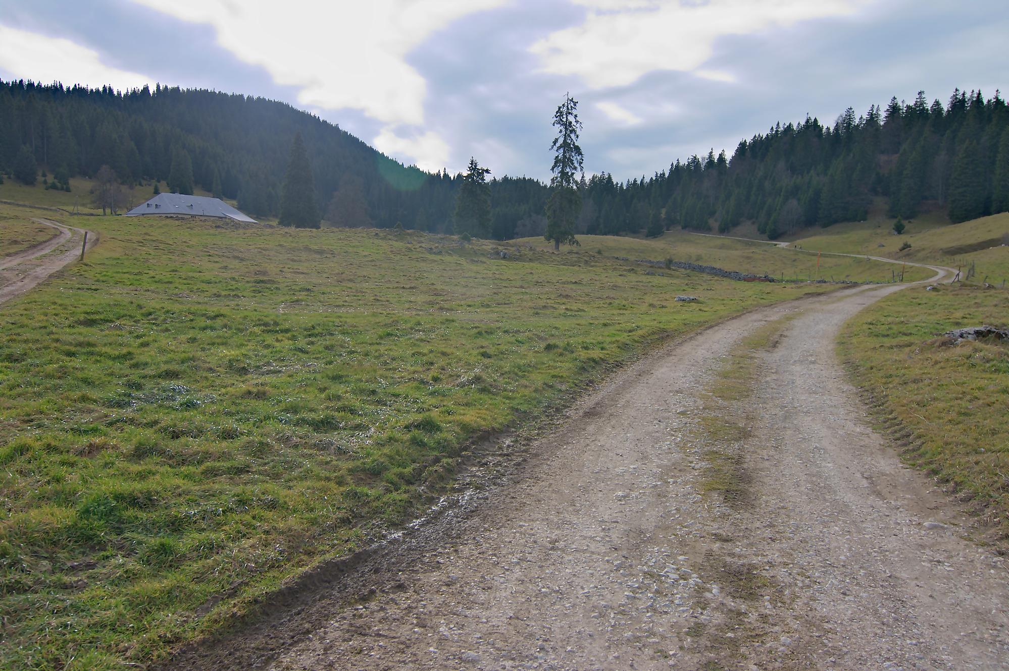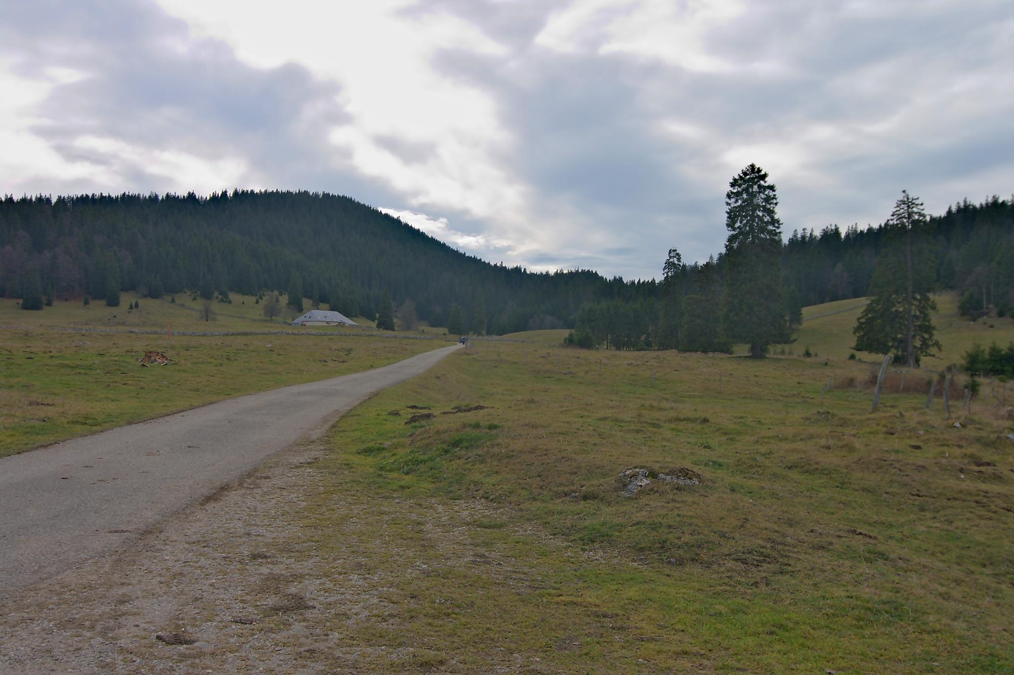 Le secteur de la combe avant le Chalet à Pierre, est bien boueux, le soleil rasant n’arrivant pas à sécher le sol. Au Chalet de Pierre (1551m), nous partons sur la gauche, par une route de 4×4 pour rejoindre le Chalet du Mont-Tendre (buvette en été). Le vent est fort et je suis quand même surpris de voir un peu de monde. Je prends des photos HDR (3 photos en rafale) derrière la ferme, mais je suis presque déstabilisé, les trois photos n’ont pas le même cadrage (le logiciel rattrape cela, mais cela fait perdre en taille). Pour nous, ce sera le terminus, le Mont-Tendre ne sera pas atteint ce jour !