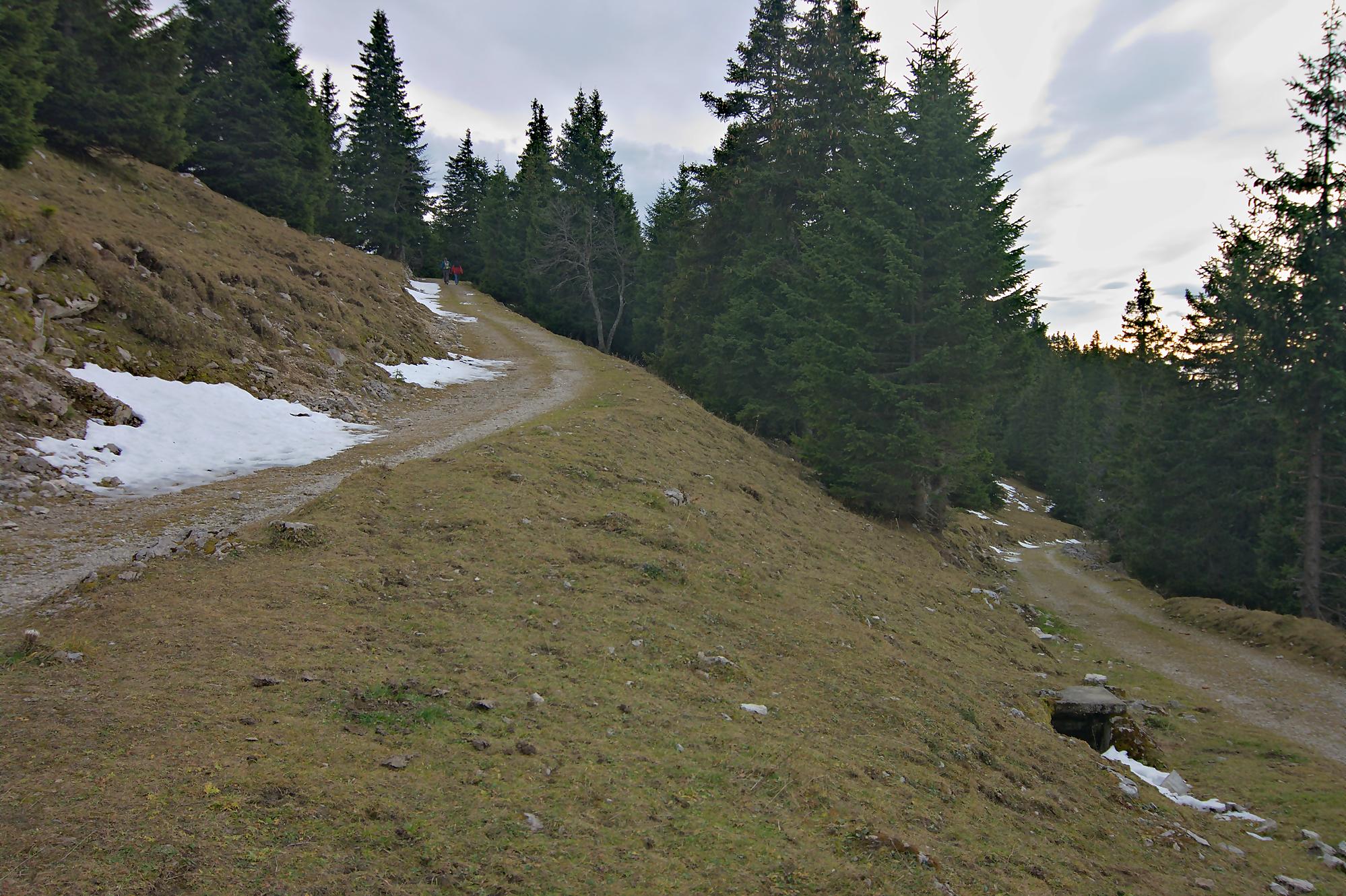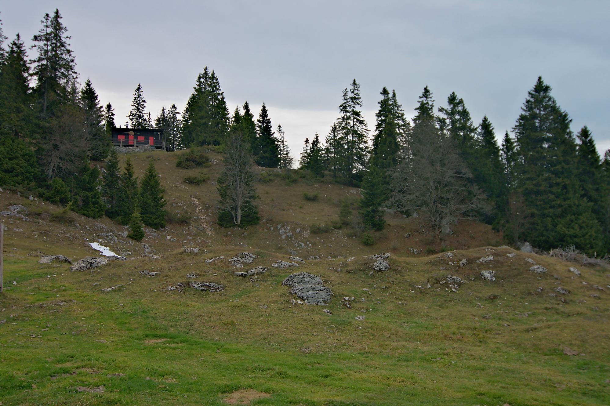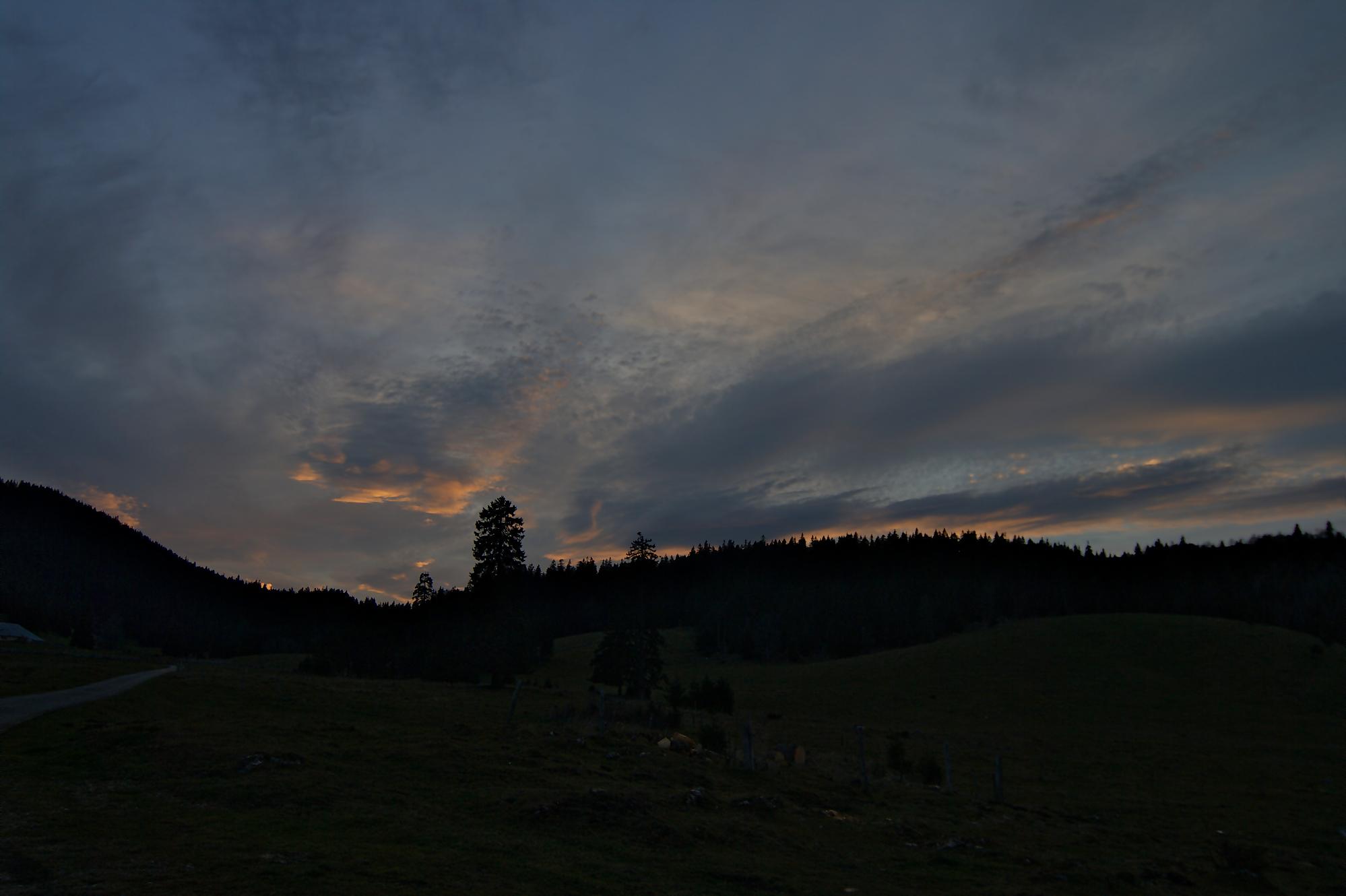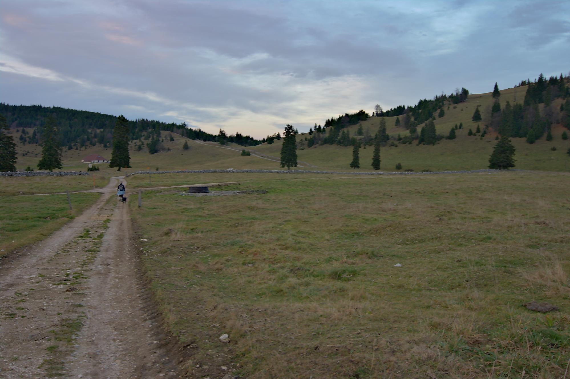 Le secteur de la combe avant le Chalet à Pierre, est bien boueux, le soleil rasant n’arrivant pas à sécher le sol. Au Chalet de Pierre (1551m), nous partons sur la gauche, par une route de 4×4 pour rejoindre le Chalet du Mont-Tendre (buvette en été). Le vent est fort et je suis quand même surpris de voir un peu de monde. Je prends des photos HDR (3 photos en rafale) derrière la ferme, mais je suis presque déstabilisé, les trois photos n’ont pas le même cadrage (le logiciel rattrape cela, mais cela fait perdre en taille). Pour nous, ce sera le terminus, le Mont-Tendre ne sera pas atteint ce jour !
