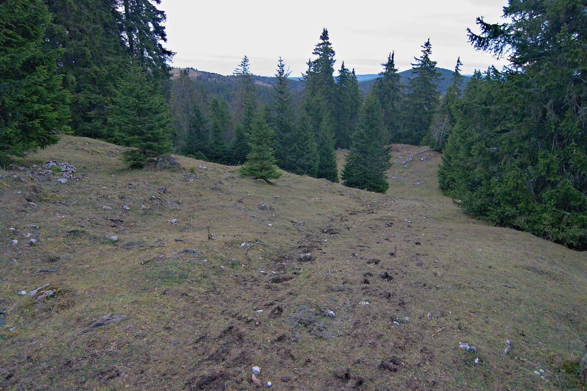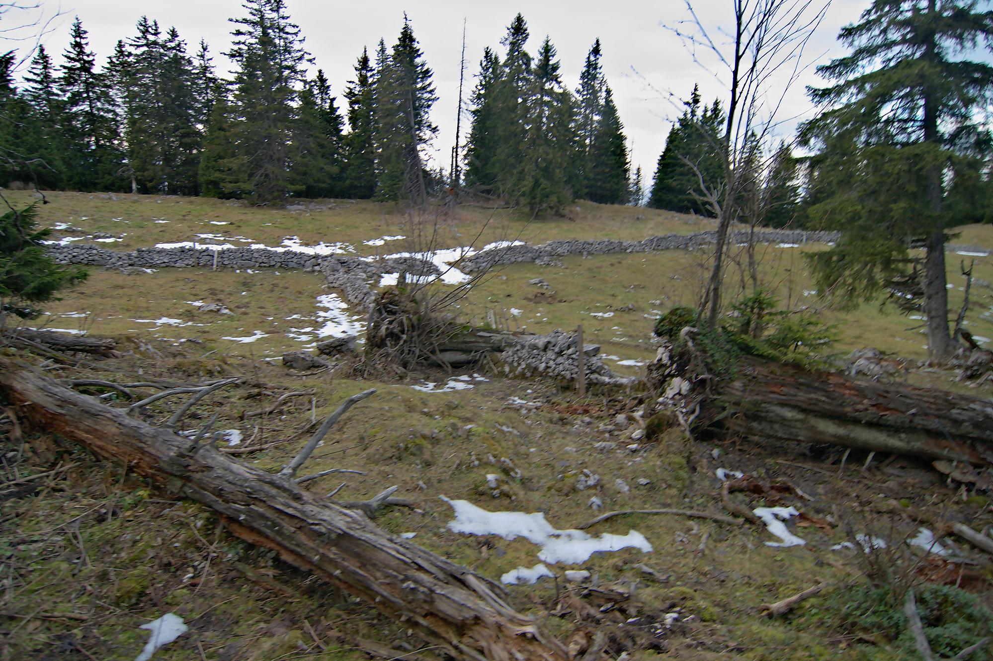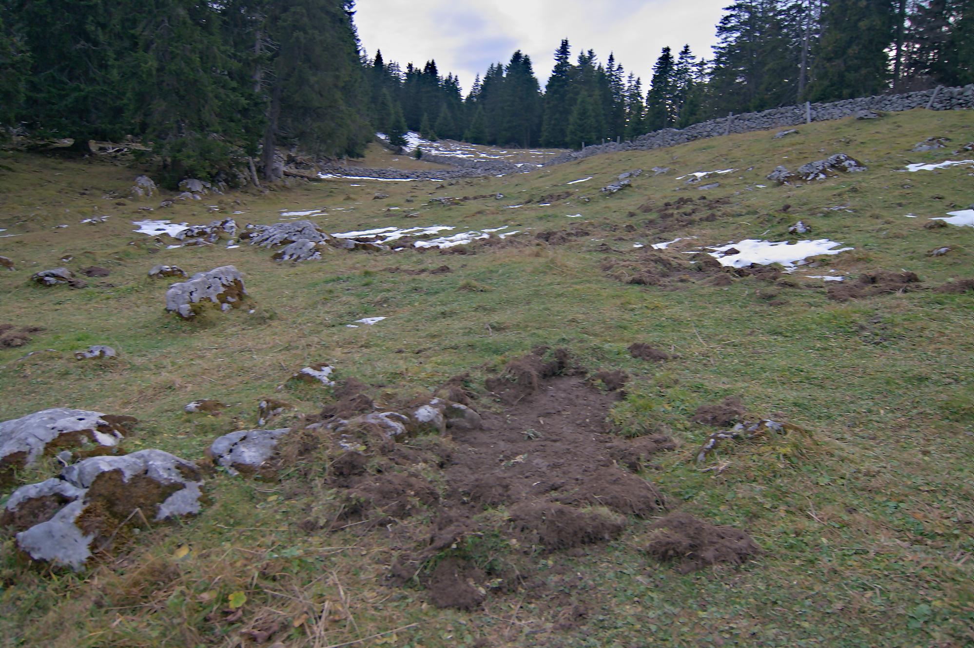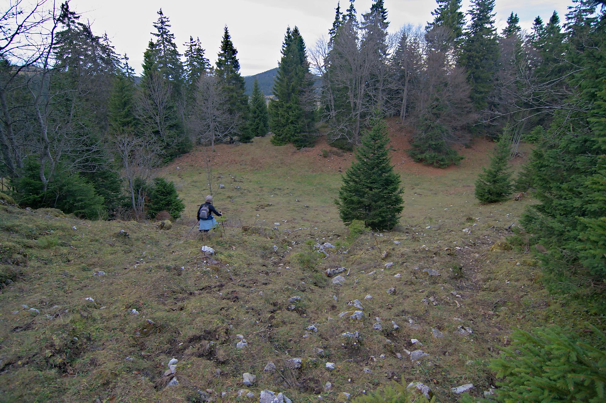 Nous arrivons au-dessus du Pt1502, on traverse au mieux un mur de pierre sèches. Les sangliers sont venus faire une razzia dans ce champ. Puis nous passons devant le Creux à la Biches une doline entourée de rochers avec quelques arbres au centre. Je pense que l’eau doit stagner ici et les cerfs venir s’y abreuver.