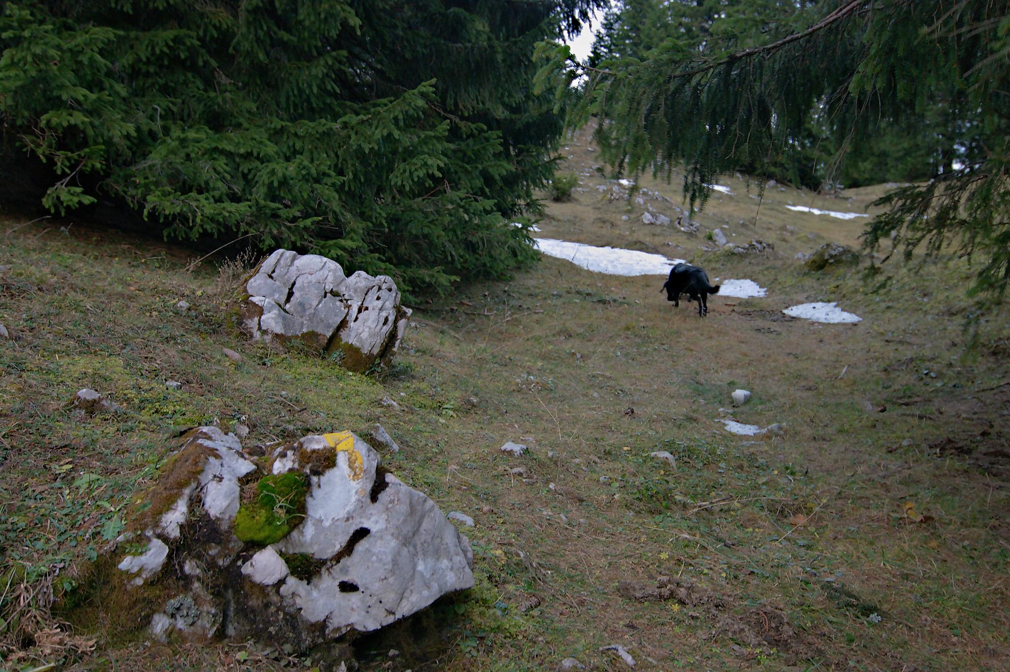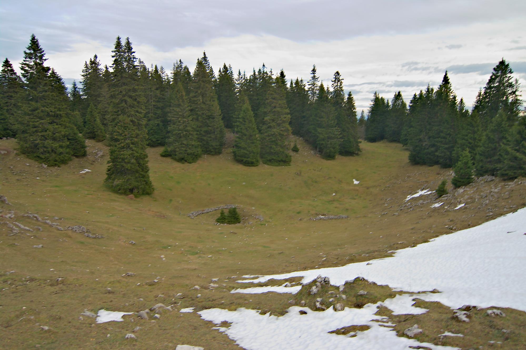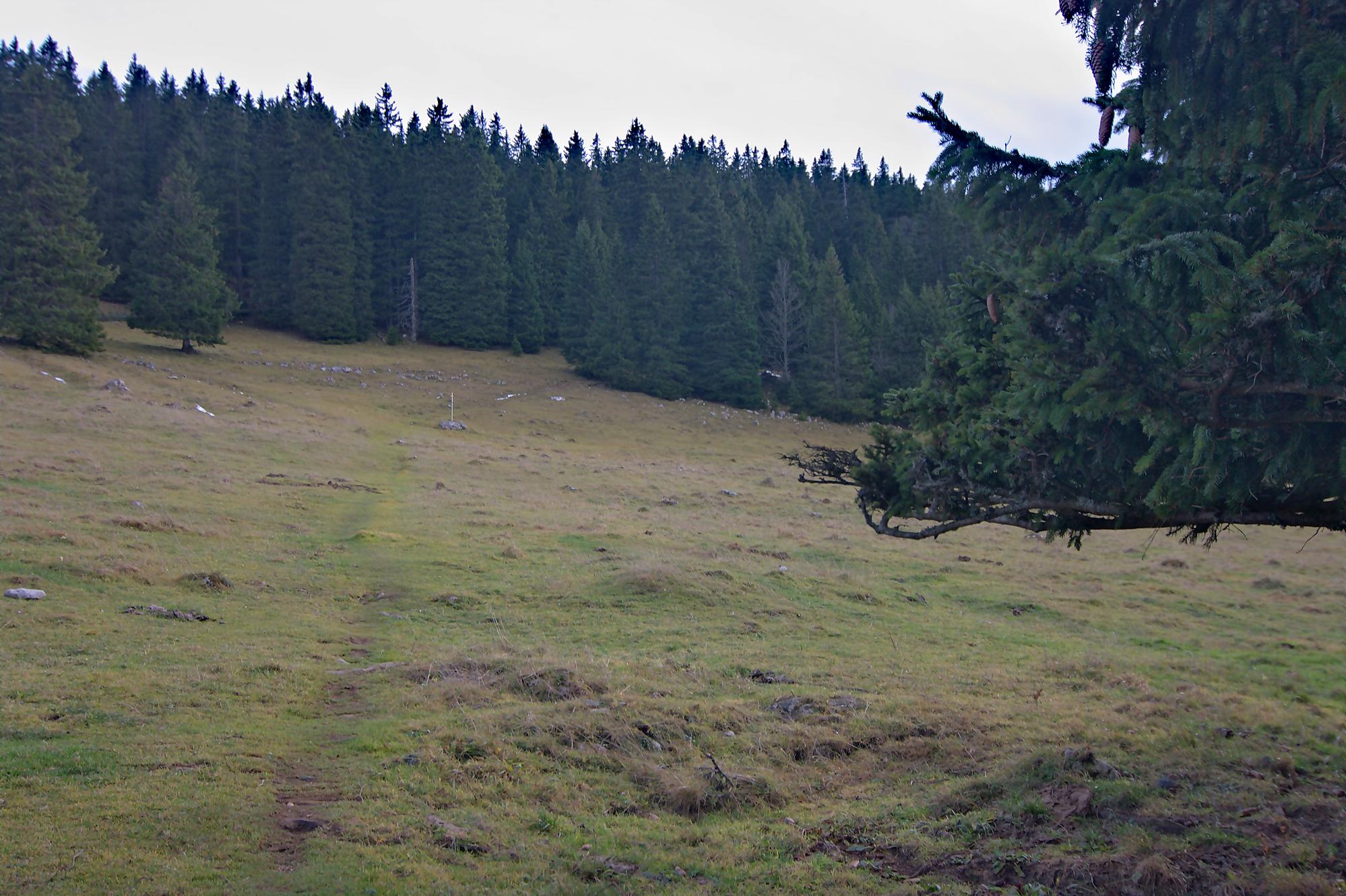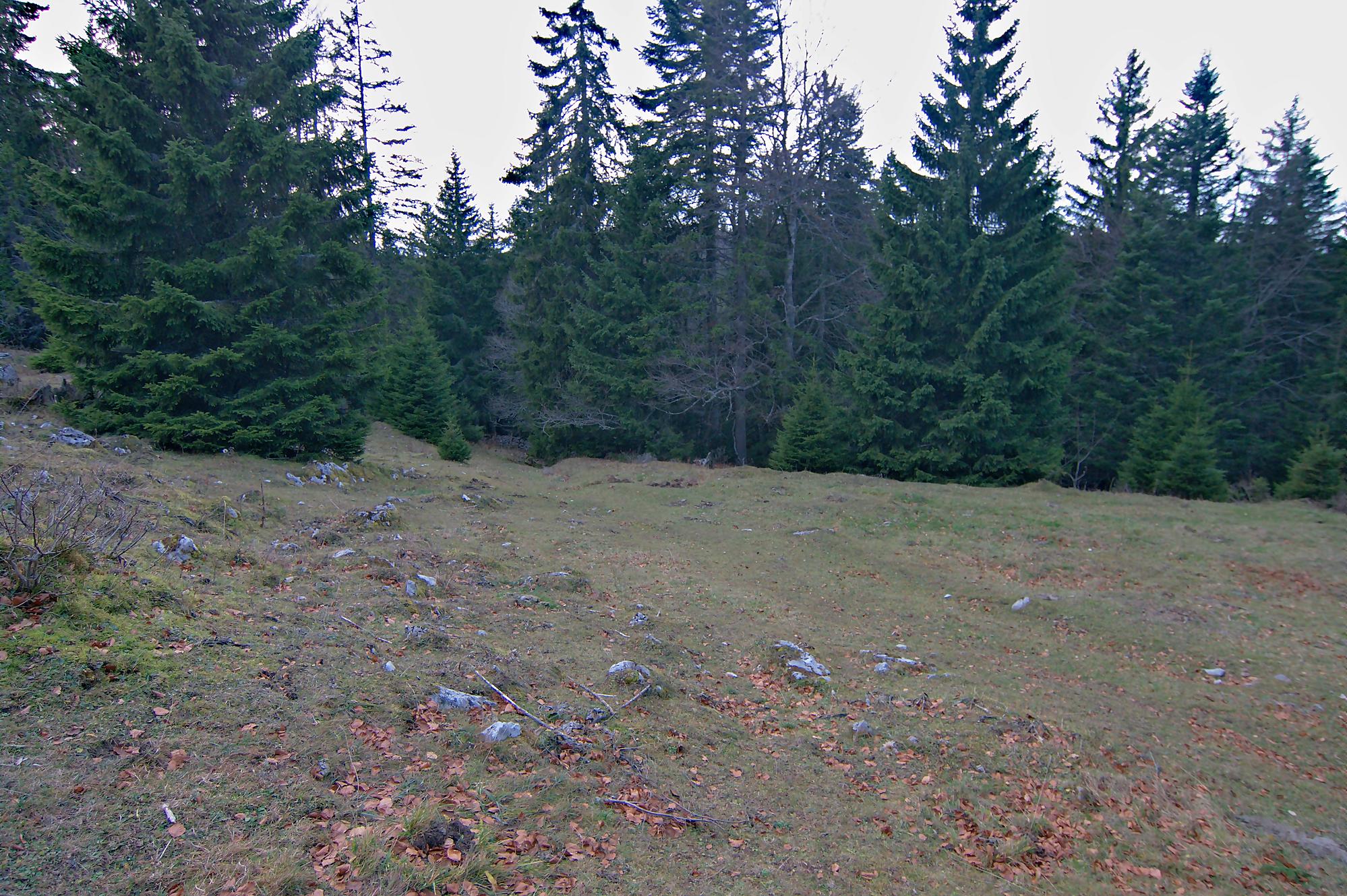 Nous arrivons au-dessus du Pt1502, on traverse au mieux un mur de pierre sèches. Les sangliers sont venus faire une razzia dans ce champ. Puis nous passons devant le Creux à la Biches une doline entourée de rochers avec quelques arbres au centre. Je pense que l’eau doit stagner ici et les cerfs venir s’y abreuver.