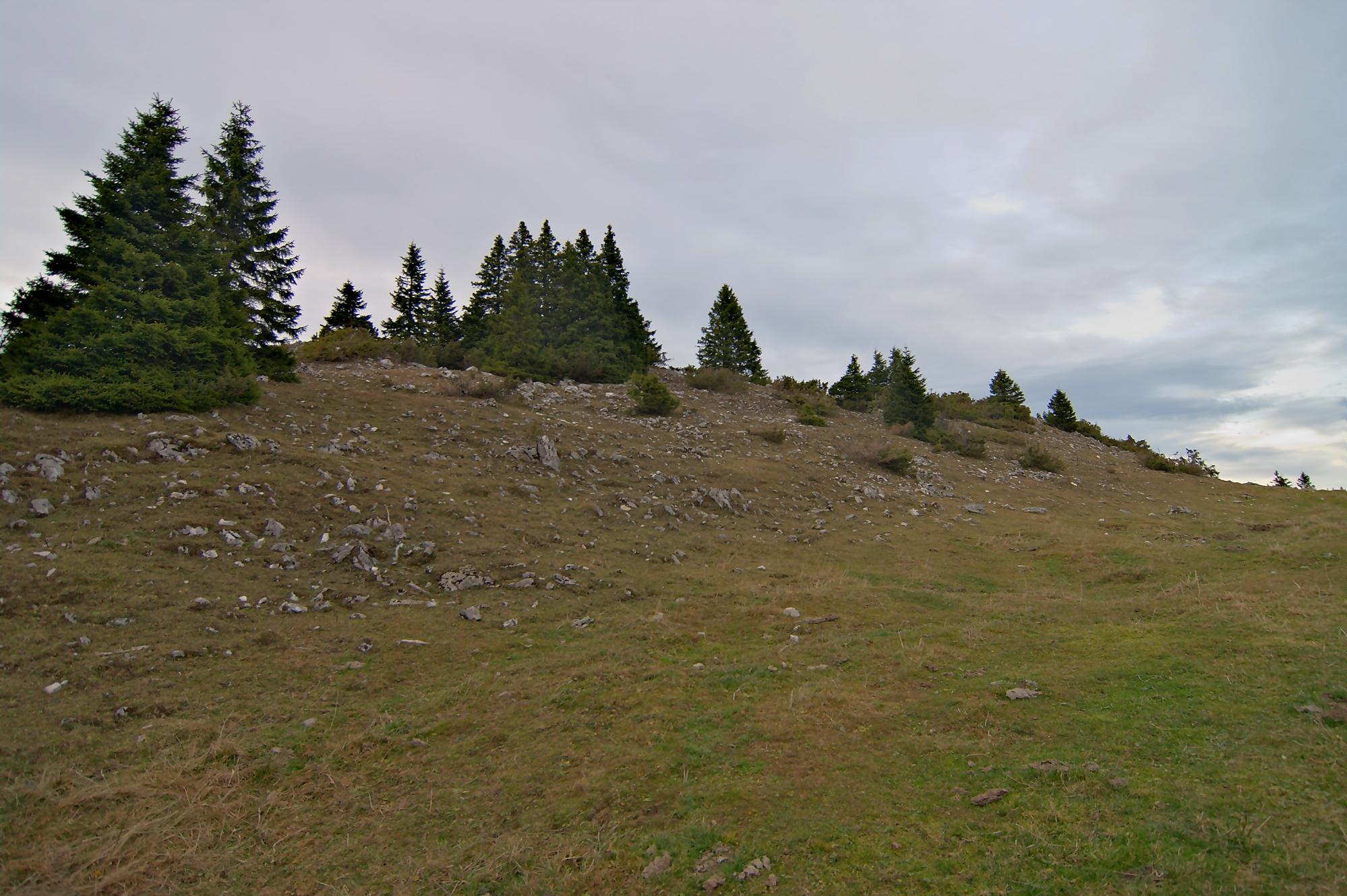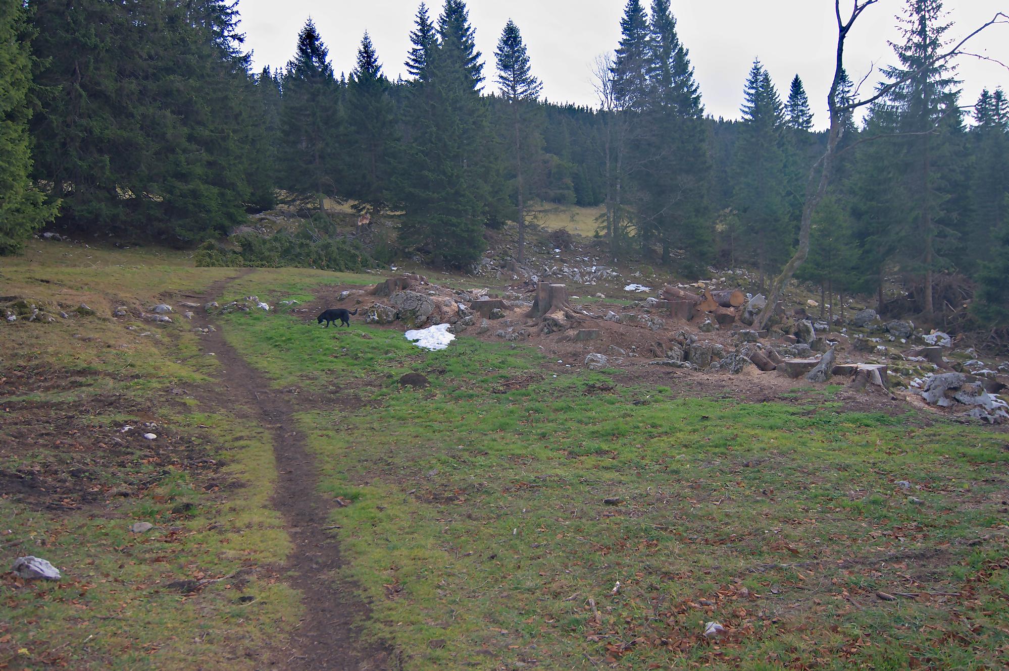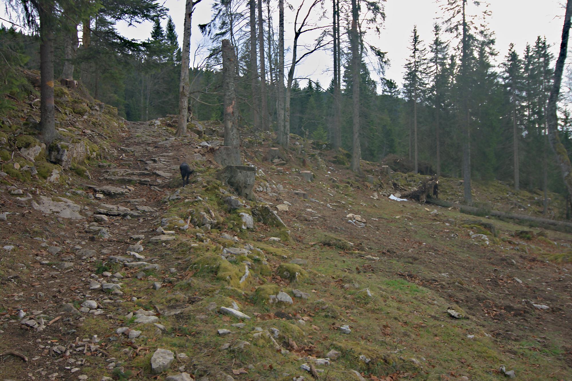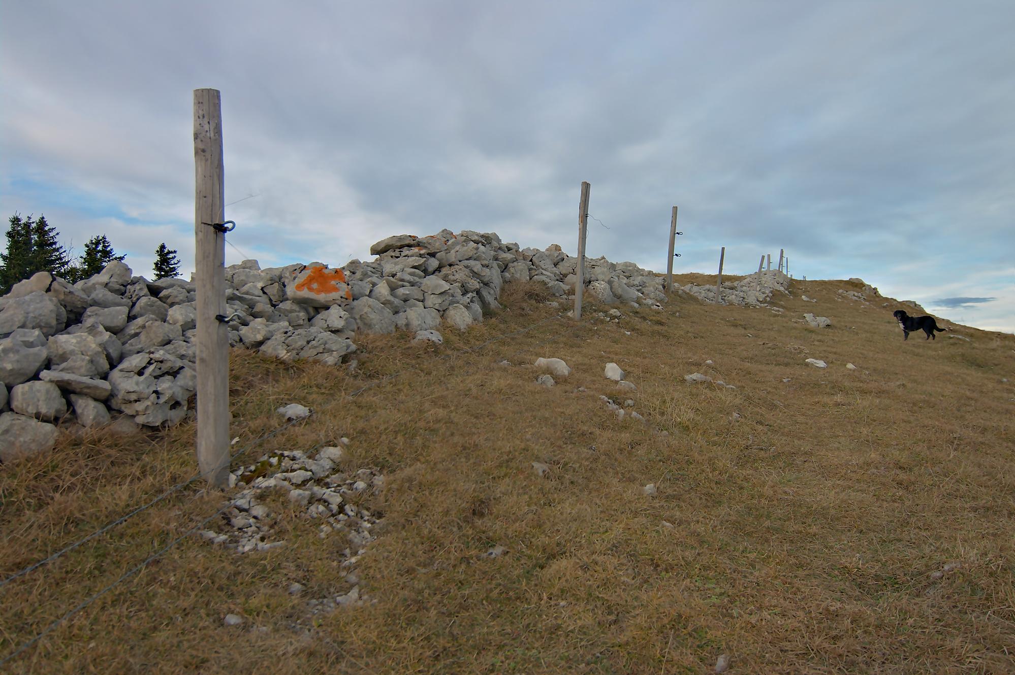 Nous arrivons au-dessus du Pt1502, on traverse au mieux un mur de pierre sèches. Les sangliers sont venus faire une razzia dans ce champ. Puis nous passons devant le Creux à la Biches une doline entourée de rochers avec quelques arbres au centre. Je pense que l’eau doit stagner ici et les cerfs venir s’y abreuver.