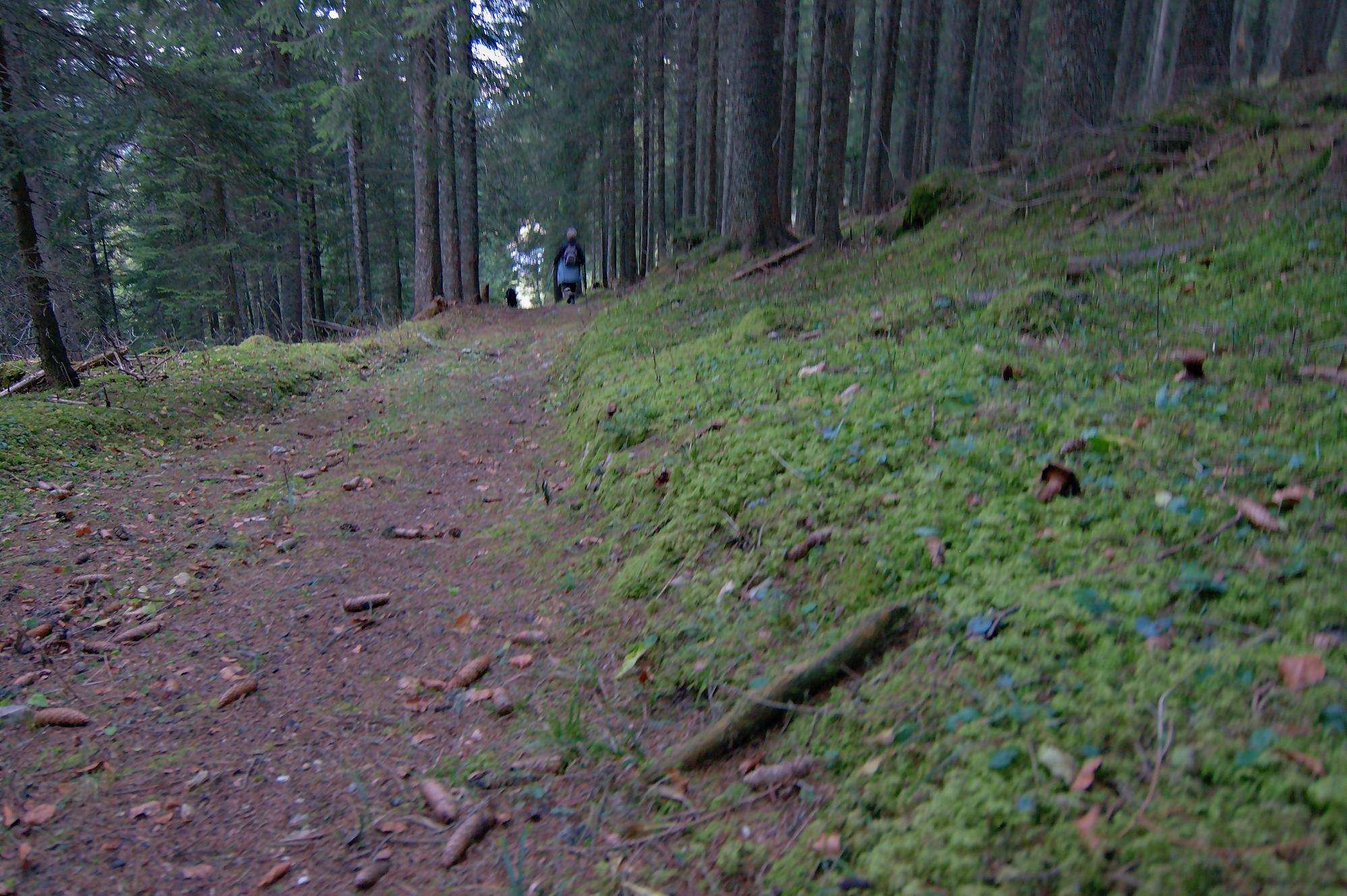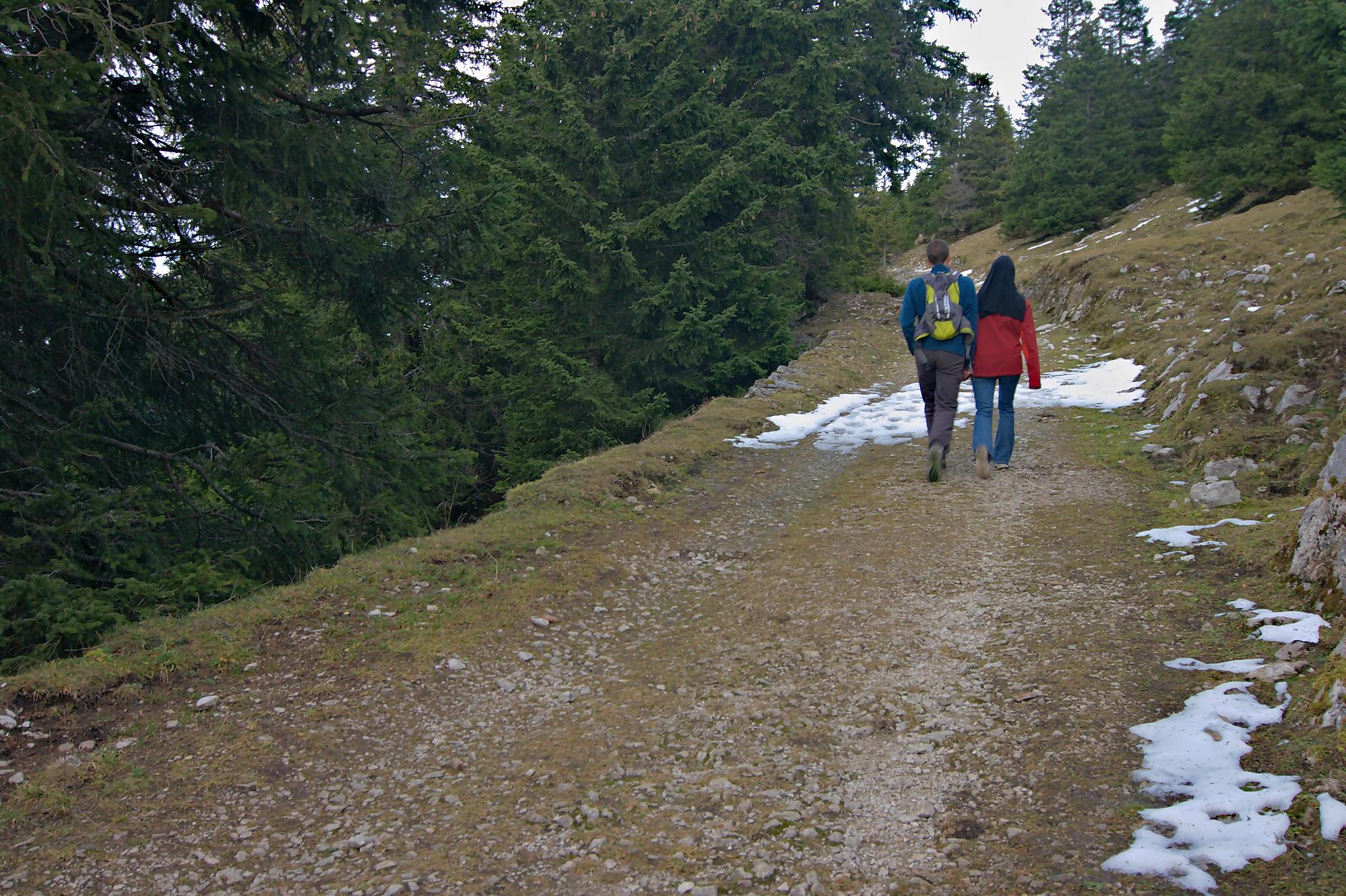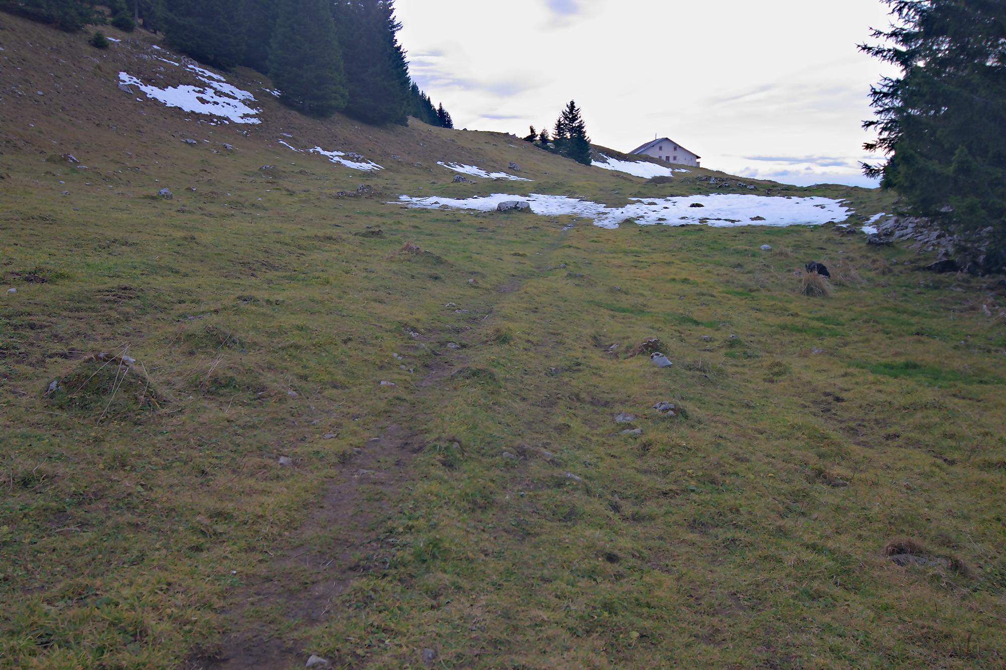 Nous finissons par arriver à la ferme Le Risel, 1468m. Nous empruntons brièvement la route pour partir dans le champ en hors piste. Lors de notre passage il y avait des traces de véhicules. Nous passons dans une série de petites clairières, en visant le chemin menant au réservoir d’eau. Ici j’ai utilisé mon GPS, mais il y a quelques traces de passage. On rejoint le sentier du réservoir, large pour se laisser descendre à la ferme Pré de l’Haut Dessus où après quelques minutes nous retrouvons la voiture. C’est la fin de journée (17h) le soleil se couche déjà !