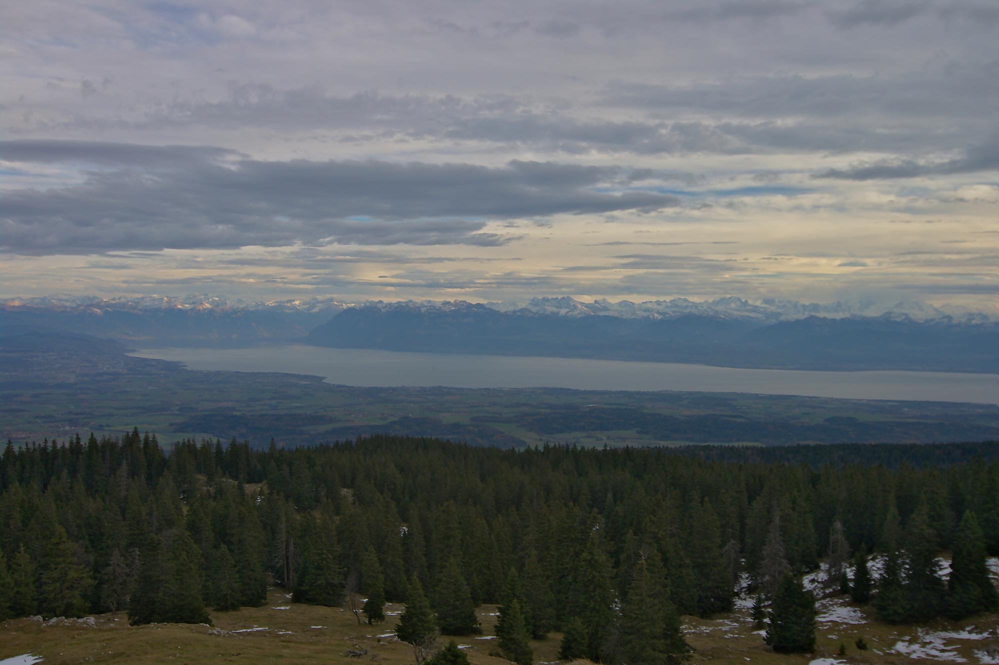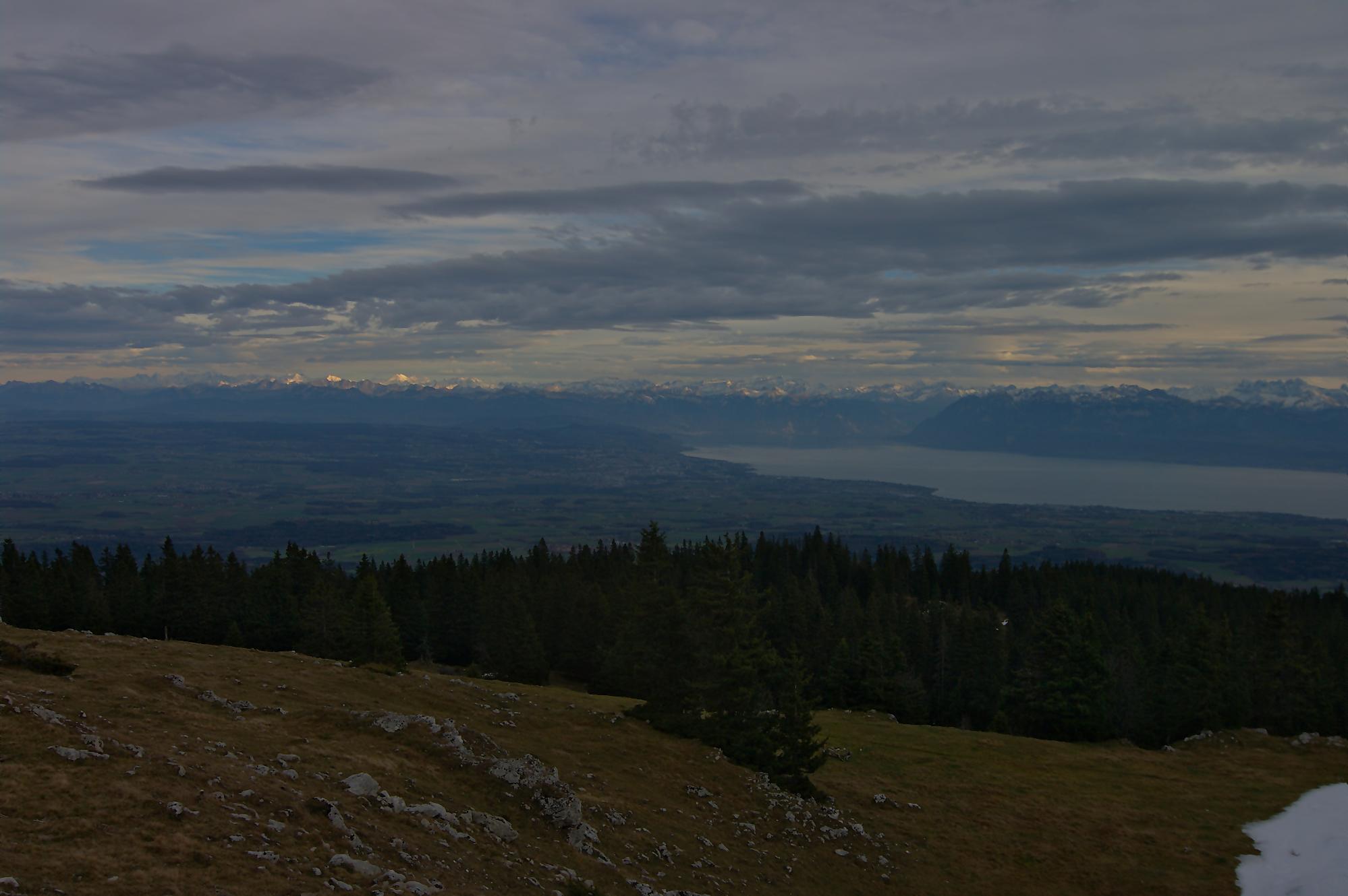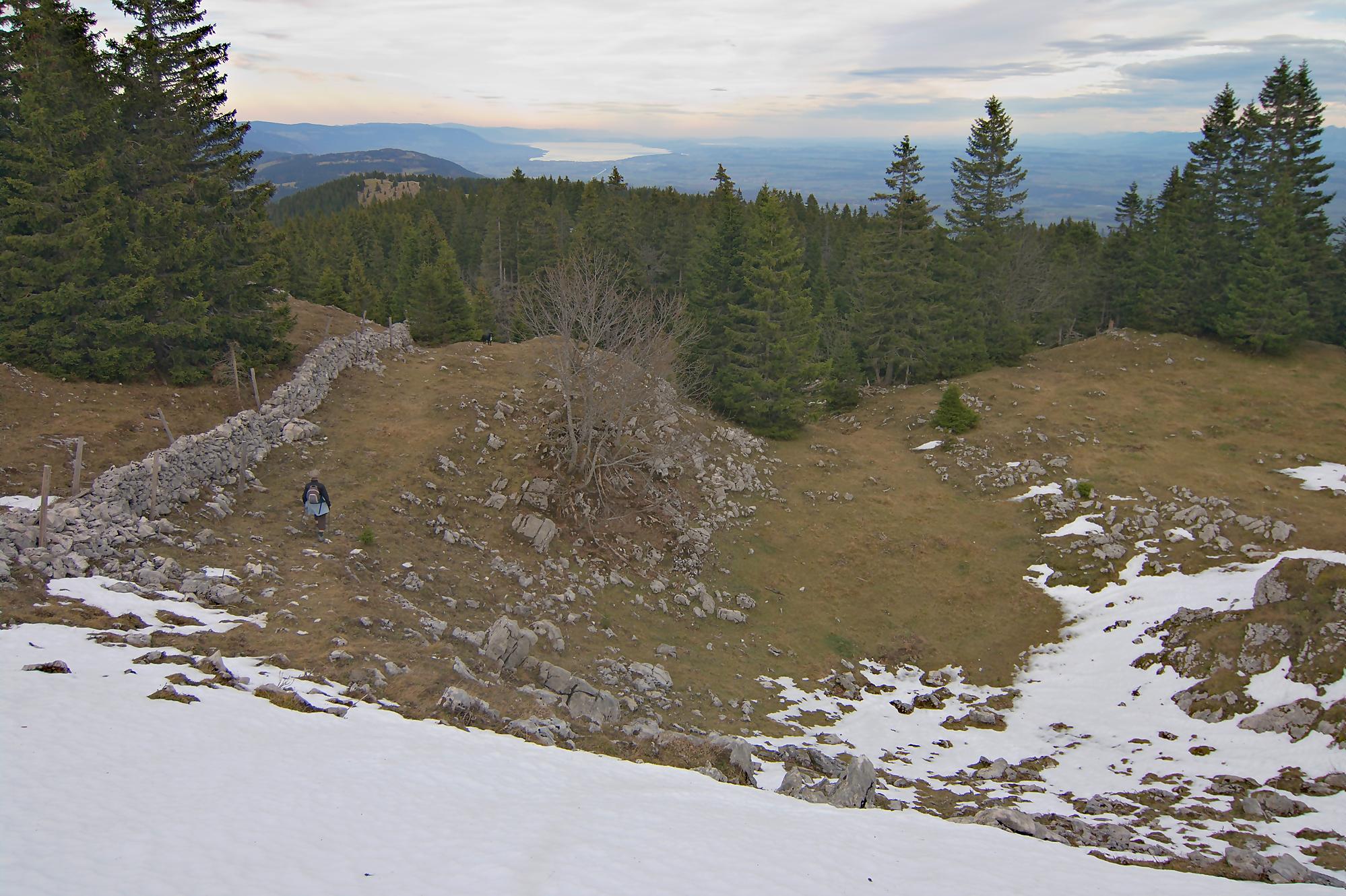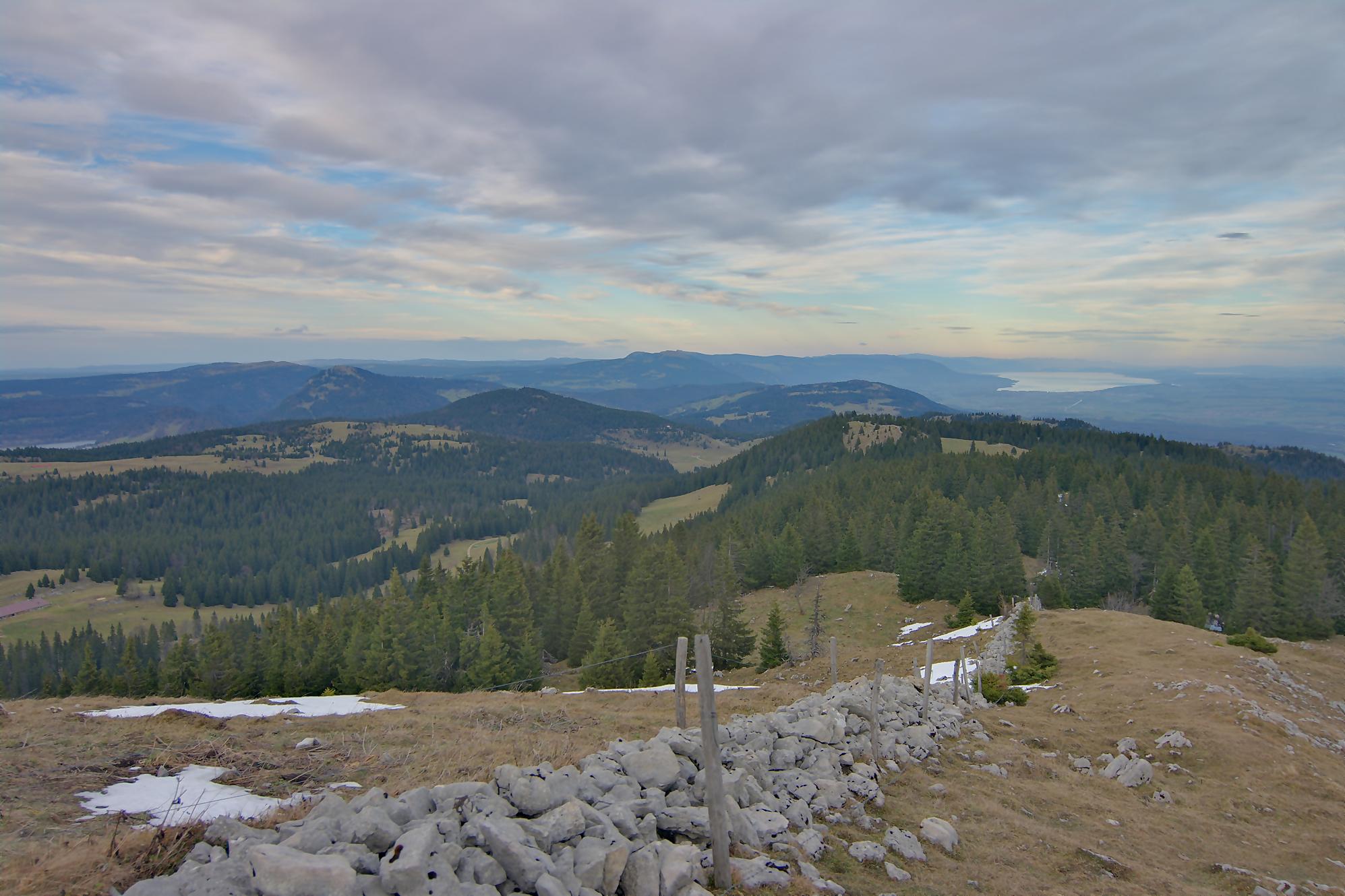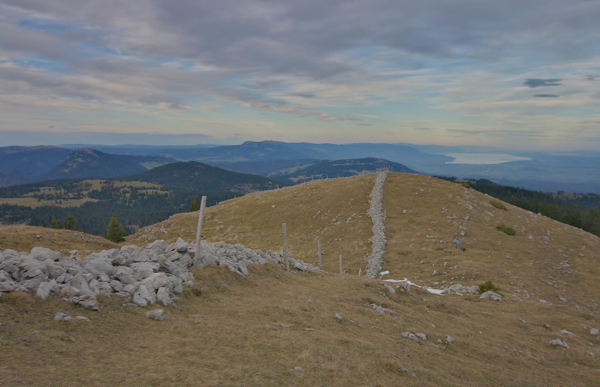 Sans traîner, nous faisons demi-tour, mais j’avais repéré sur la carte un chemin longeant la crête. Ne l’ayant jamais parcouru, nous partons par cette crête. Le chemin est peu tracé et les rares marques, mais grossièrement il faut suivre le mur de pierres sèches. Le parcours est confortable (non boueux) et surtout la vue superbe. Au début nous avons la vue sur le Léman et les Alpes et plus en avant, la vue sur les lacs de Neuchâtel et Bienne.