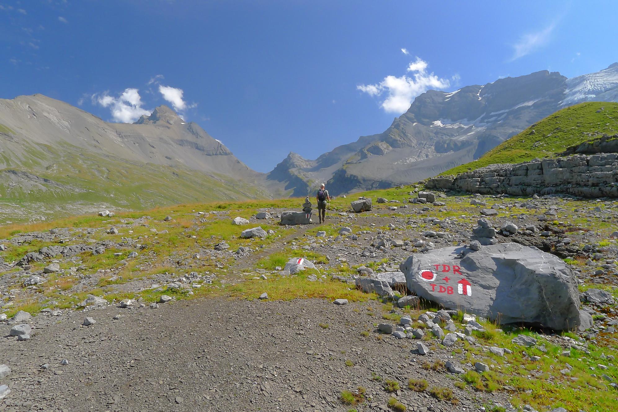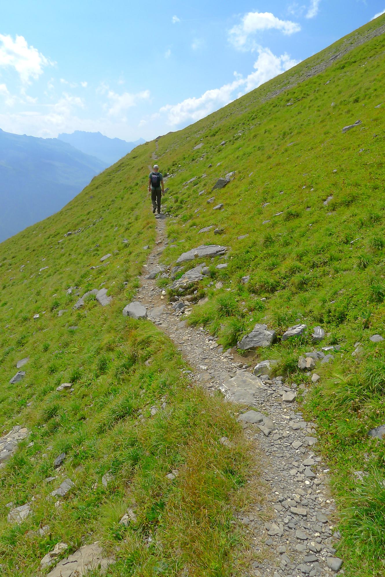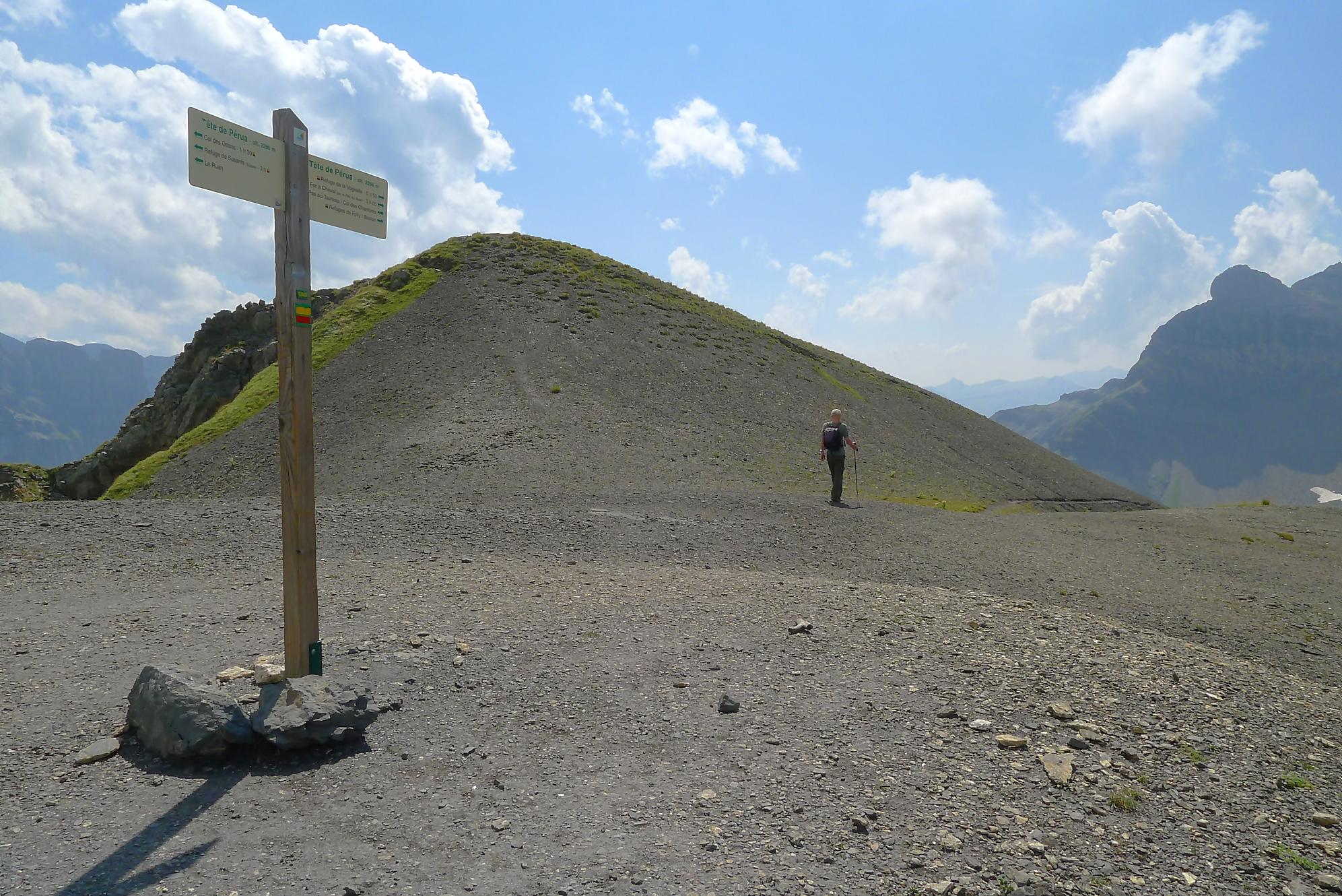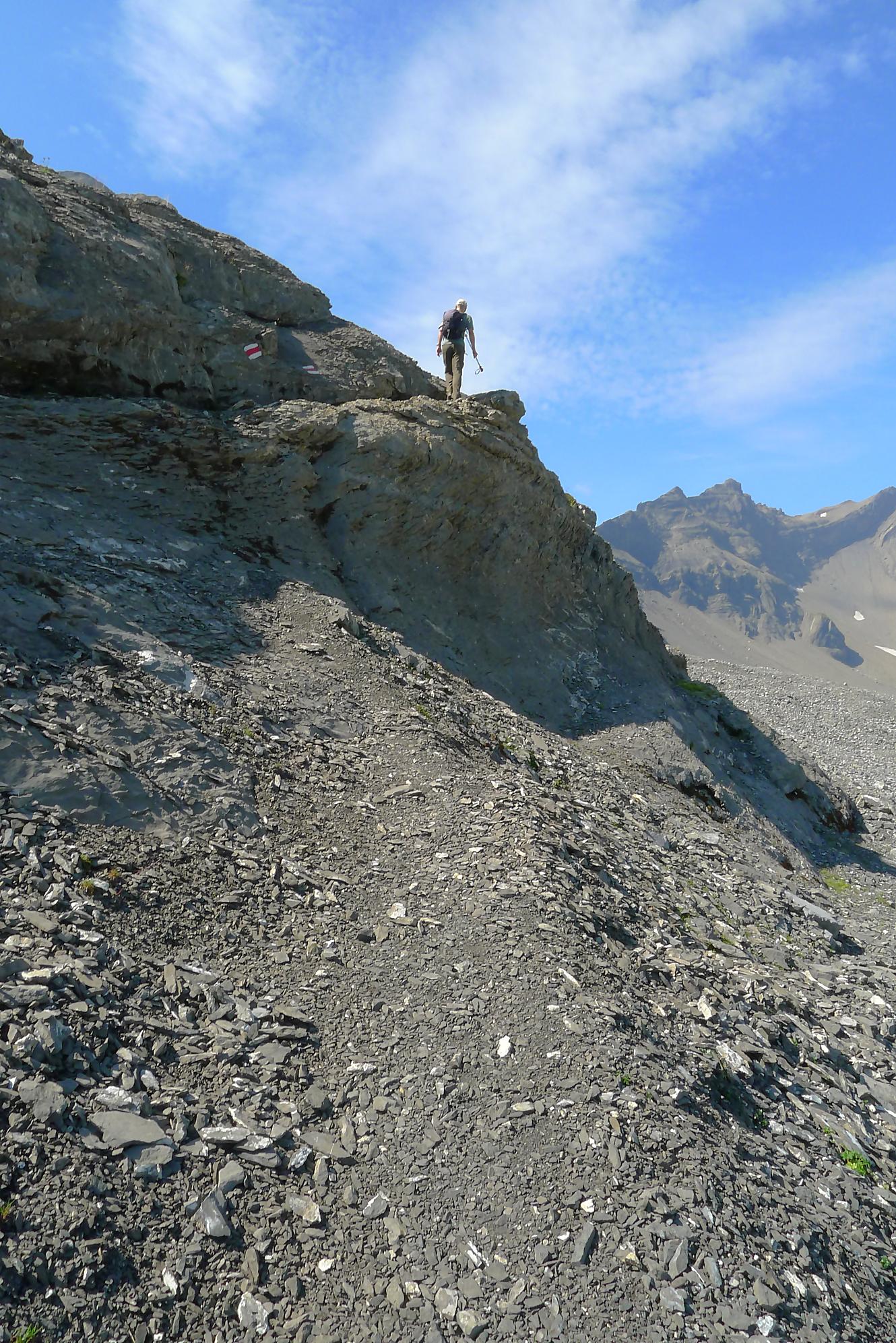 Nous arrivons au Pas d’Encel (1808m), le GPS en perd son latin, où nous retrouvons le soleil. Le chemin monte à flanc de coteau pour arriver à un col (entre le Pt1902 et Pt1964) où le chemin bifurque pour la ligne droite de la Cabane de Susanfe. Là nous décidons de couper court en hors piste, des traces nous y invitant ainsi que le profil. Le chemin officiel bifurque plus loin au Pt1964 et passe par la Station de Pompage. Pour nous, nous passons devant le lac de retenue et montons au mieux (il y a un rocher avec un marquage blanc). Nous retrouvons le chemin officiel vers 1960m. Le sentier est caillouteux et roulant, sauf que mon corps luttant avec acharnement contre le virus, mon énergie p’en trouve amoindrie et j’ai le souffle court, je n’arrive plus à suivre Christian.