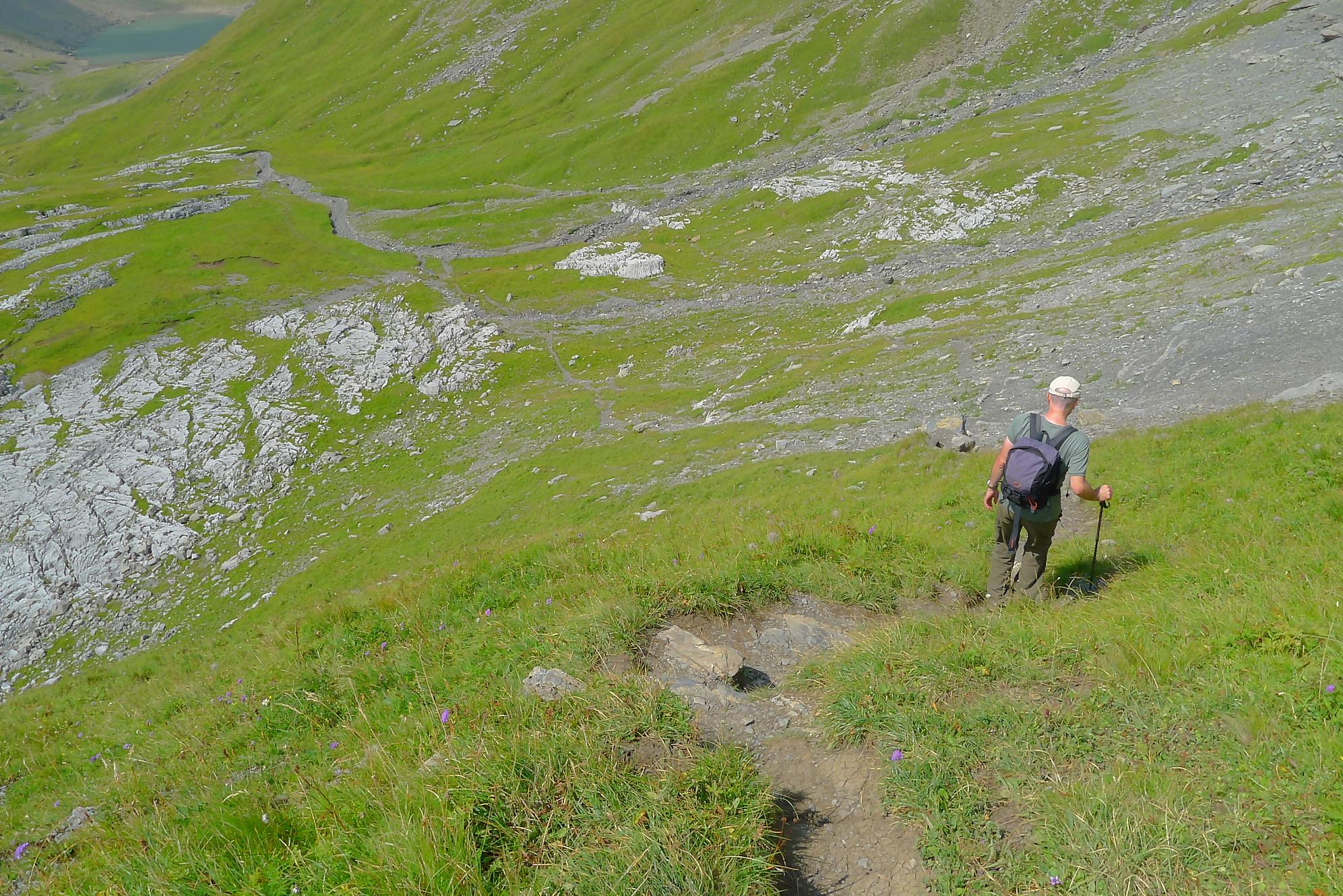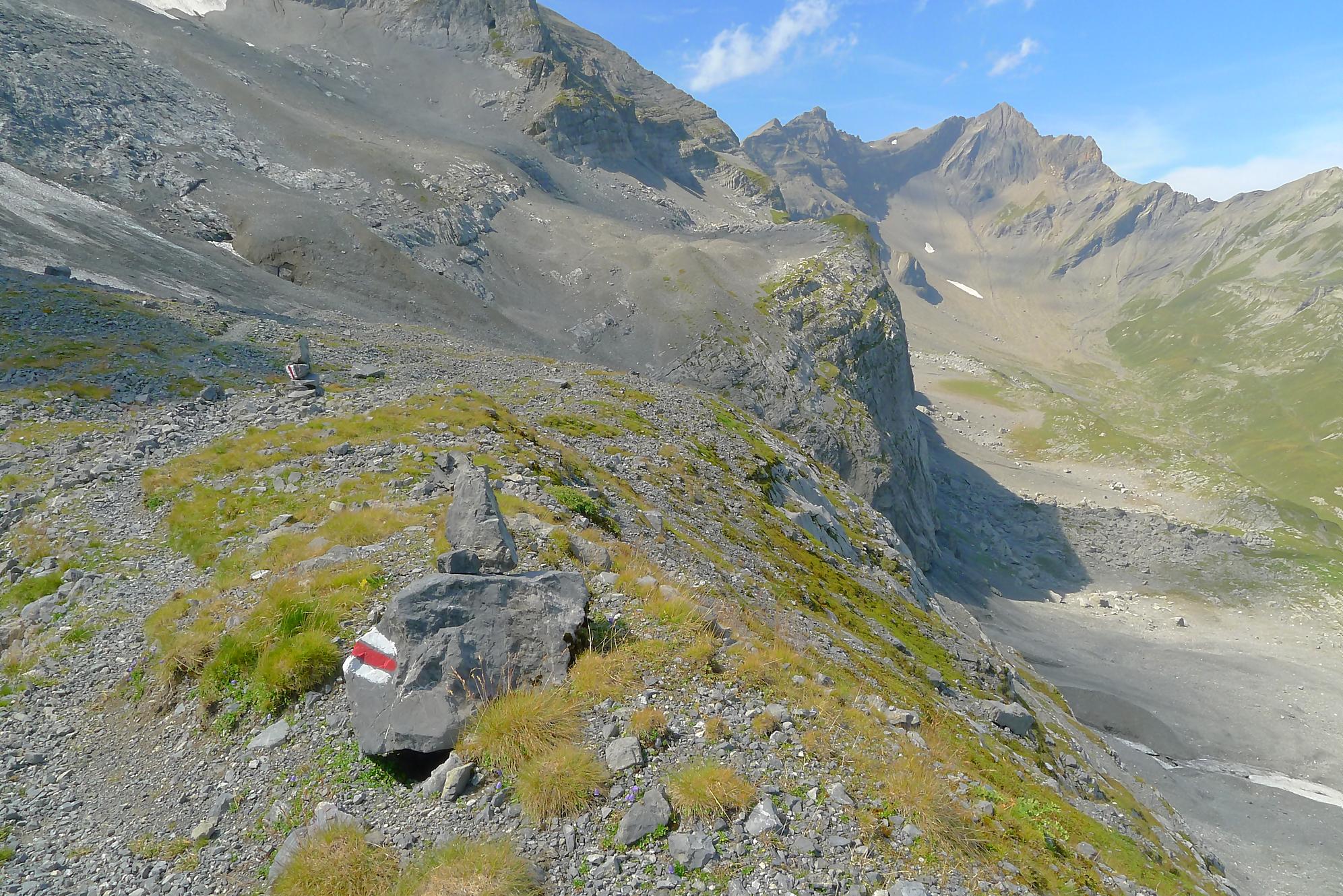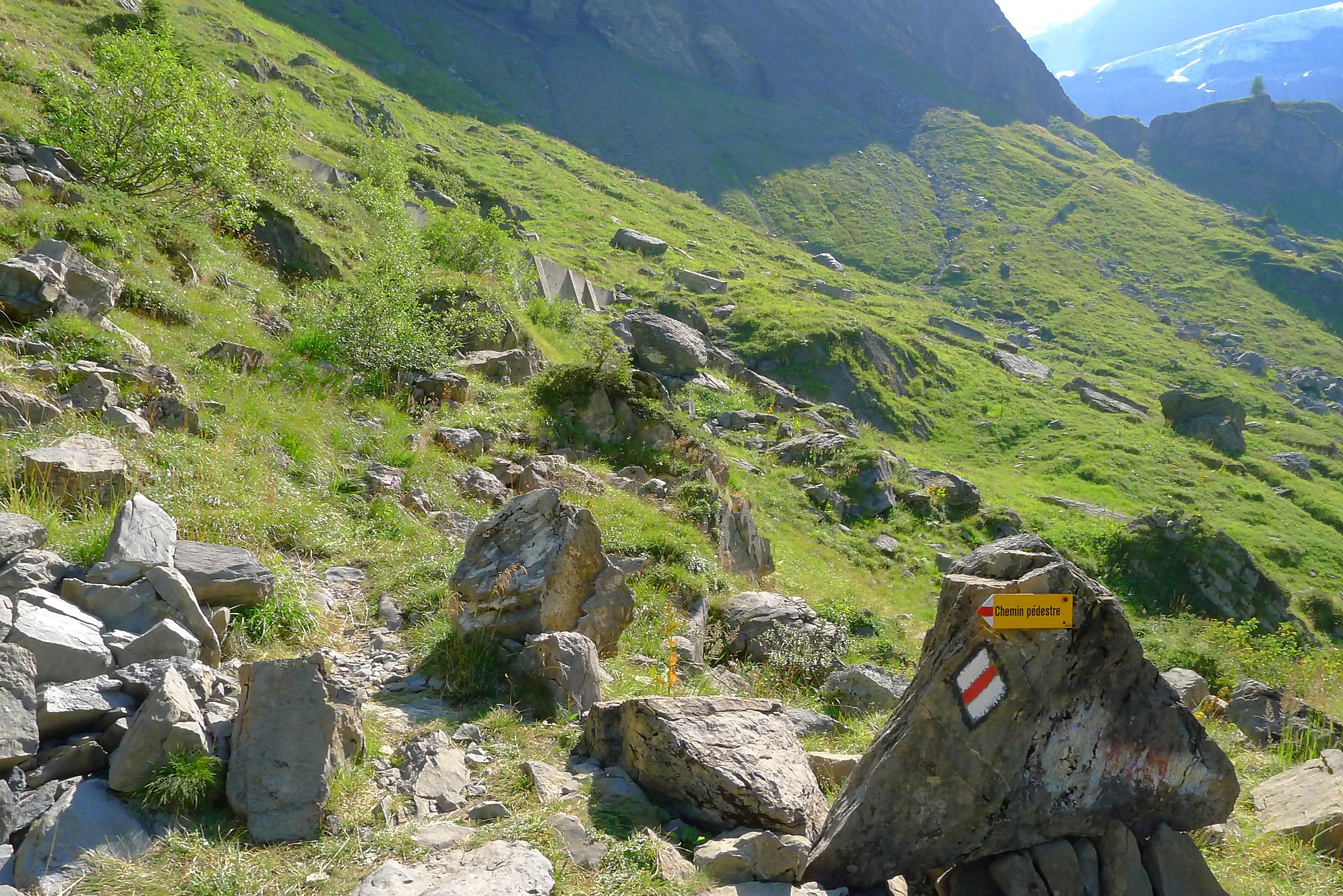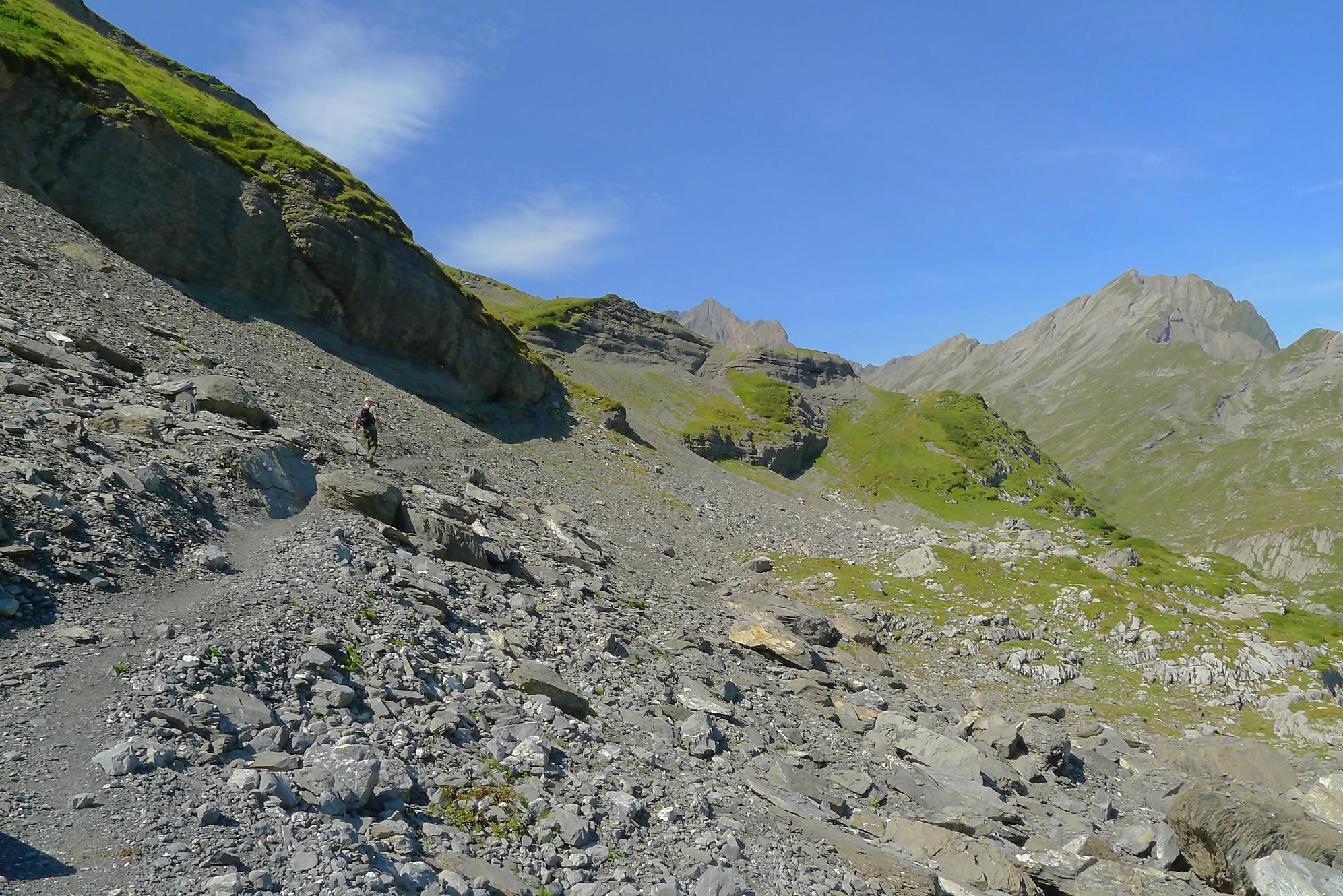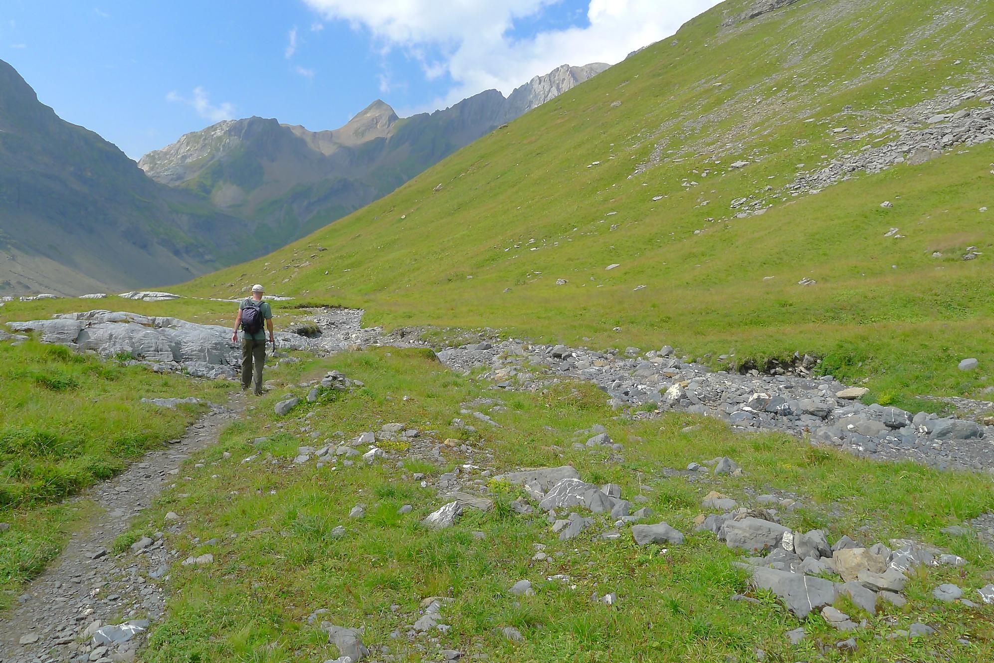 Nous arrivons au Pas d’Encel (1808m), le GPS en perd son latin, où nous retrouvons le soleil. Le chemin monte à flanc de coteau pour arriver à un col (entre le Pt1902 et Pt1964) où le chemin bifurque pour la ligne droite de la Cabane de Susanfe. Là nous décidons de couper court en hors piste, des traces nous y invitant ainsi que le profil. Le chemin officiel bifurque plus loin au Pt1964 et passe par la Station de Pompage. Pour nous, nous passons devant le lac de retenue et montons au mieux (il y a un rocher avec un marquage blanc). Nous retrouvons le chemin officiel vers 1960m. Le sentier est caillouteux et roulant, sauf que mon corps luttant avec acharnement contre le virus, mon énergie p’en trouve amoindrie et j’ai le souffle court, je n’arrive plus à suivre Christian.