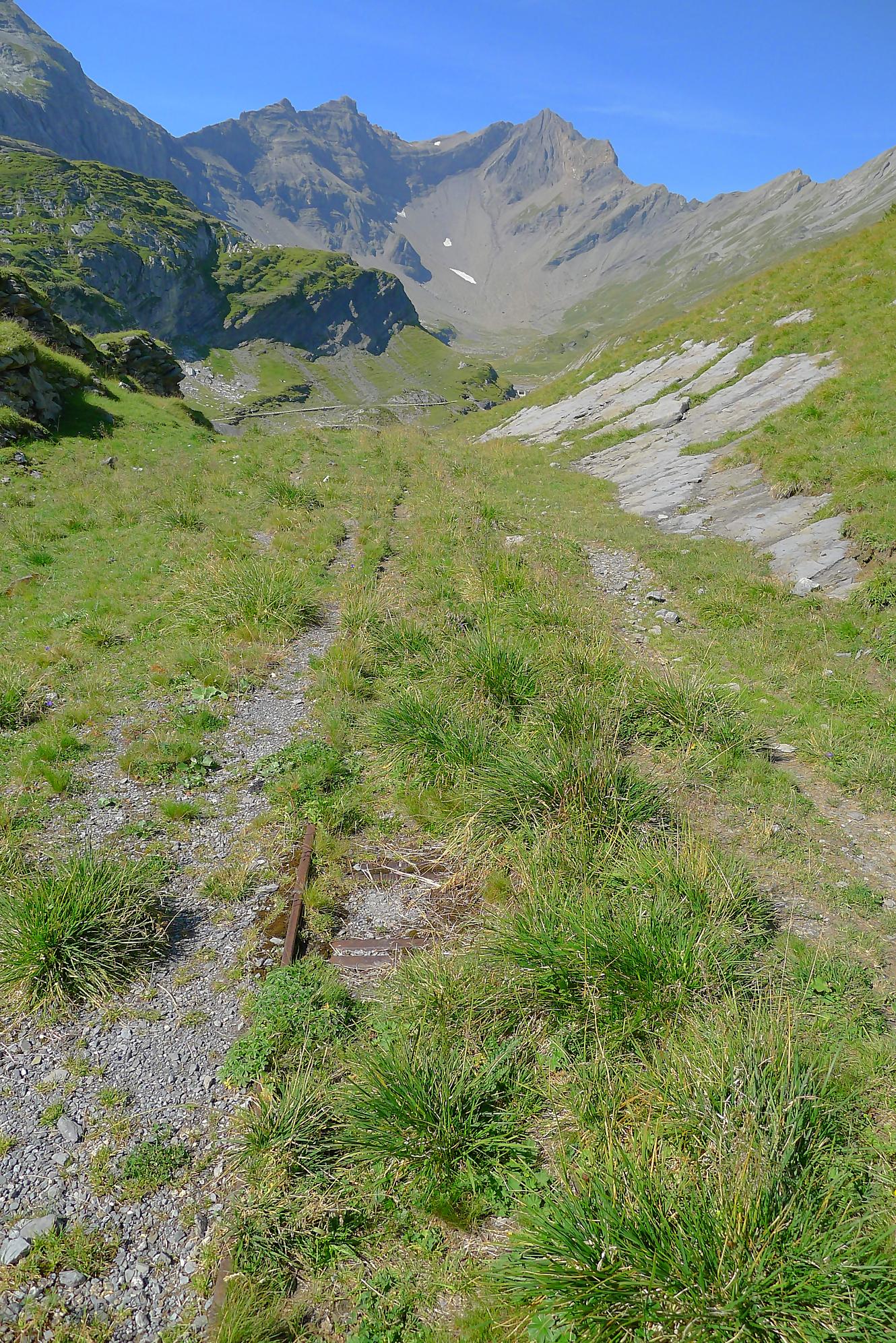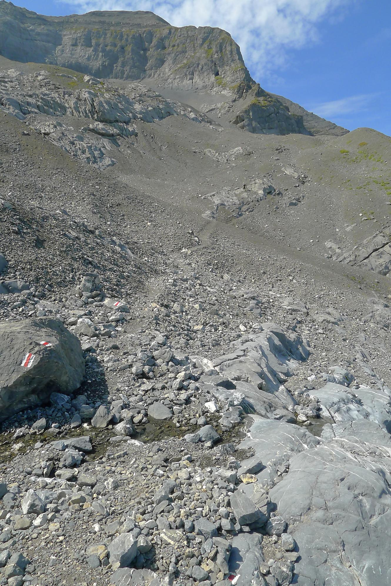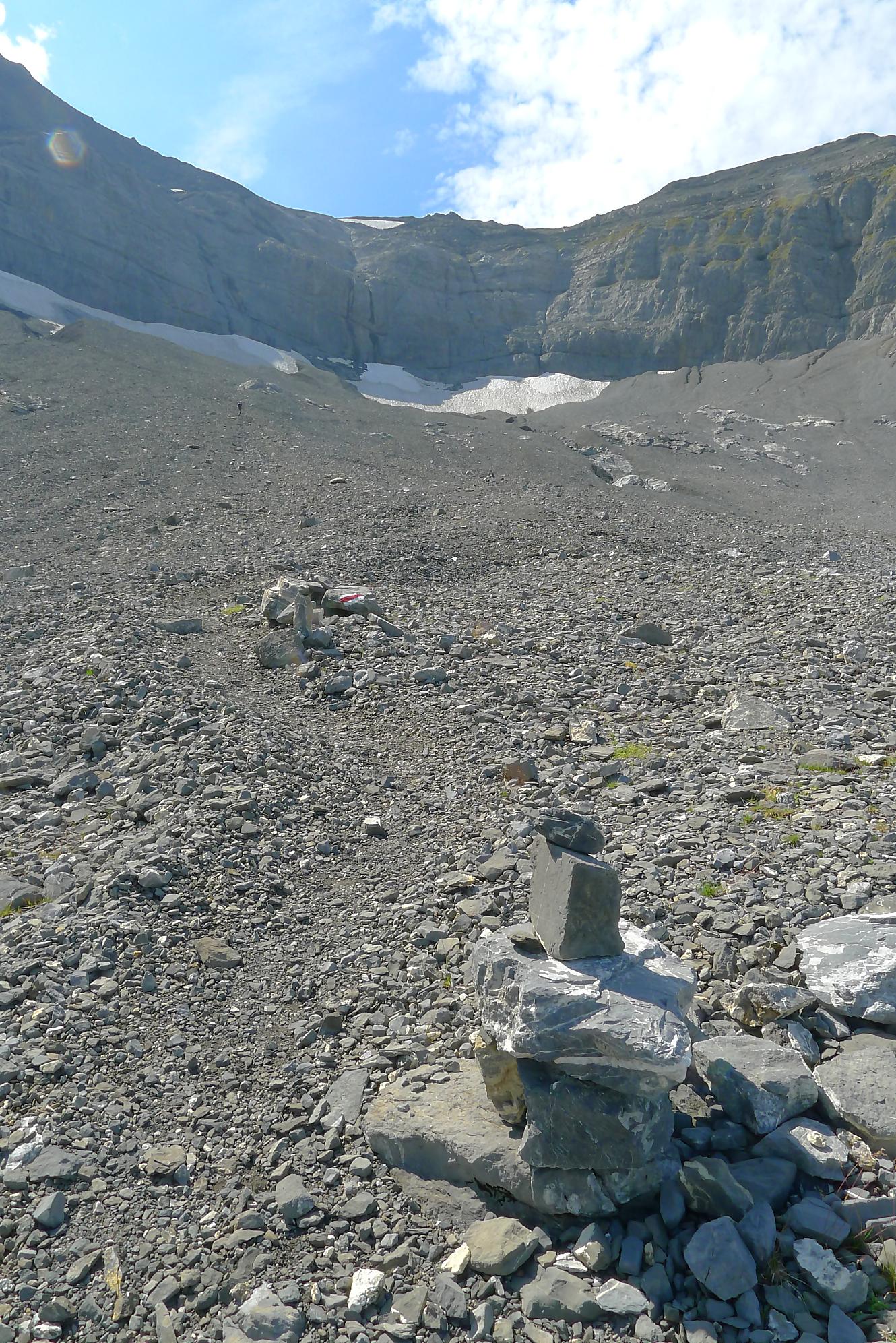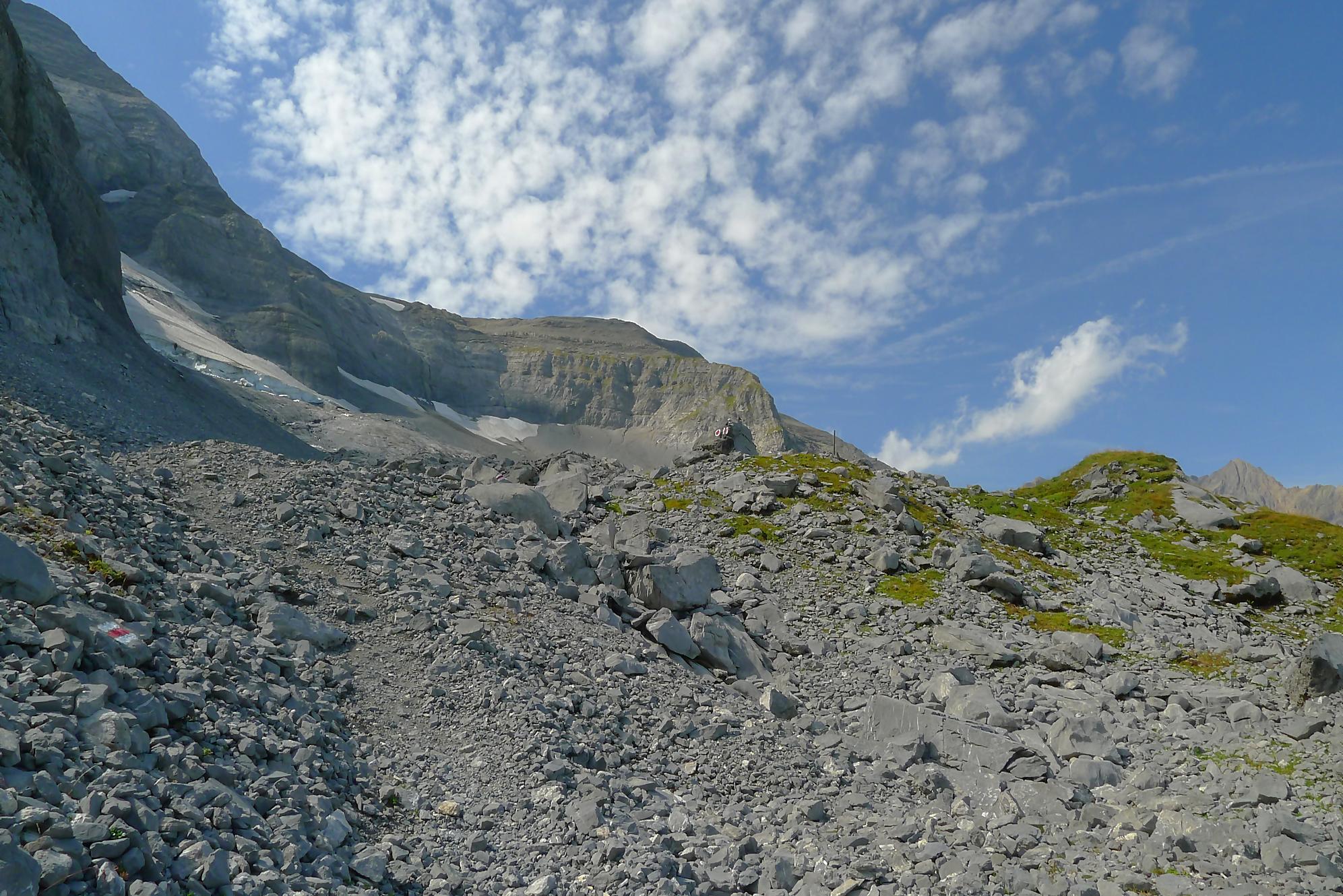 Nous arrivons au Pas d’Encel (1808m), le GPS en perd son latin, où nous retrouvons le soleil. Le chemin monte à flanc de coteau pour arriver à un col (entre le Pt1902 et Pt1964) où le chemin bifurque pour la ligne droite de la Cabane de Susanfe. Là nous décidons de couper court en hors piste, des traces nous y invitant ainsi que le profil. Le chemin officiel bifurque plus loin au Pt1964 et passe par la Station de Pompage. Pour nous, nous passons devant le lac de retenue et montons au mieux (il y a un rocher avec un marquage blanc). Nous retrouvons le chemin officiel vers 1960m. Le sentier est caillouteux et roulant, sauf que mon corps luttant avec acharnement contre le virus, mon énergie p’en trouve amoindrie et j’ai le souffle court, je n’arrive plus à suivre Christian.