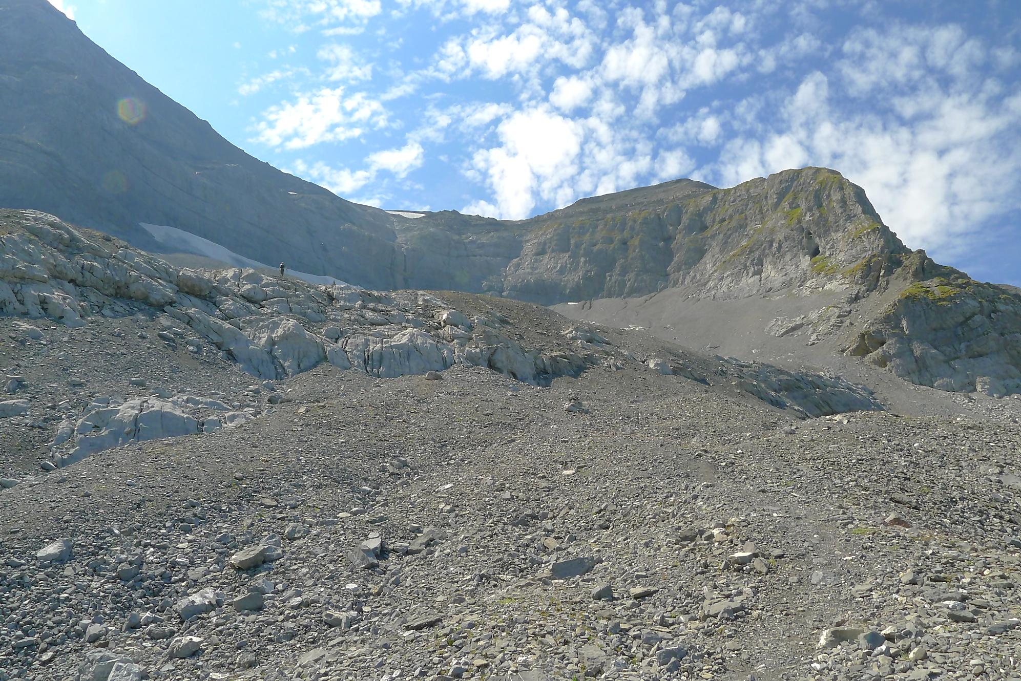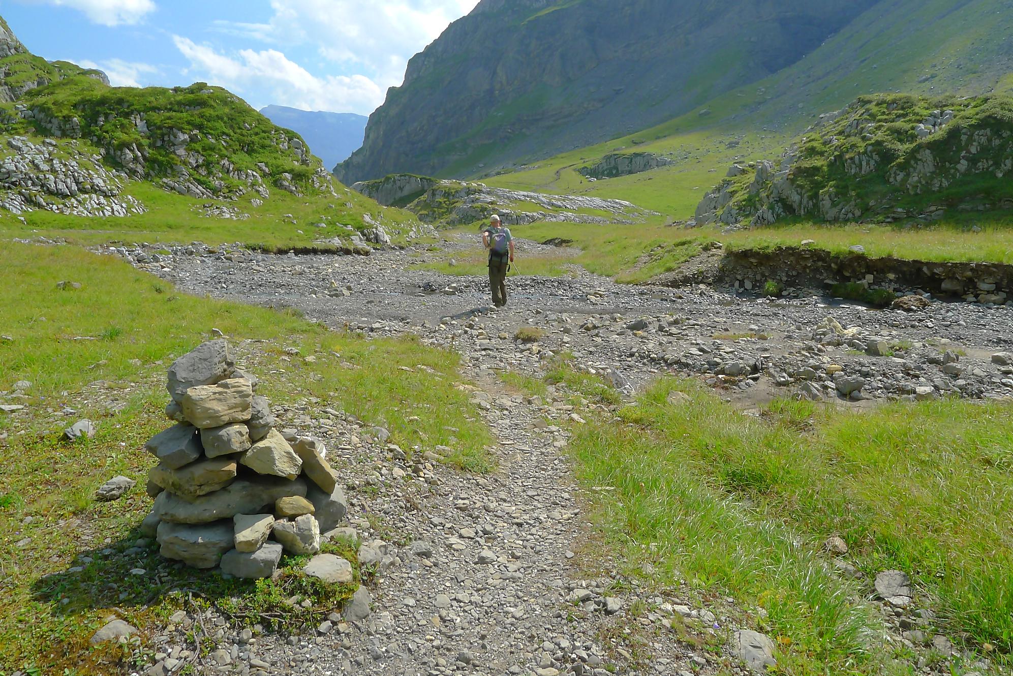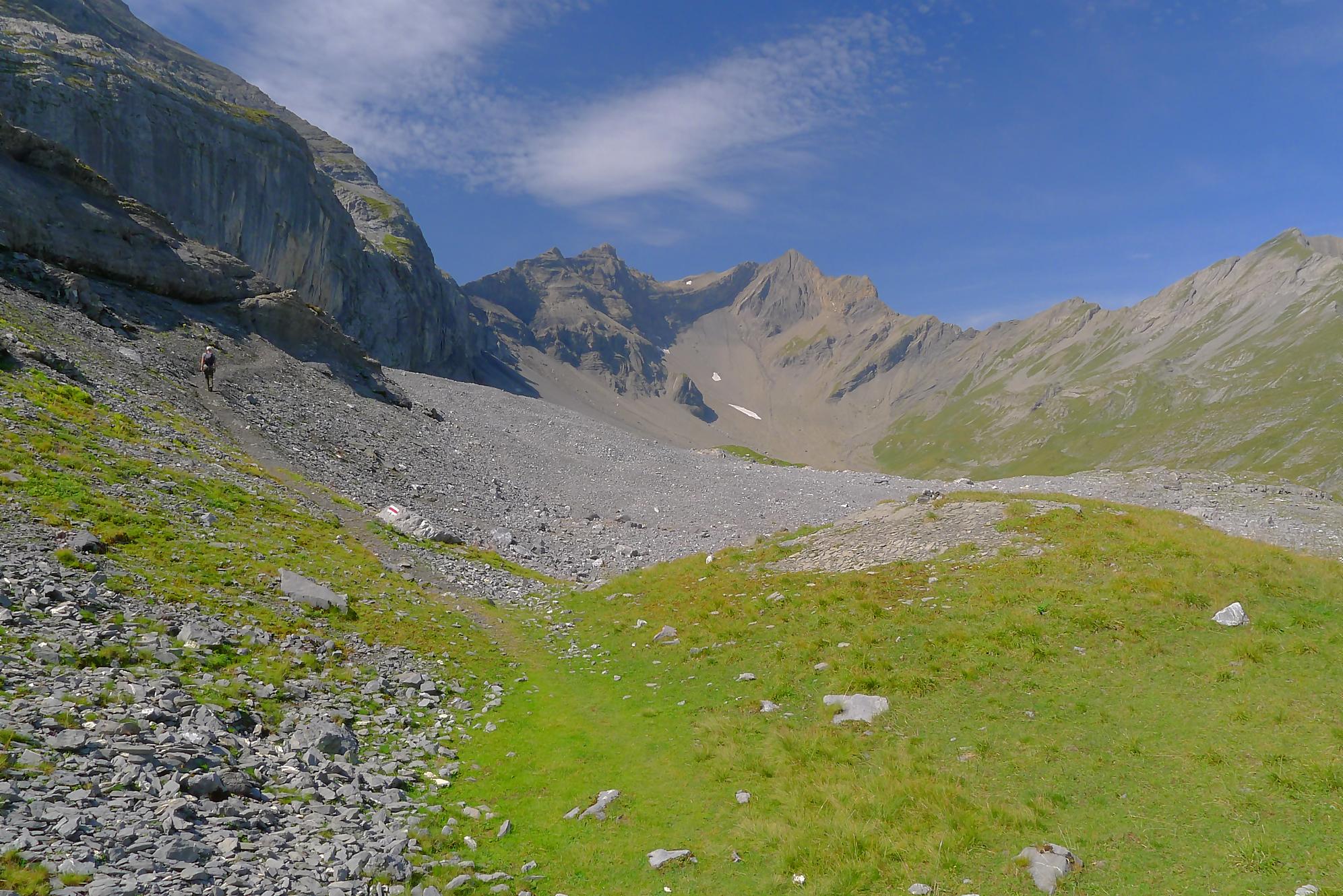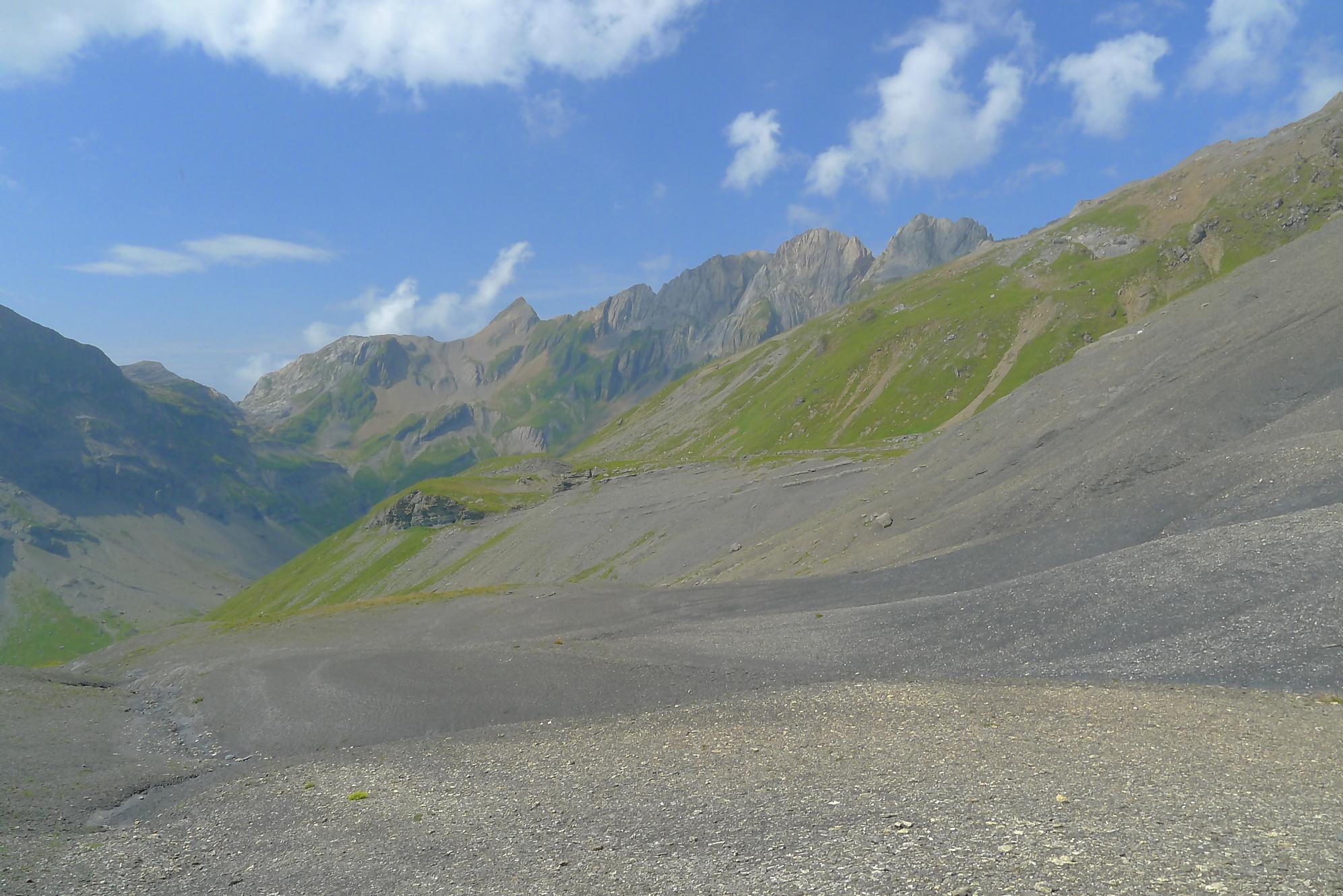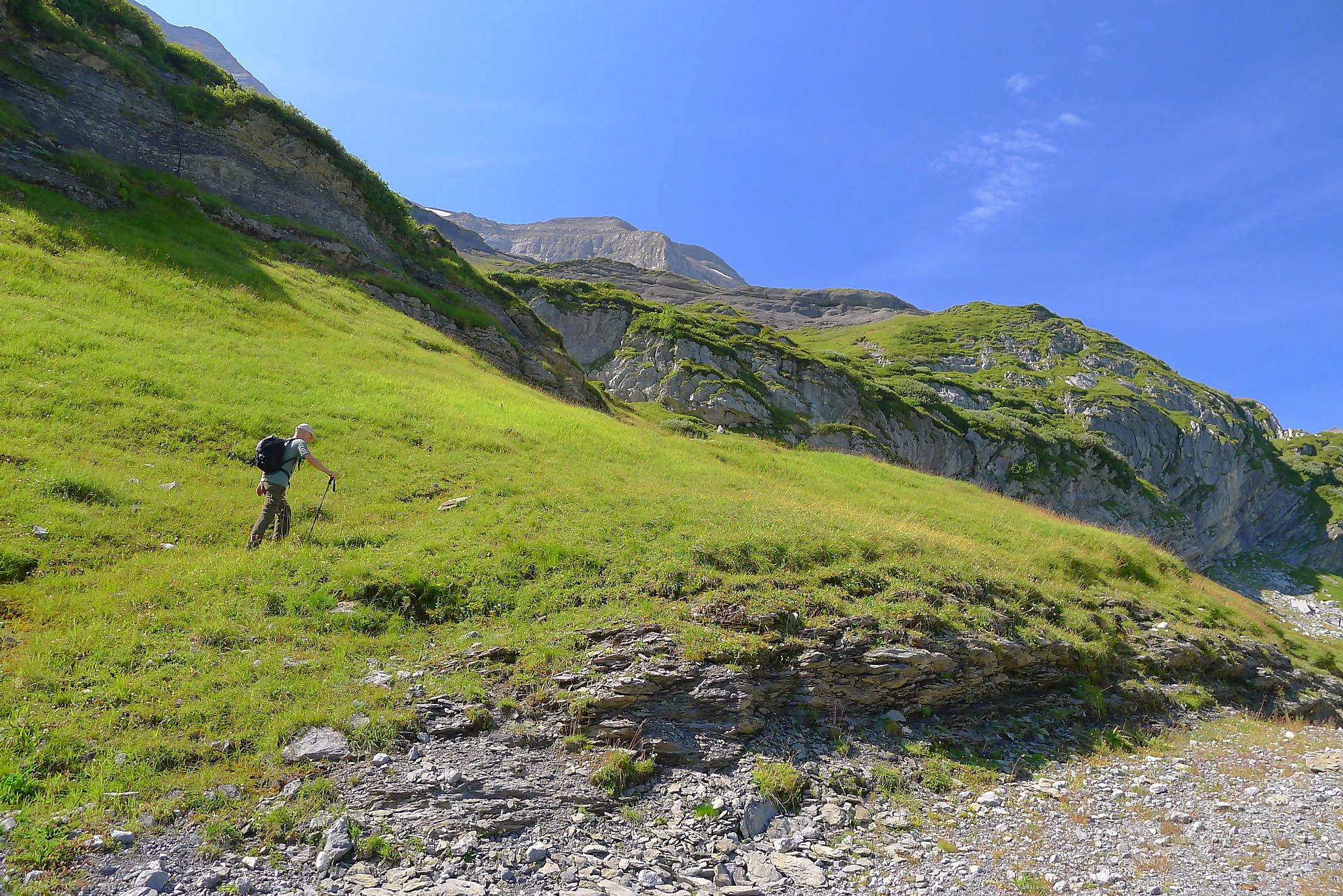 Nous arrivons au Pas d’Encel (1808m), le GPS en perd son latin, où nous retrouvons le soleil. Le chemin monte à flanc de coteau pour arriver à un col (entre le Pt1902 et Pt1964) où le chemin bifurque pour la ligne droite de la Cabane de Susanfe. Là nous décidons de couper court en hors piste, des traces nous y invitant ainsi que le profil. Le chemin officiel bifurque plus loin au Pt1964 et passe par la Station de Pompage. Pour nous, nous passons devant le lac de retenue et montons au mieux (il y a un rocher avec un marquage blanc). Nous retrouvons le chemin officiel vers 1960m. Le sentier est caillouteux et roulant, sauf que mon corps luttant avec acharnement contre le virus, mon énergie p’en trouve amoindrie et j’ai le souffle court, je n’arrive plus à suivre Christian.