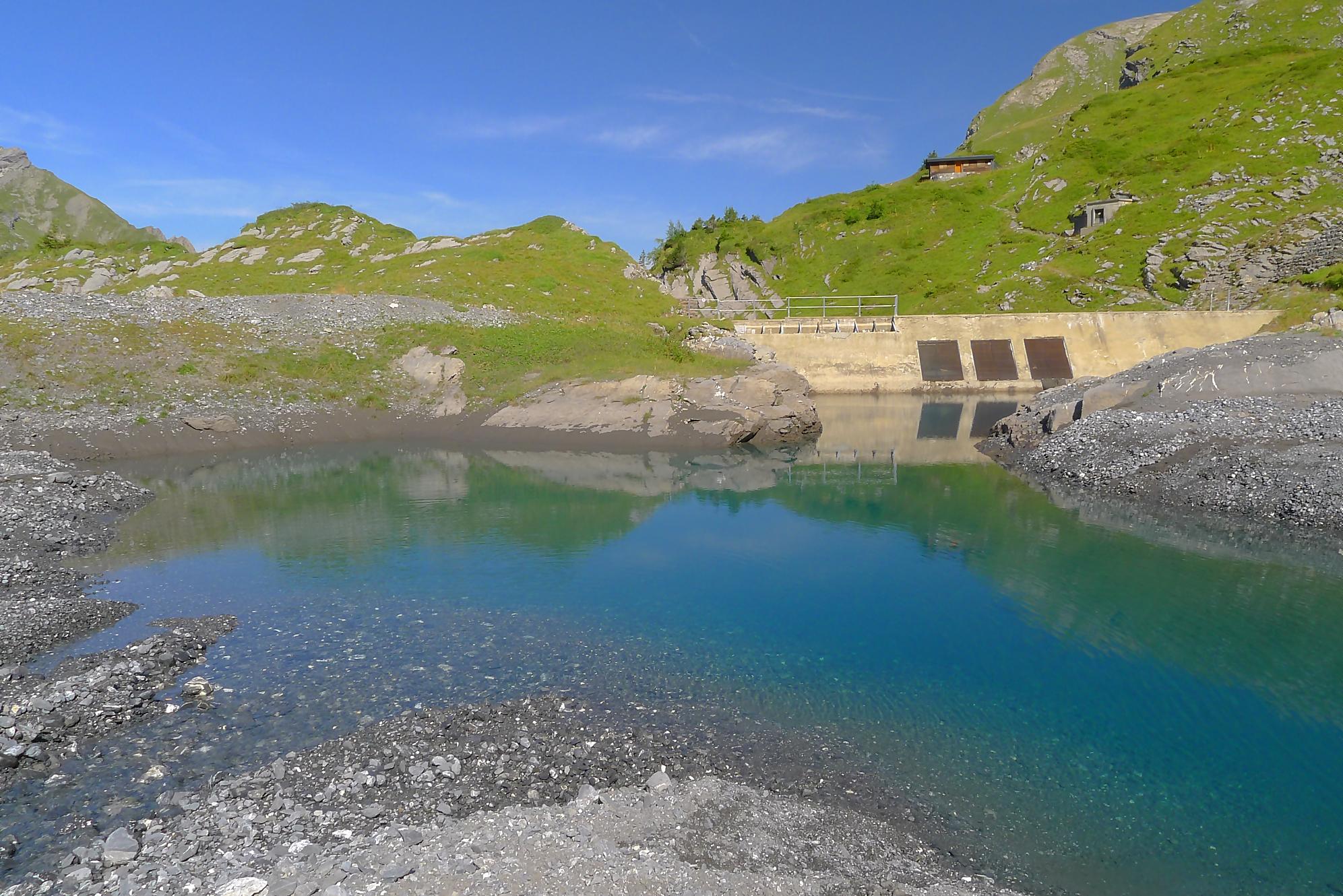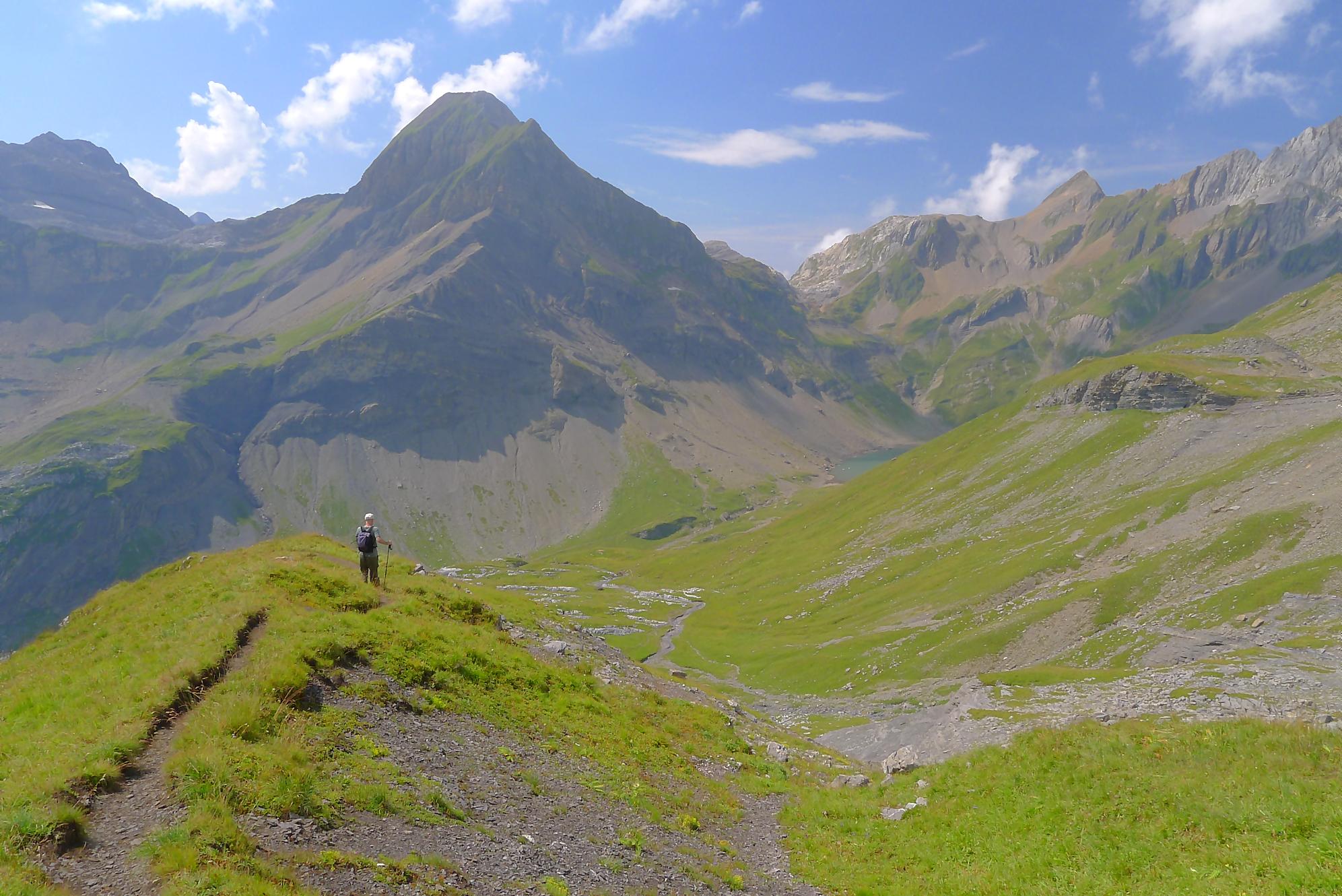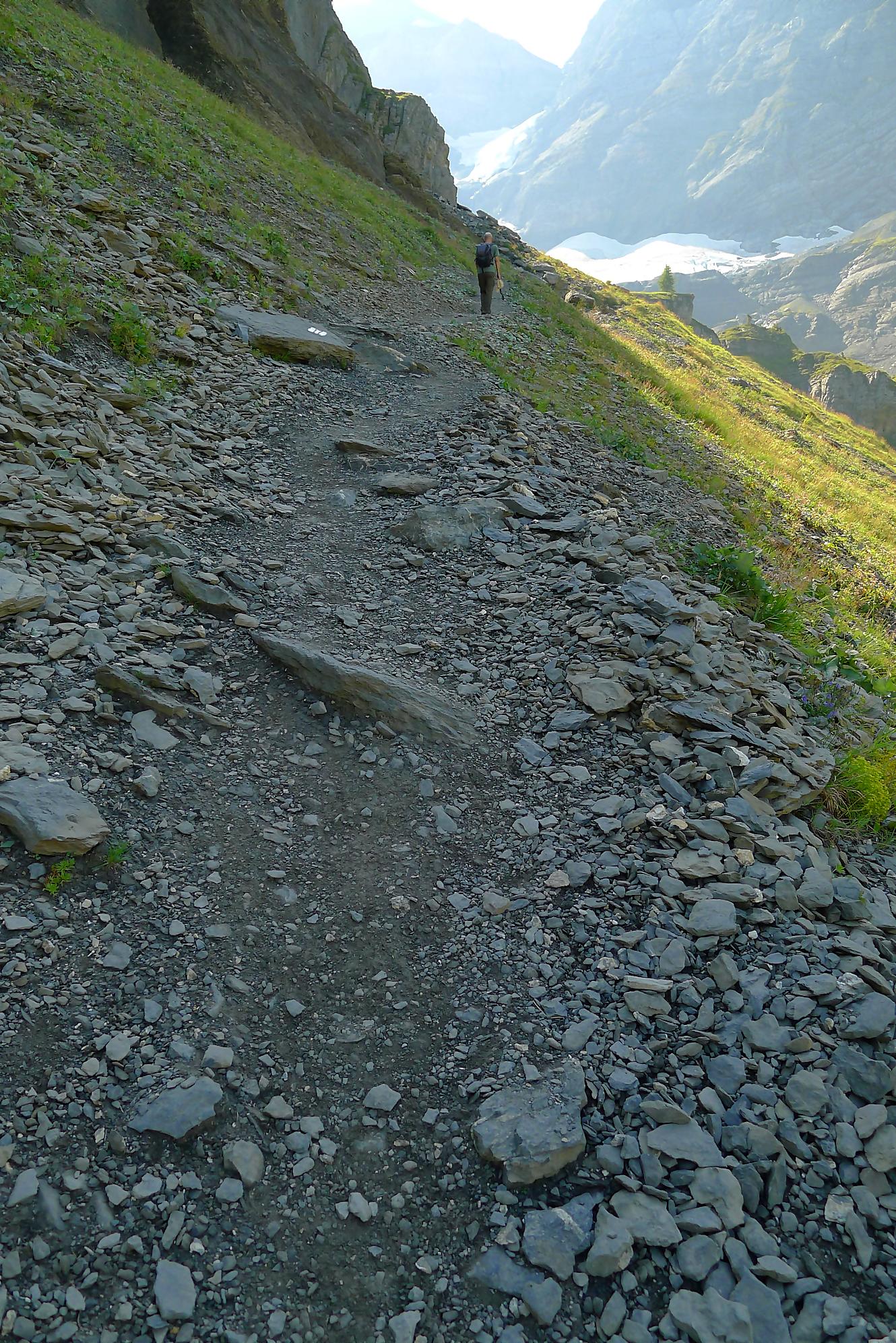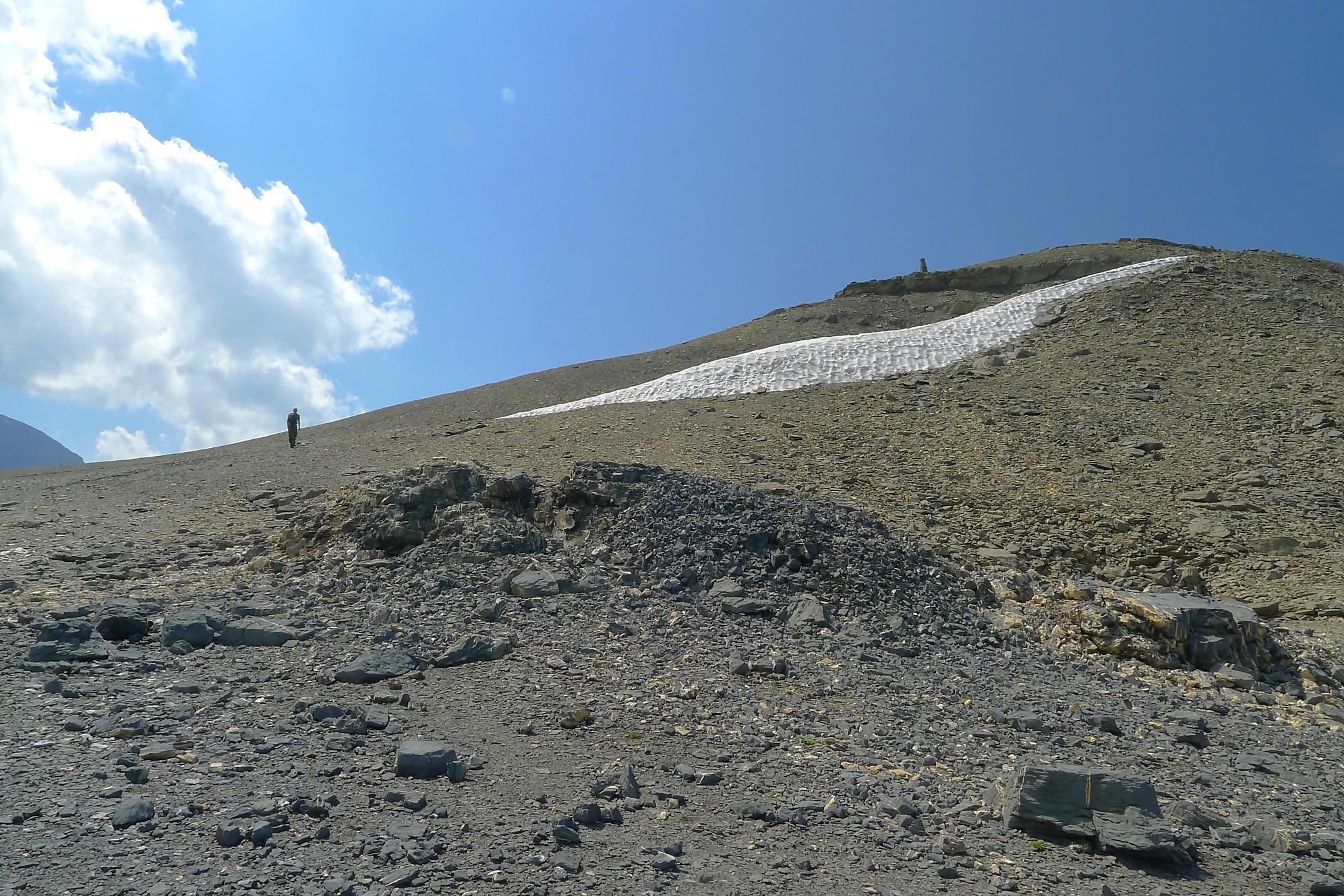 Nous arrivons au Pas d’Encel (1808m), le GPS en perd son latin, où nous retrouvons le soleil. Le chemin monte à flanc de coteau pour arriver à un col (entre le Pt1902 et Pt1964) où le chemin bifurque pour la ligne droite de la Cabane de Susanfe. Là nous décidons de couper court en hors piste, des traces nous y invitant ainsi que le profil. Le chemin officiel bifurque plus loin au Pt1964 et passe par la Station de Pompage. Pour nous, nous passons devant le lac de retenue et montons au mieux (il y a un rocher avec un marquage blanc). Nous retrouvons le chemin officiel vers 1960m. Le sentier est caillouteux et roulant, sauf que mon corps luttant avec acharnement contre le virus, mon énergie p’en trouve amoindrie et j’ai le souffle court, je n’arrive plus à suivre Christian.