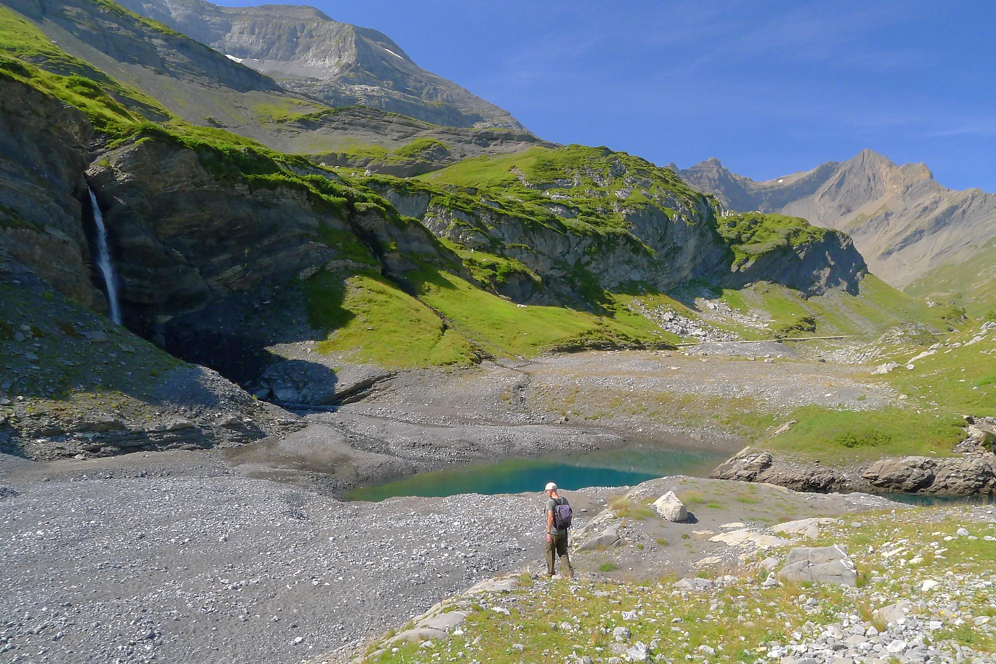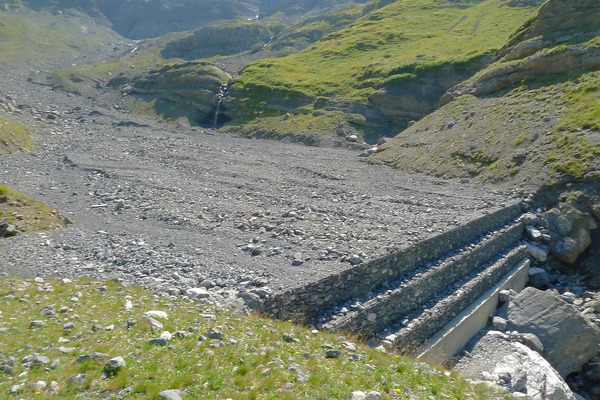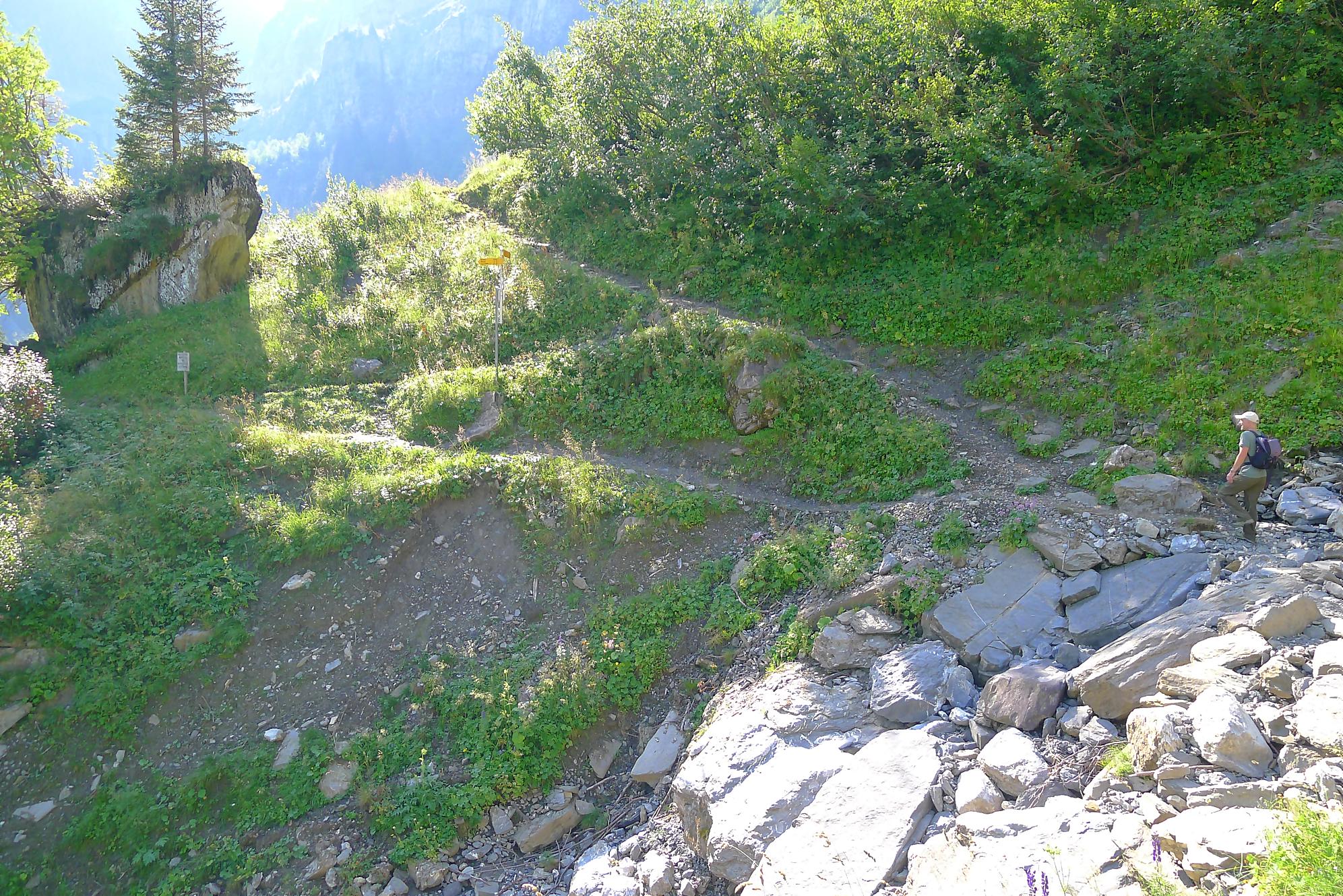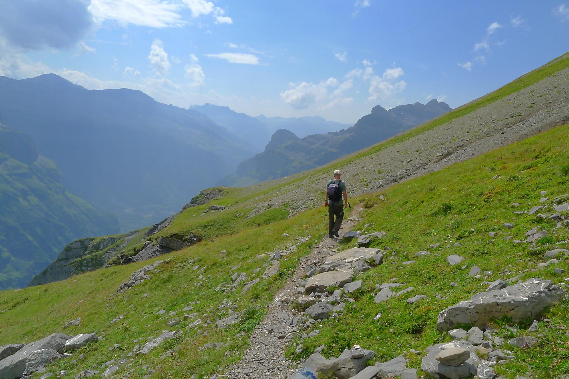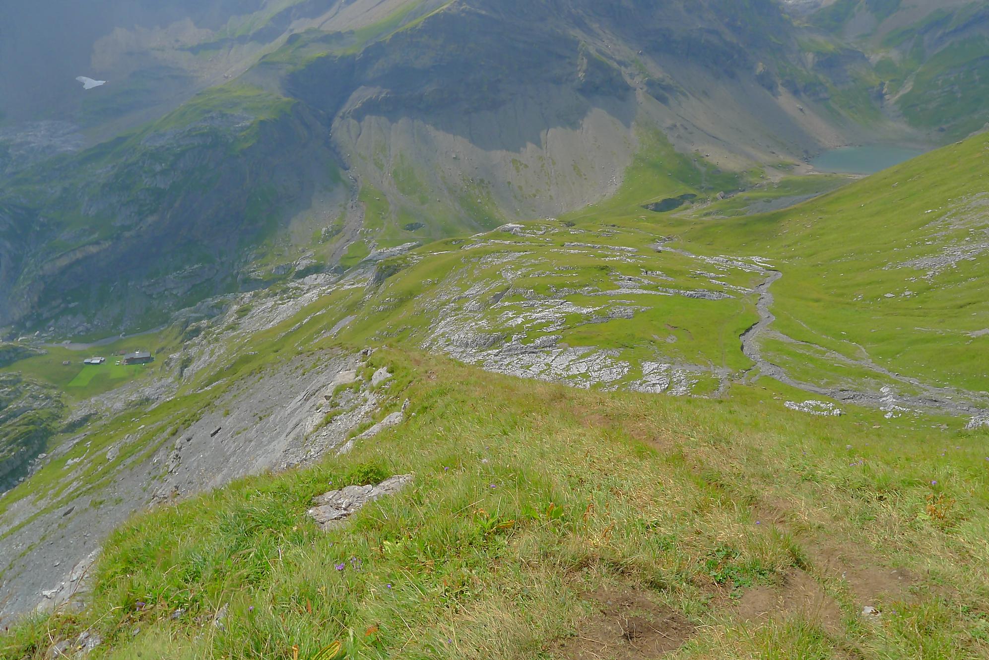 Nous arrivons au Pas d’Encel (1808m), le GPS en perd son latin, où nous retrouvons le soleil. Le chemin monte à flanc de coteau pour arriver à un col (entre le Pt1902 et Pt1964) où le chemin bifurque pour la ligne droite de la Cabane de Susanfe. Là nous décidons de couper court en hors piste, des traces nous y invitant ainsi que le profil. Le chemin officiel bifurque plus loin au Pt1964 et passe par la Station de Pompage. Pour nous, nous passons devant le lac de retenue et montons au mieux (il y a un rocher avec un marquage blanc). Nous retrouvons le chemin officiel vers 1960m. Le sentier est caillouteux et roulant, sauf que mon corps luttant avec acharnement contre le virus, mon énergie p’en trouve amoindrie et j’ai le souffle court, je n’arrive plus à suivre Christian.