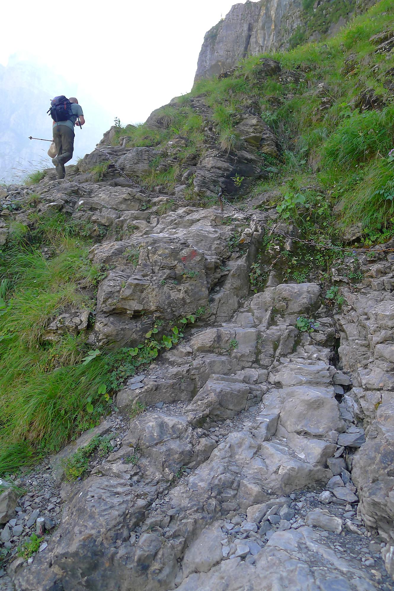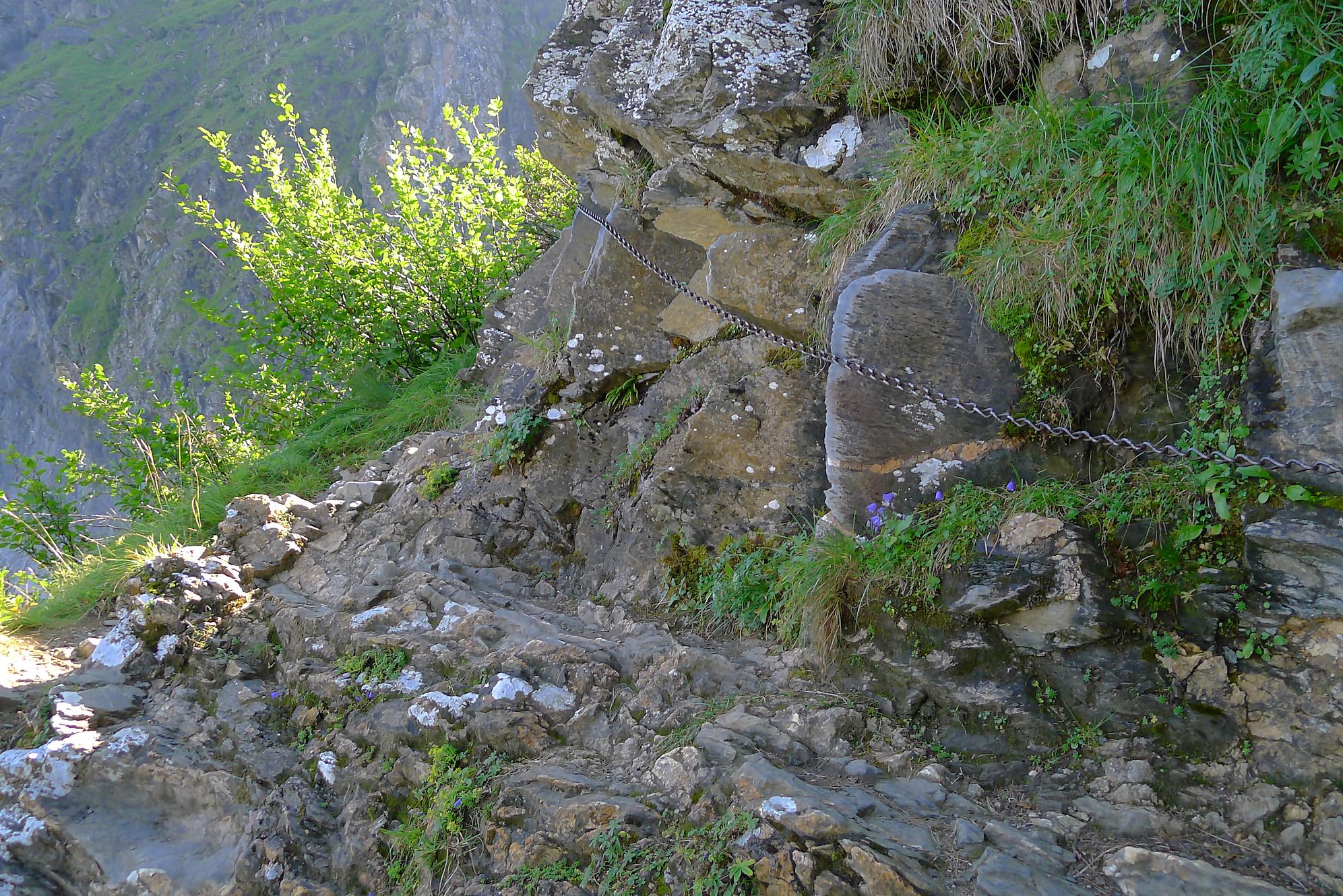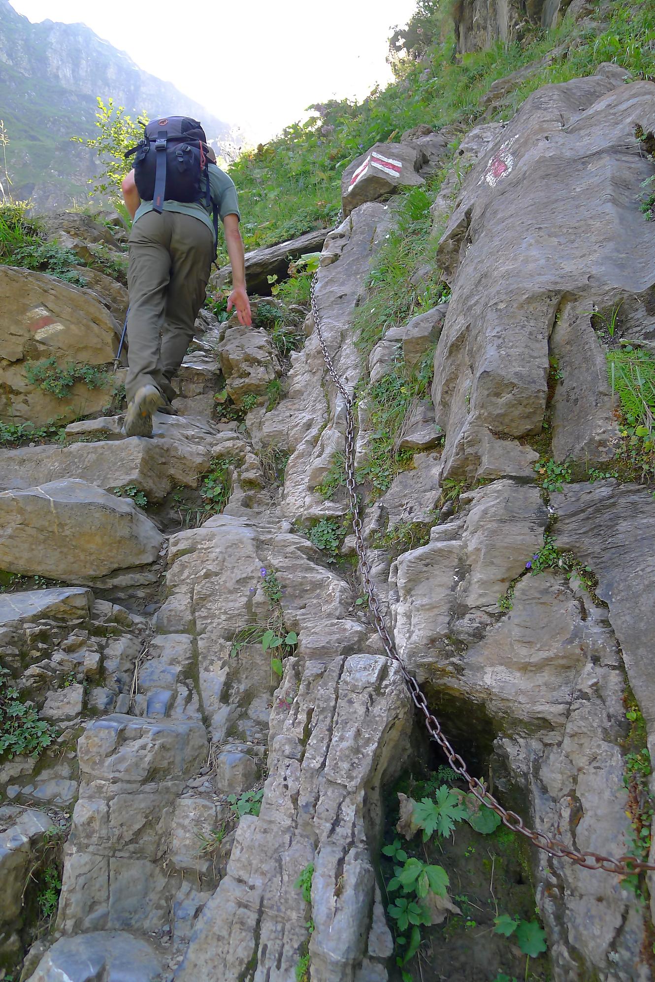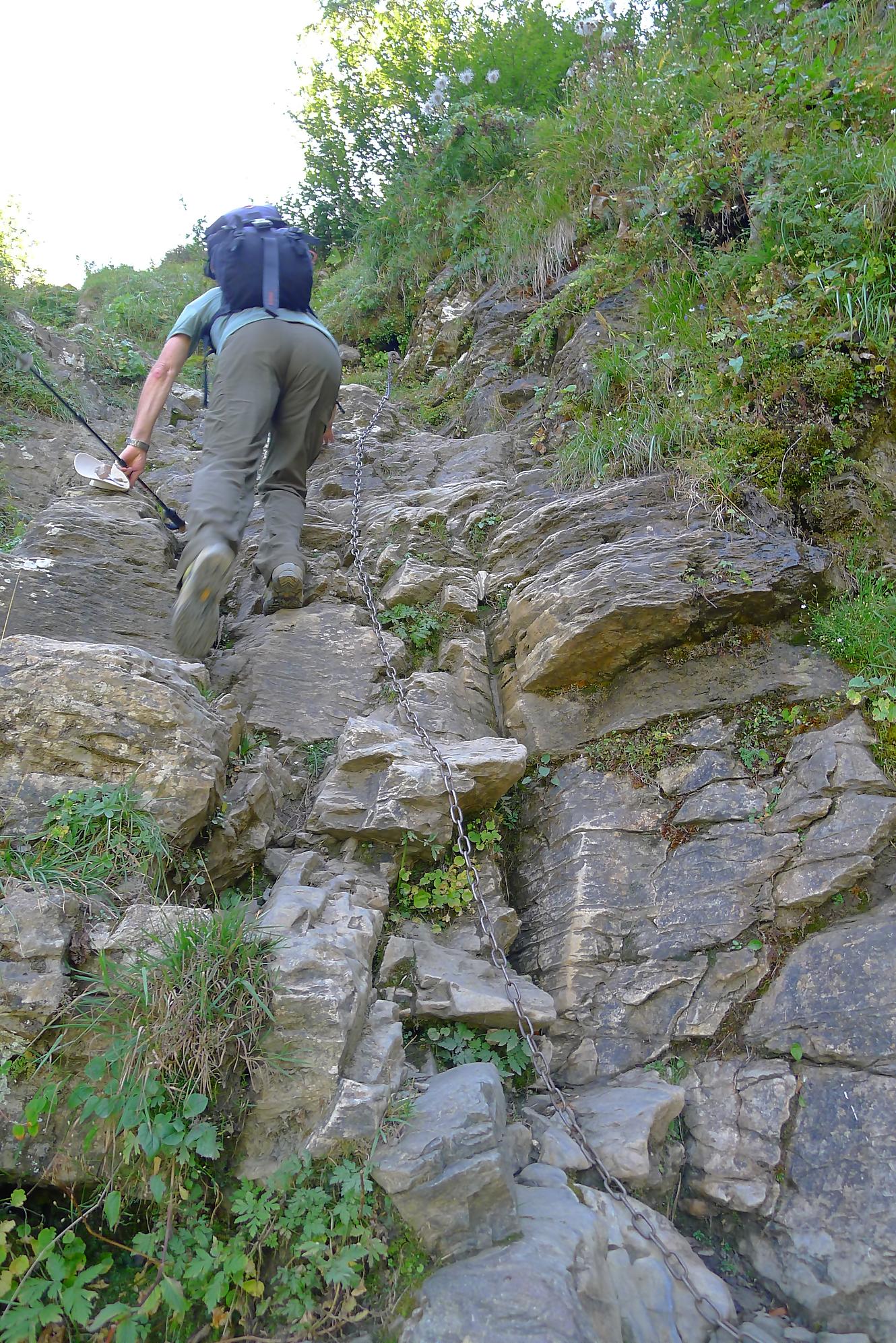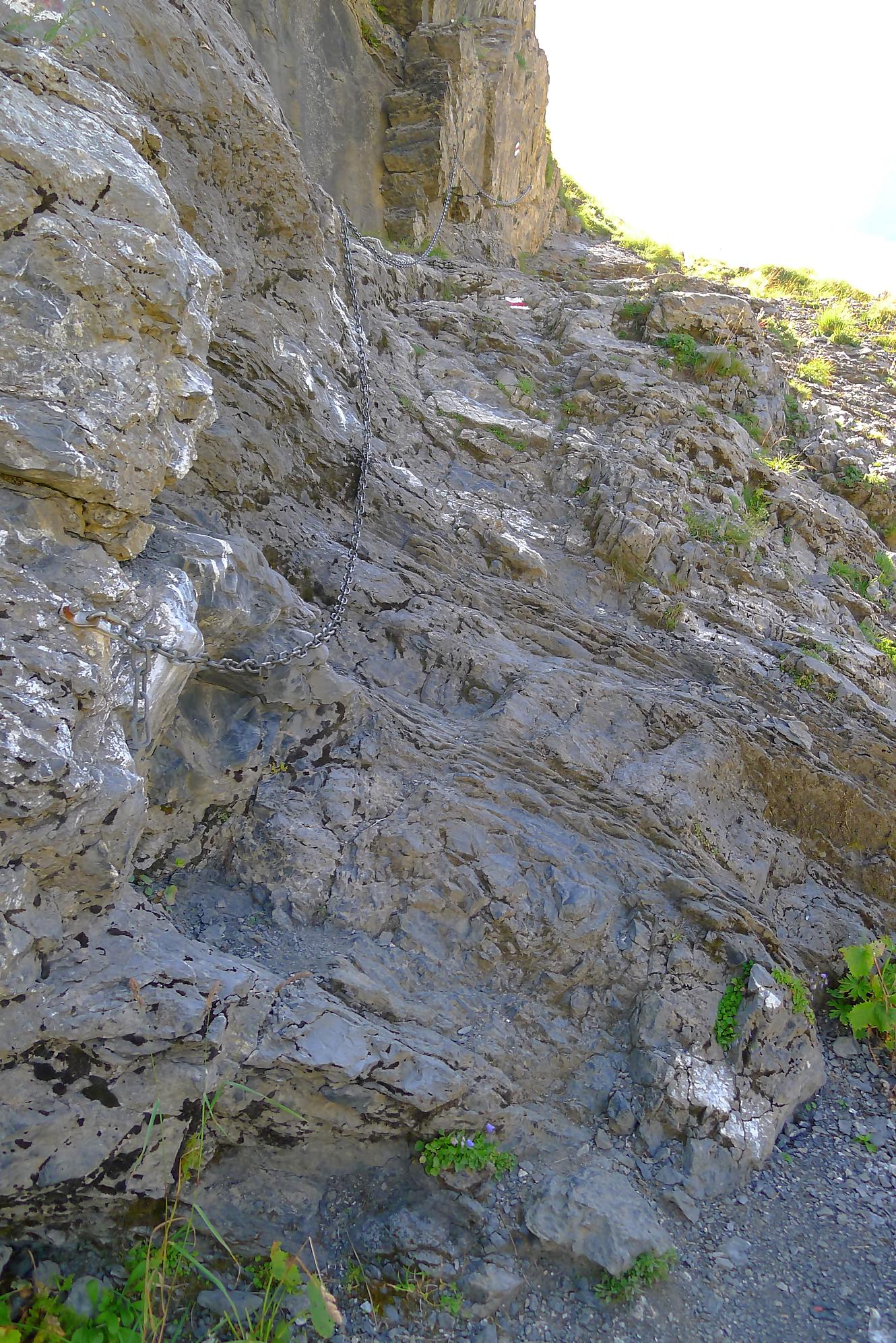 Christian retrouve une ancienne connaissance à cette buvette puis nous repartons pour le Pas d’Encel, premier passage clef de la journée. Le chemin s’étire à flanc de coteau pour monter brusquement depuis le Pt1542. Ensuite en plus régulière, à flanc de coteau, un zeste aérien, nous passons les différentes chaines avant le Pas d’Encel. Ce sont des pas de I, équipés de chaines (pour avoir fait ce passage par temps humide, je les avais aimées). Il n’y a pas de difficultés techniques, sinon de savoir bien poser son pied sur les cailloux et de ne pas souffrir intensément du vide (c’est un devers, il n’y a pas de passage vertigineux).