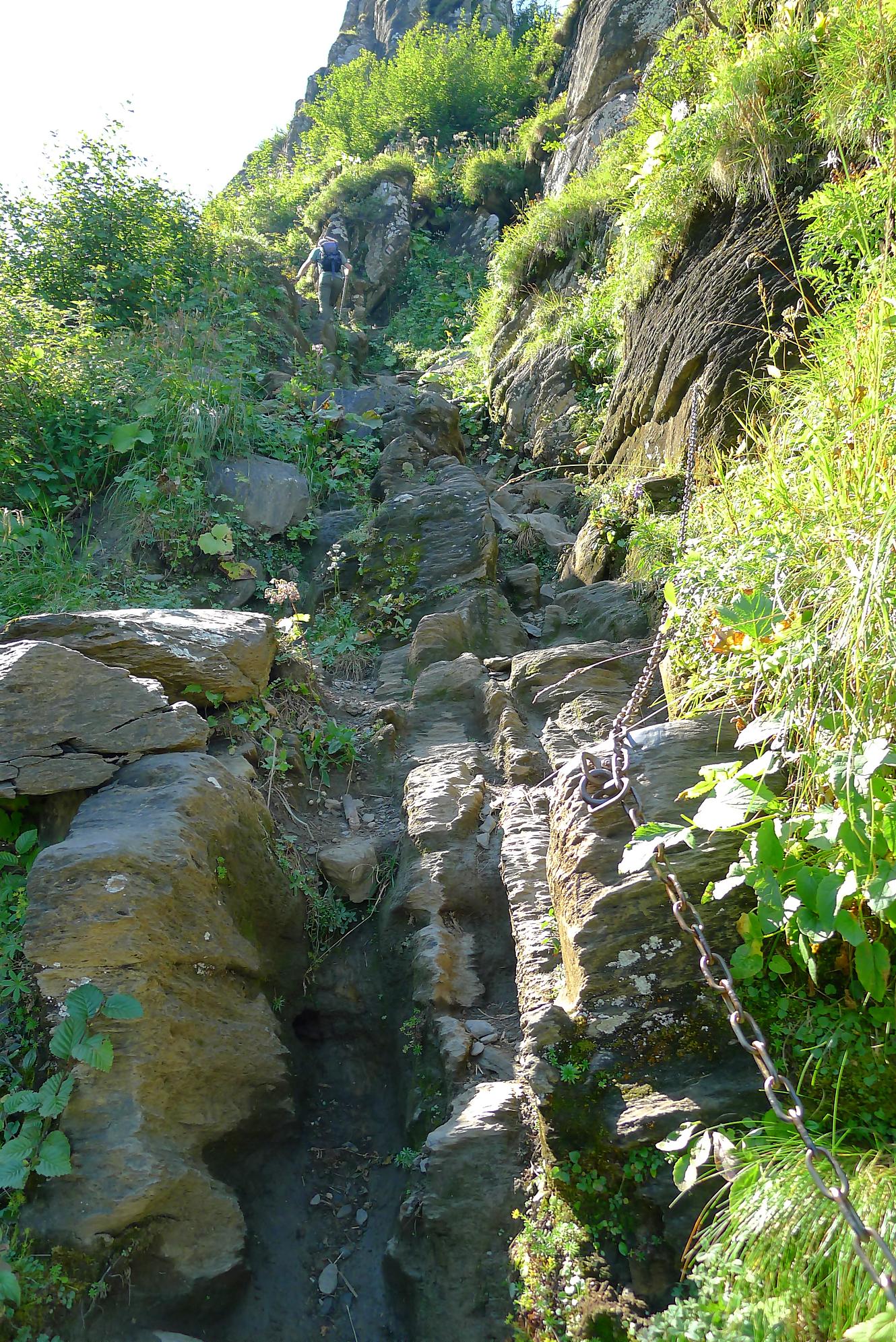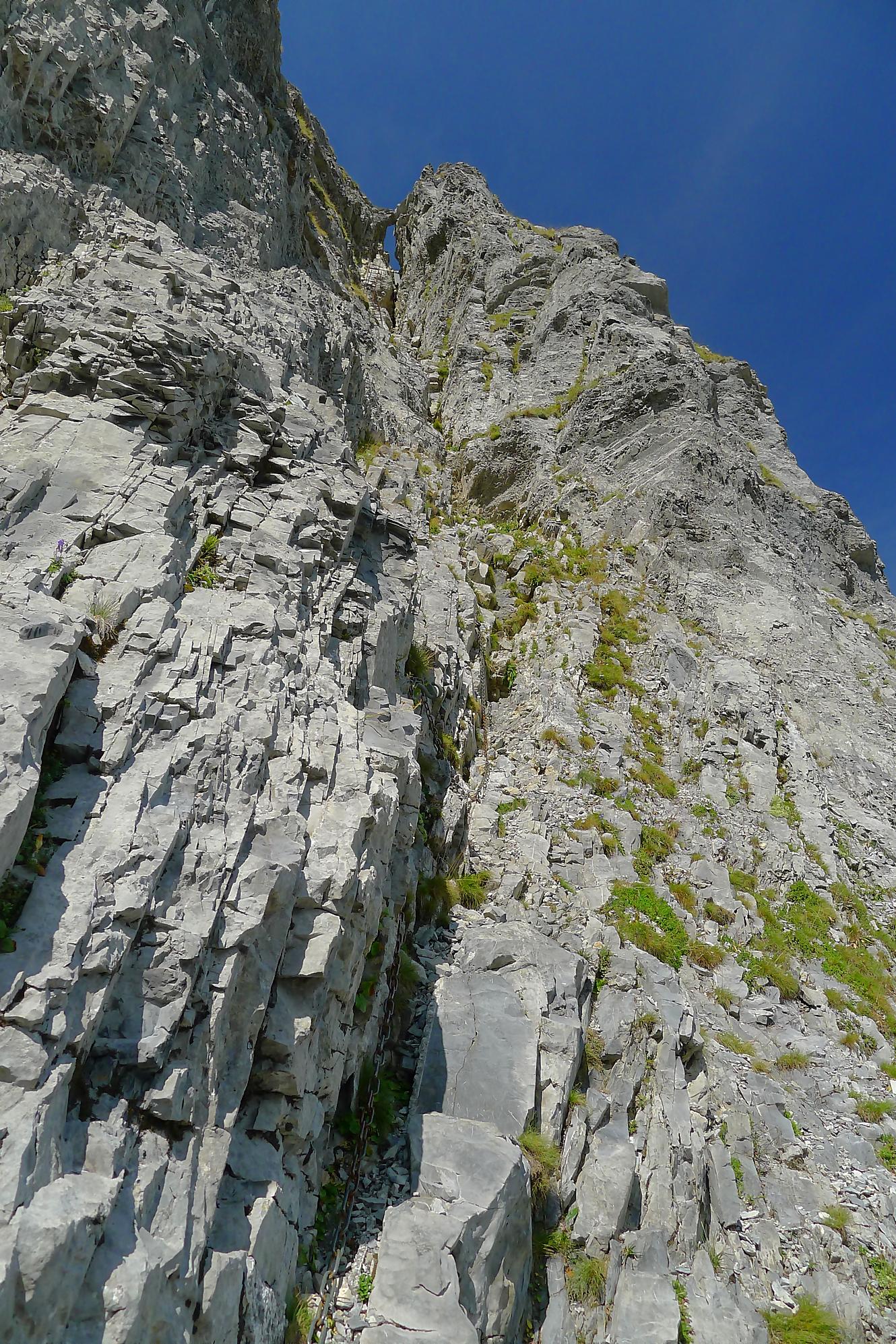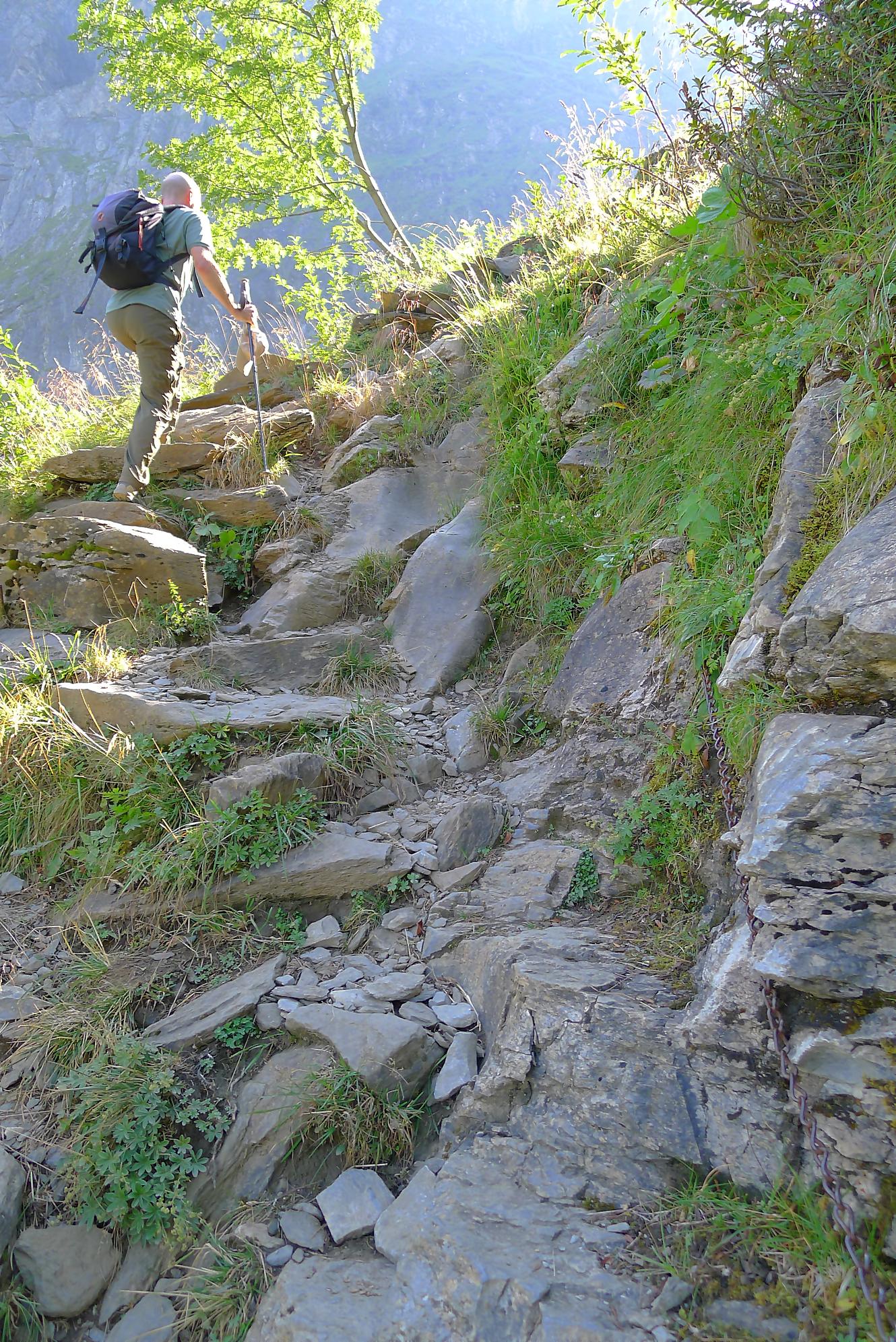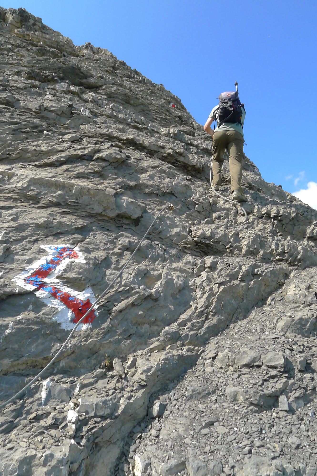 Christian retrouve une ancienne connaissance à cette buvette puis nous repartons pour le Pas d’Encel, premier passage clef de la journée. Le chemin s’étire à flanc de coteau pour monter brusquement depuis le Pt1542. Ensuite en plus régulière, à flanc de coteau, un zeste aérien, nous passons les différentes chaines avant le Pas d’Encel. Ce sont des pas de I, équipés de chaines (pour avoir fait ce passage par temps humide, je les avais aimées). Il n’y a pas de difficultés techniques, sinon de savoir bien poser son pied sur les cailloux et de ne pas souffrir intensément du vide (c’est un devers, il n’y a pas de passage vertigineux).
