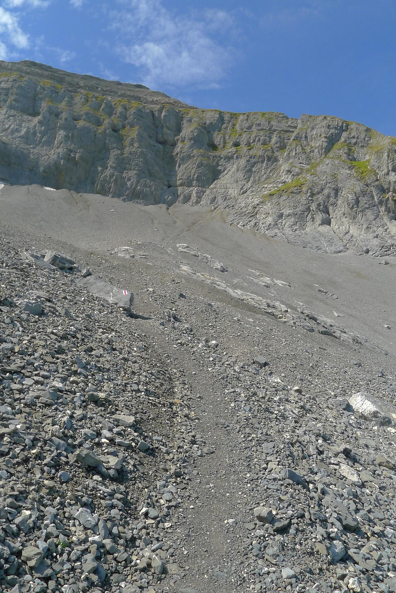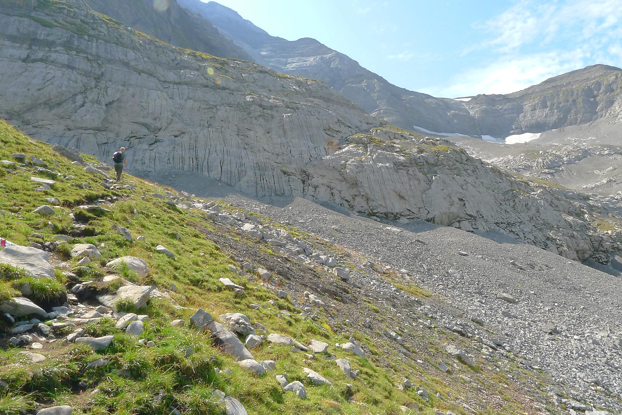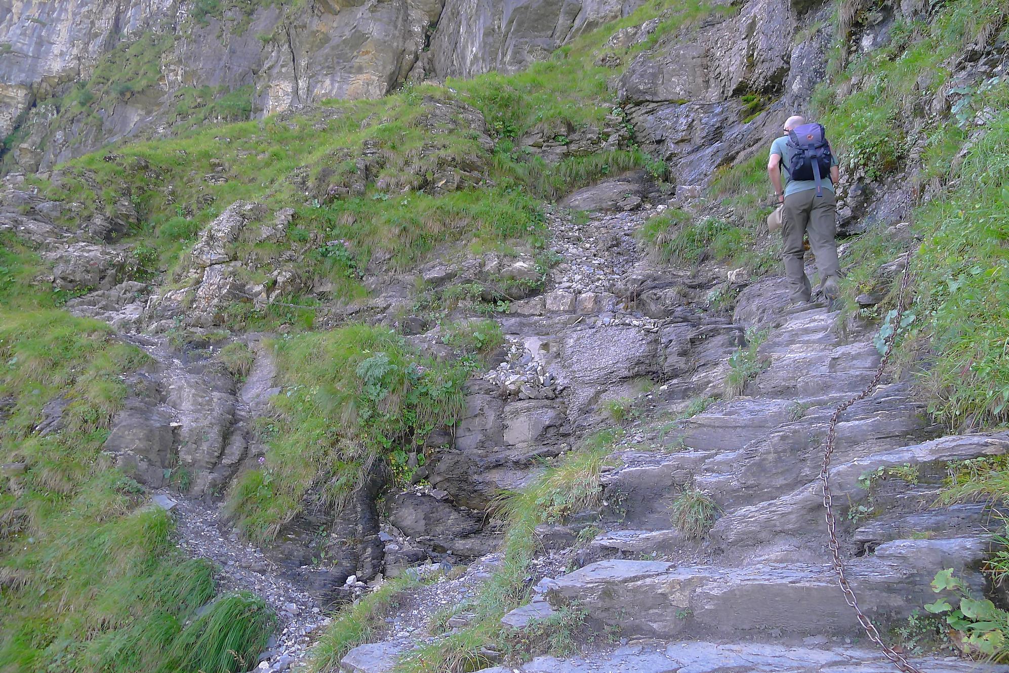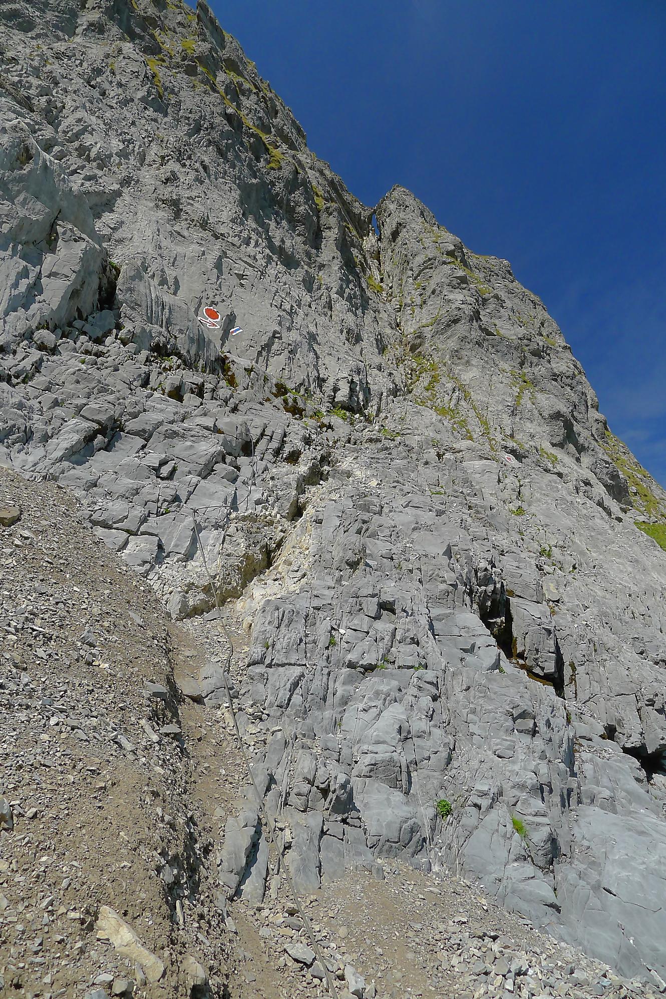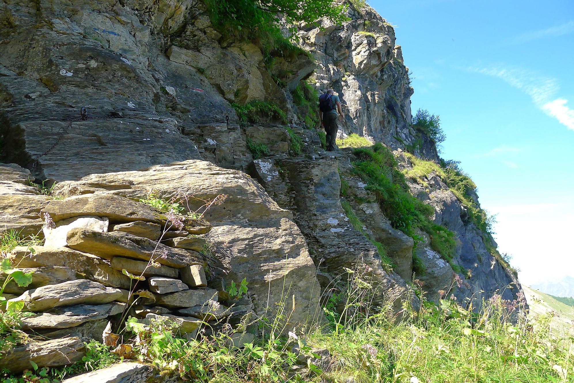Christian retrouve une ancienne connaissance à cette buvette puis nous repartons pour le Pas d’Encel, premier passage clef de la journée. Le chemin s’étire à flanc de coteau pour monter brusquement depuis le Pt1542. Ensuite en plus régulière, à flanc de coteau, un zeste aérien, nous passons les différentes chaines avant le Pas d’Encel. Ce sont des pas de I, équipés de chaines (pour avoir fait ce passage par temps humide, je les avais aimées). Il n’y a pas de difficultés techniques, sinon de savoir bien poser son pied sur les cailloux et de ne pas souffrir intensément du vide (c’est un devers, il n’y a pas de passage vertigineux).