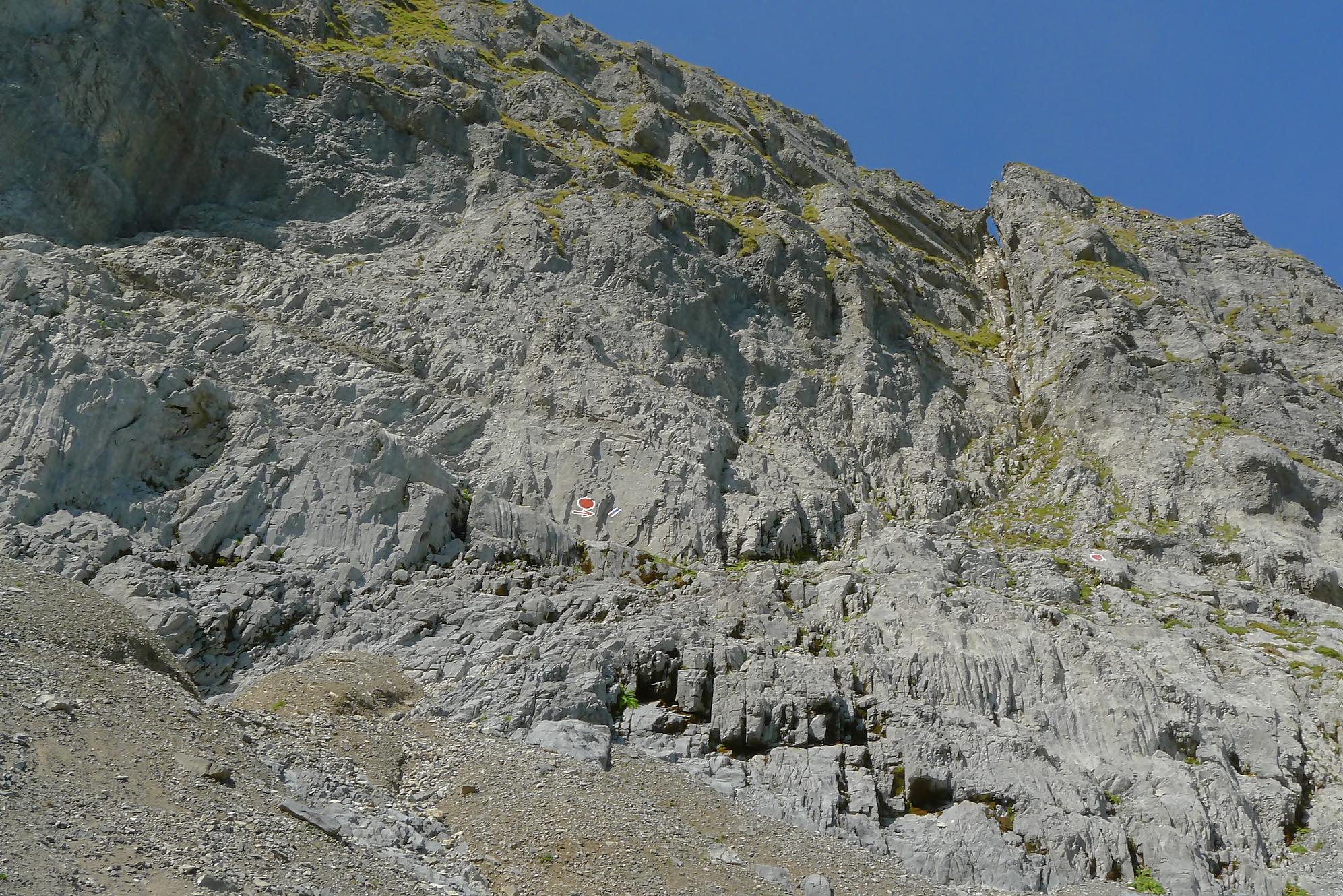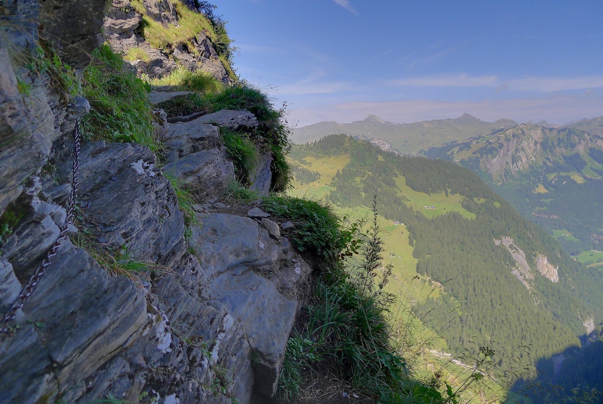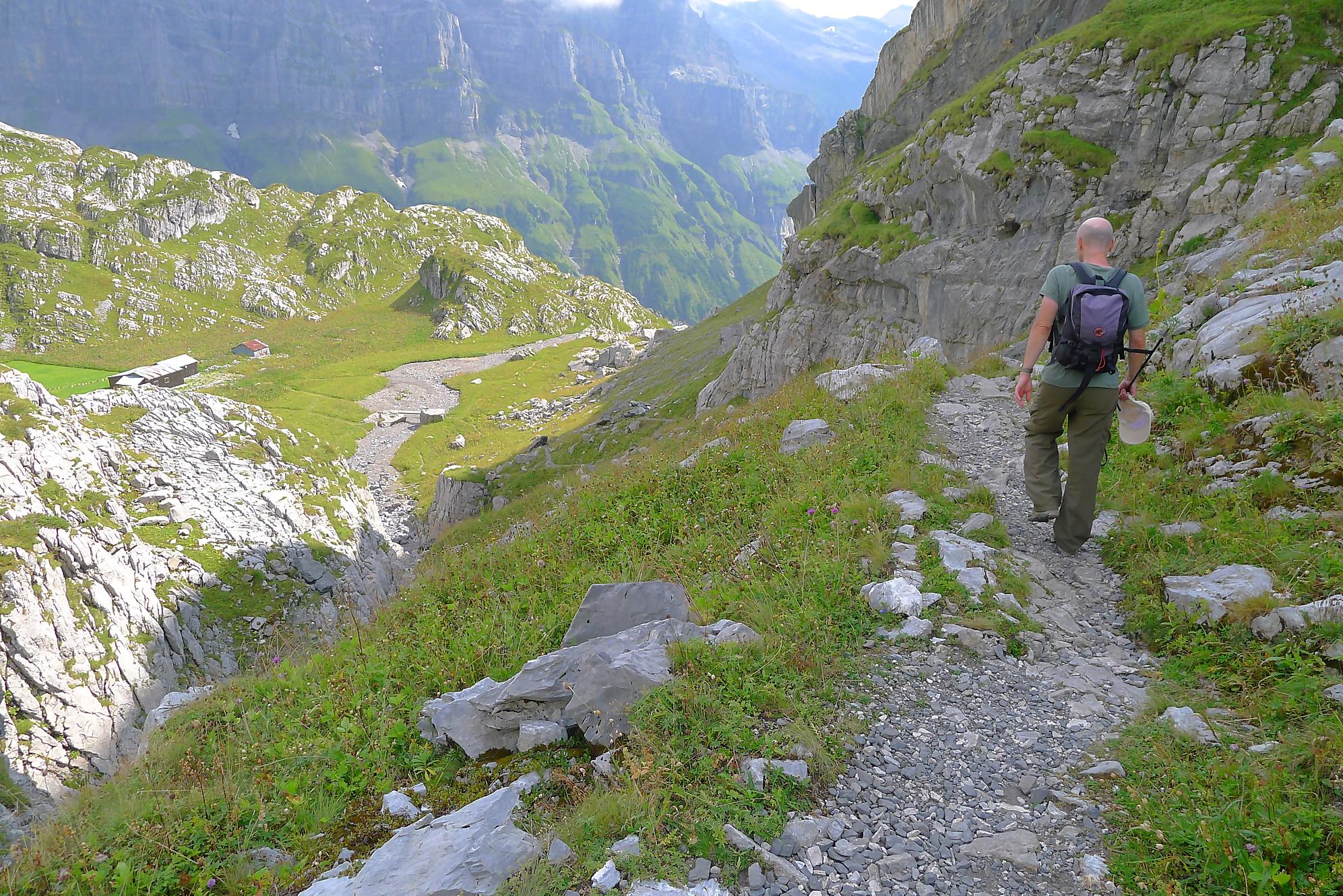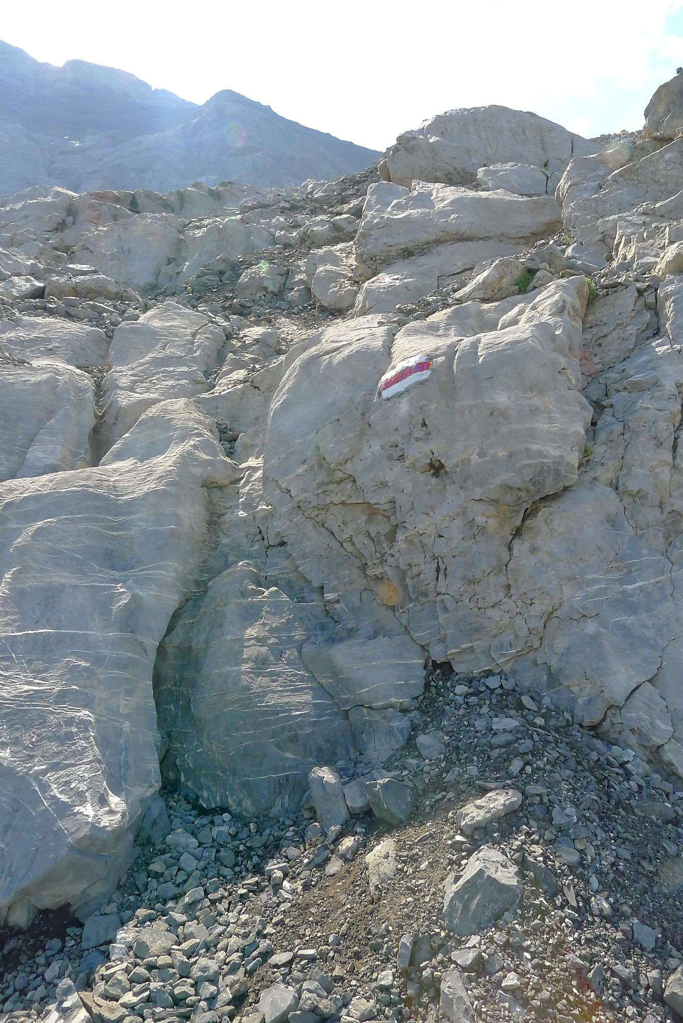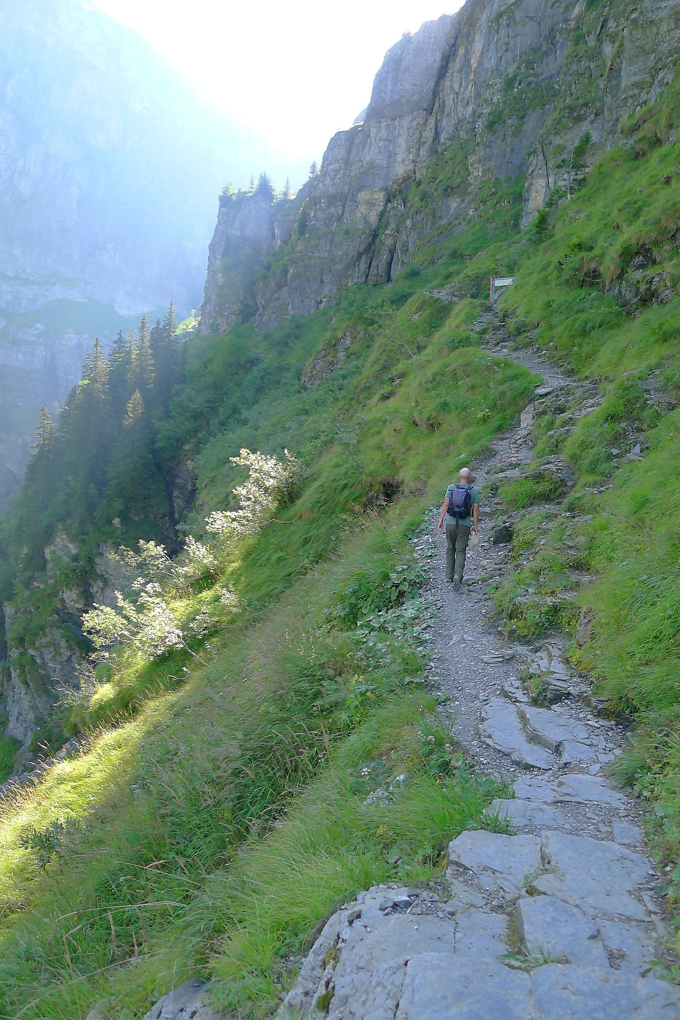 Christian retrouve une ancienne connaissance à cette buvette puis nous repartons pour le Pas d’Encel, premier passage clef de la journée. Le chemin s’étire à flanc de coteau pour monter brusquement depuis le Pt1542. Ensuite en plus régulière, à flanc de coteau, un zeste aérien, nous passons les différentes chaines avant le Pas d’Encel. Ce sont des pas de I, équipés de chaines (pour avoir fait ce passage par temps humide, je les avais aimées). Il n’y a pas de difficultés techniques, sinon de savoir bien poser son pied sur les cailloux et de ne pas souffrir intensément du vide (c’est un devers, il n’y a pas de passage vertigineux).