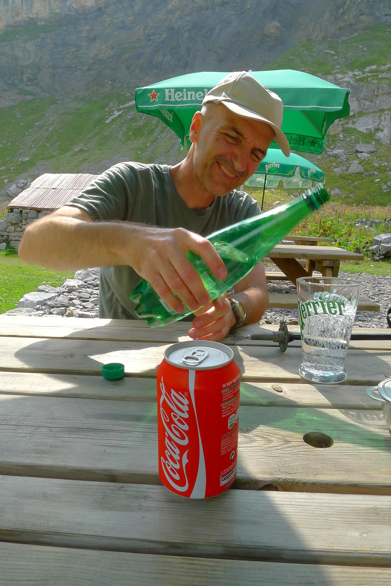 La montée pour Bonavau se fait le long de la route forestière, rien de passionnant sinon quelques trouées qui permettent d’admimirer Champéry et ses montagnes. Bonavau et sa buvette qui officie aussi de refuge. La buvette est charmante, des légumes poussent, des poules pondent (leur spécialité est l’omelette). Nous marquons une pause, comme on arrive au soleil crémage puis deuxième coca de la journée. Alors on se met à boire la boisson américaine ? Une épidémie de gastro-entérite ravage le clan, dont Christian vient d’en sortir, et je sens l’estomac n’est pas au mieux de sa forme. J’ai donc établi une liste des prix pratiqués pour ce médicament cette boisson :