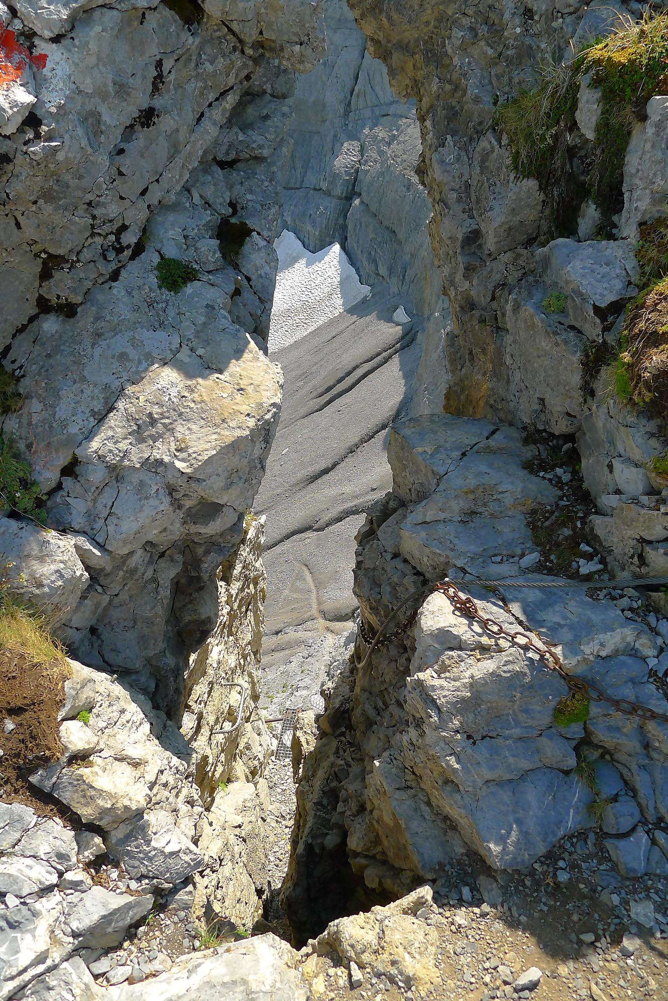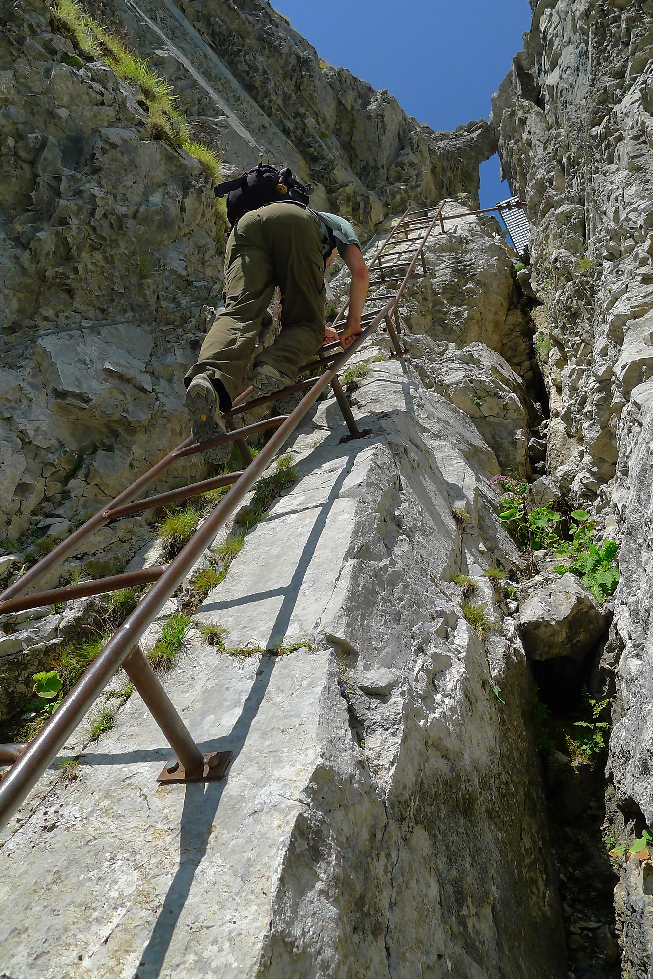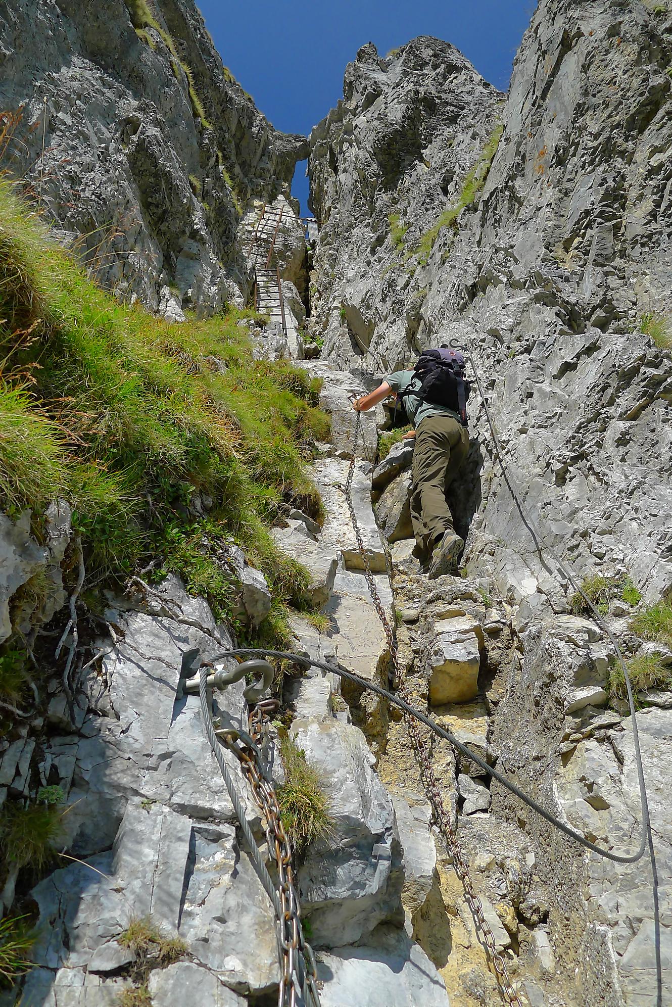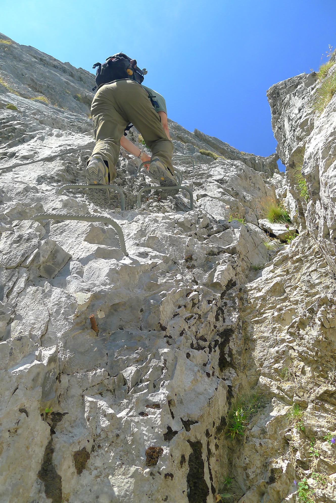 Le chemin serpente pour se jouer des barres rocheuses, la vue se dégage de plus en plus, surtout sur la Cîme de l’Est, c’est superbe. Puis nous arrivons (enfin moi bien après Christian) au deuxième passage clef. Vous avez aimé le Pas d’Encel ? Vous allez raffoler des échelles des Ottans (parfois nommées Fenêtre d’Ottan). C’est une cheminée de 80m équipée de chaines, échelles, barreaux et un finish majestueux. Donc on commence par une chaine, dans une pente encore acceptable, puis on attaque la verticalité par des barreaux, type Via Ferrata (une ligne de vie commence ici). Le ton est donné. On se prend à tricotter entre la chaine (vieille) et la ligne de vie (neuve) pour arriver aux échelles finales. Entre les échelles une barre fixe à traverser pour passer dans le trou du rocher où vous regretterez votre gros sac. Bref le bonheur dans sortir est assez grand !