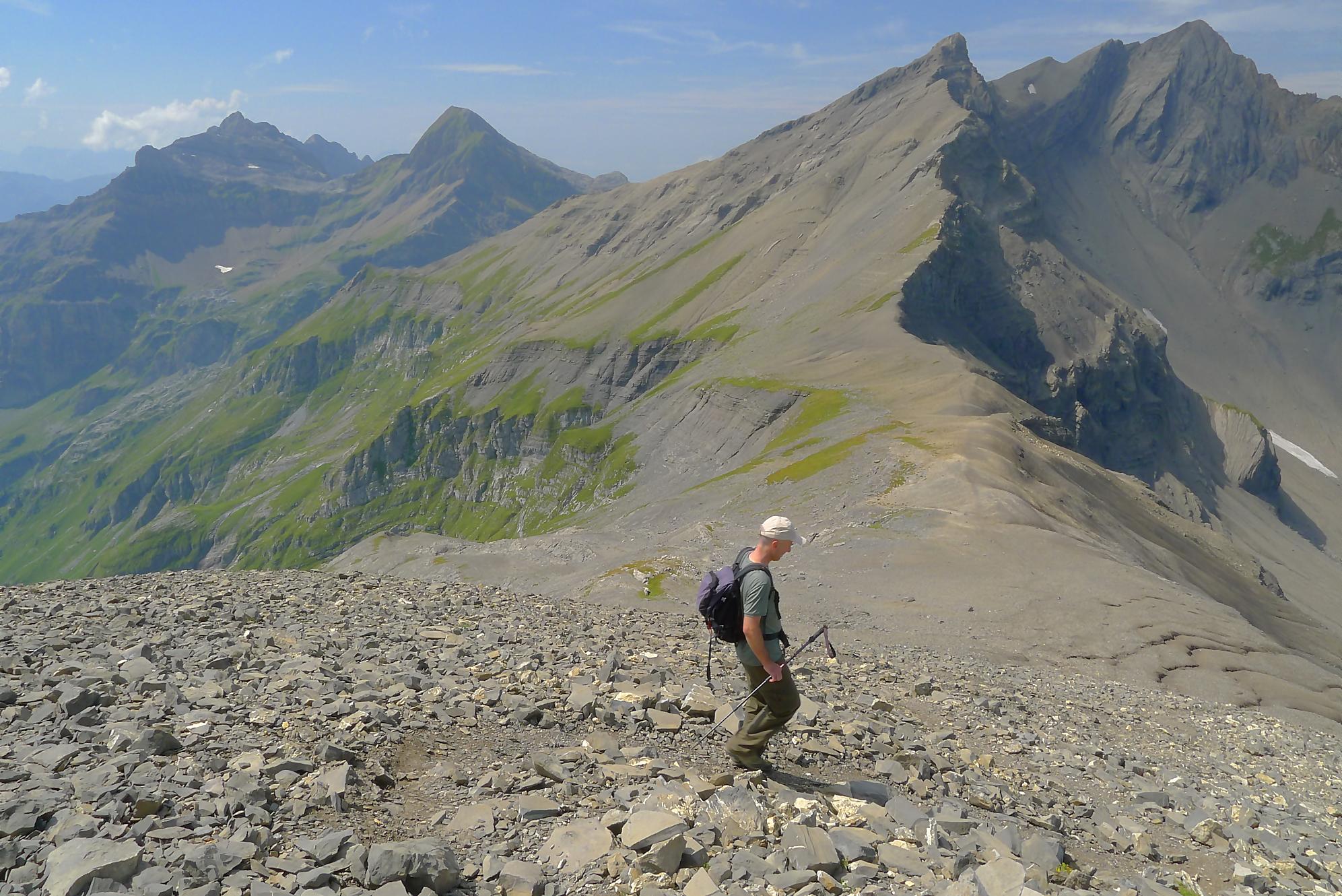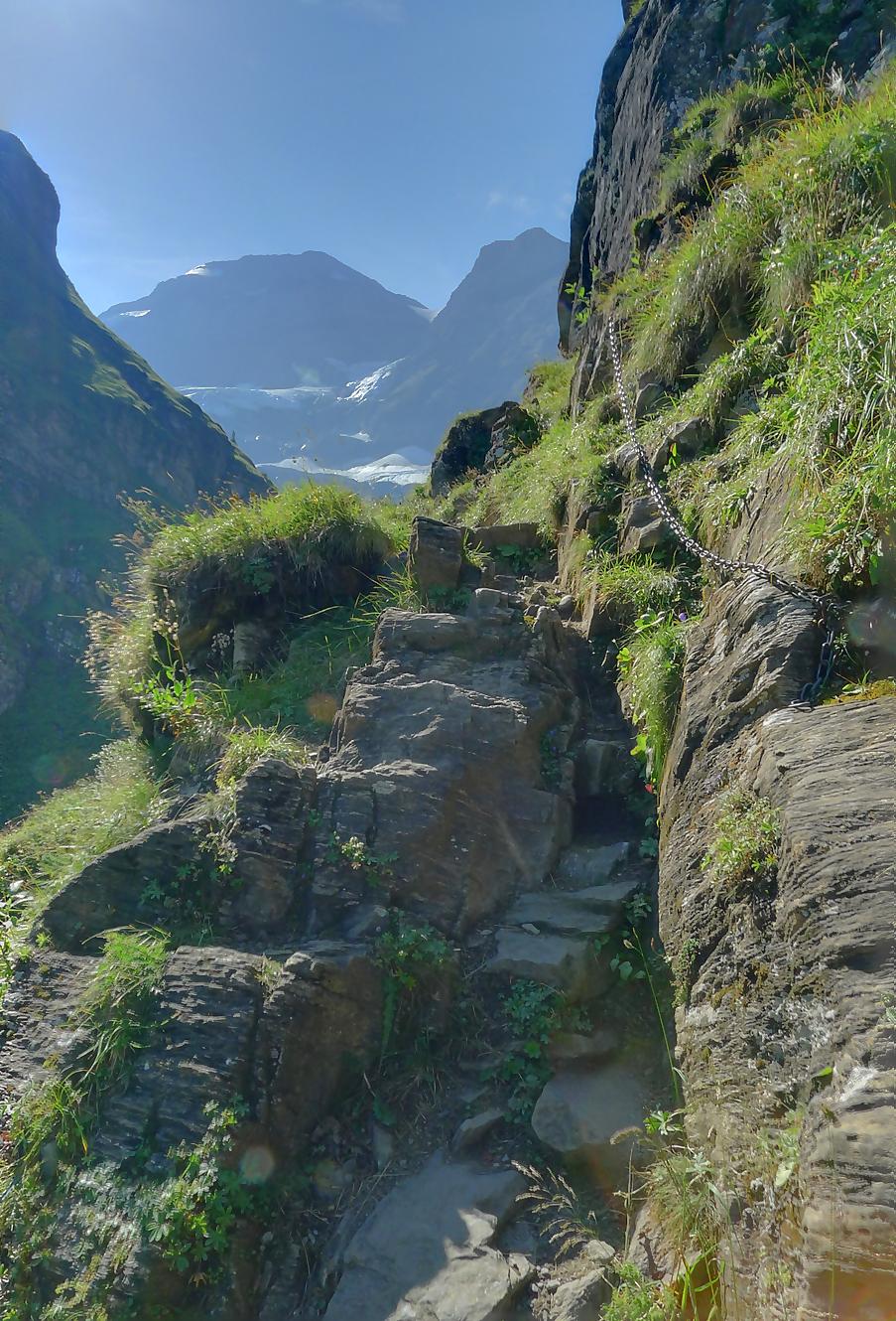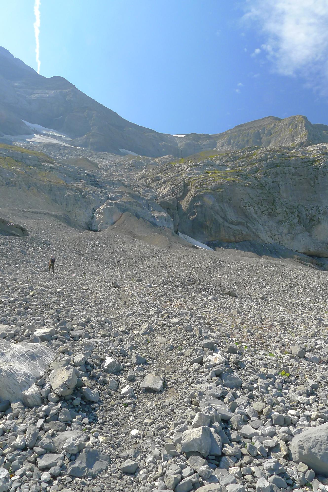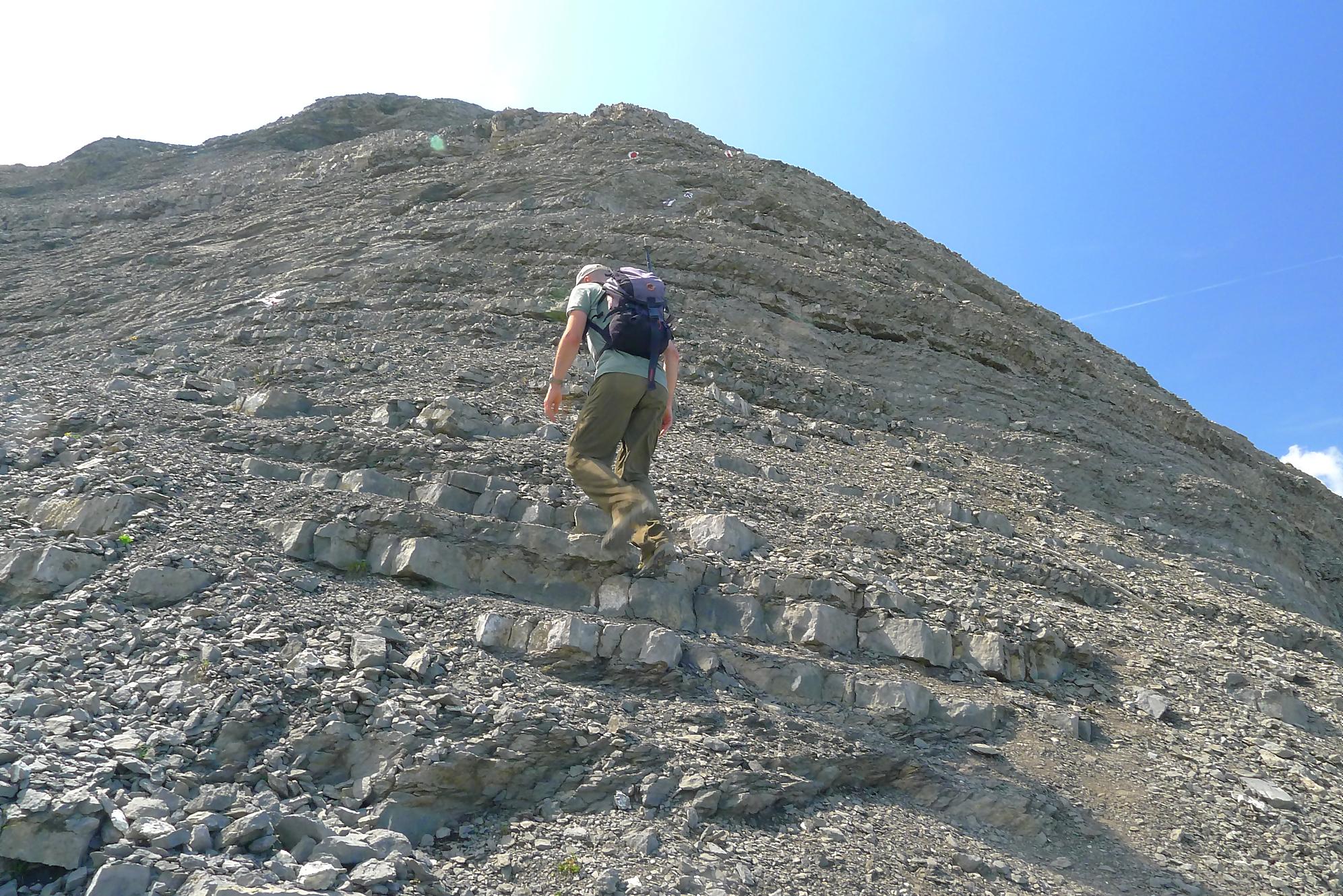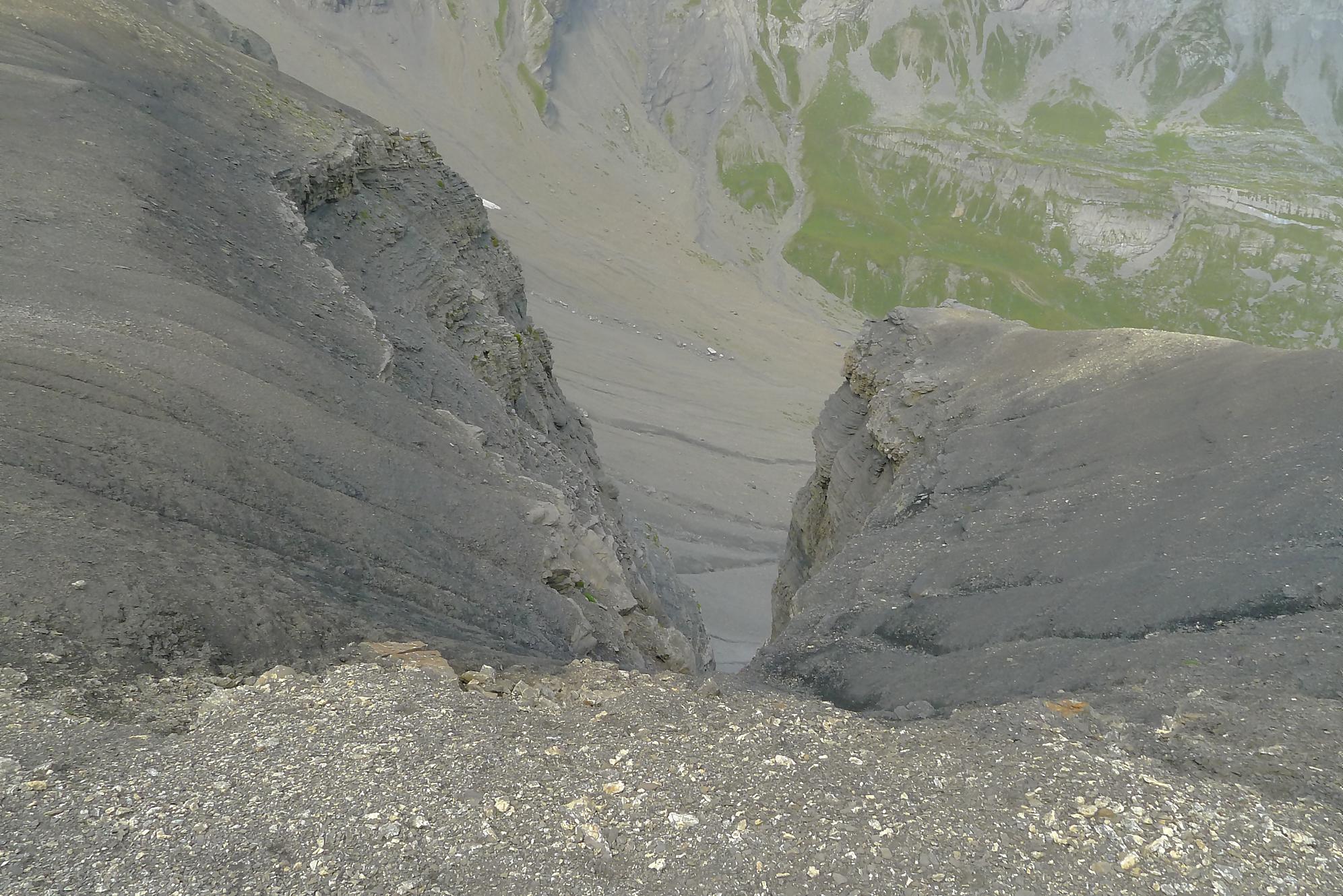 Le chemin serpente pour se jouer des barres rocheuses, la vue se dégage de plus en plus, surtout sur la Cîme de l’Est, c’est superbe. Puis nous arrivons (enfin moi bien après Christian) au deuxième passage clef. Vous avez aimé le Pas d’Encel ? Vous allez raffoler des échelles des Ottans (parfois nommées Fenêtre d’Ottan). C’est une cheminée de 80m équipée de chaines, échelles, barreaux et un finish majestueux. Donc on commence par une chaine, dans une pente encore acceptable, puis on attaque la verticalité par des barreaux, type Via Ferrata (une ligne de vie commence ici). Le ton est donné. On se prend à tricotter entre la chaine (vieille) et la ligne de vie (neuve) pour arriver aux échelles finales. Entre les échelles une barre fixe à traverser pour passer dans le trou du rocher où vous regretterez votre gros sac. Bref le bonheur dans sortir est assez grand !